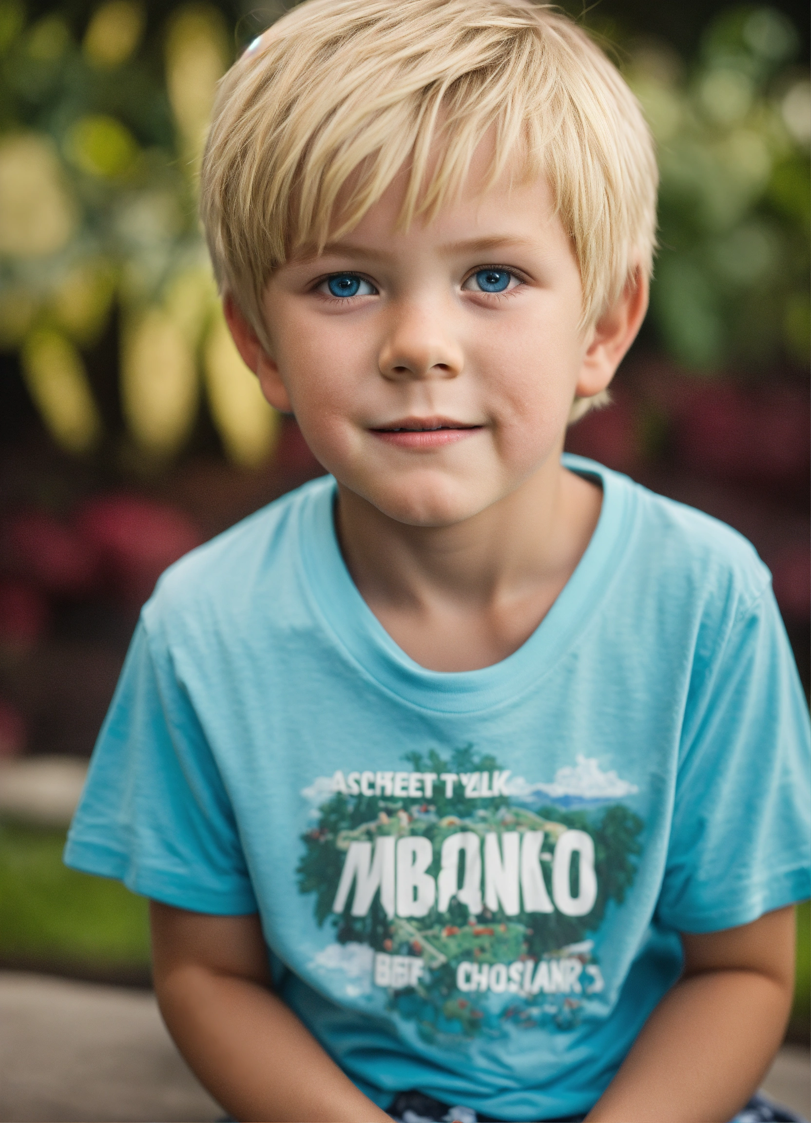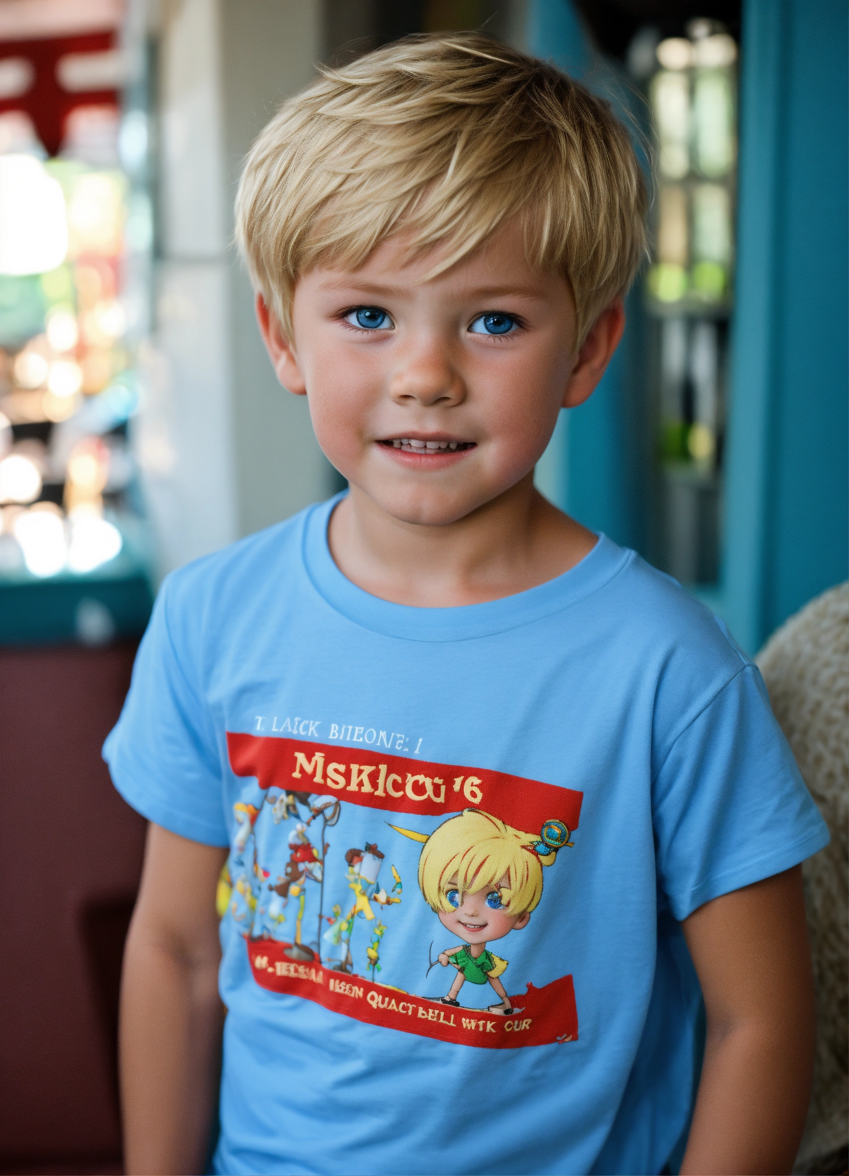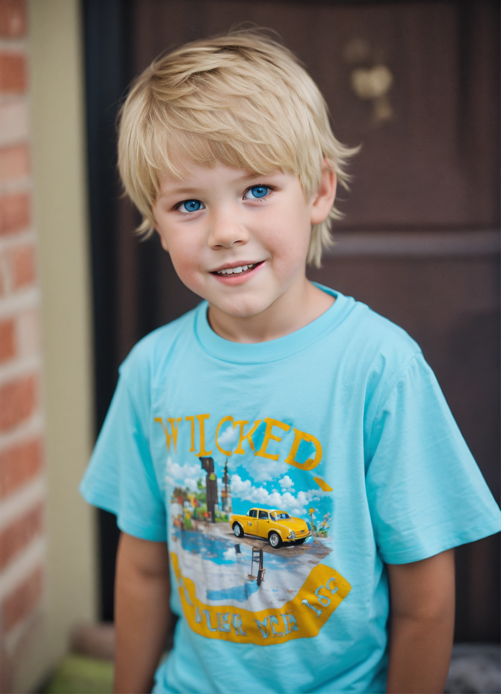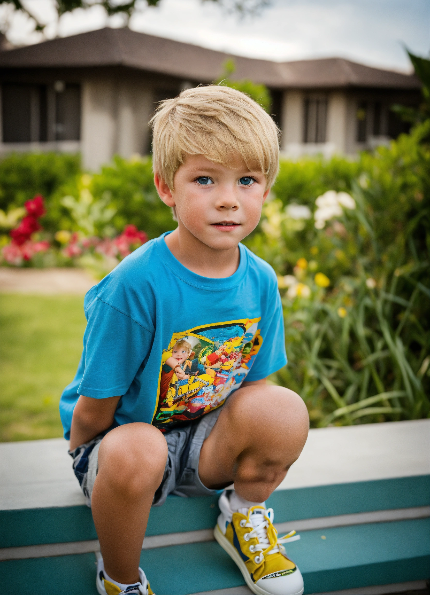 Photo of a 6-year-old boy, blonde, brat, obnoxious, wicked, best quality, t-shirt, shorts, short hair, blue eyes, adorable, spoiled, wealthy, mischievous, charming
