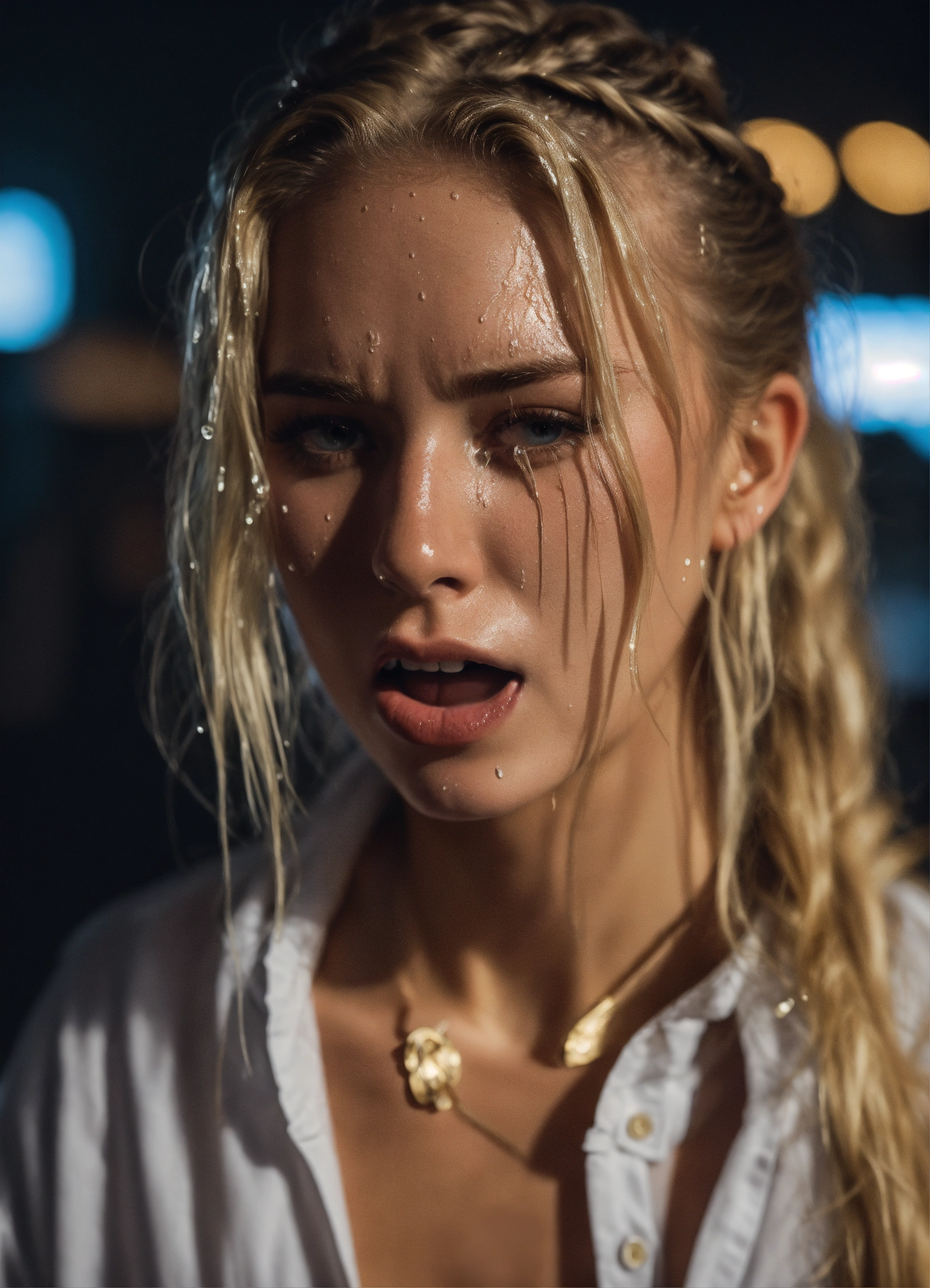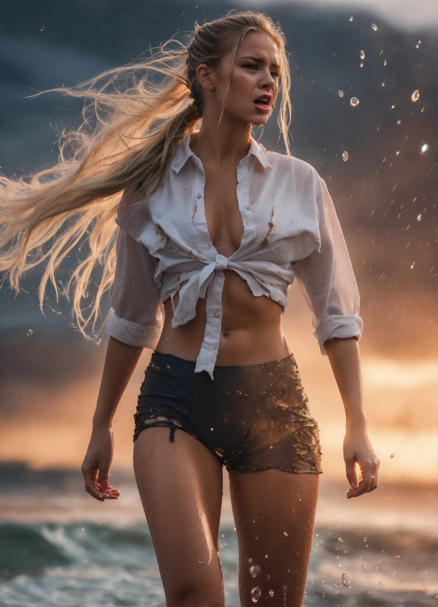 Full body, standing, gag, swimwear, shiny, wet messy long hair, prepubescent, unbuttoned tattered torn dress shirt, tube socks, crying, screaming, crying, distressed, three gorgeous young, ponytail blonde hair, white woman, pale skin, fitness influencer, highly detailed, dramatic shoot, sharp focus, 4k uhd, cinematic lighting, relaxed, beach
