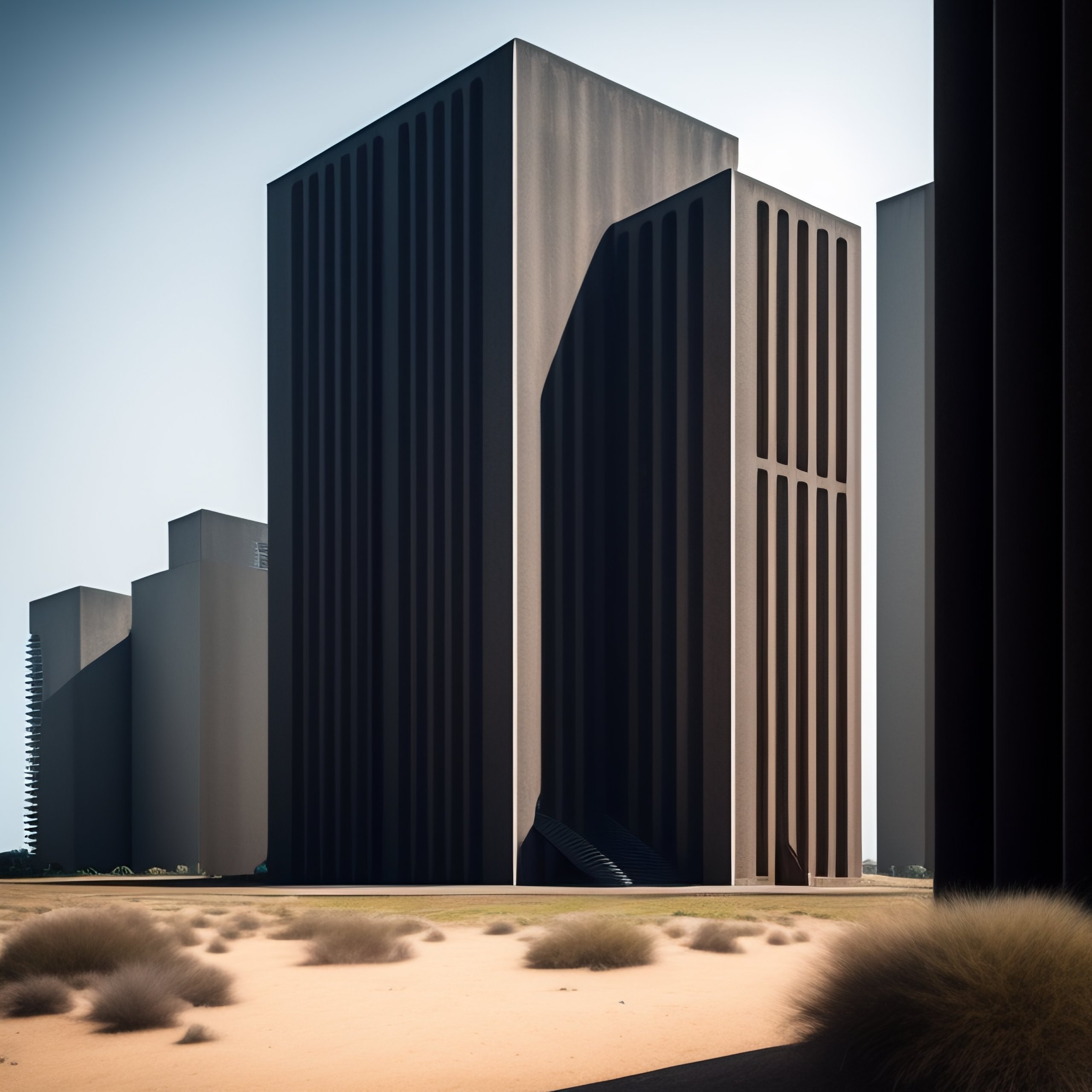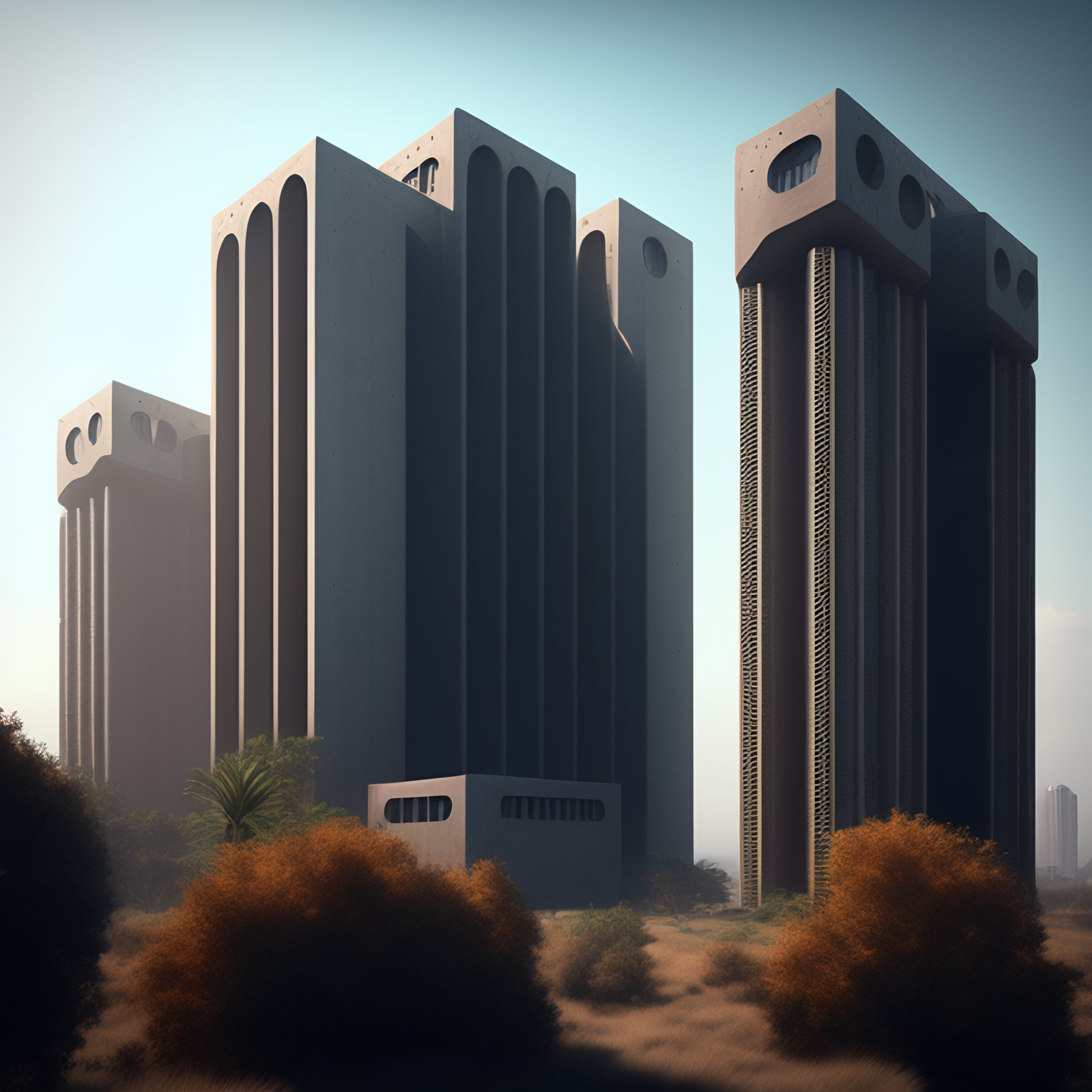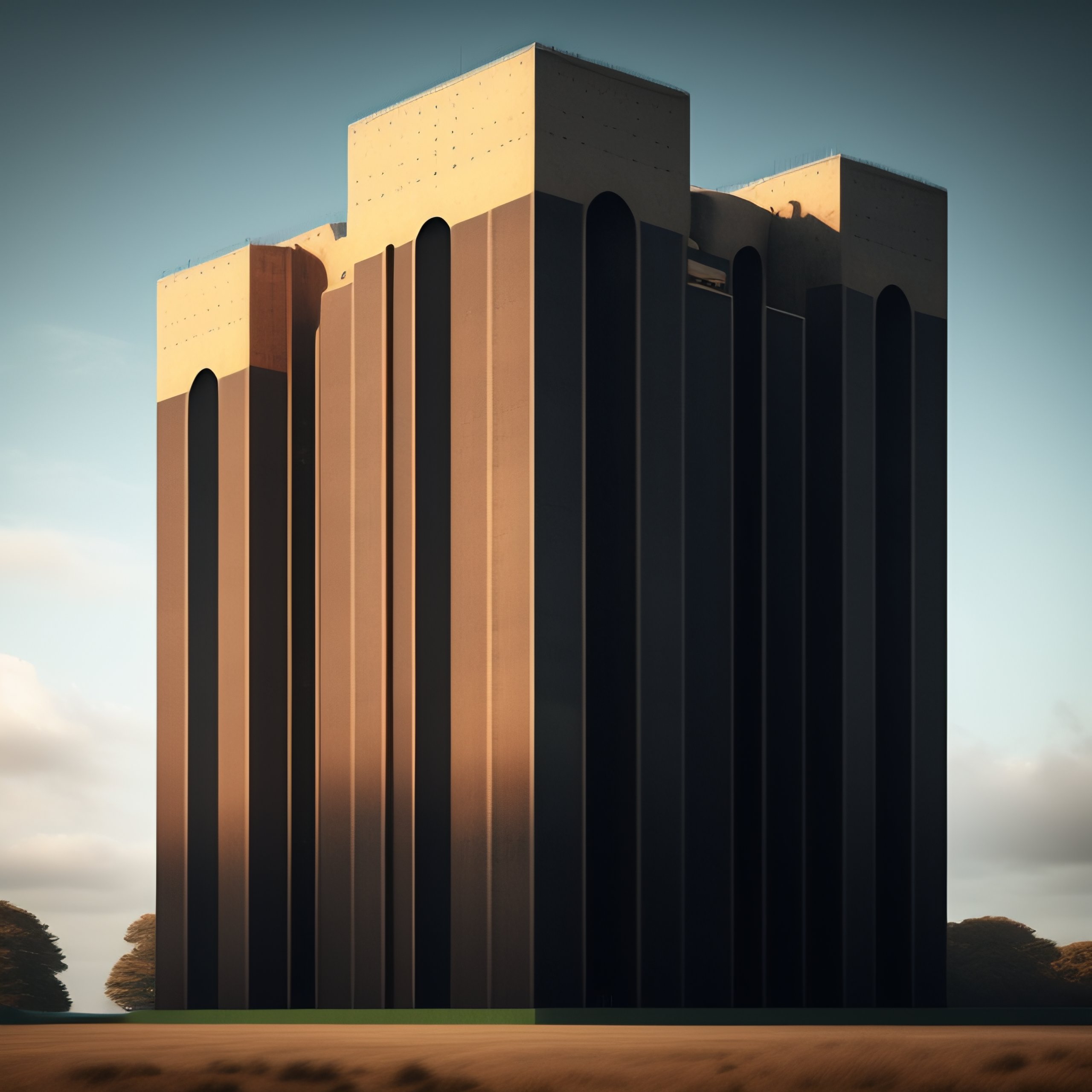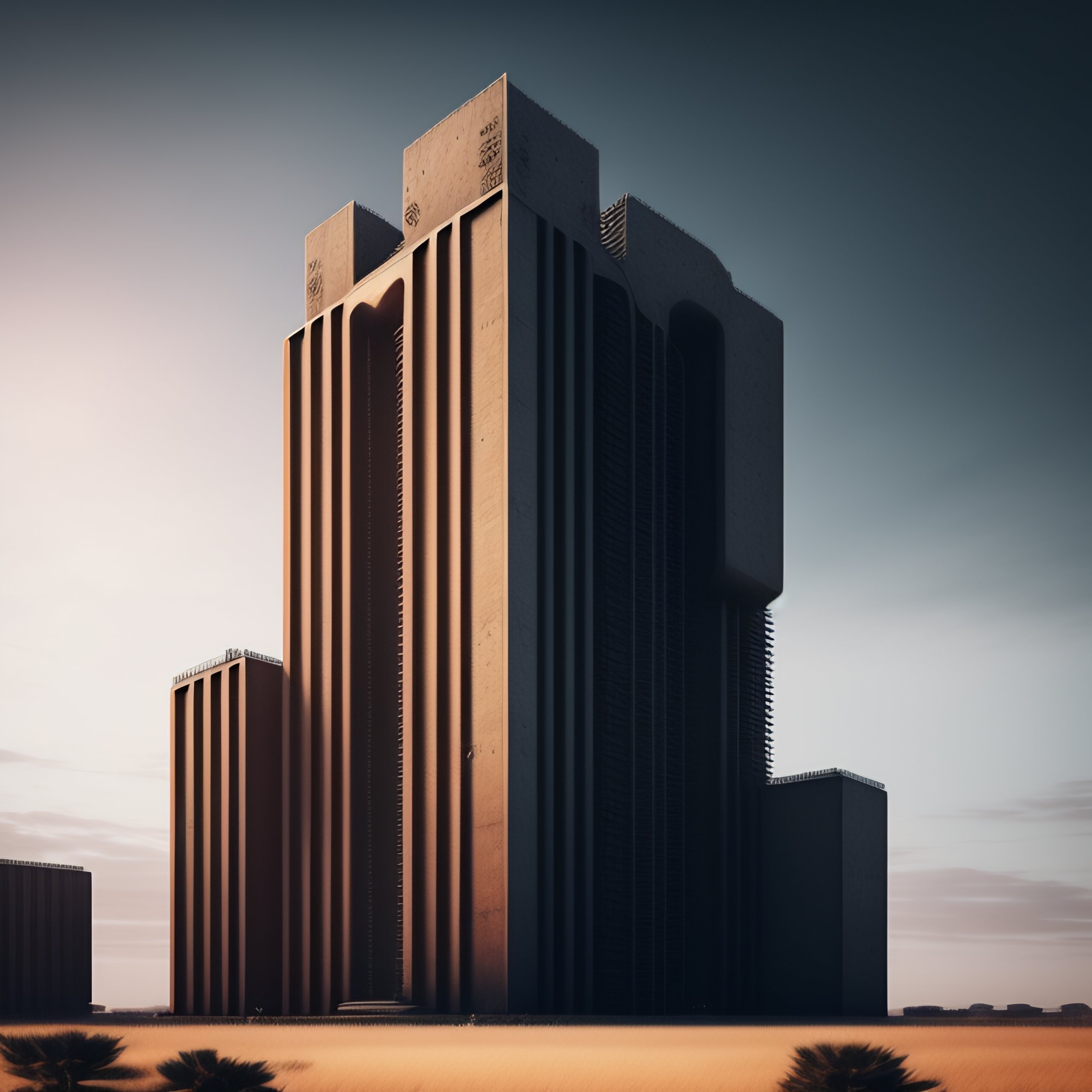 A giant brutalist tower built in brutalist architecture, skull shaped, diverse unique building geometry full of shapes and corners, with a smaller base than the top of the tower, slowly growing in width as we get higher