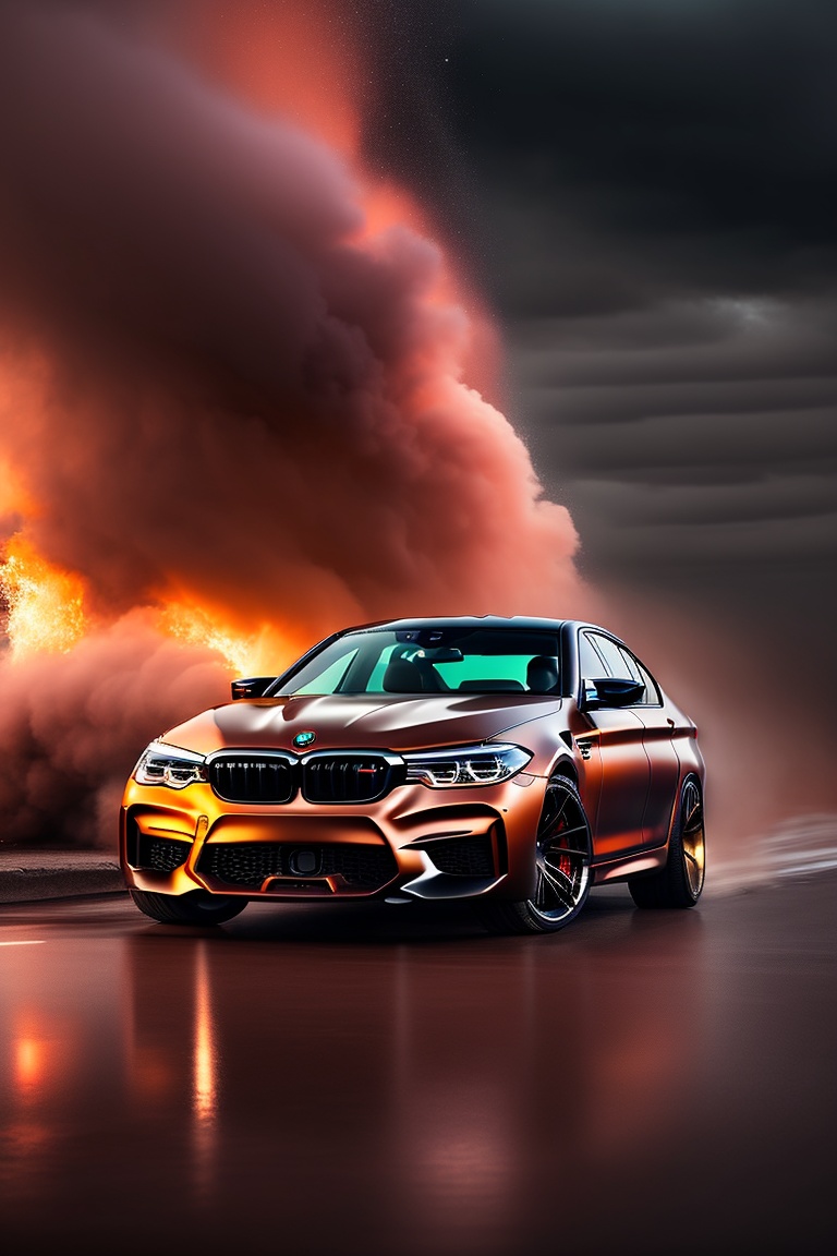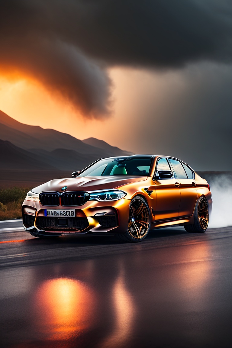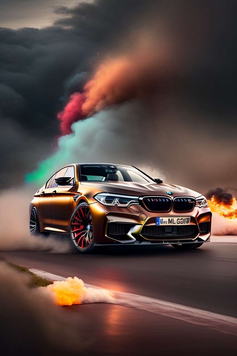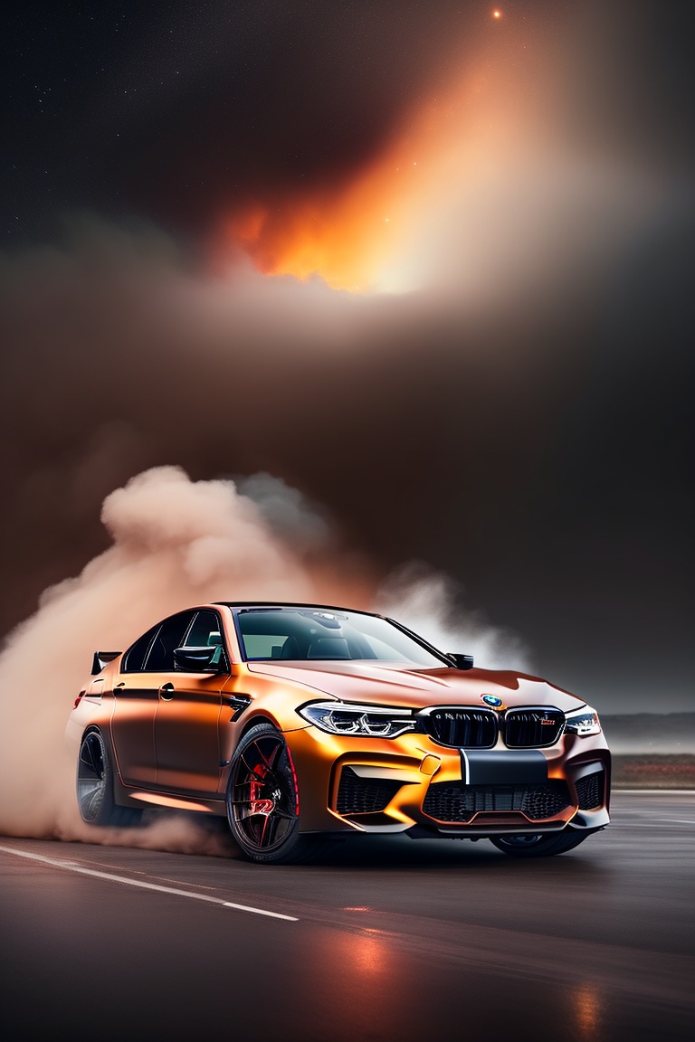 Bmw m5 cs 2023, 8k, ultrareastic, drifting, havanna brown metallic car paint, universe explosion on the background, rtx, dark sky, fog, atmosphere