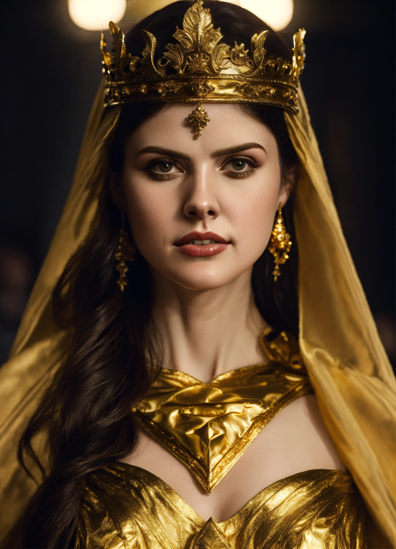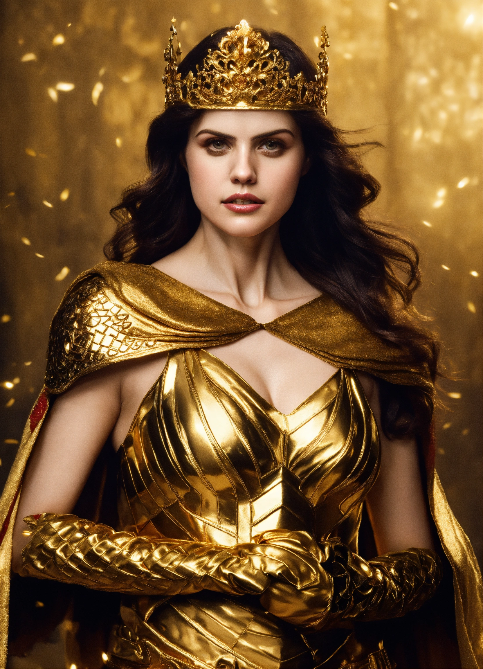 Alexandra daddario as greek goddess in golden armor with crown with golden cape wearing silk gloves