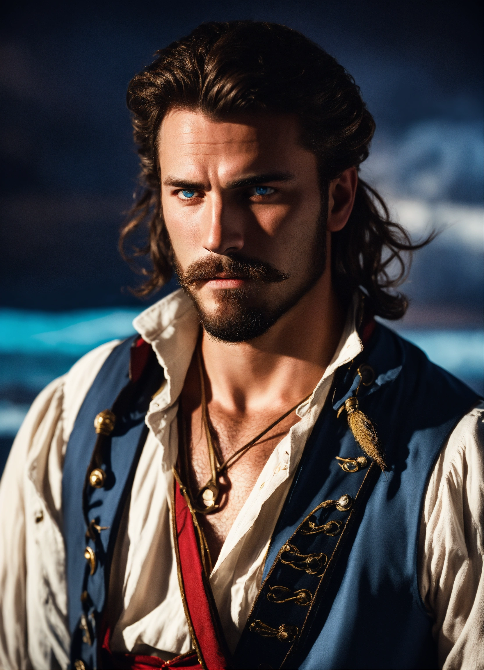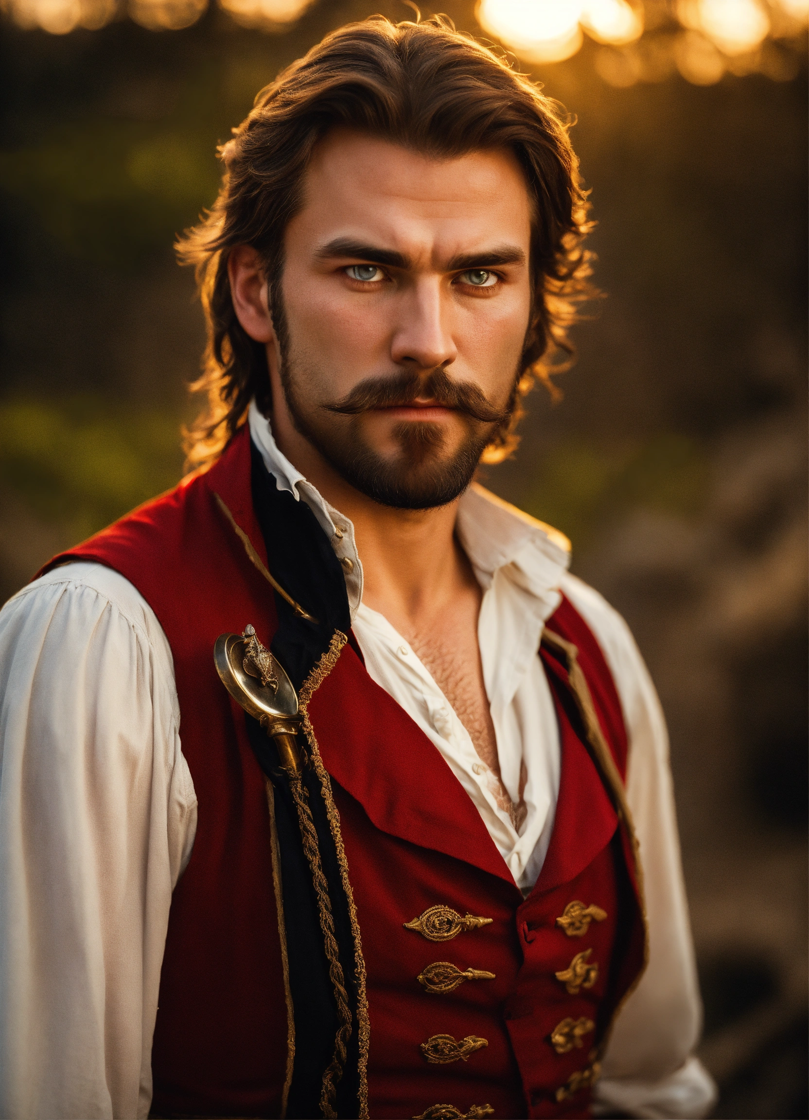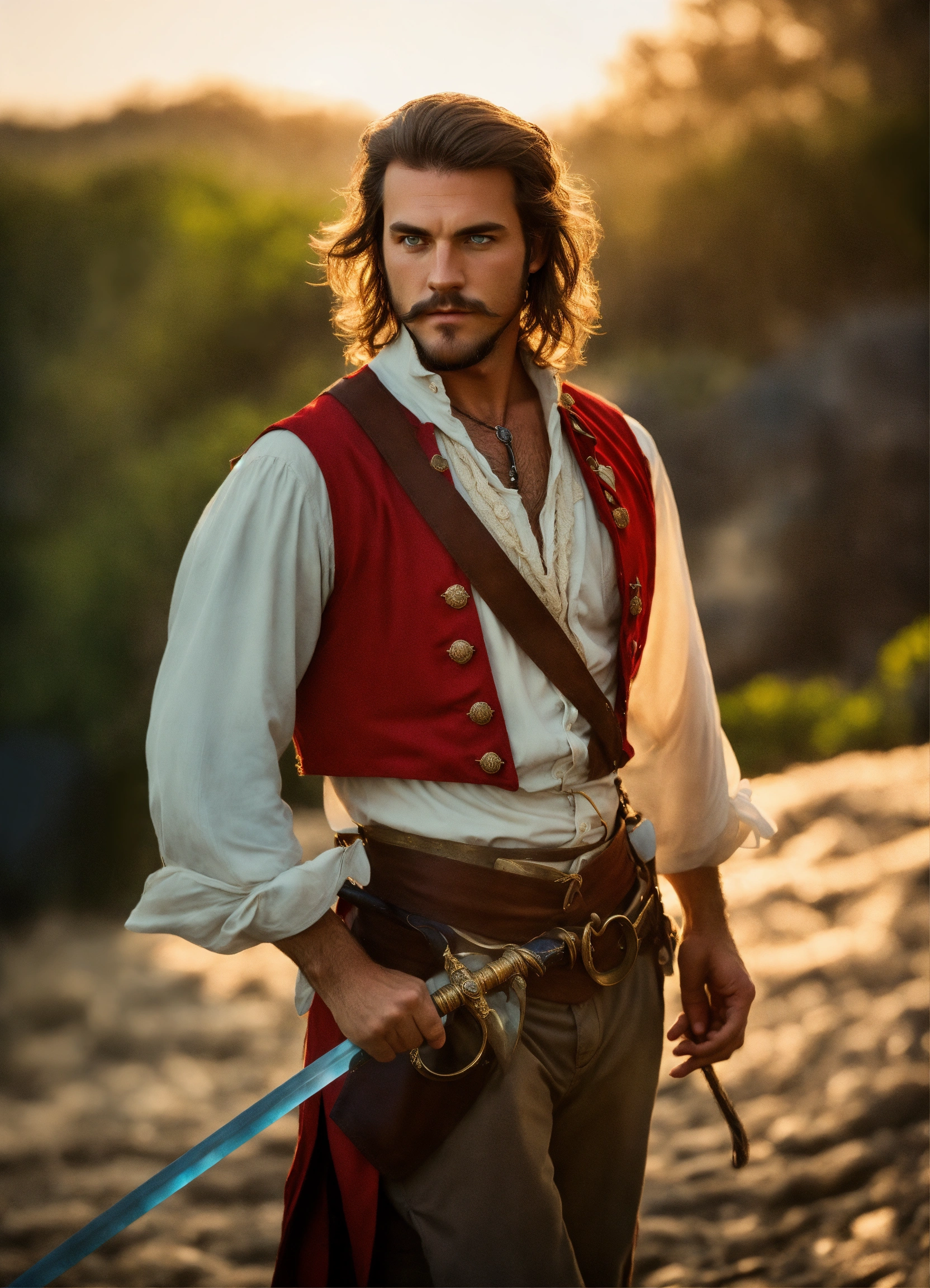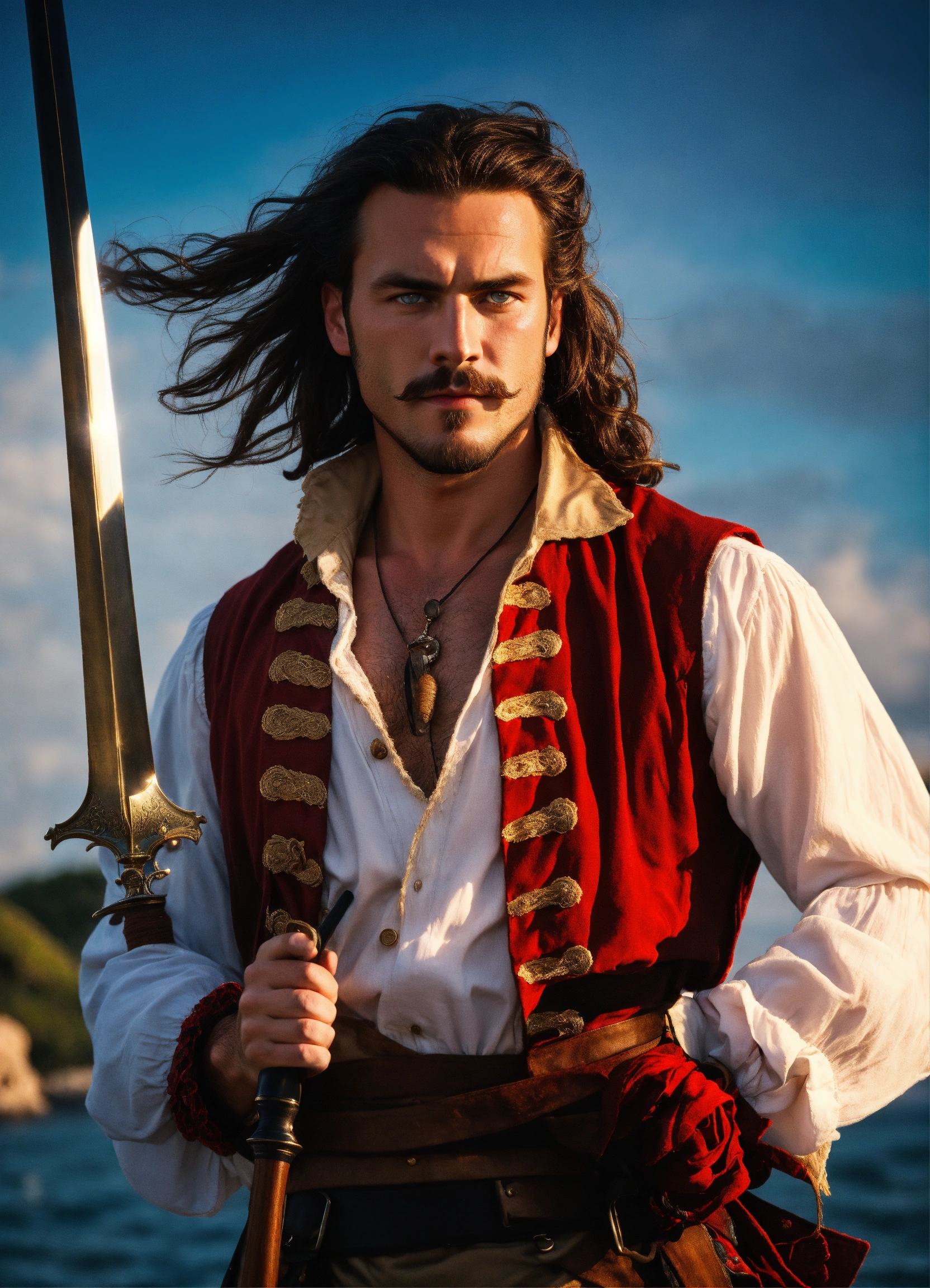 Holding a rapier an adult male pirate with long swept back brown hair, light blue eyes, stumbled facial hair, 1820s era white shirt and red vest, chest hair, holding a rapier, chest hair, 8k, cinematic lighting, island background