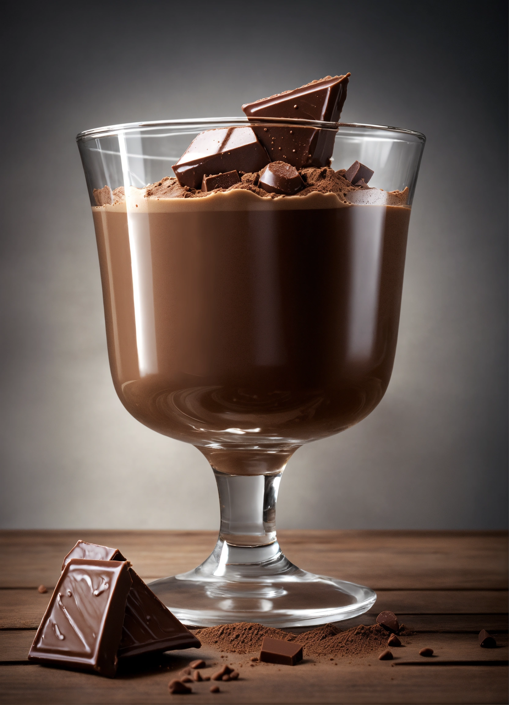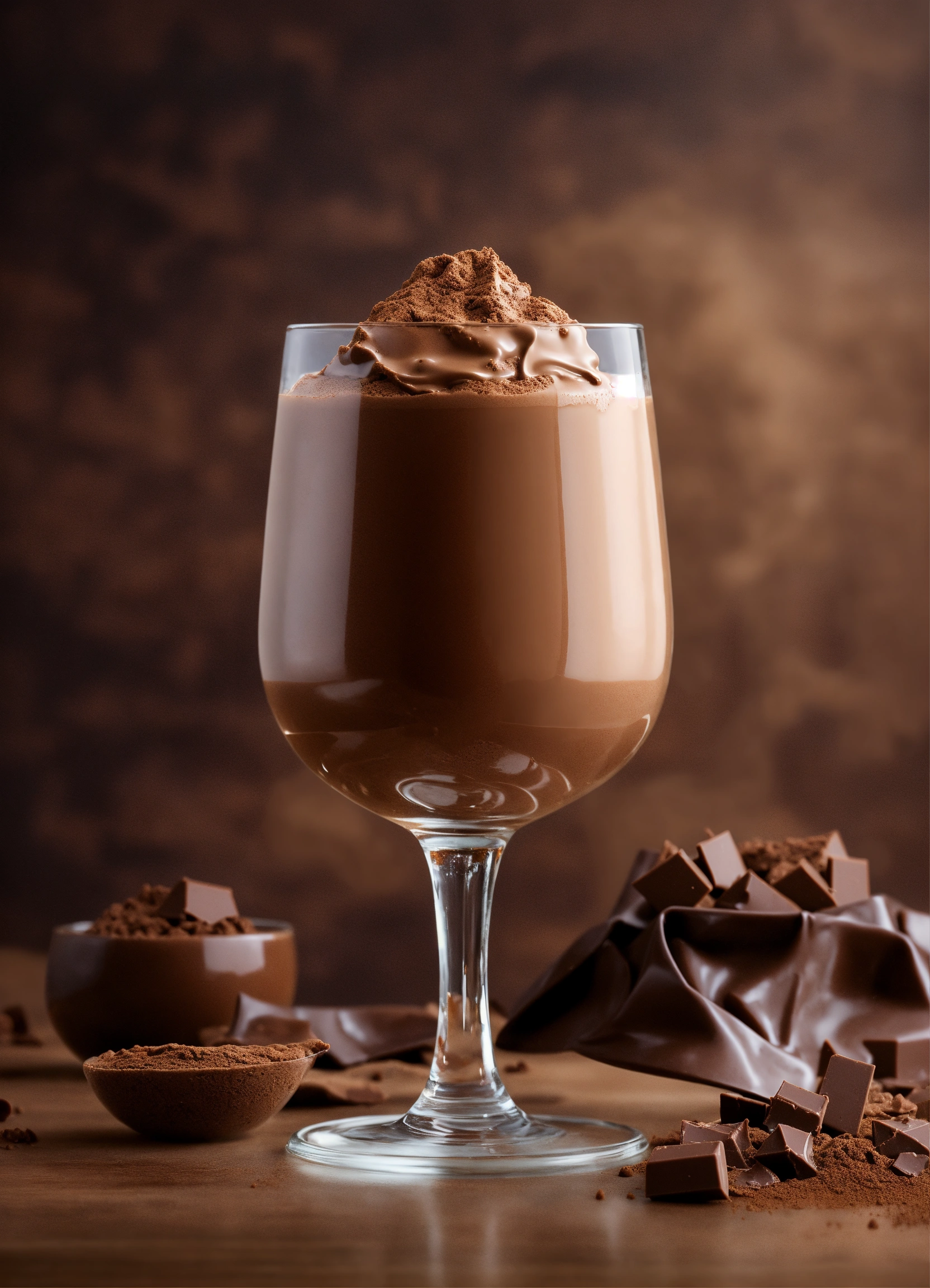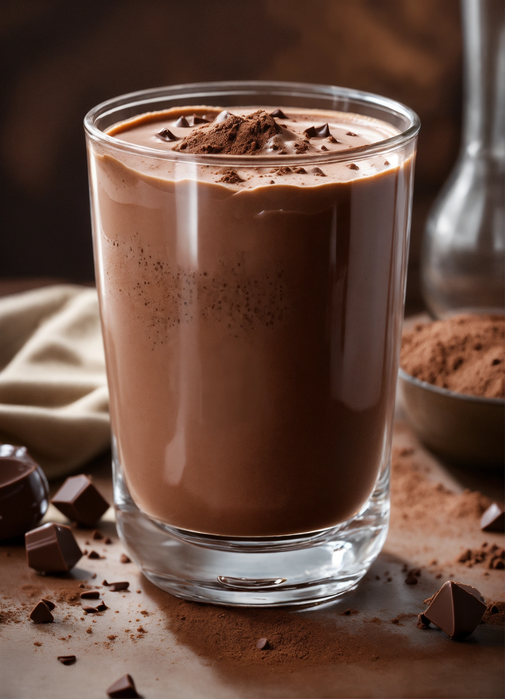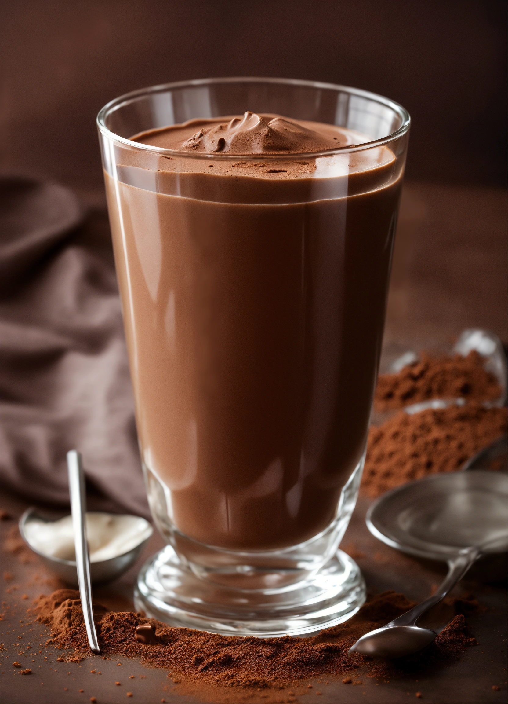 Photorealistic photograph of a creamy chocolate protein in a transparent glass