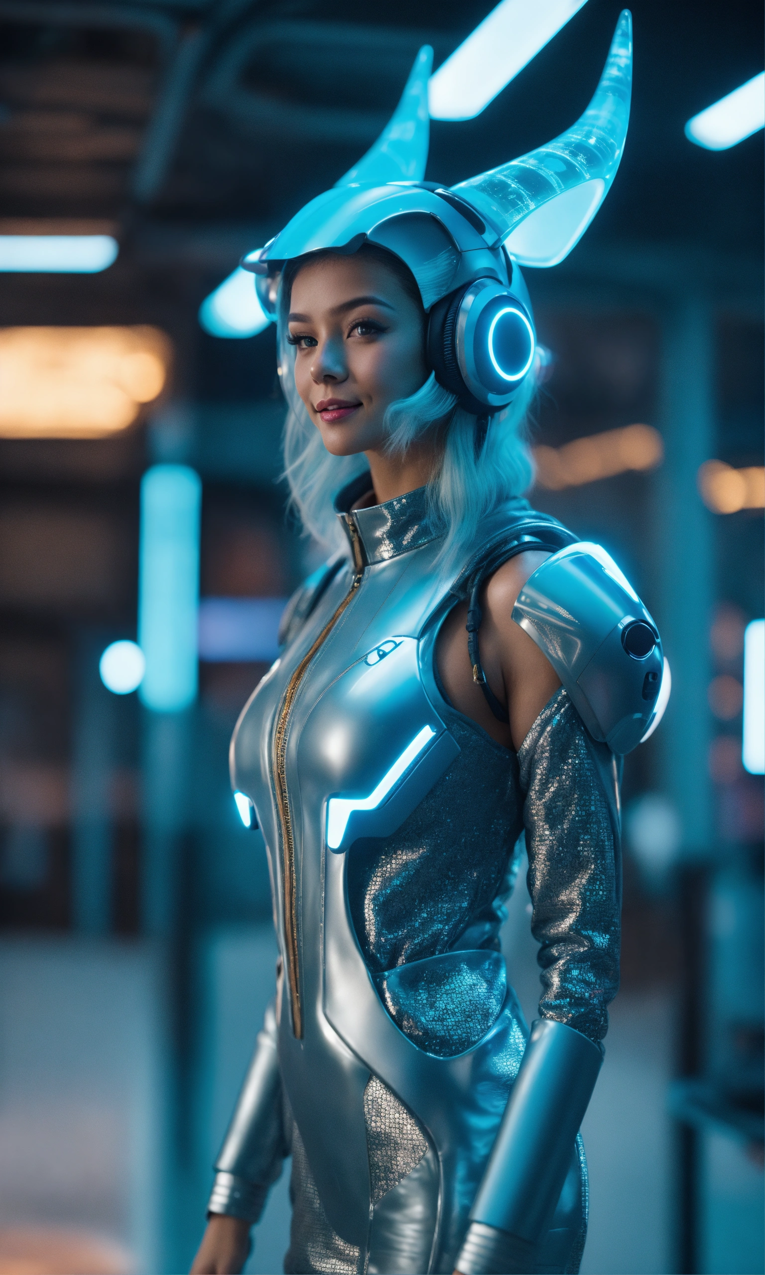 Full body of a beautiful happy girl with light blue skin standing wearing detailed alien ear antennas with futuristic clothing, futuristic, sci-fi, realistic, 8k