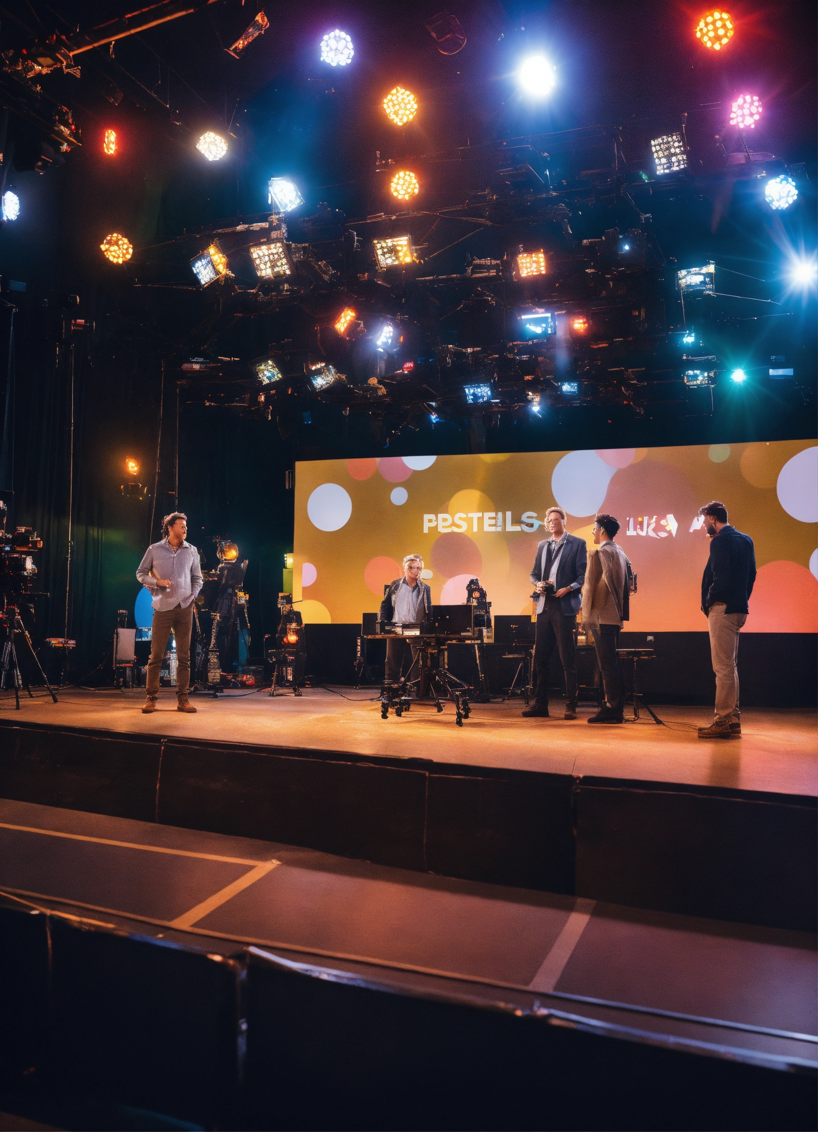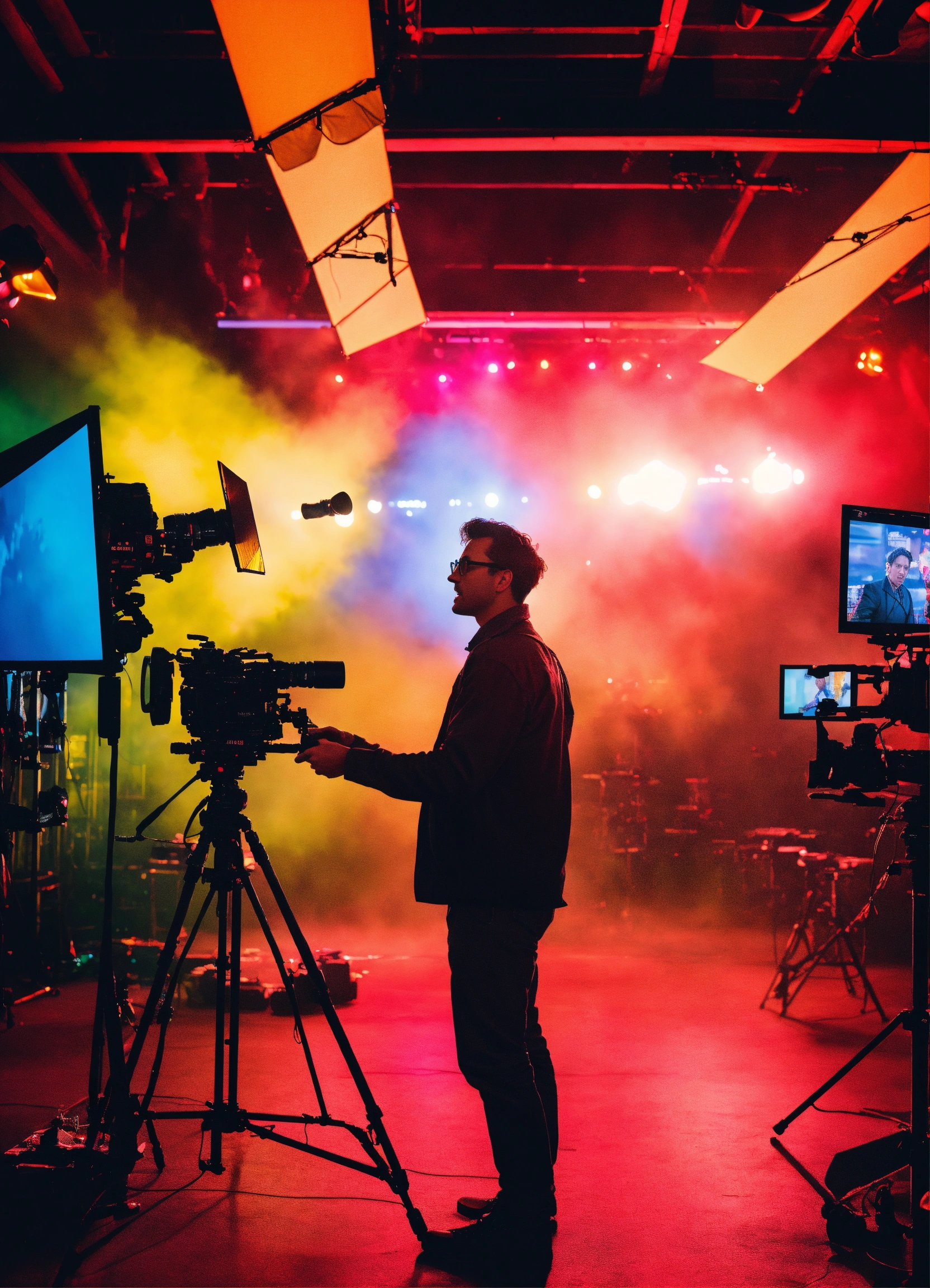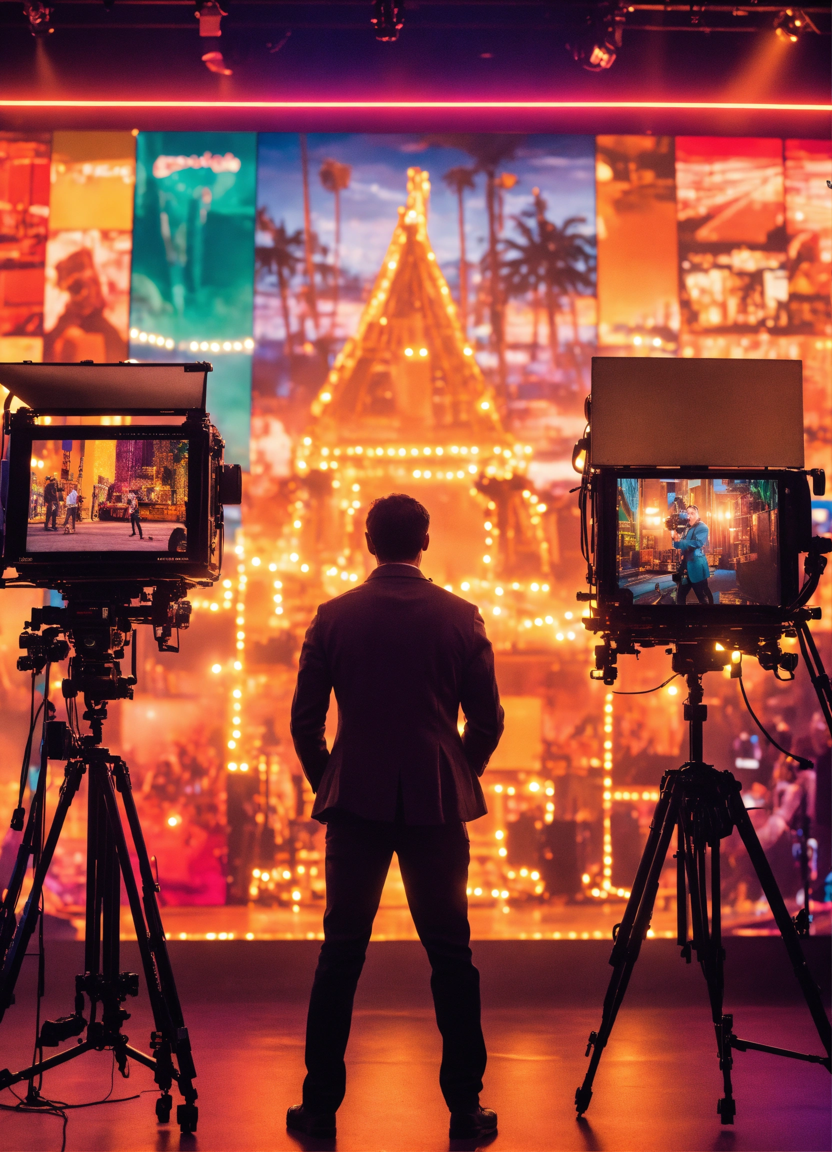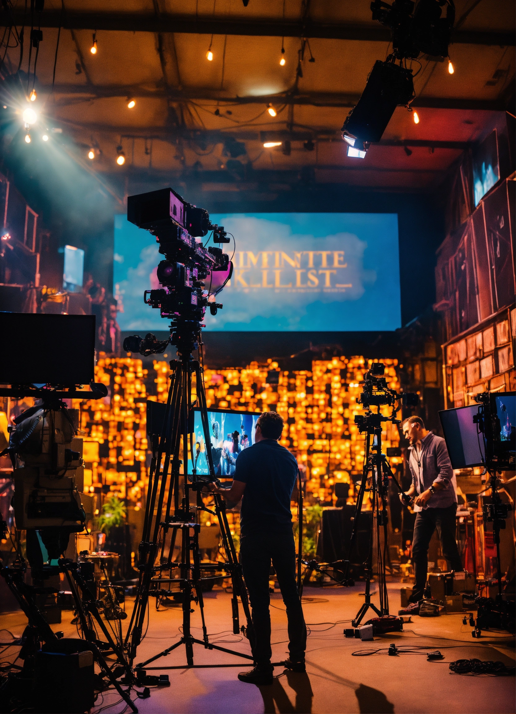 Imagine a film director standing confidently at the helm of a set, with a backdrop of vibrant lights and a bustling production crew behind them. the director is holding a clapperboard, symbolizing the start of a new venture. in the background, a large screen displays a montage of various film genres, showcasing the diversity and creativity that can be achieved within the industry. this image captures the collaborative nature of the tv and film industry, with the director representing leadership and vision, the crew representing support and expertise, and the screen representing the limitless possibilities for storytelling and entertainment. the vibrant lights add a touch of excitement and dynamism to the scene, symbolizing the extraordinary moments that can be created through teamwork and innovation. remember, the key is to convey a sense of inspiration, collaboration, and unlimited potential through this image.