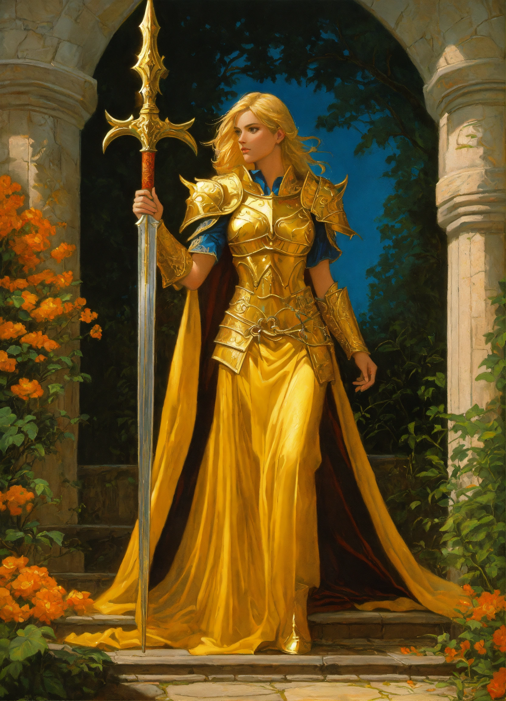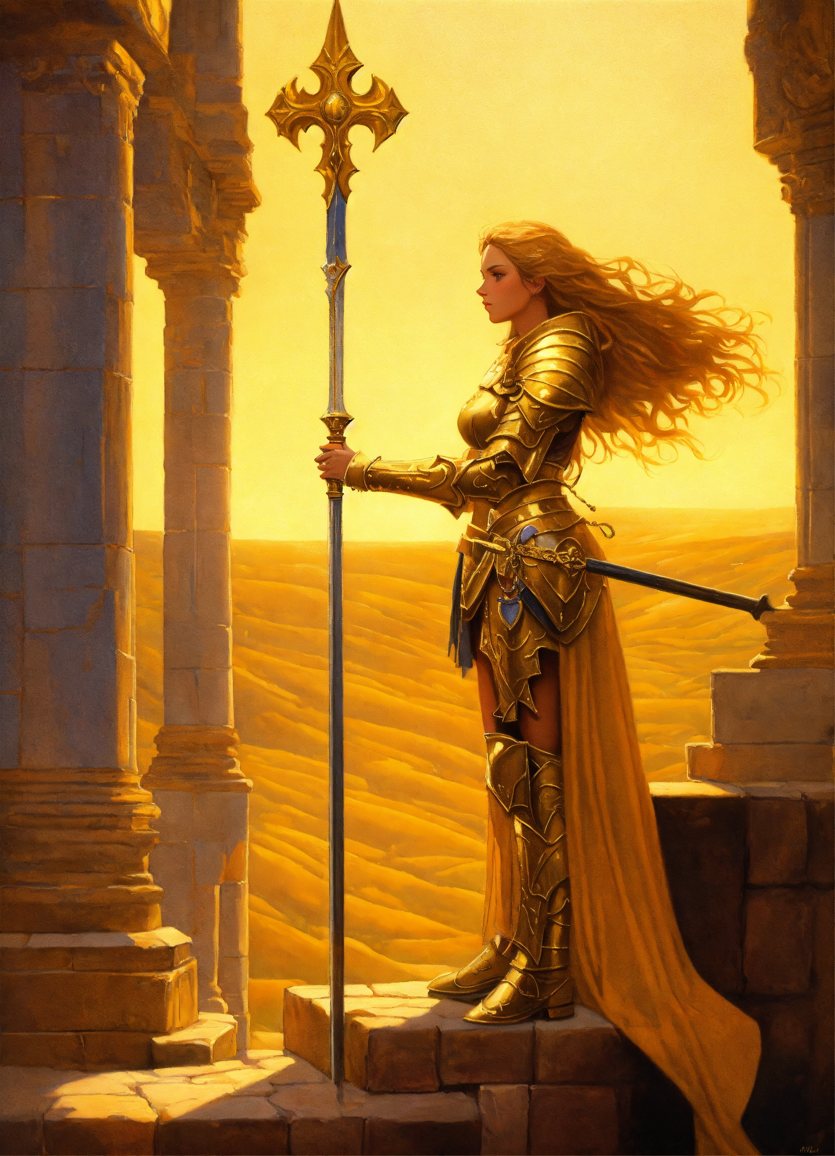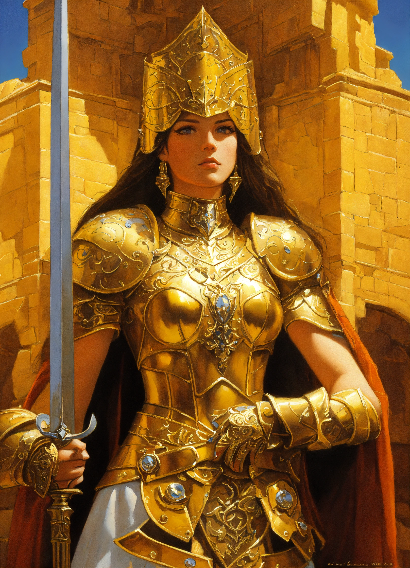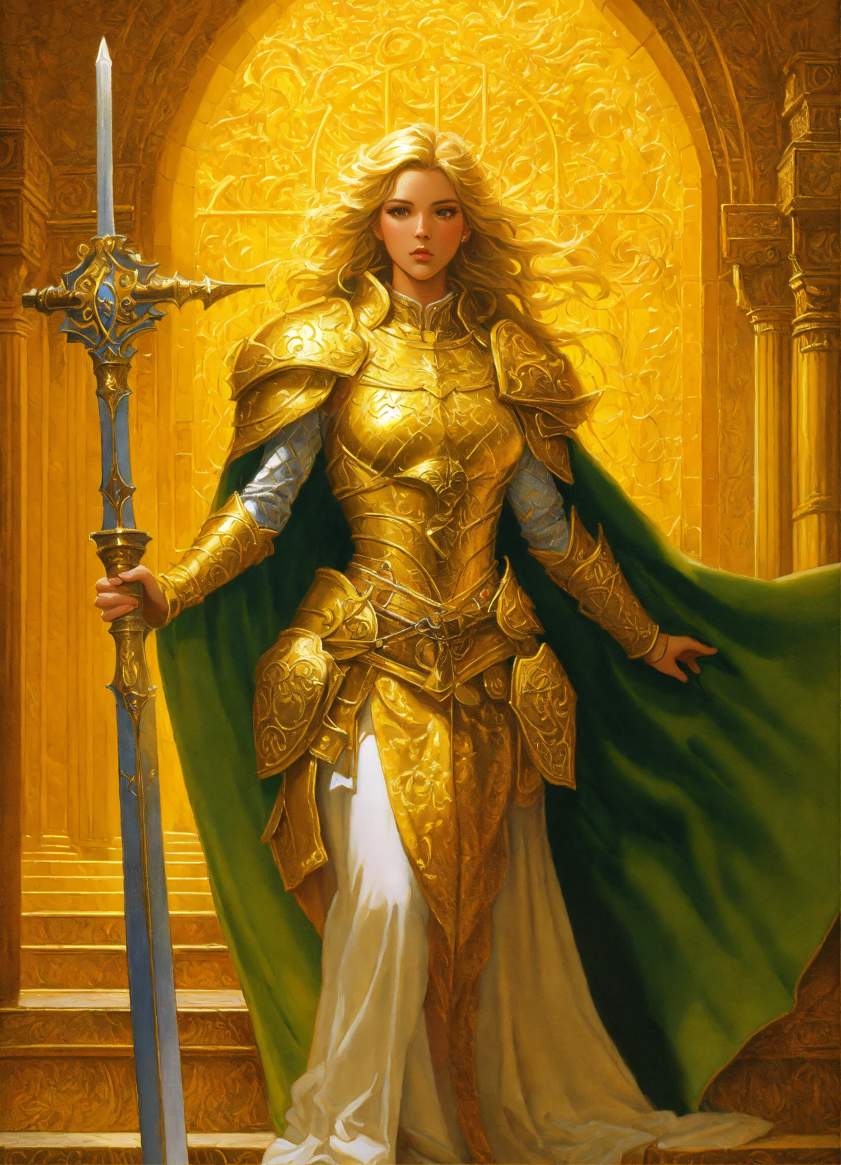 An oil painting by michael whelan of a golden paladin, gorgeous female, the artwork is rich in detail and texture, creating a vivid image, highly complex, and meticulously detailed. an authentic conceptual and careful depiction, inferring a perfect visual representation of an old-school rpg fine art, cfg scale 18, 32k resolution, blender.