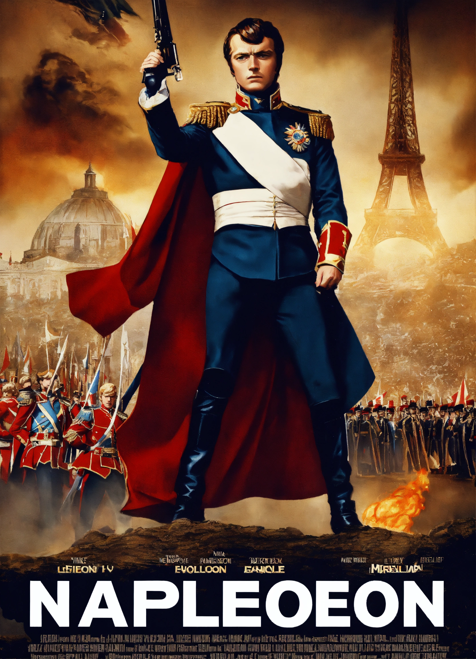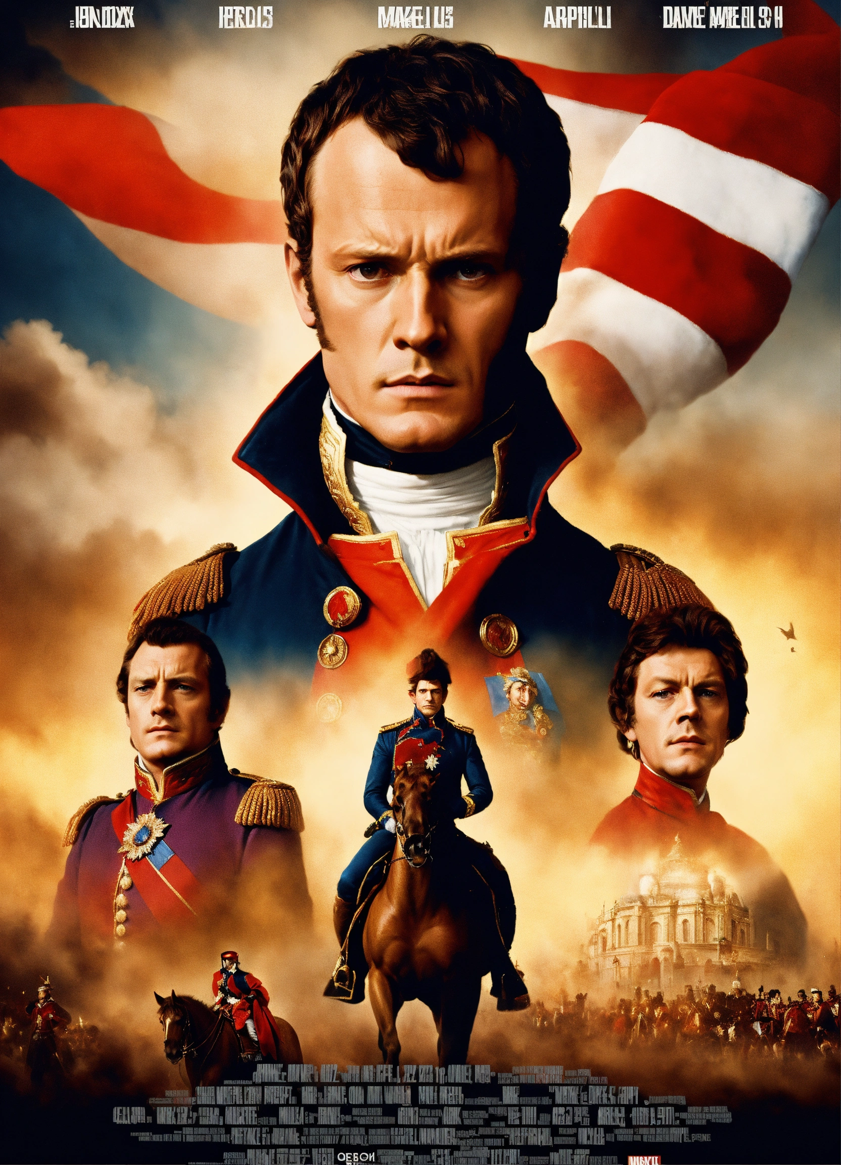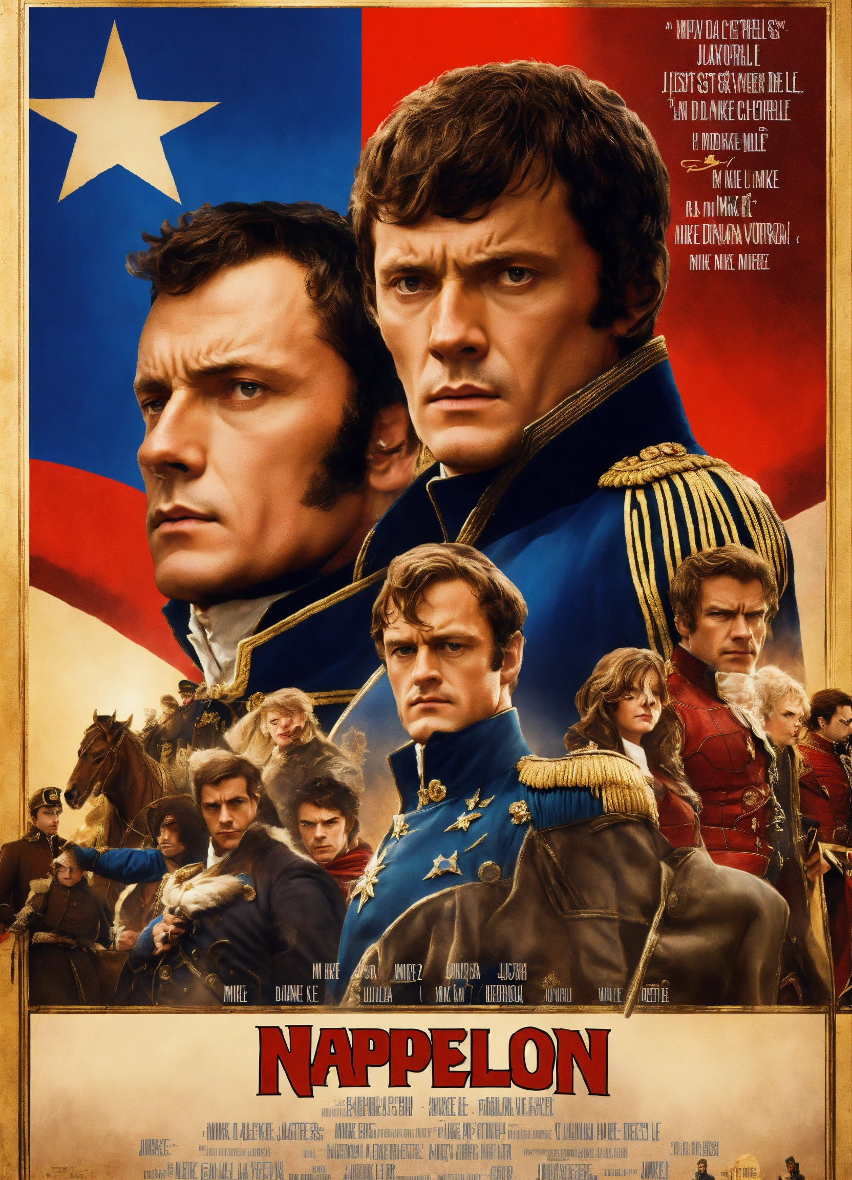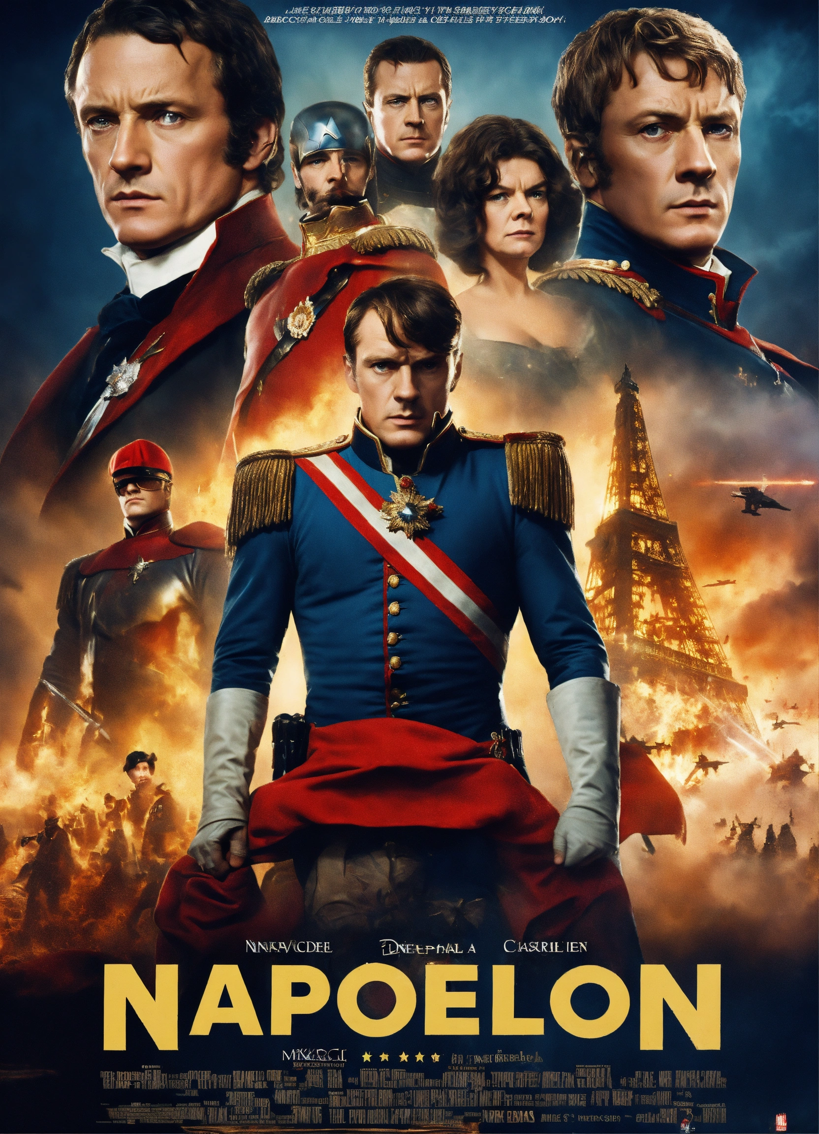 A movie poster about napoleon in the style of a marvel movie. a short french superhero who is strong and also very short compared to his peers. the movie is titled, "napoleon." listed actors are "mike castle" and "dame judy dench."
