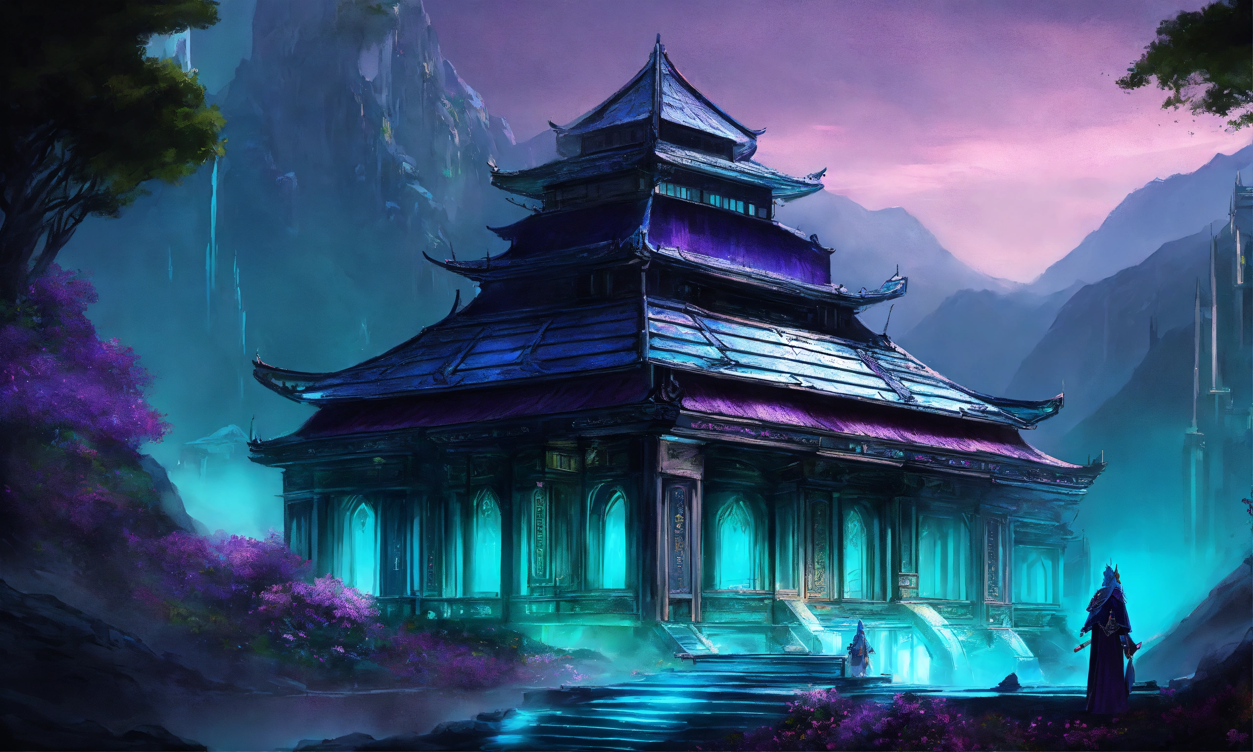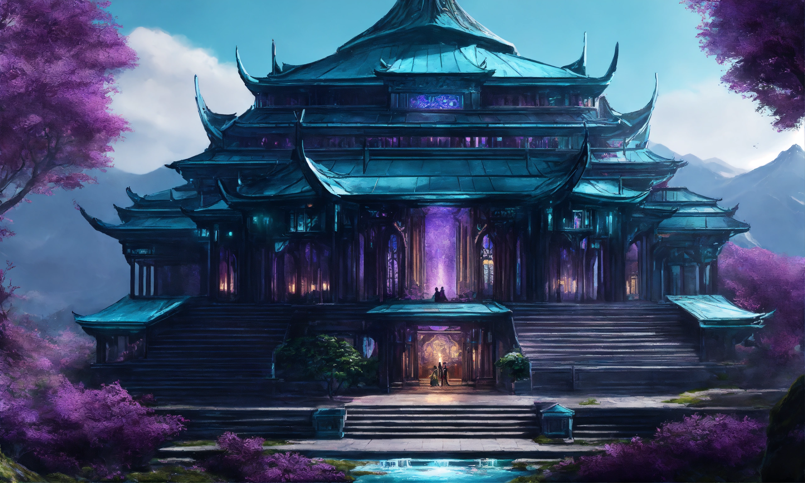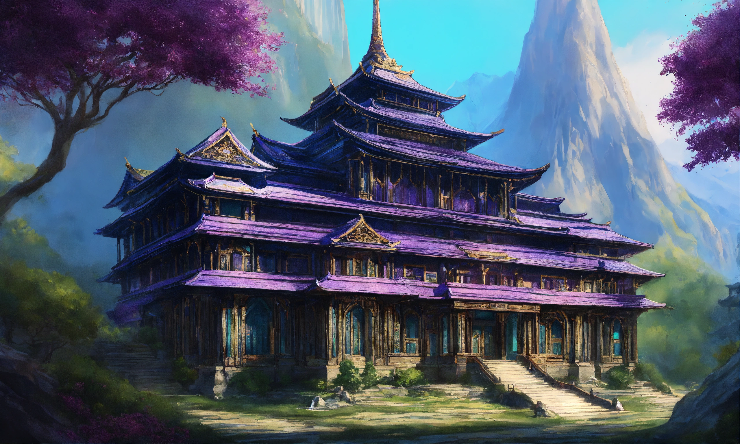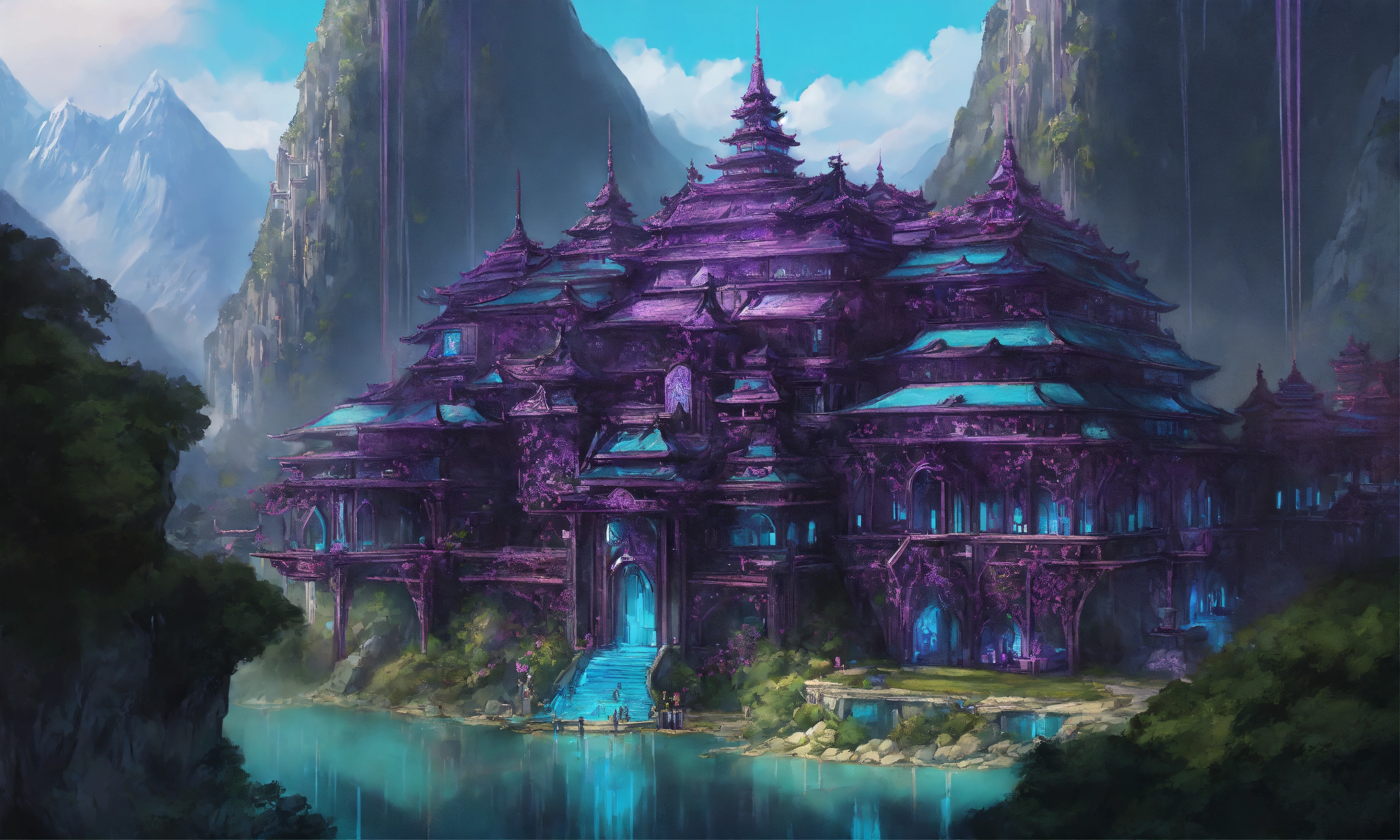Drawing of a fully shown large black and purple and cyan elegant high elf sci fi palace in the mountains of asia, elven architecture, immensely detailed