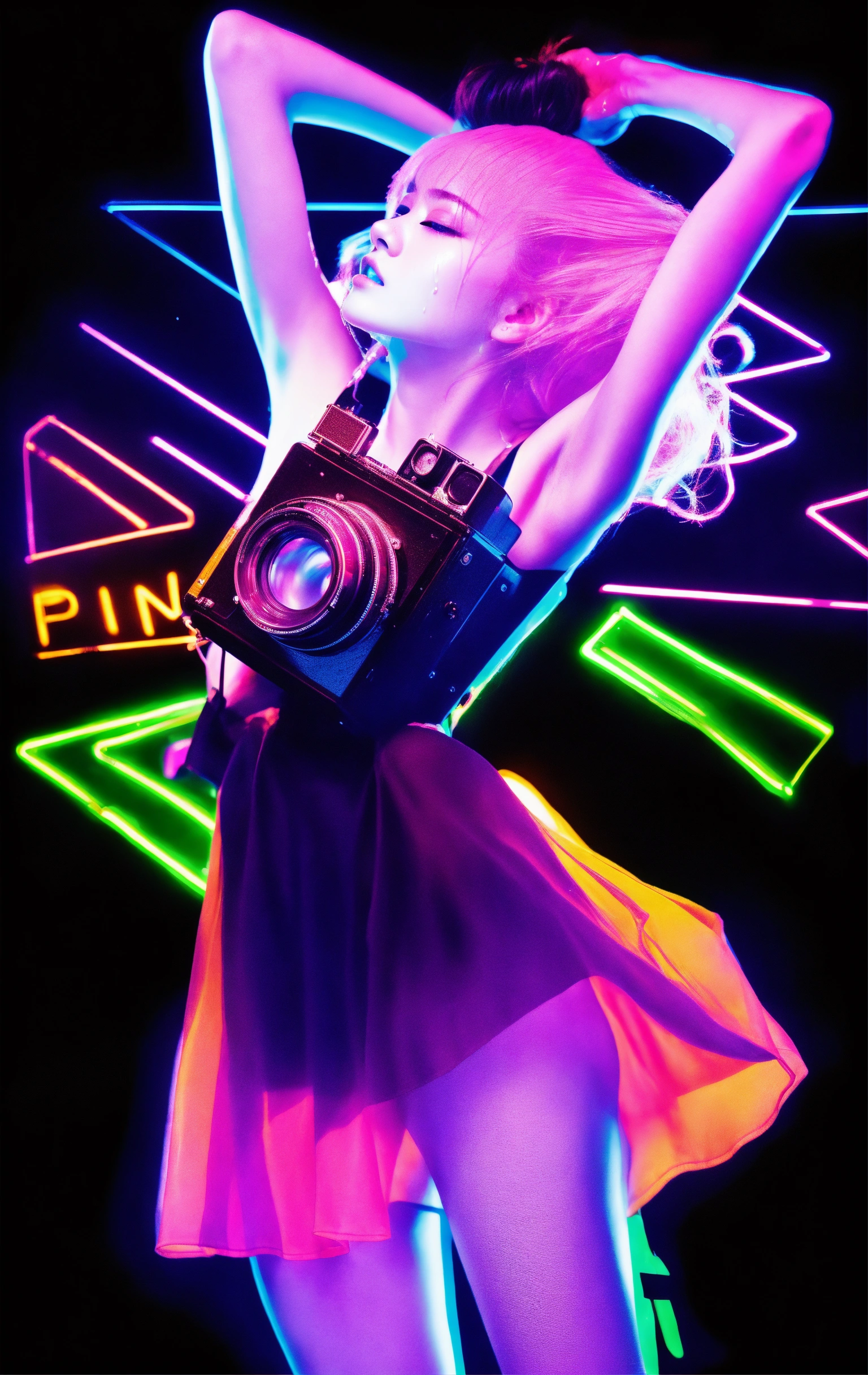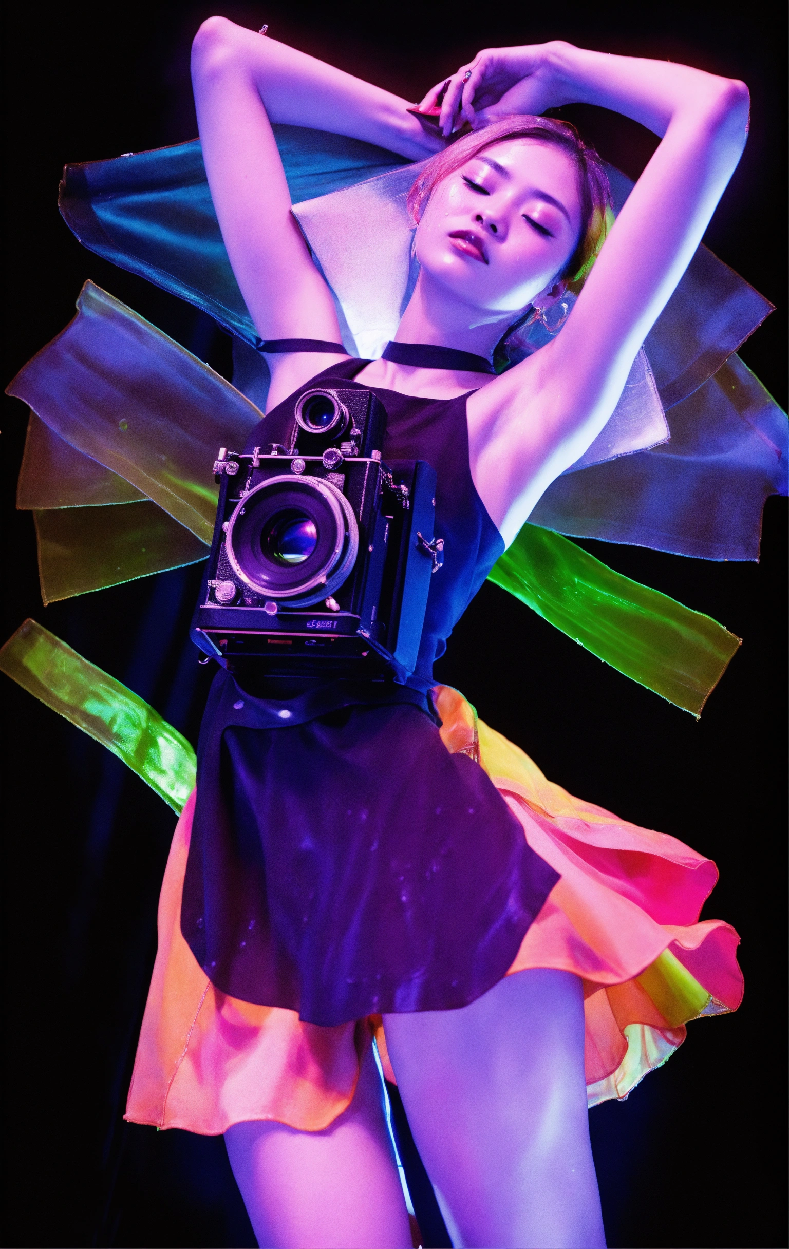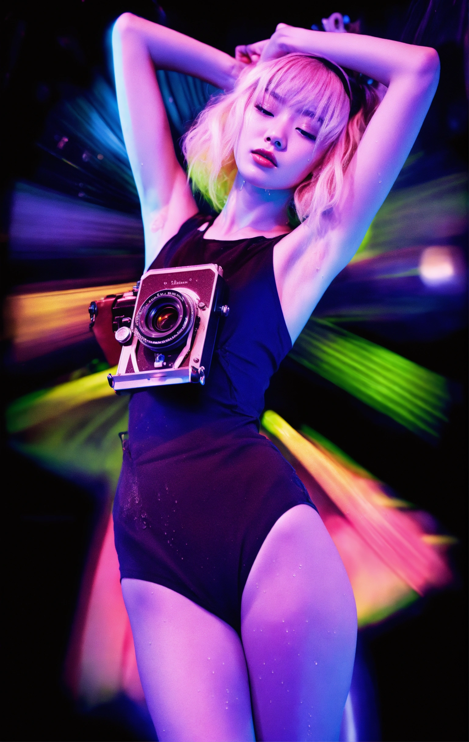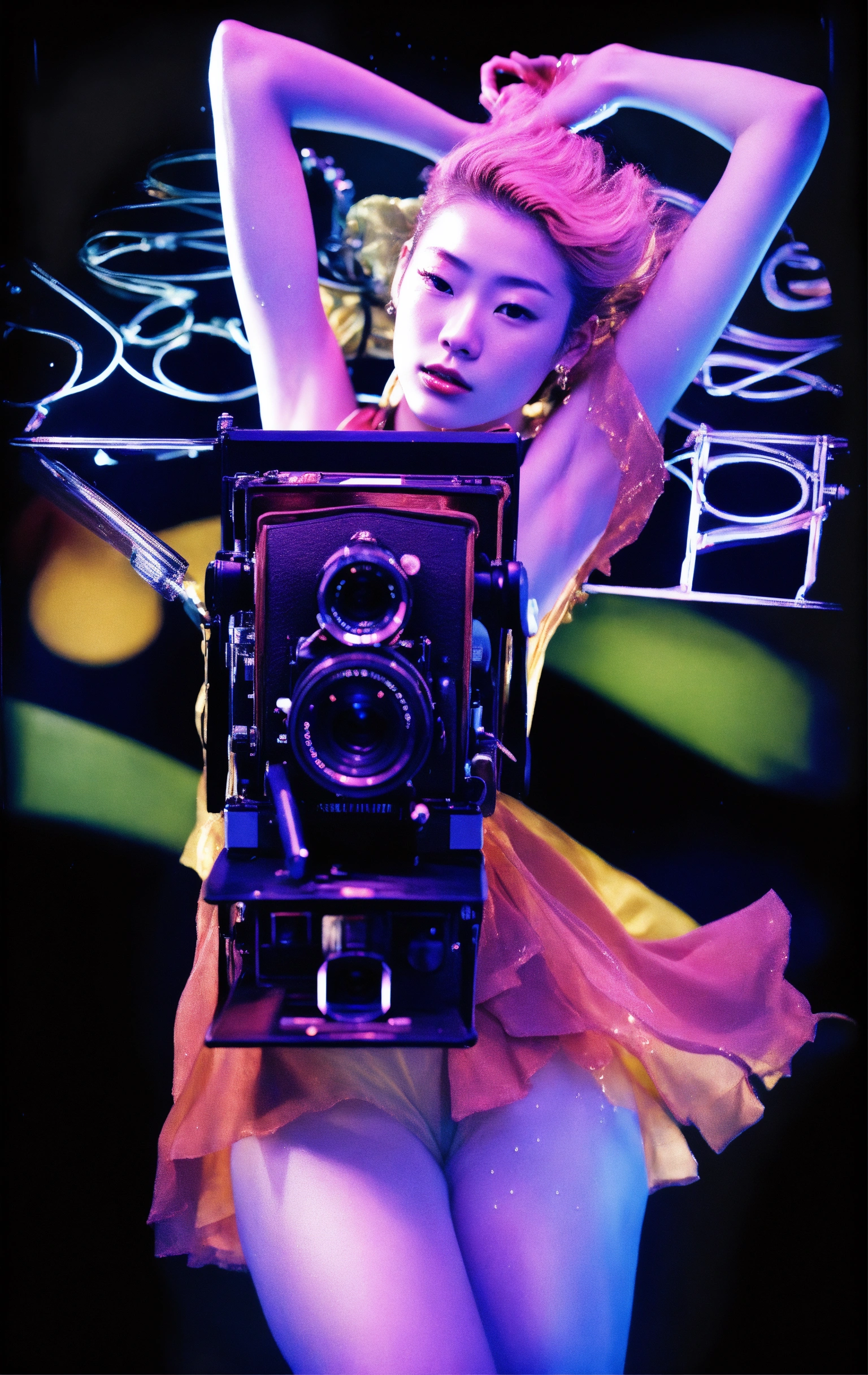 A hyper-realistic wet-plate photograph of a japanese fashion model in a top, a short, holding a vintage camera, 256k.