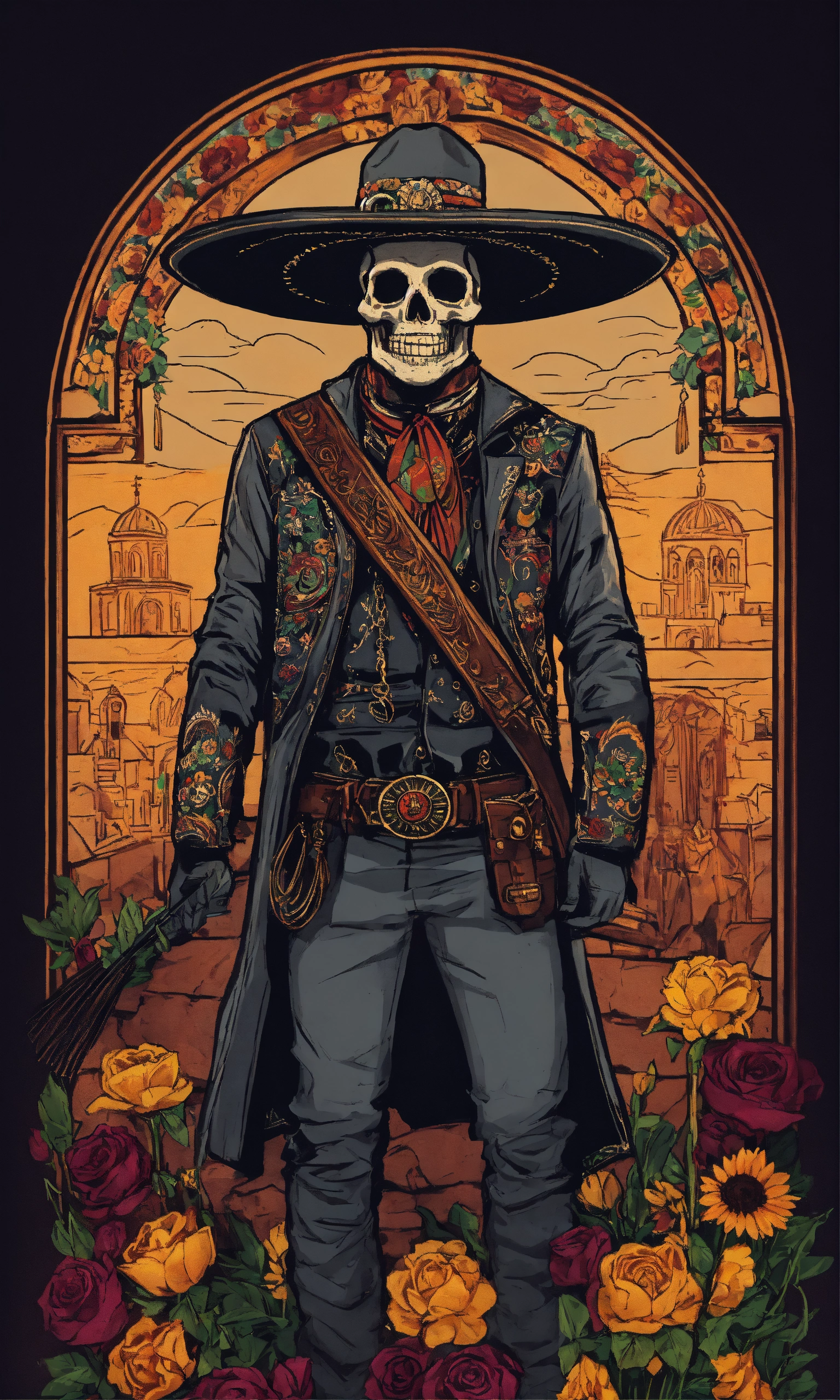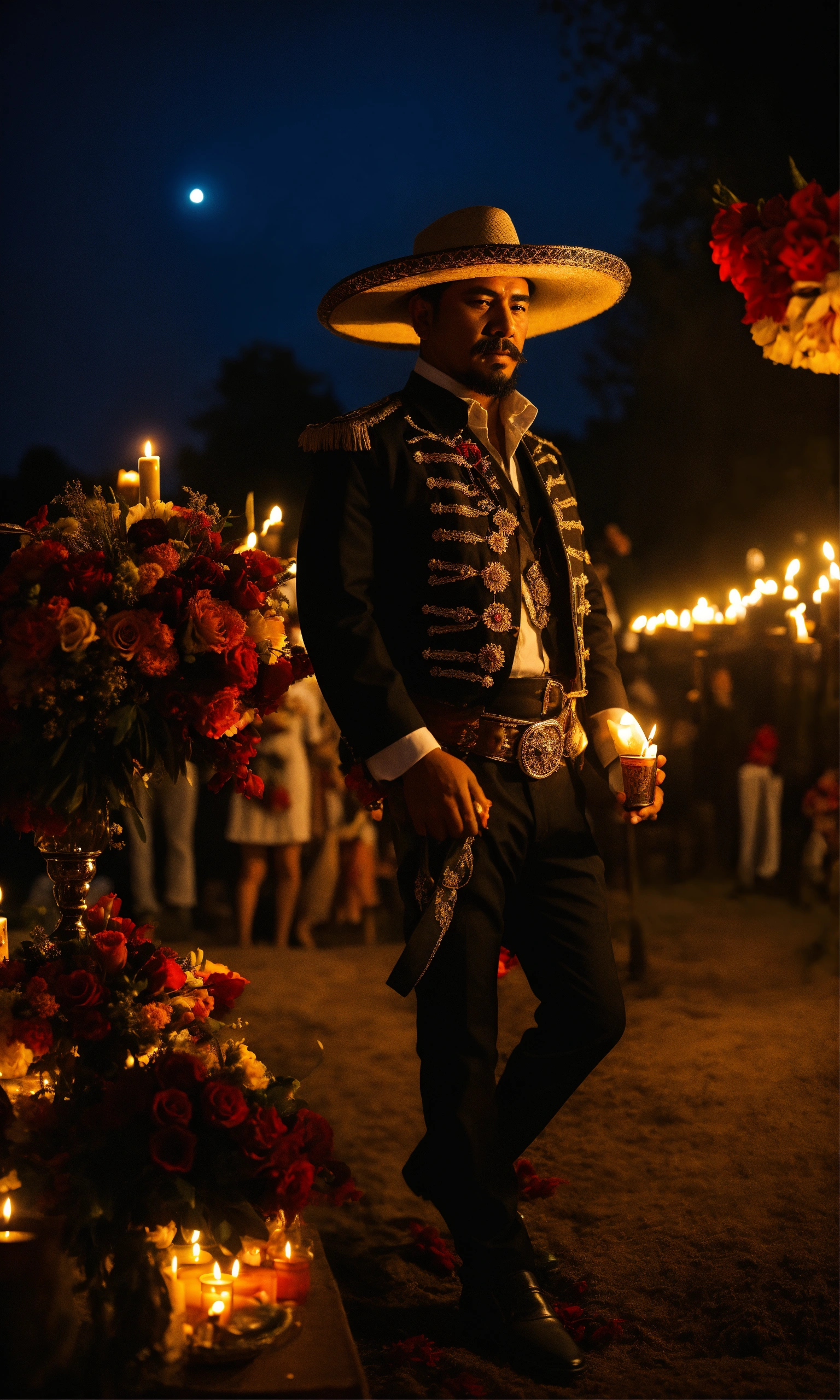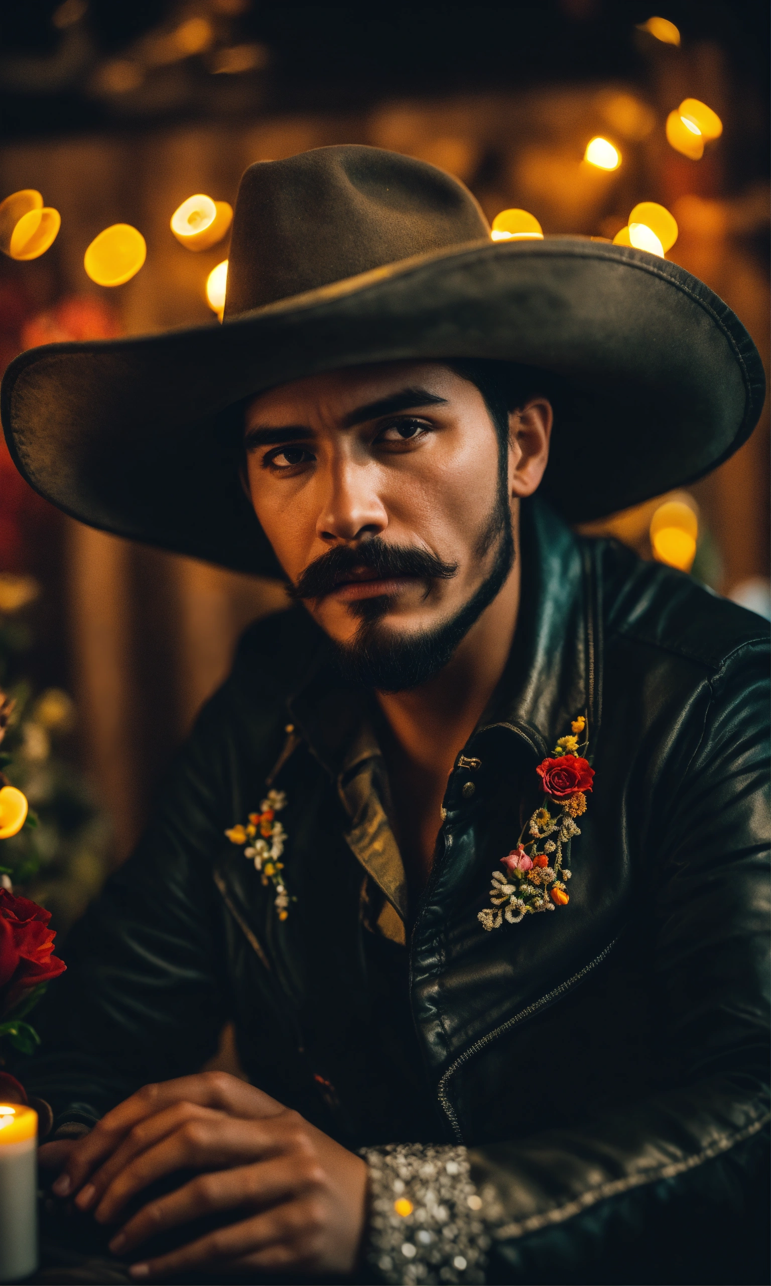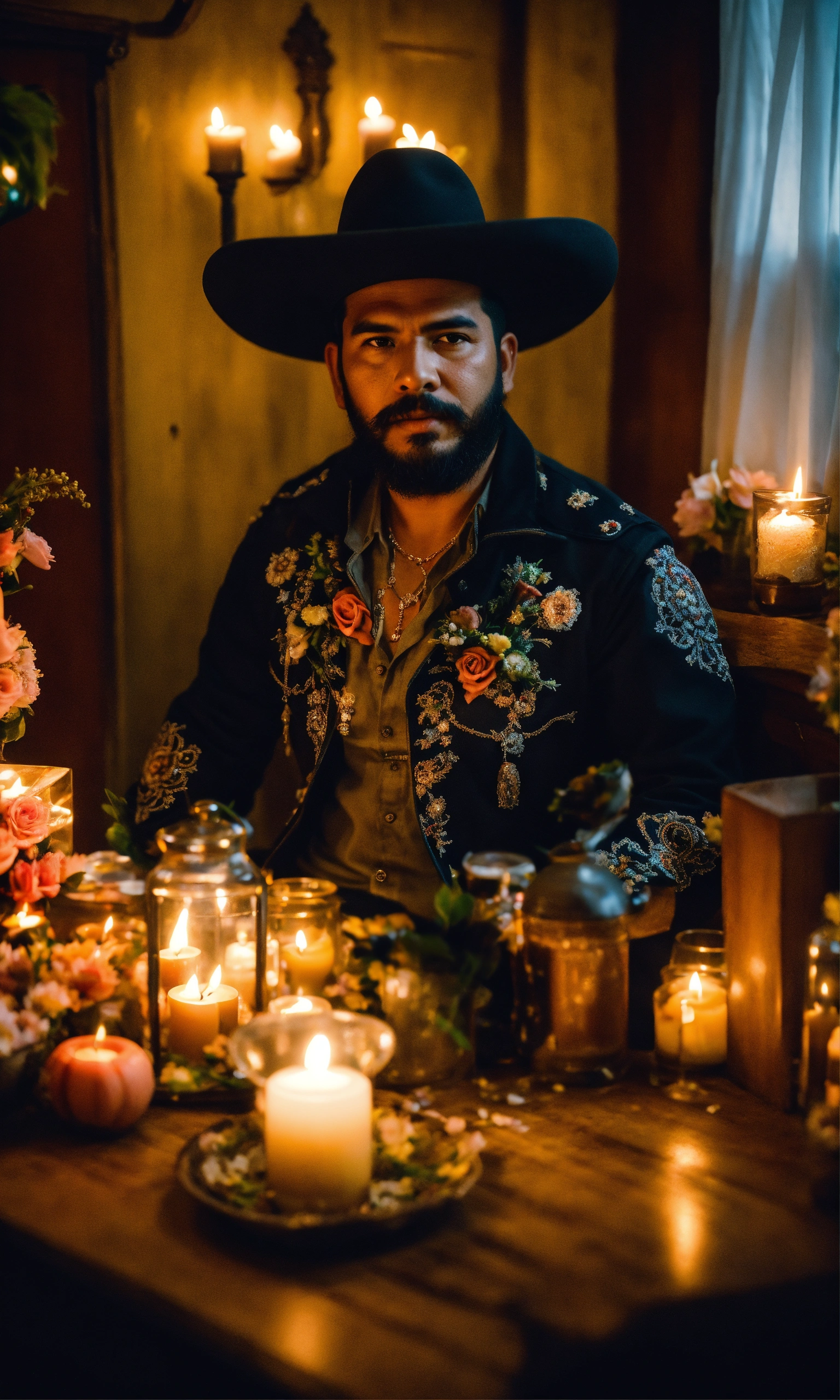 Norteño mexicano, rodeado de su familia, con chamarra de cuero café, sombrero norteño, barba tupida y gris, en un panteón, rodeado de velas y flores de cempasuchil, de noche, ofrenda, día de muertos, realista hd, luces cinematográficas.