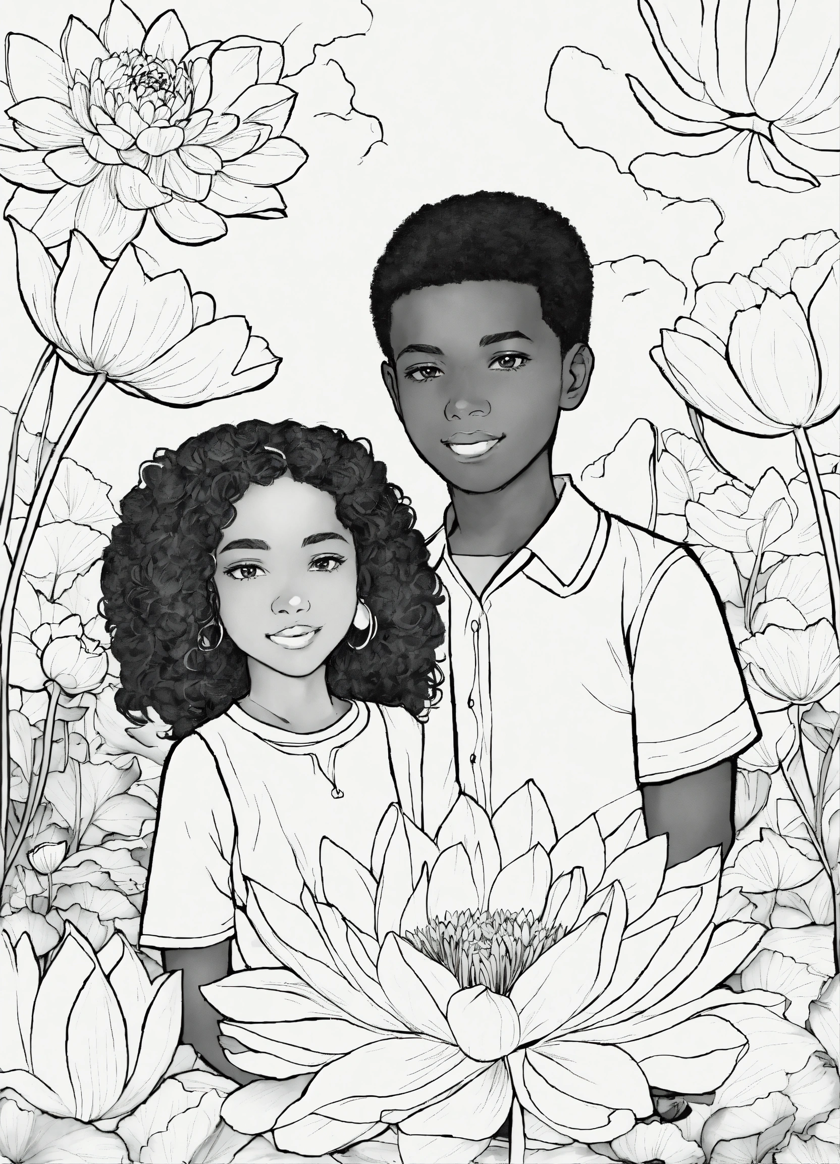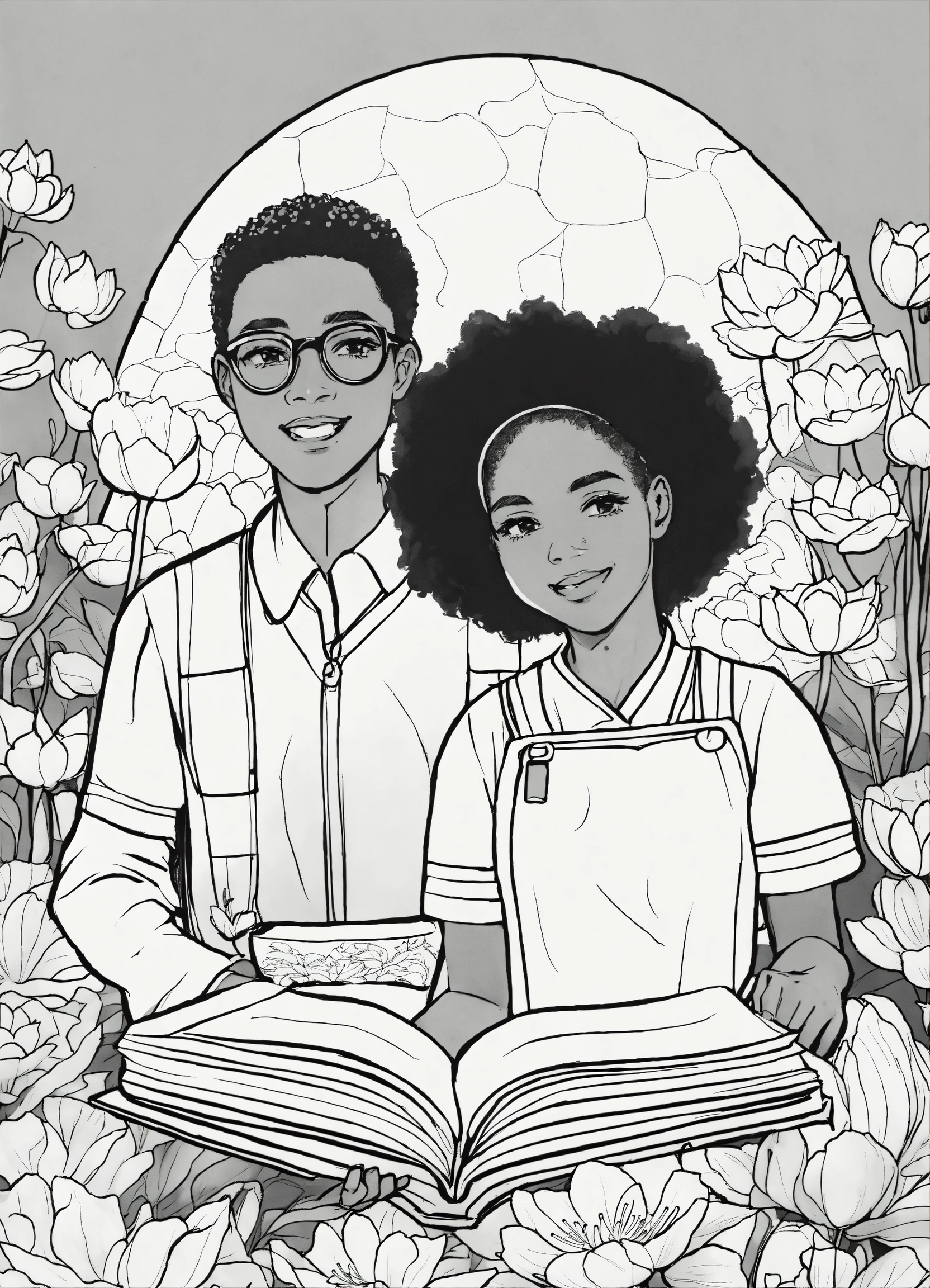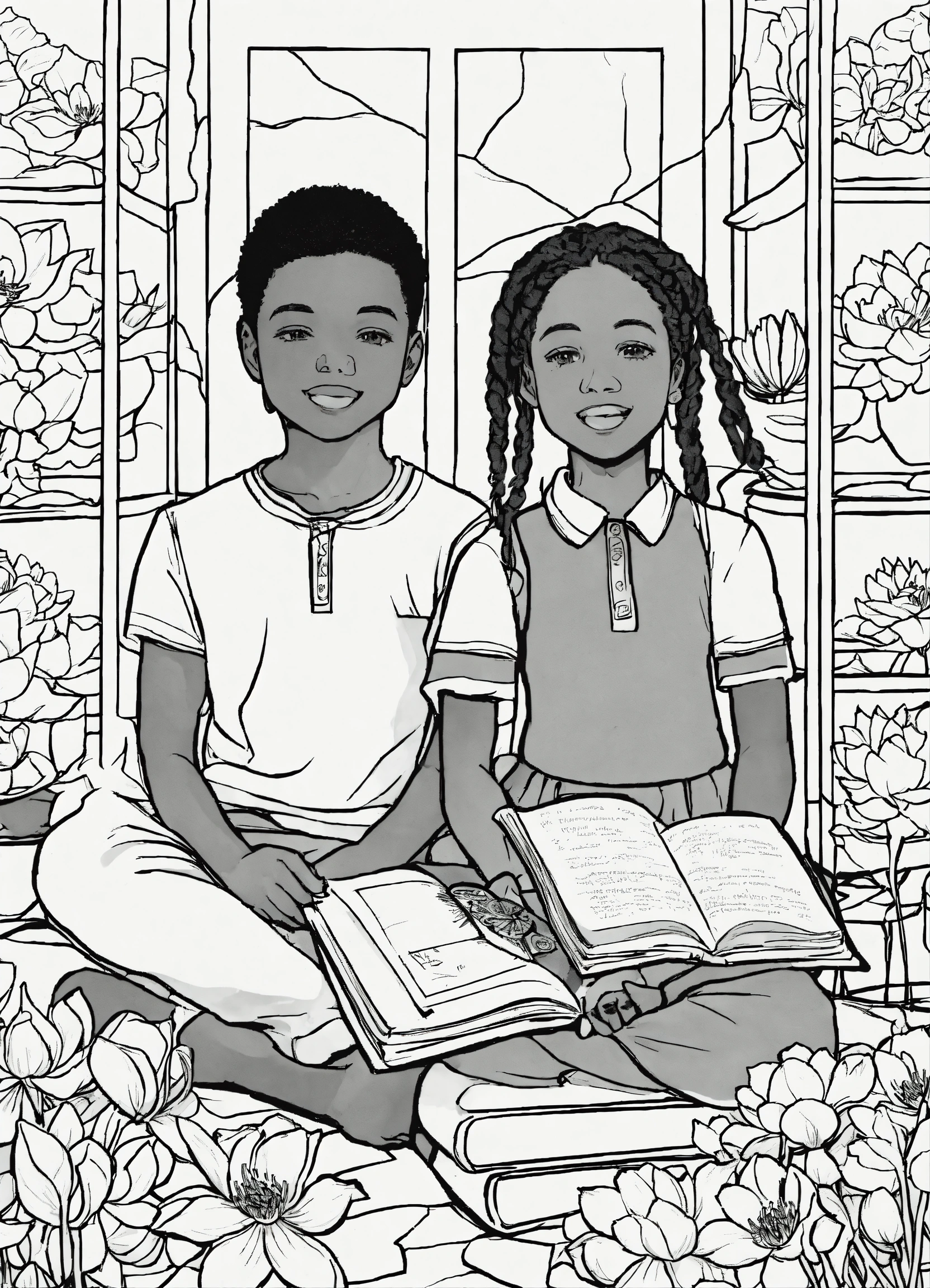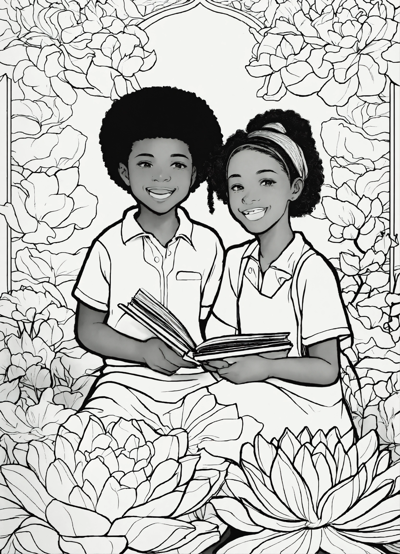 Black and white coloring book image of african american studentboy and girl lotus flowers books, education yellow and blue