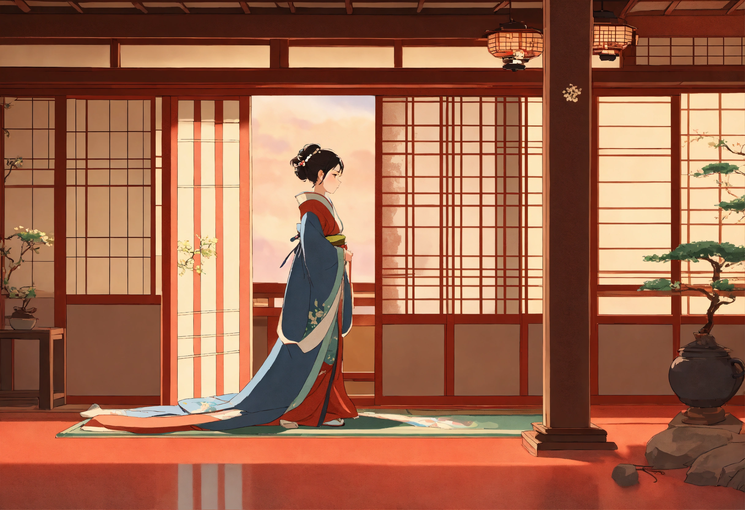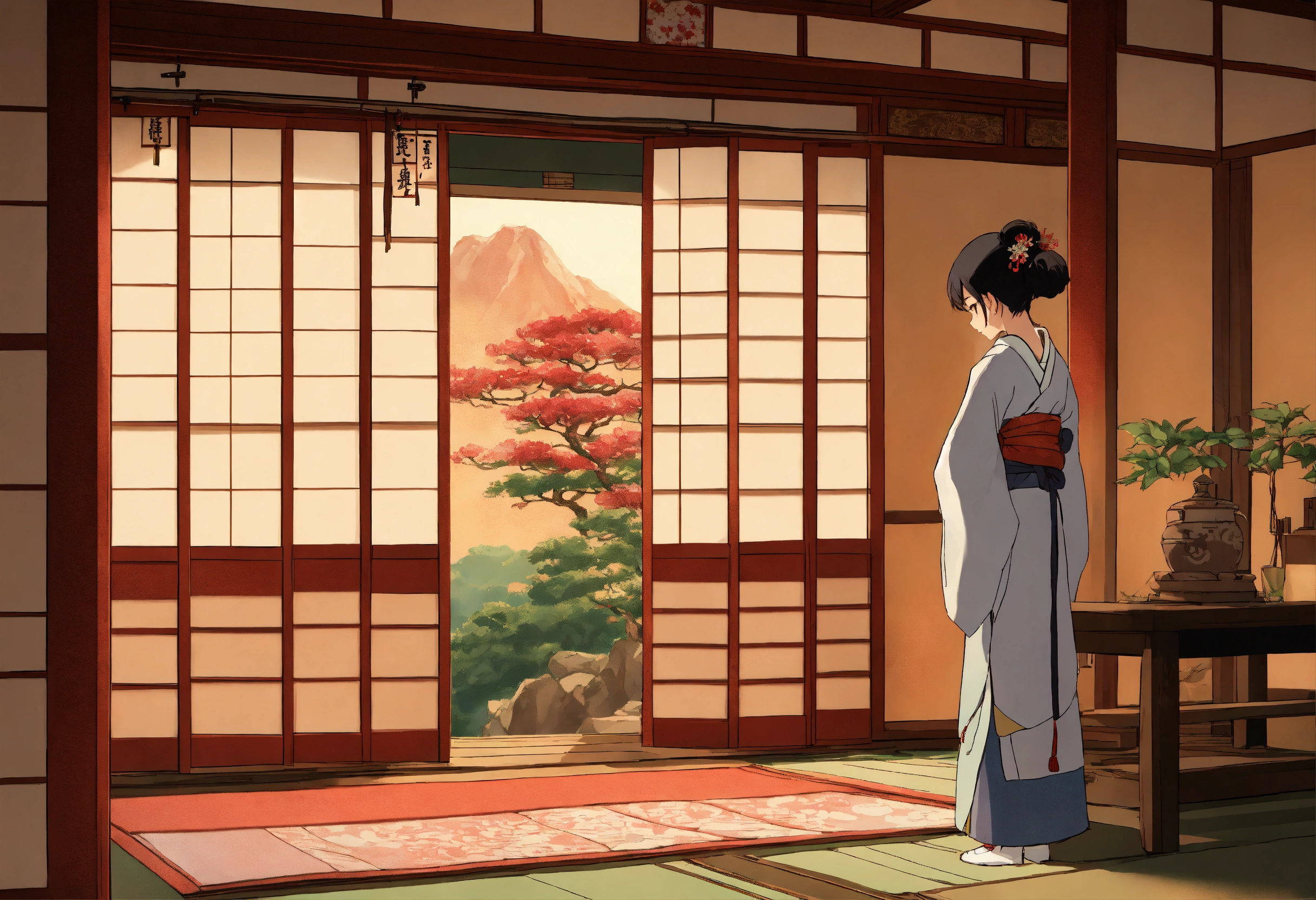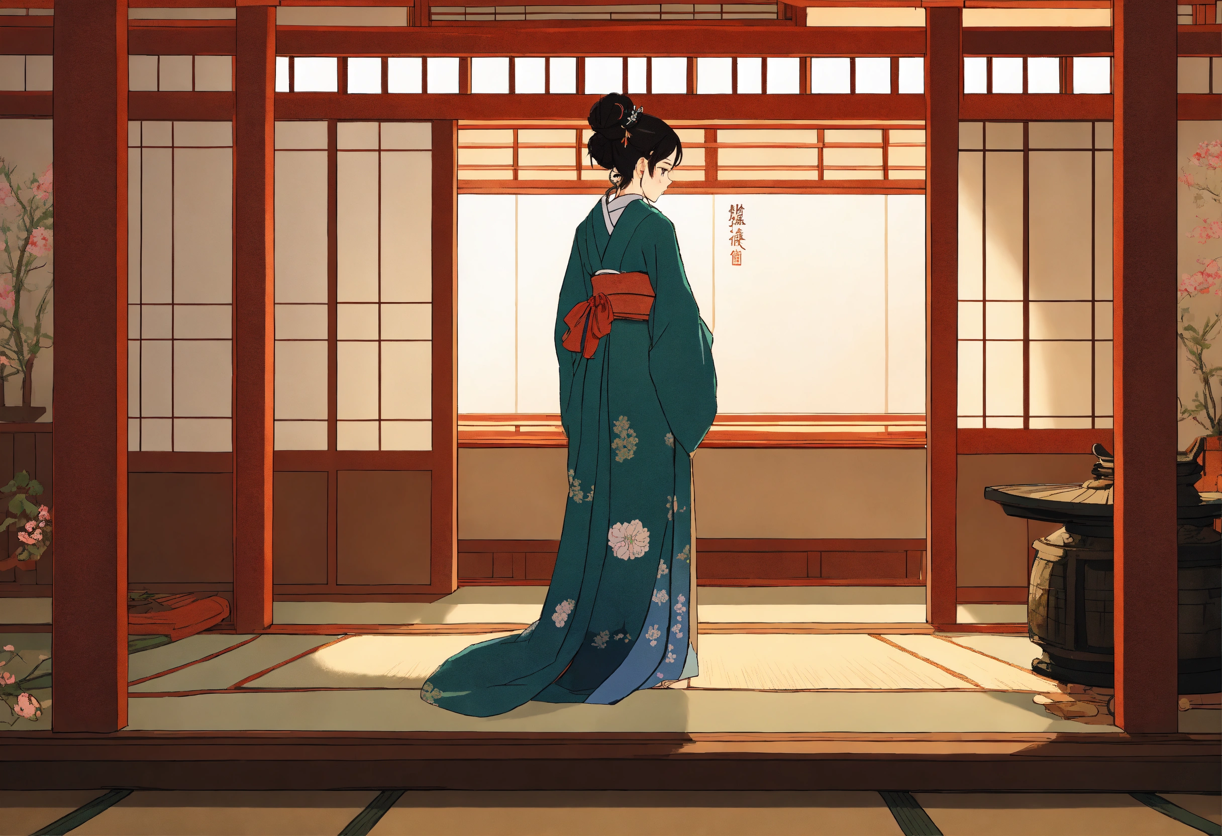 In a studio ghibli-inspired style, illustrate a woman in western attire leaning against a pillar in a traditional japanese room with sliding paper doors (障子). she is facing forward with a languid, ennui-filled expression.