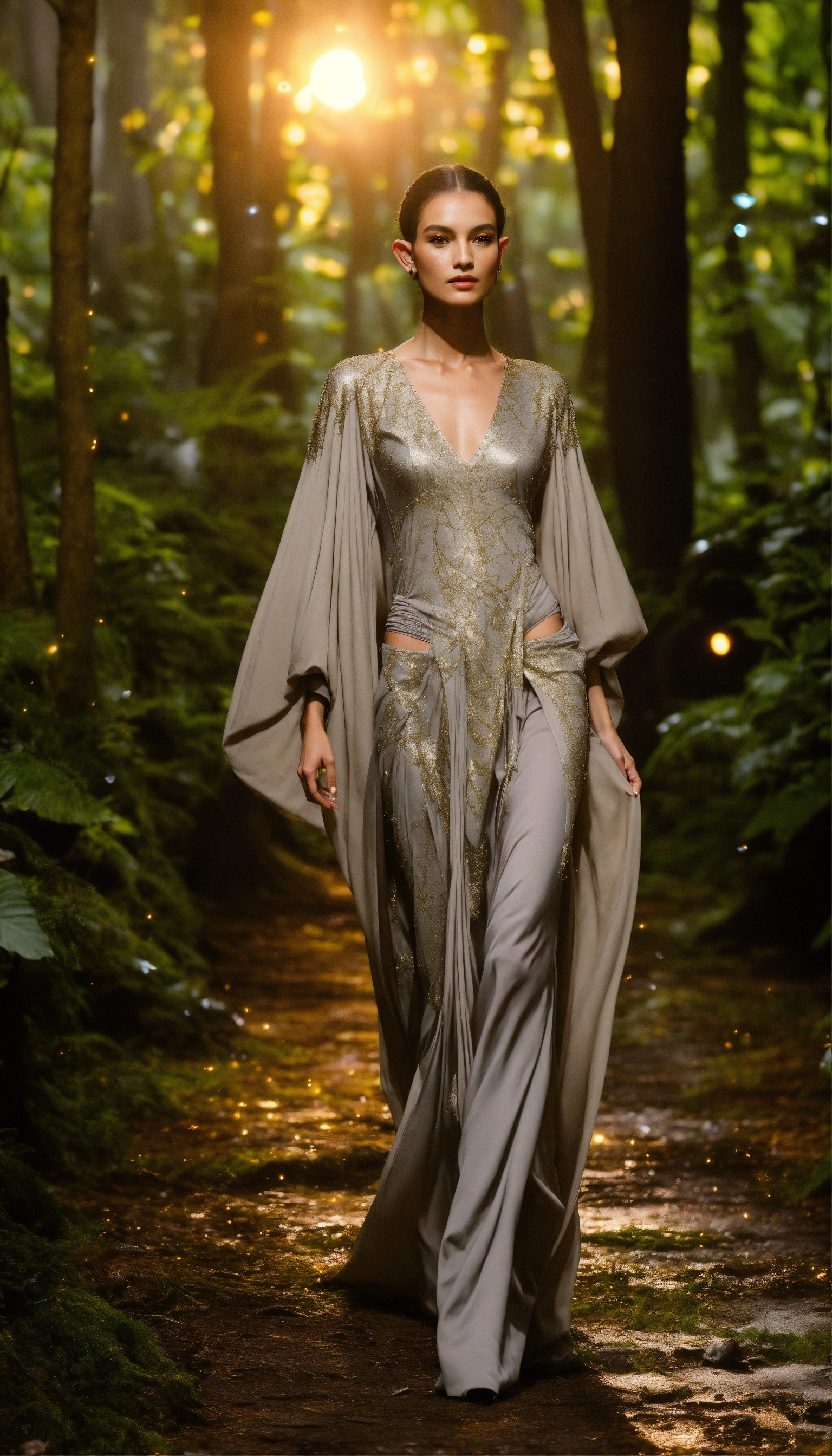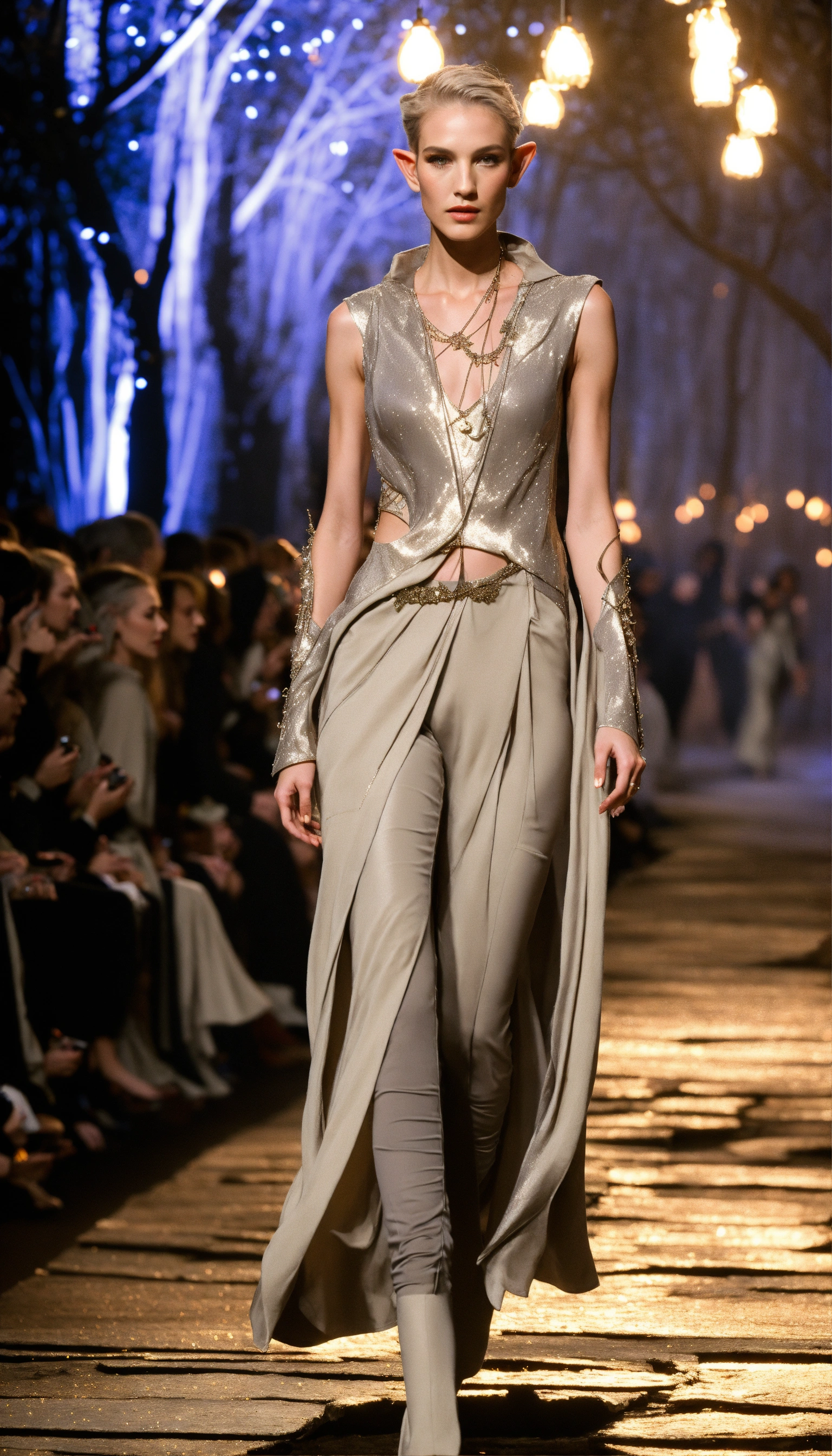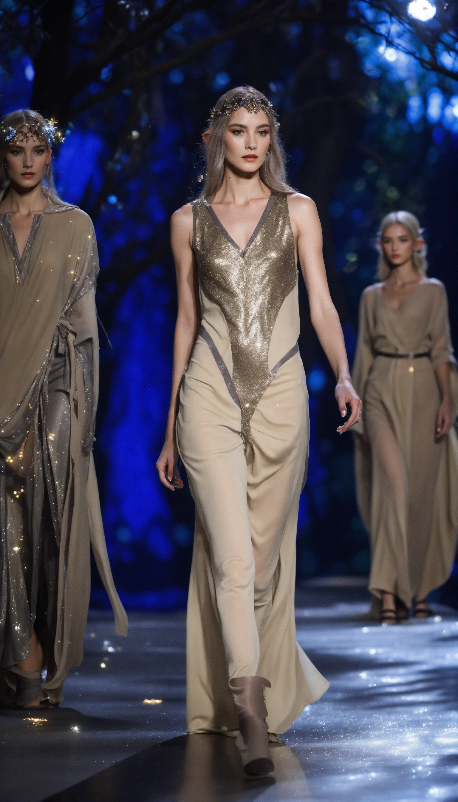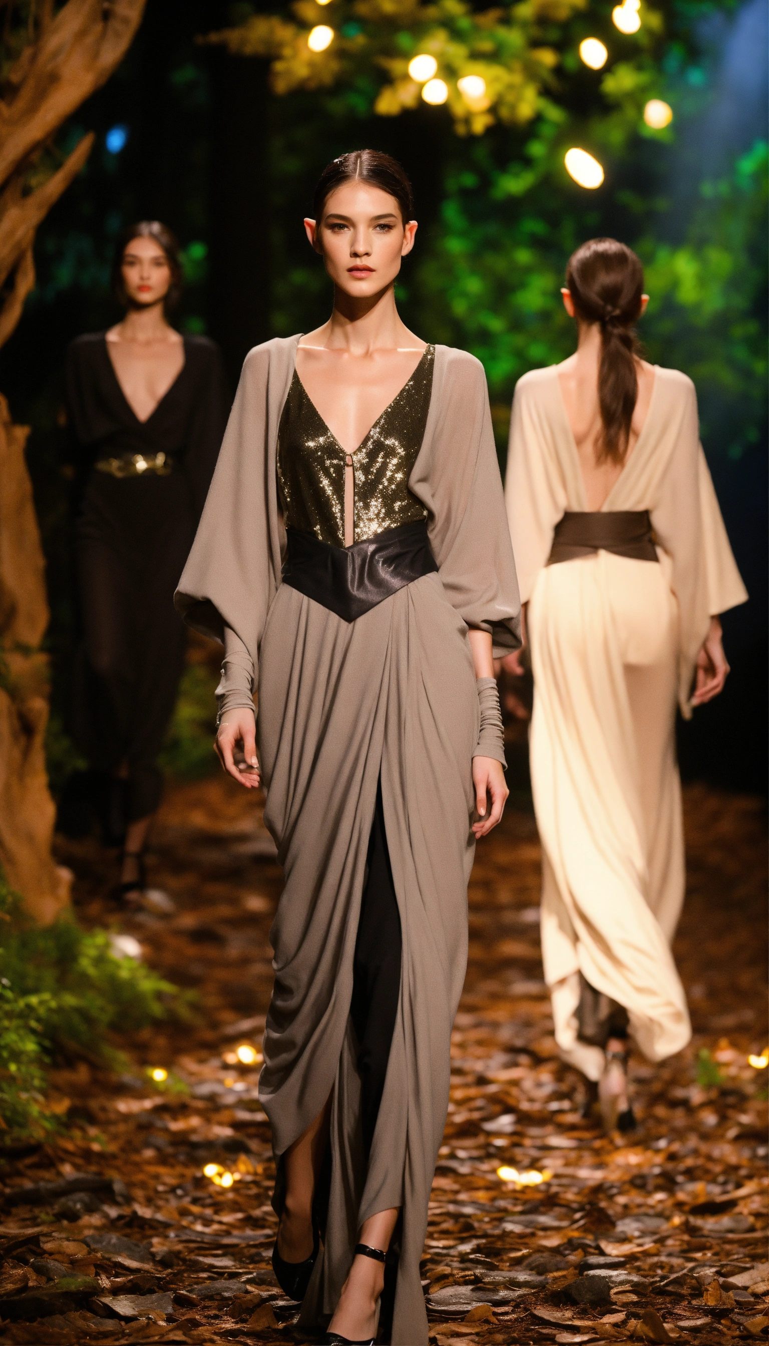 Lothlorien androgynous elves walking runway during elvin fashion week wearing dolman sleeve elvish donna karan fashion in black, white, grey, beige, stone, metallics, shimmer at an enchanted forest runway at starry nighttime, fireflies