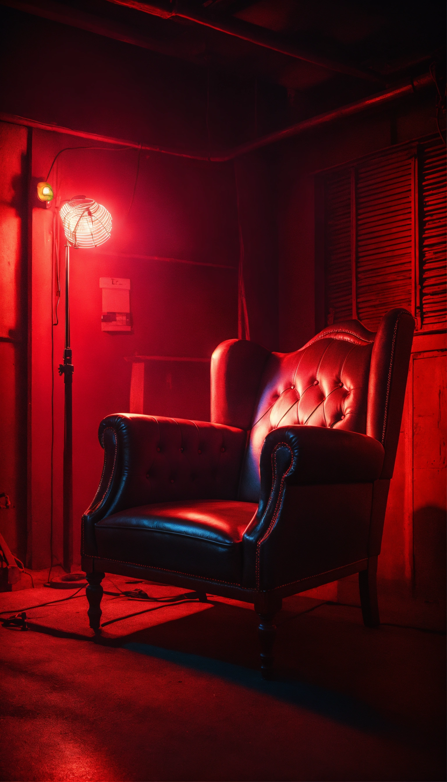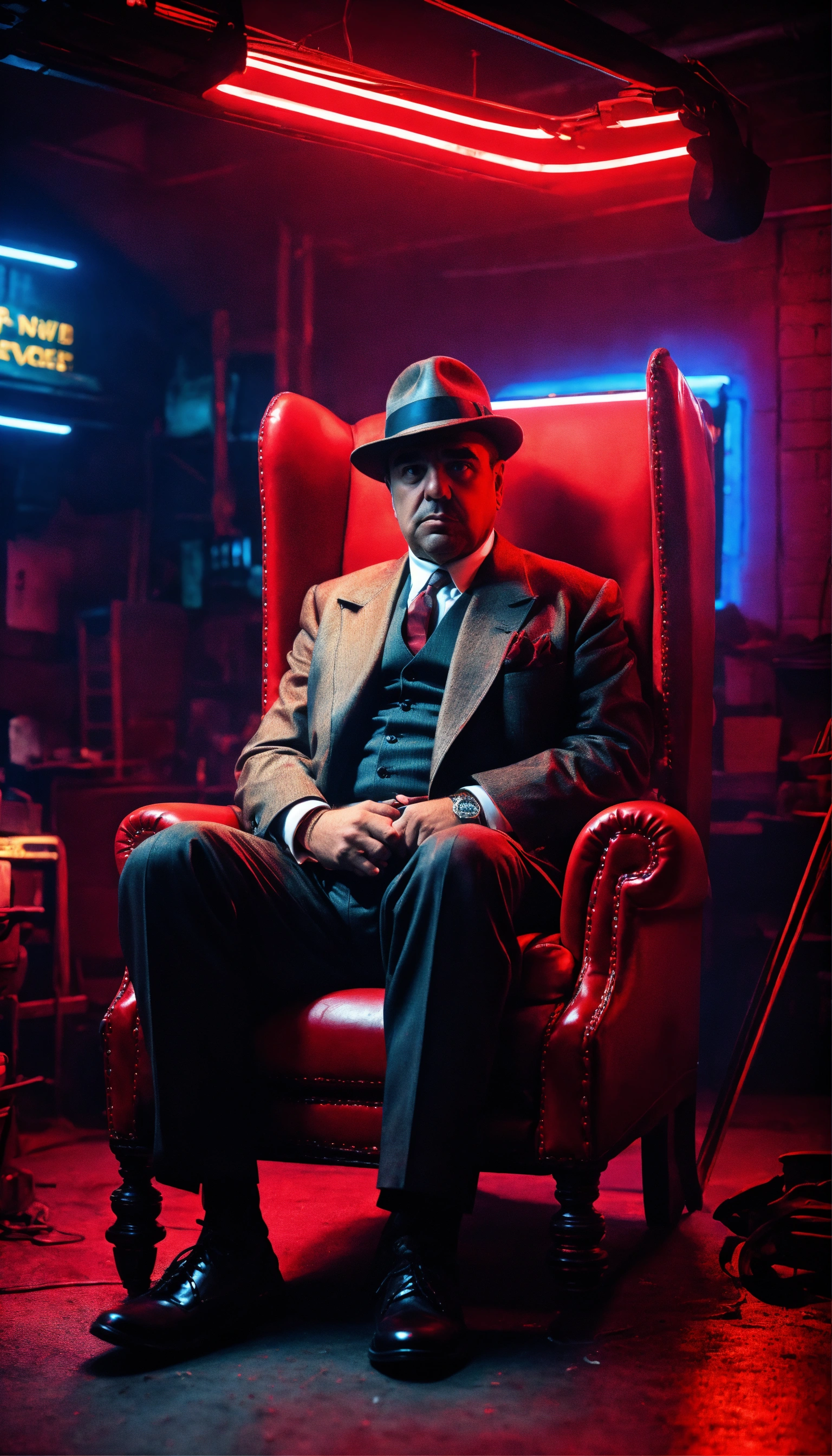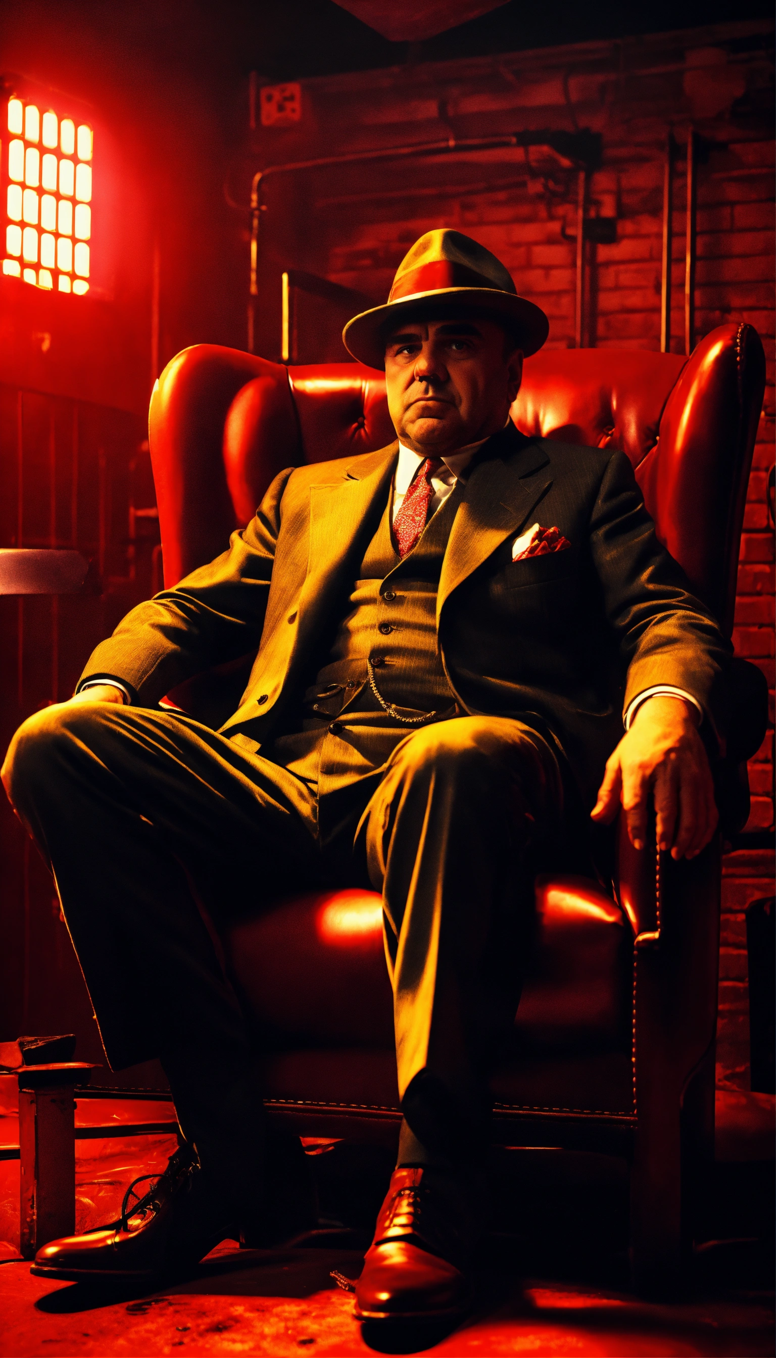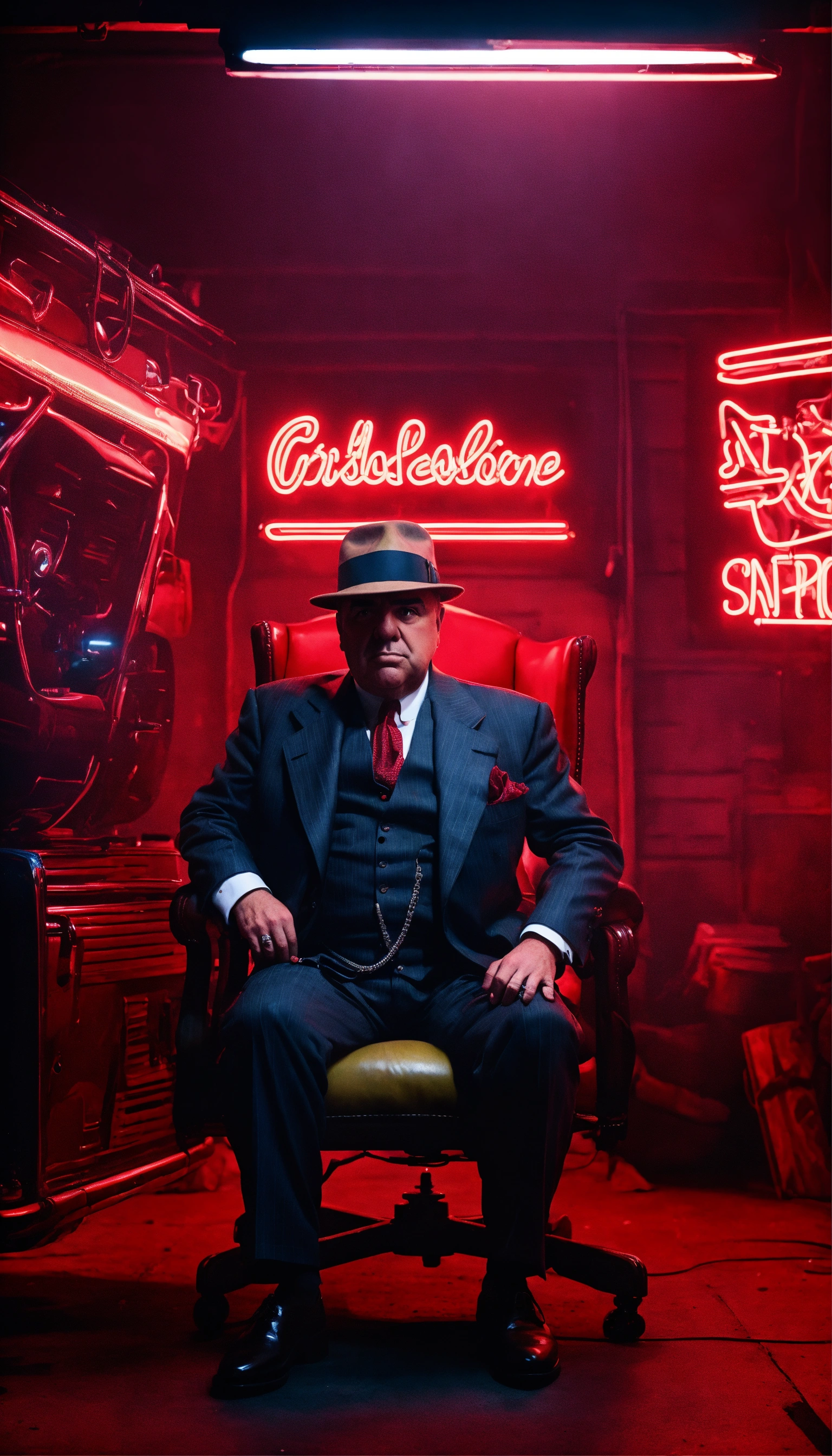 Portrait realistic of al capone old seat on a chair in a darkness garage face infront the camera with large angle with red neon 8k high quality