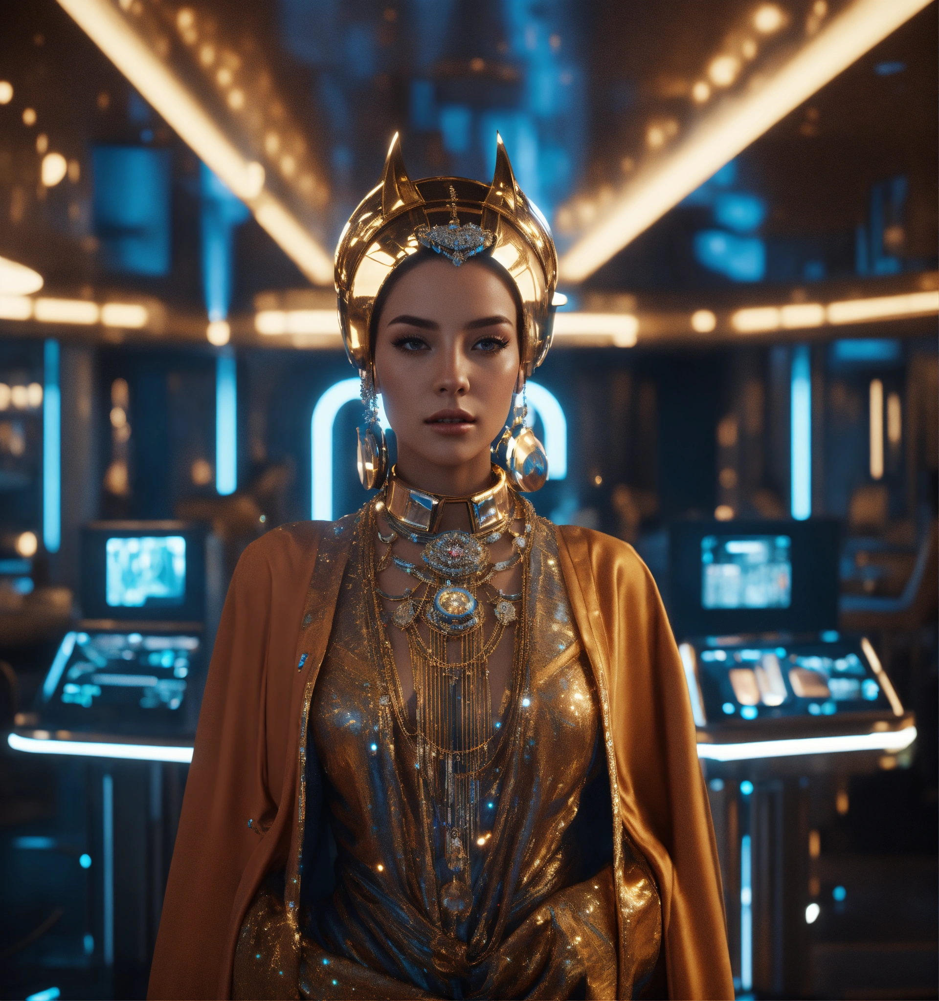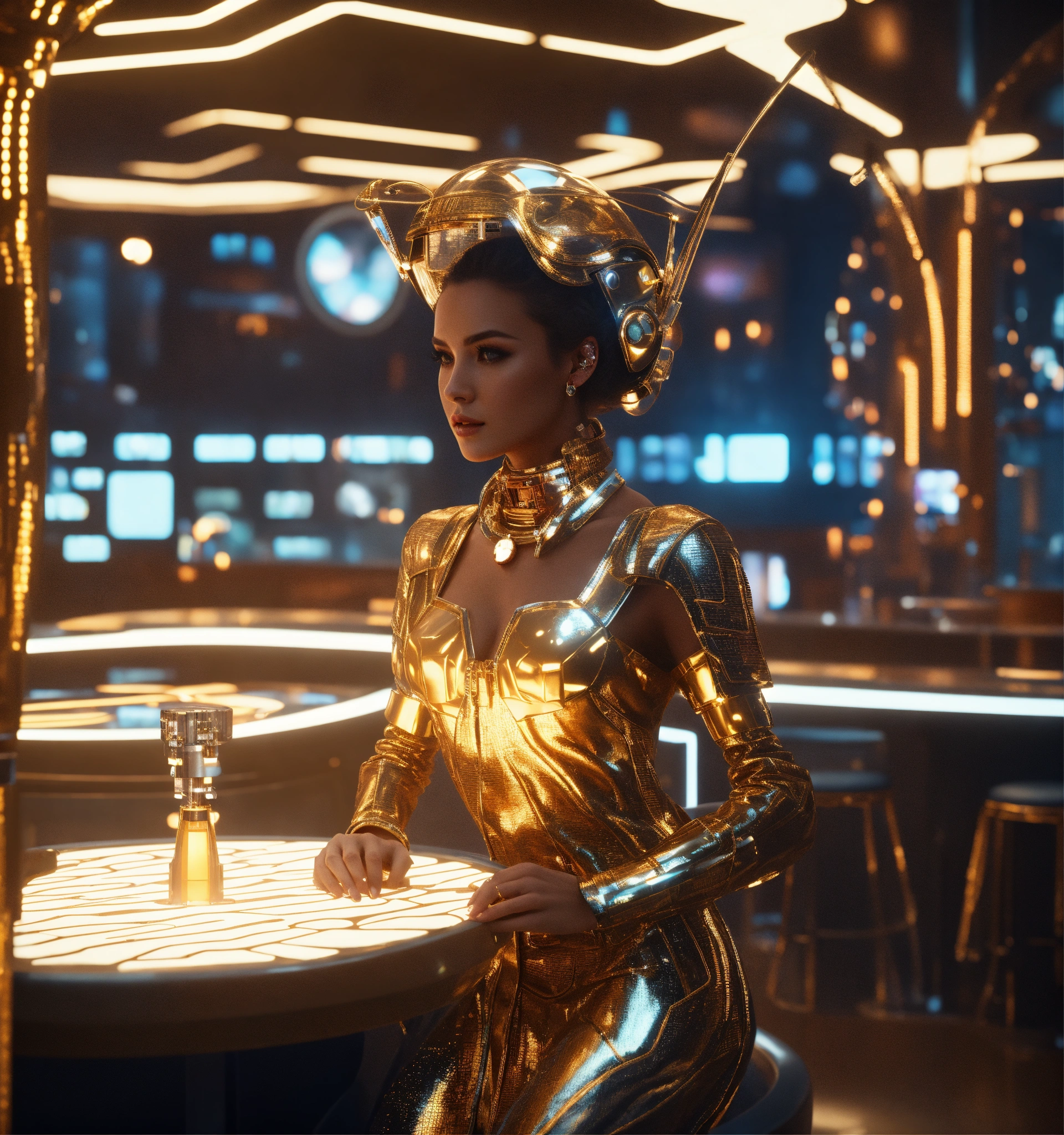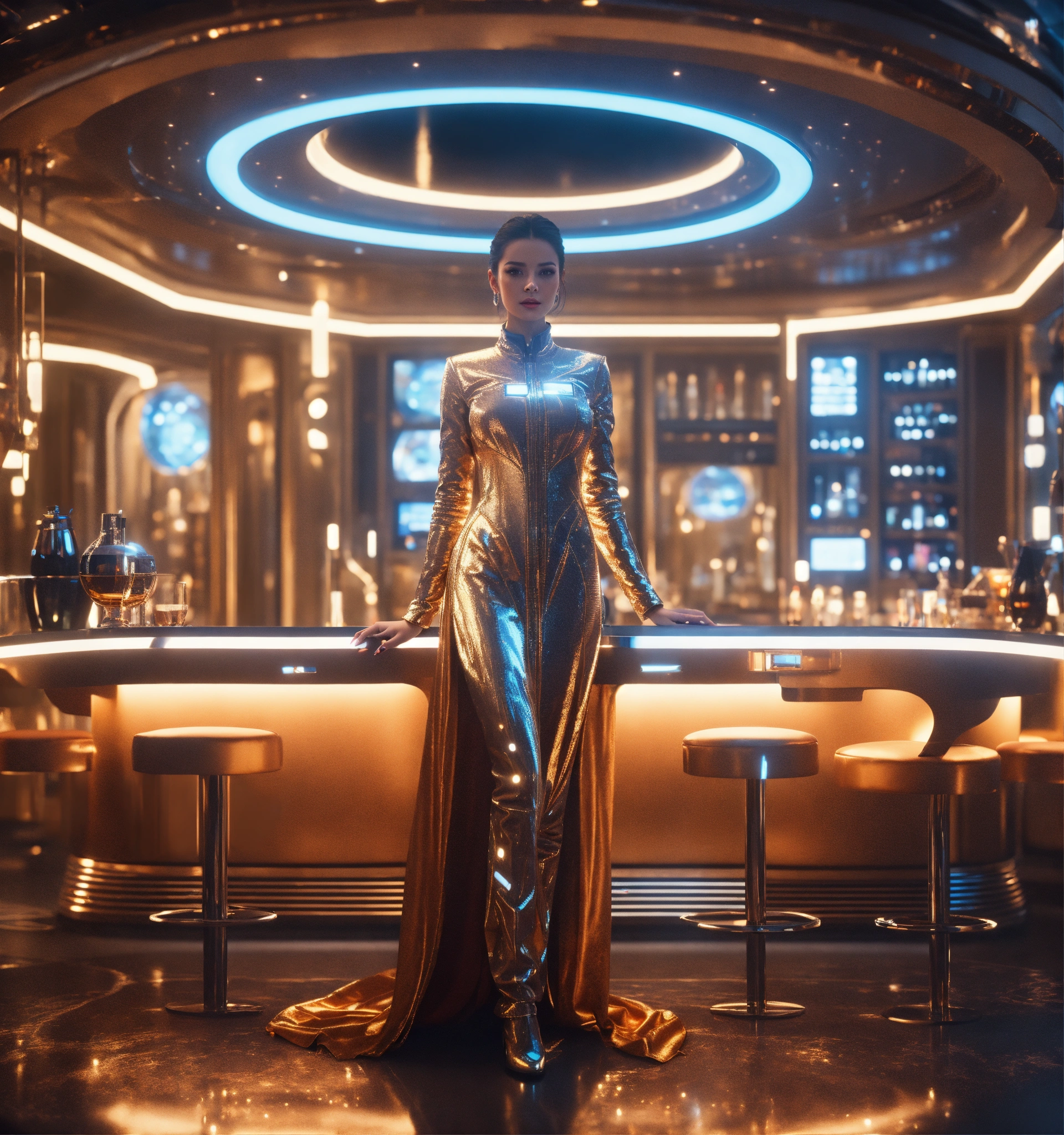 Zoom out from an alluring beautiful humanoid, wearing a fancy space robe and jewelry in a futuristic space bar hotel, realistic, futuristic, sci-fi, 8k, unreal engine