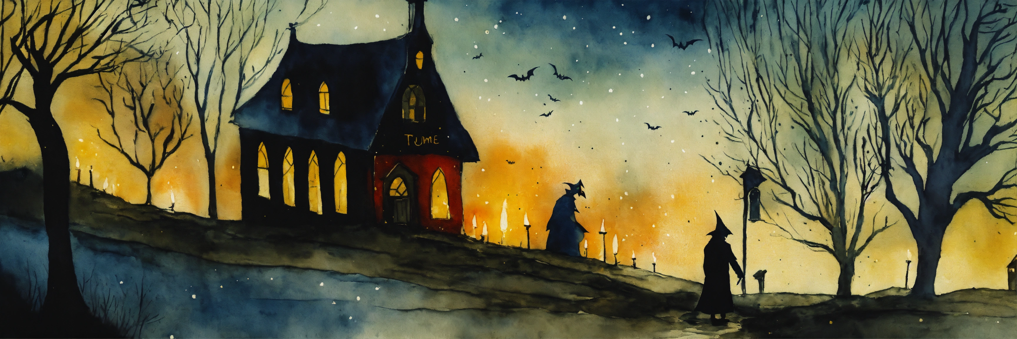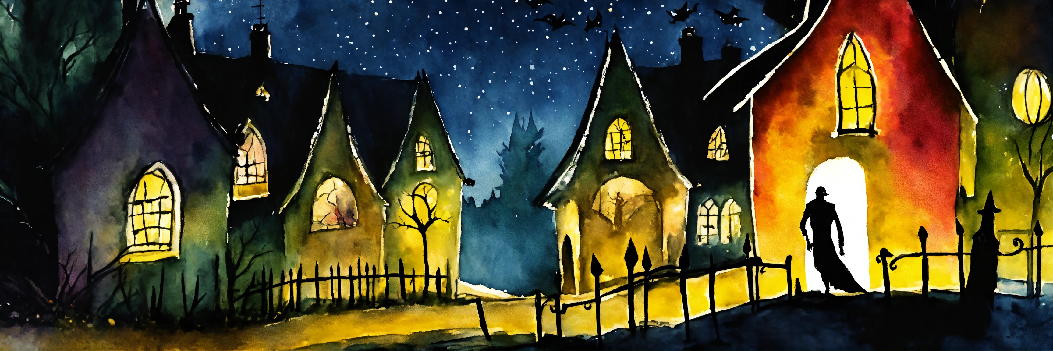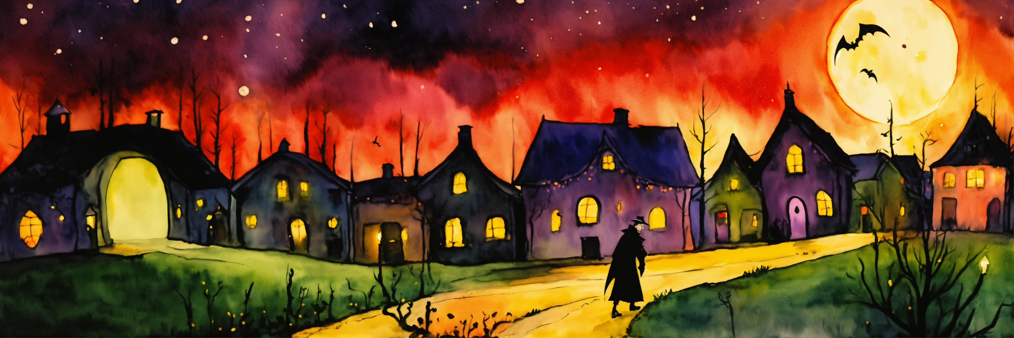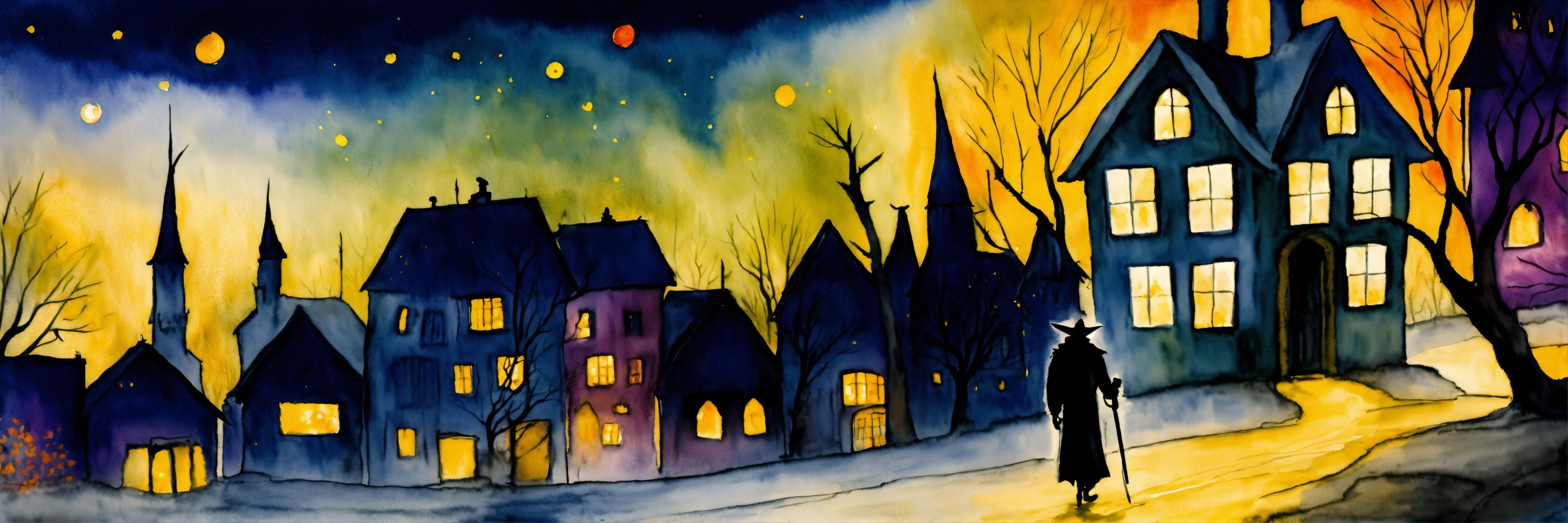 Nosferatu walks through the village at night on halloween, dark night, candles, brightly lit, in the style of "long lost tume. by marc chagall and tim burton. watercolour. ink splash art. minimalist. emotional. dynamic. golden speckles."