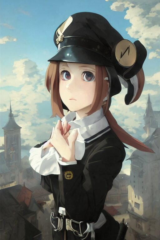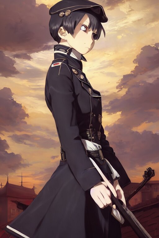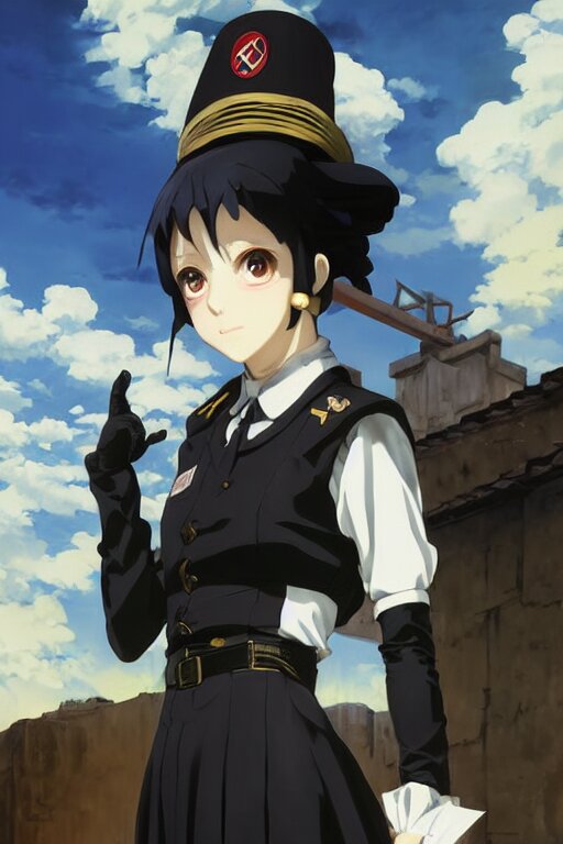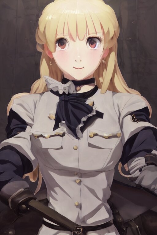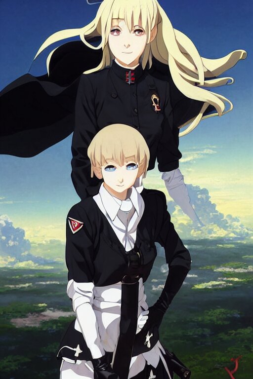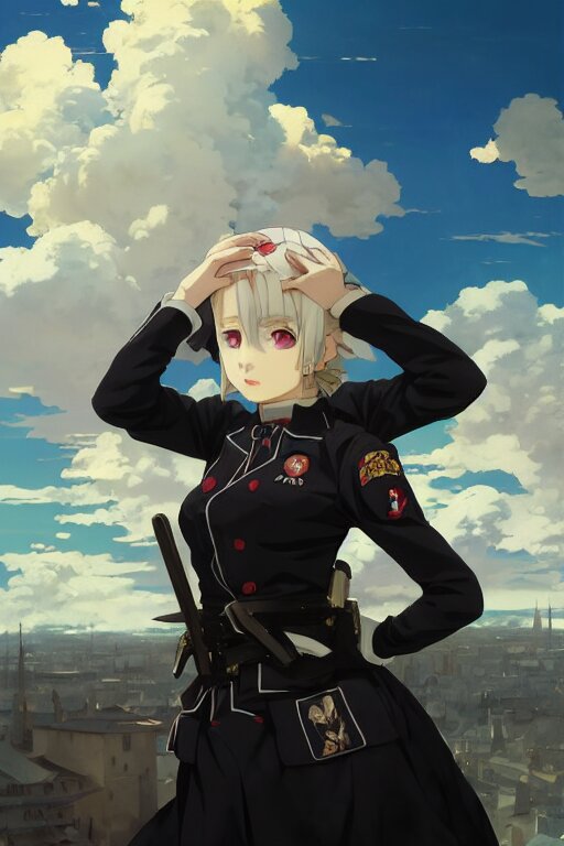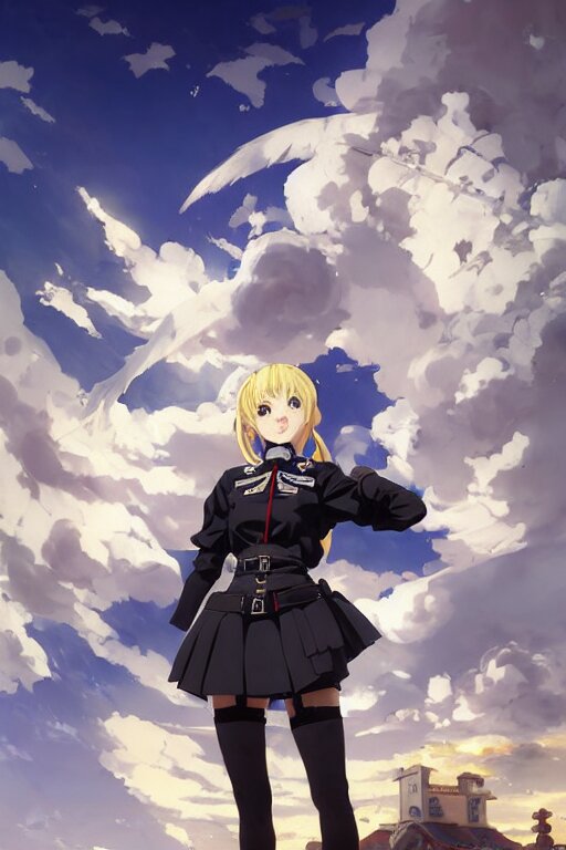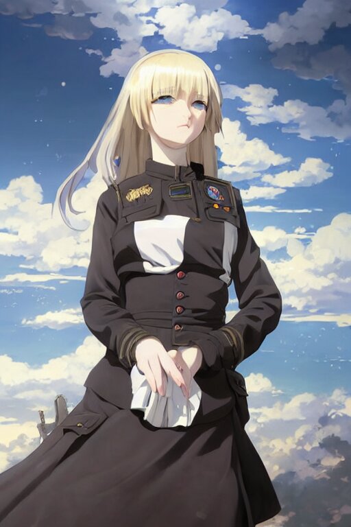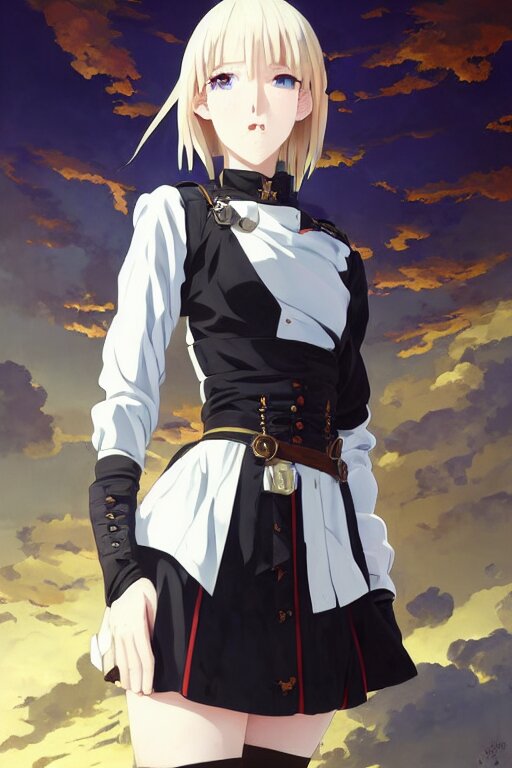 Baroque oil painting anime key visual full body portrait character concept art of young maid nazi secret police looking down on you, flowing blonde hair blue eyes, tight black leather military commander nazi uniform, garter belt skirt, gap moe kuudere noble grimdark dictator, trending pixiv fanbox, by greg rutkowski makoto shinkai takashi takeuchi studio ghibli jamie wyeth