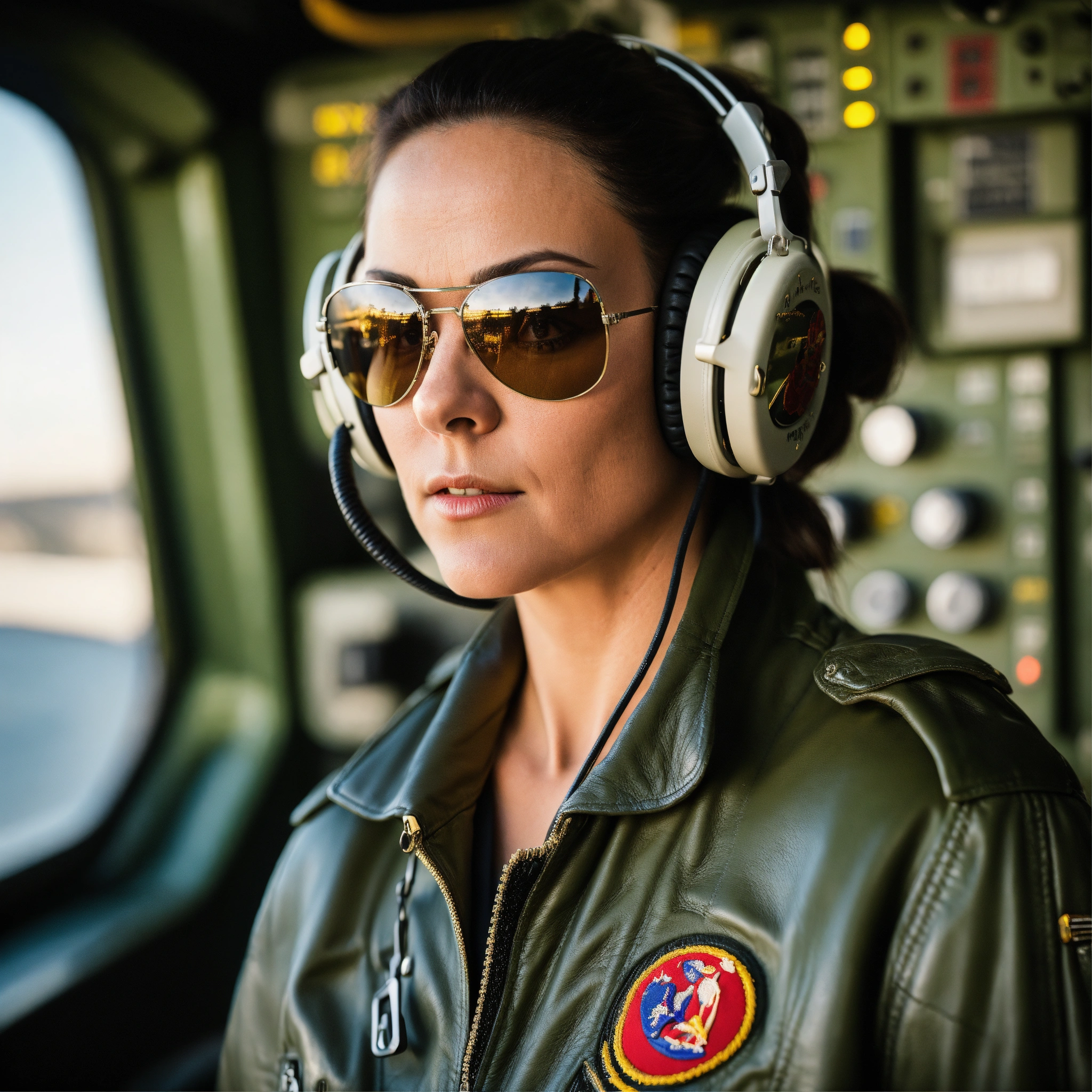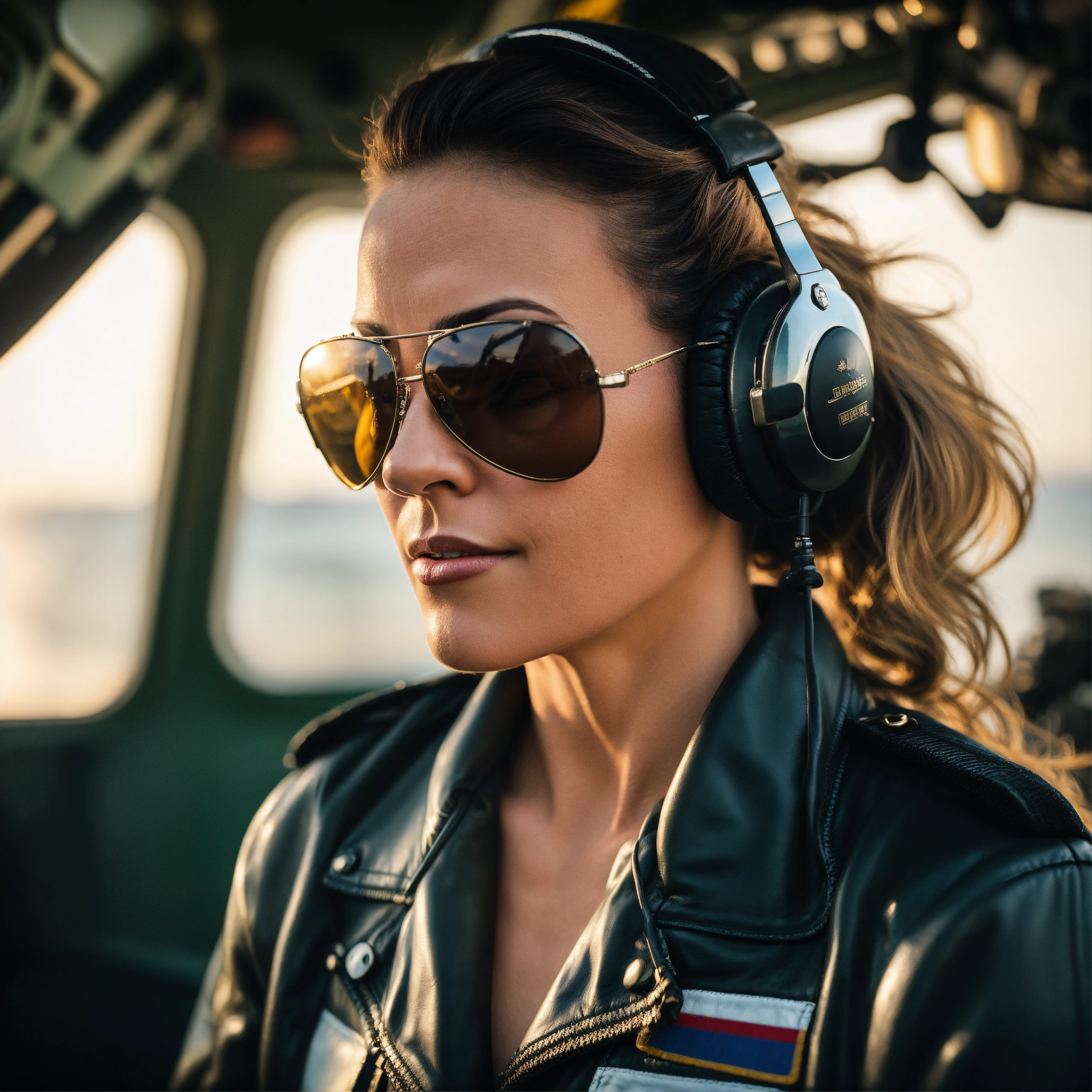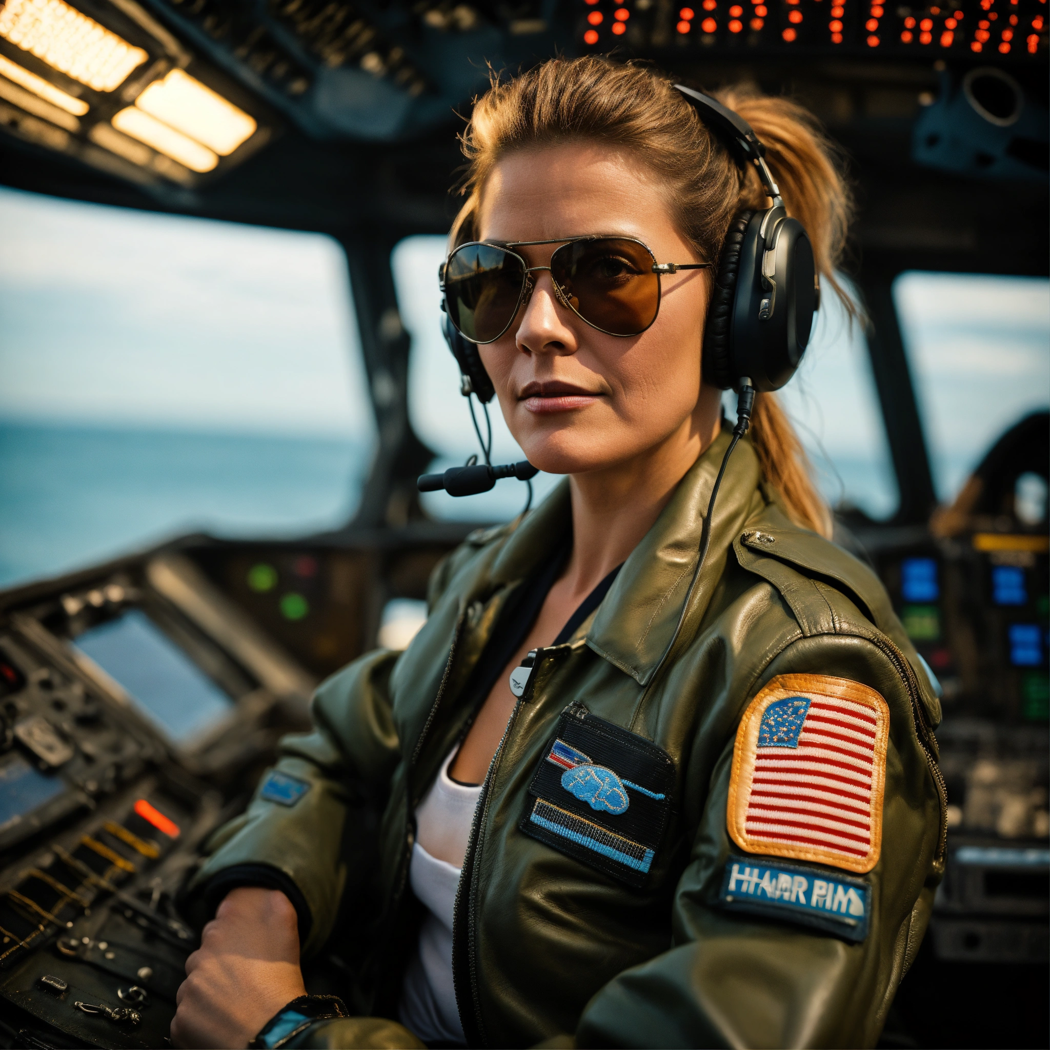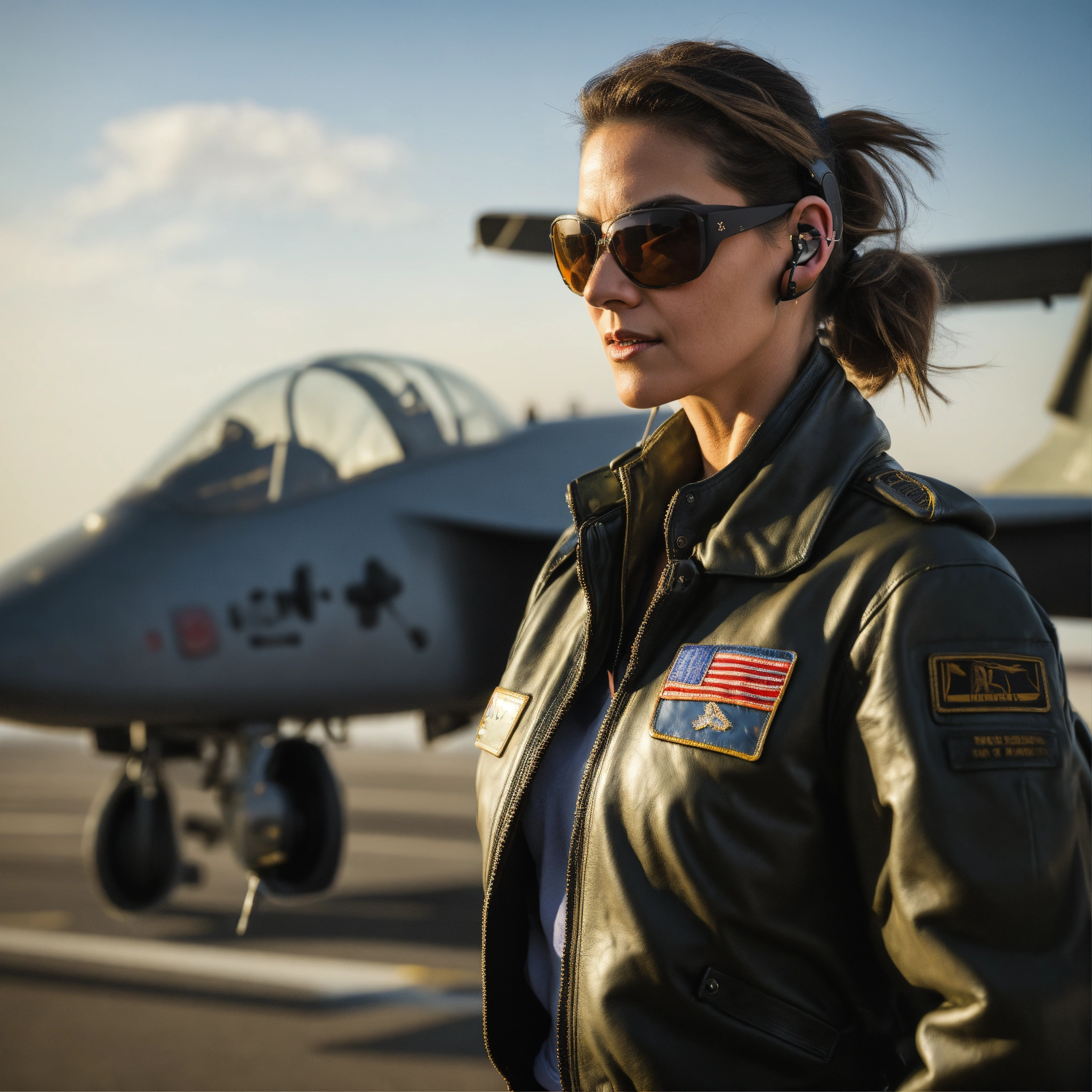 An athletic and toned middle-aged woman with a ponytail and a dominating and intent demeanor, wearing a leather bomber jacket, a big vintage-inspired boombox headset and classic wayfarer sunglasses. military pilot, portrait on flight deck of an aircraft carrier with head turned towards the camera.