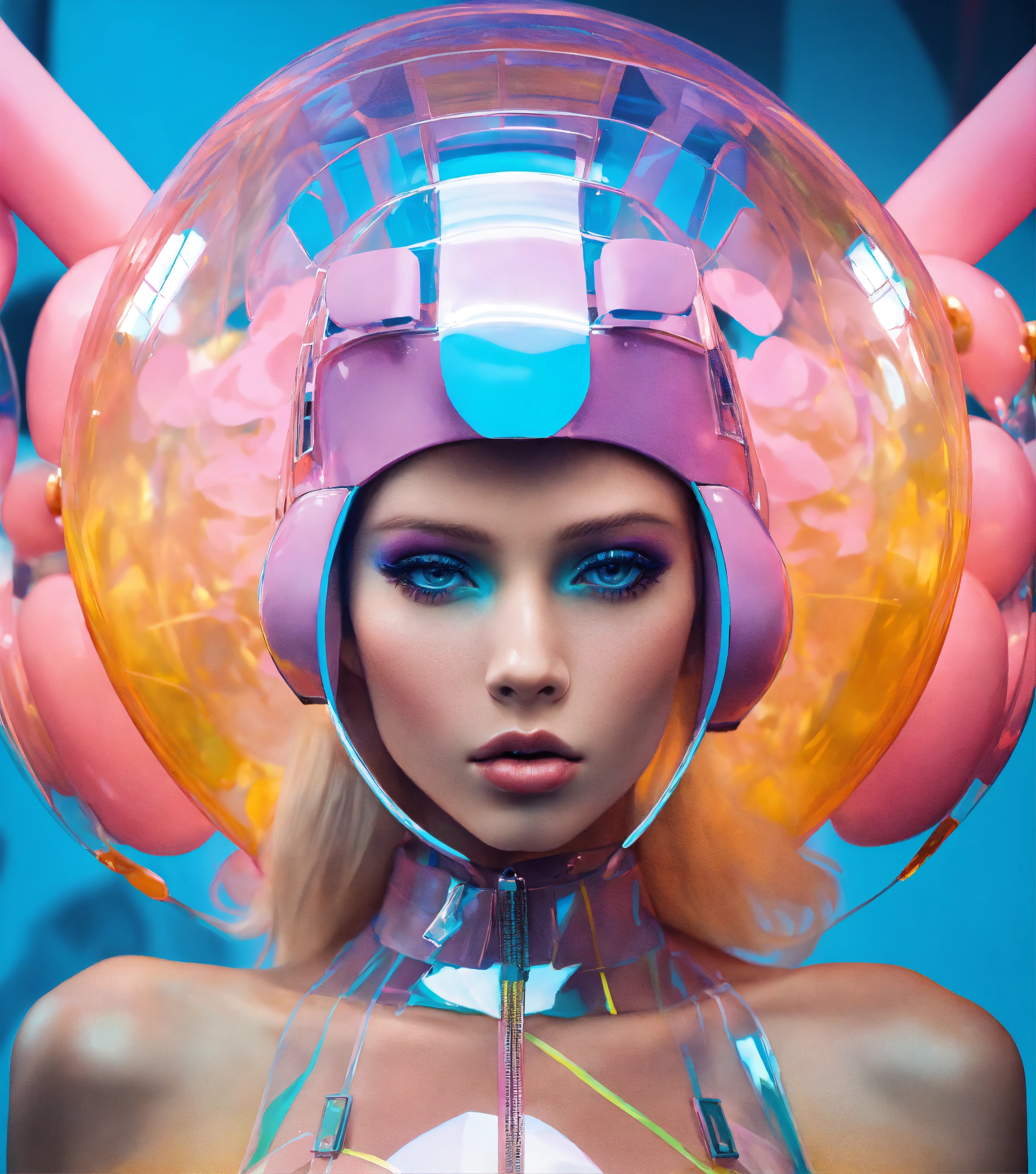 A beautiful blonde pop artist with a stylish, pastel transparent futuristic outfit, with a huge central headpiece, sleek makeup, with depth of field, fantastic, bold and regal outfit, captured in bright colors, embodying the essence of fancy, minimalist