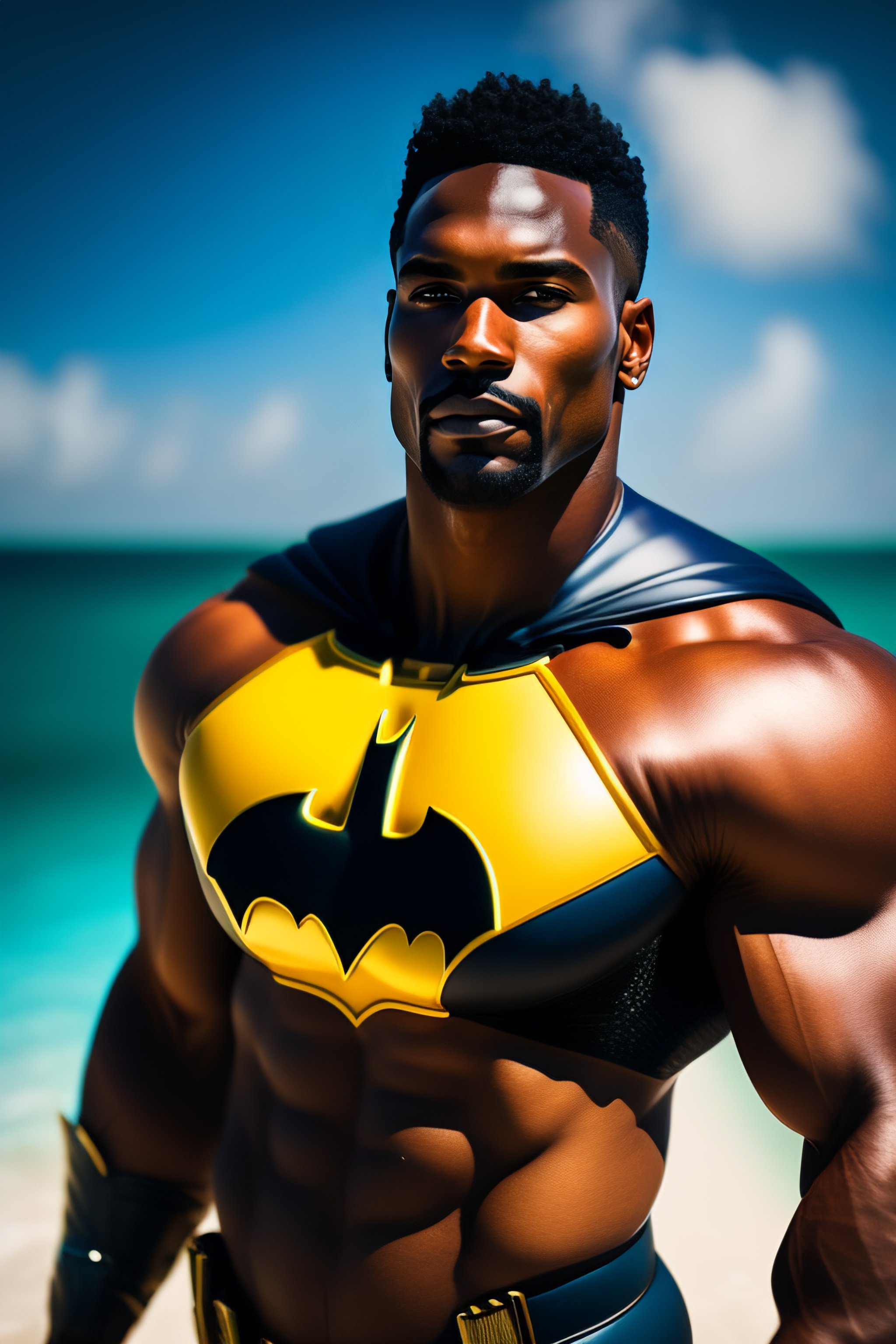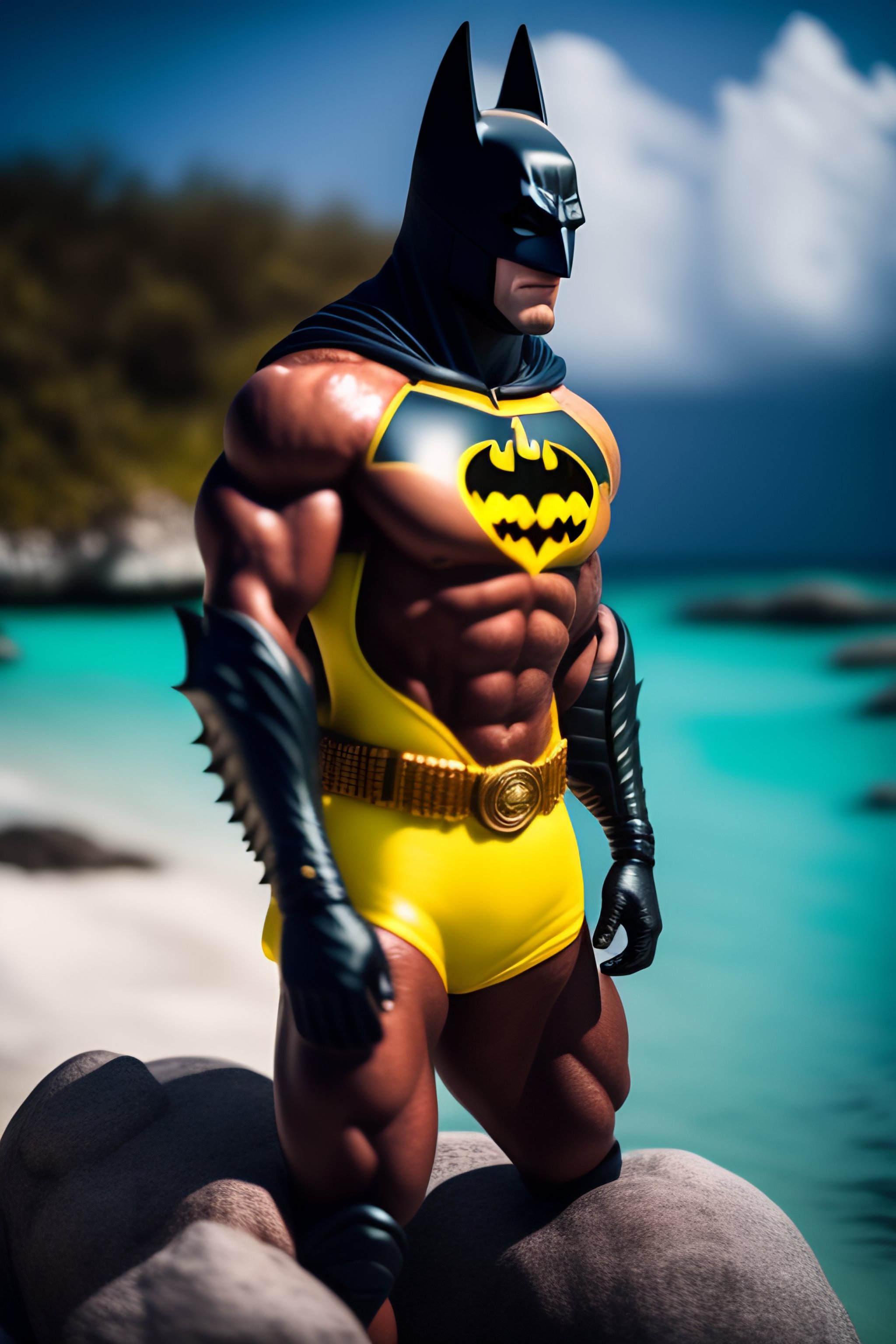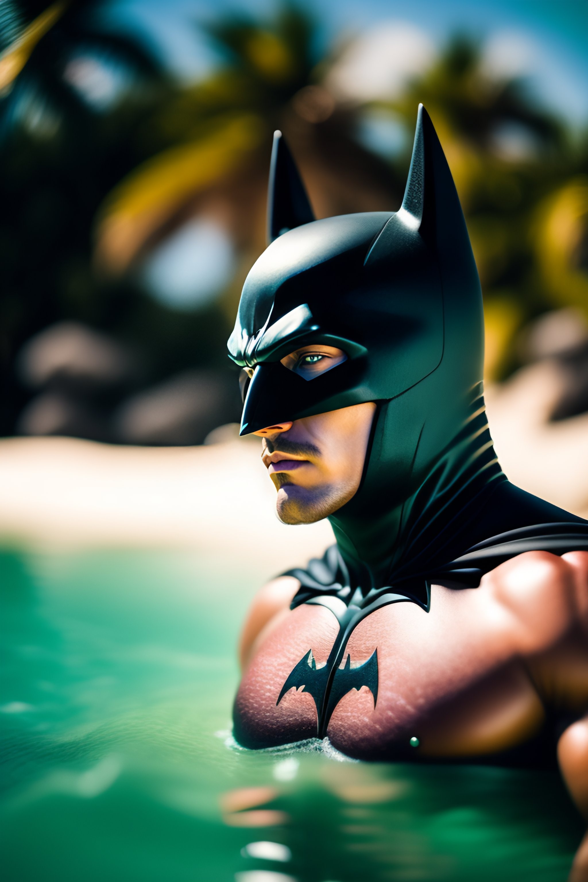 Batman wearing a swimsuit in bahamas. hairy torso. sunny day, caipiriña, ridiculous. sharp focus, high detail, 8k