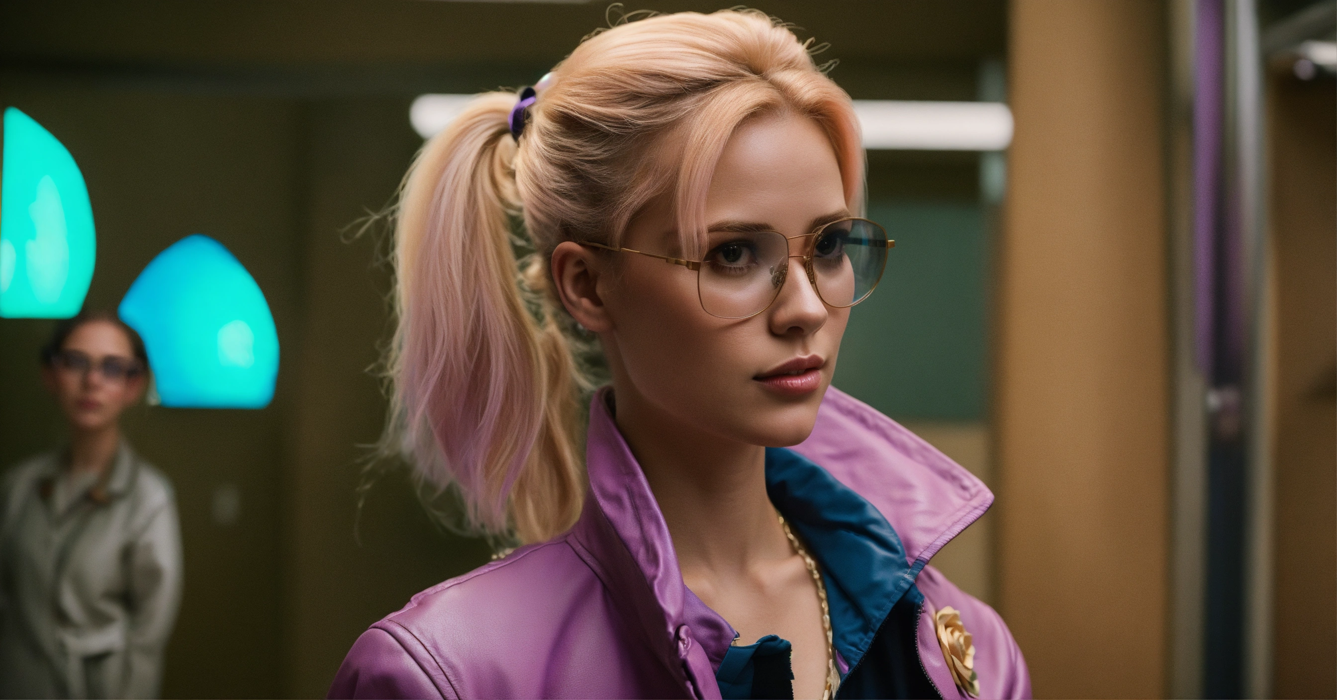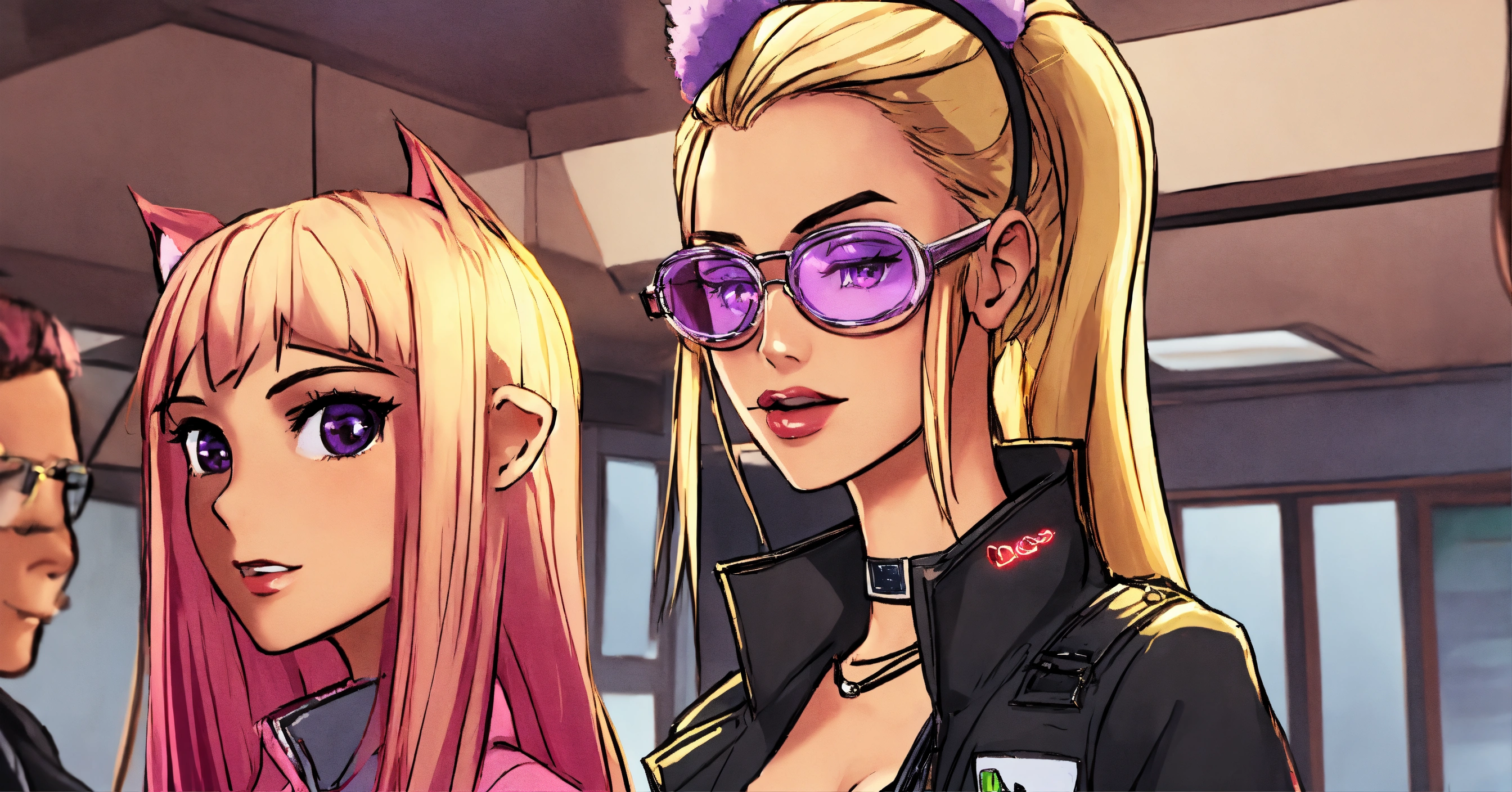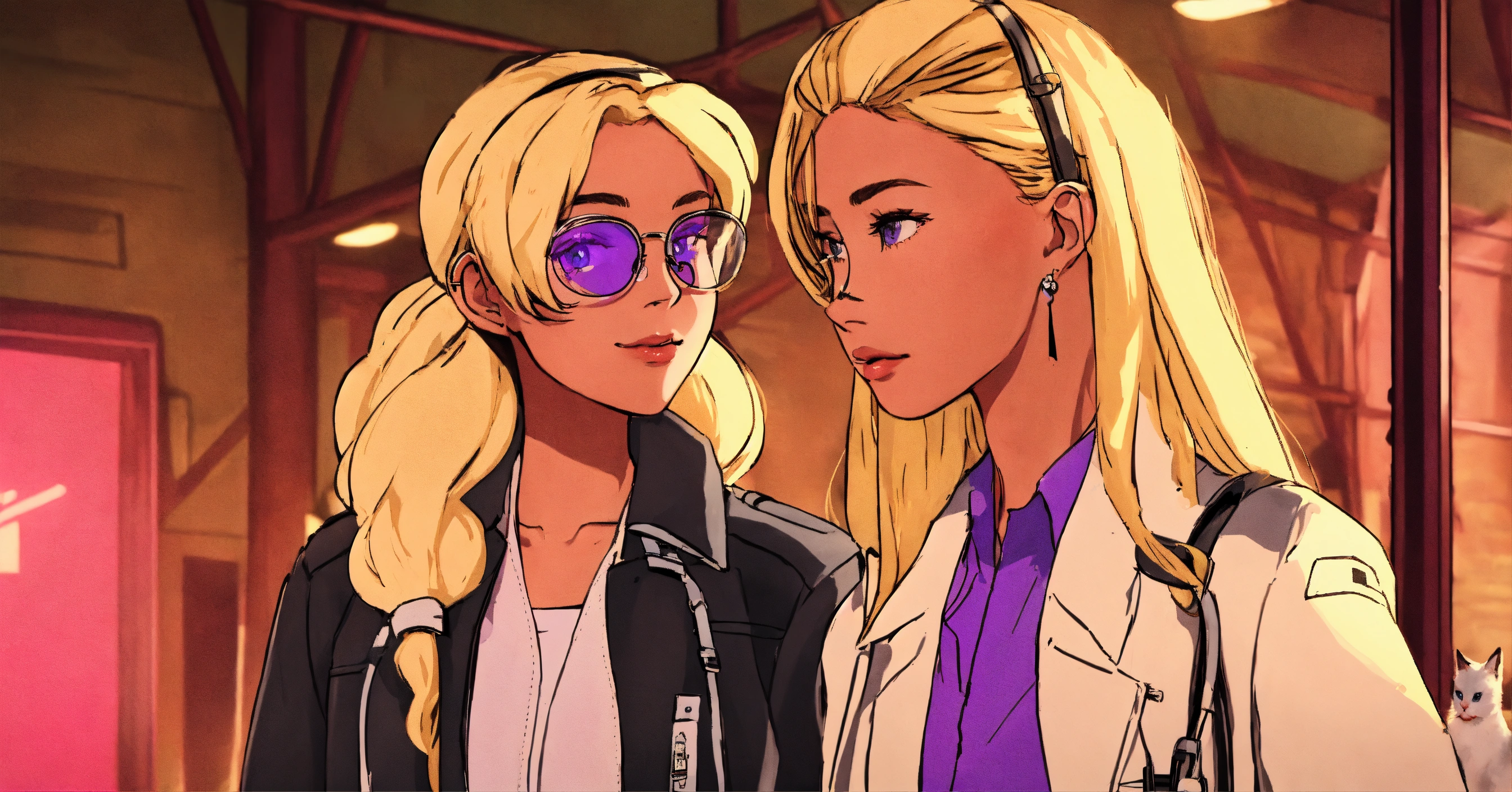 Two women standing next to each other. one is a blonde woman with her hair in a ponytail and a streak in the front, she is wearing a pair of aviator-style glasses with purple lenses and a leather jacket with roses at shoulder level. the second is a woman in a doctor's coat, long pink hair and a headband with cat ears, she wears glasses. the blonde girl doesn't have any accessories in her hair. in cartoon style.