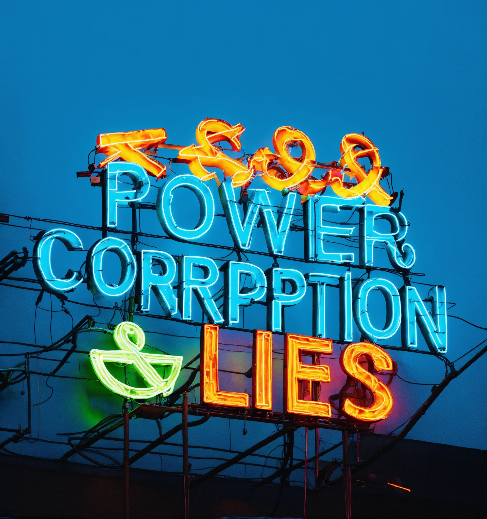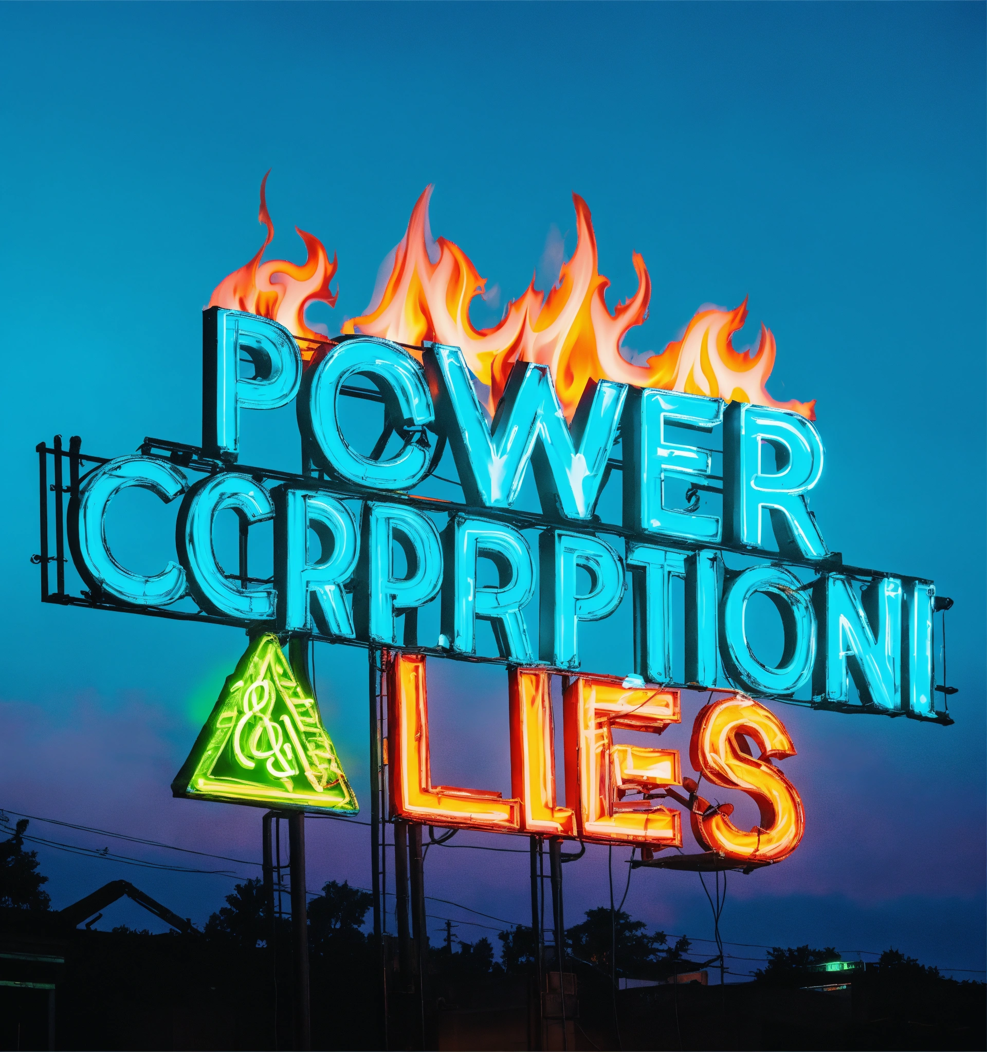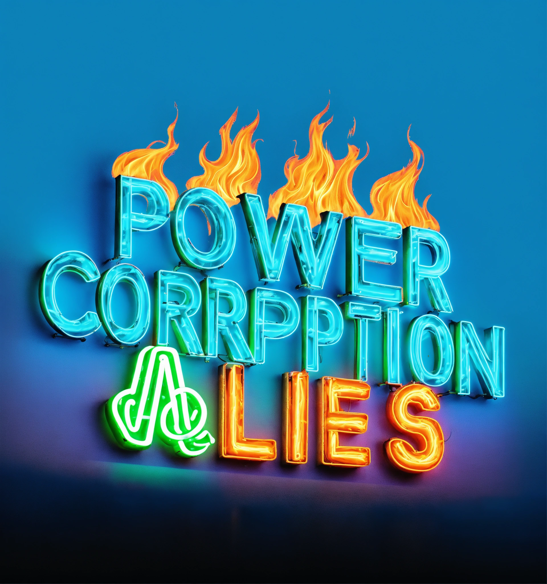 Make this image more realistic with harsh artificial light. first line should say "power", above this word, are flames, second line should say "corruption" third line & (ampersand) "lies" all this letters with neon sign aesthetic.