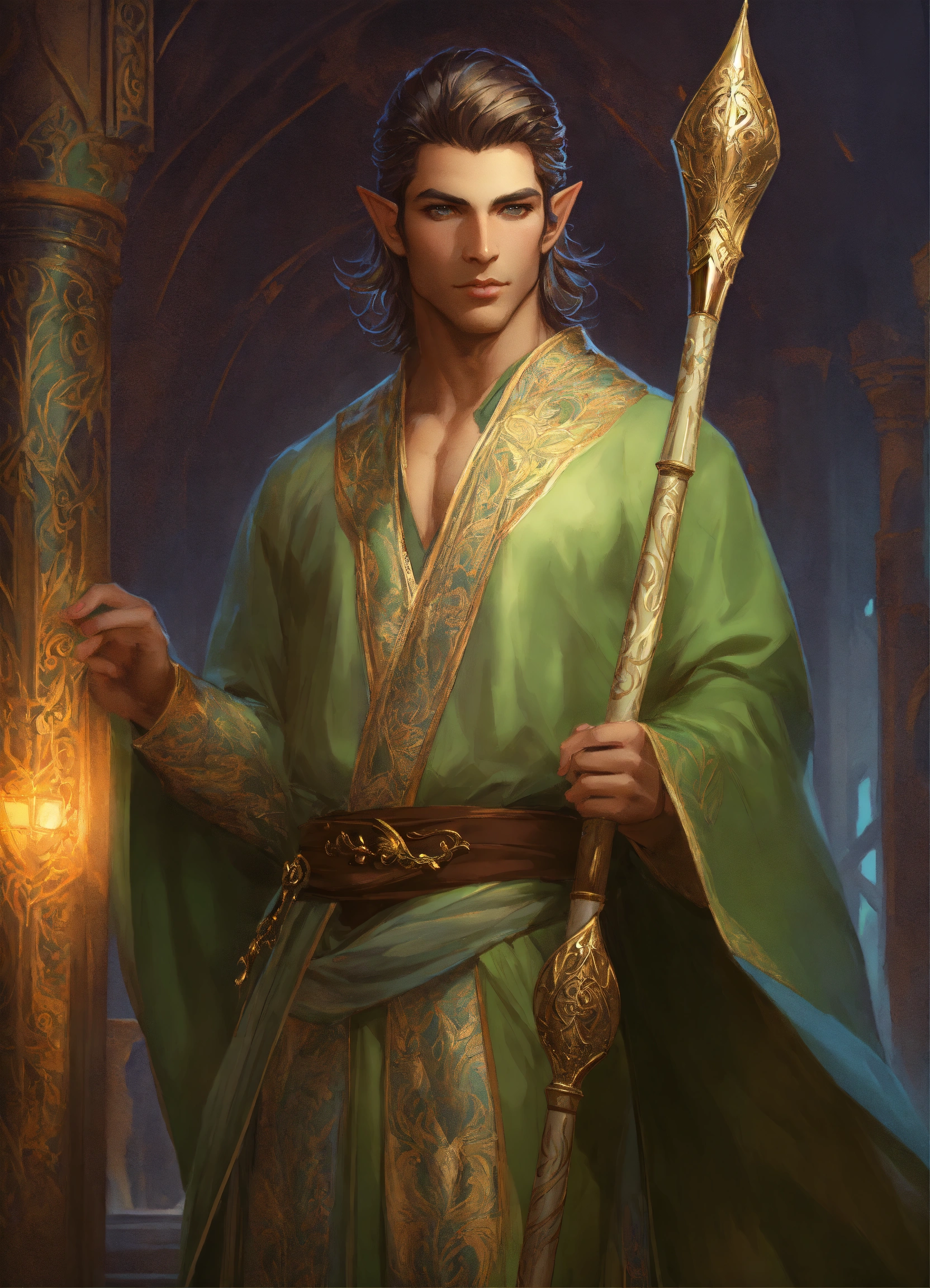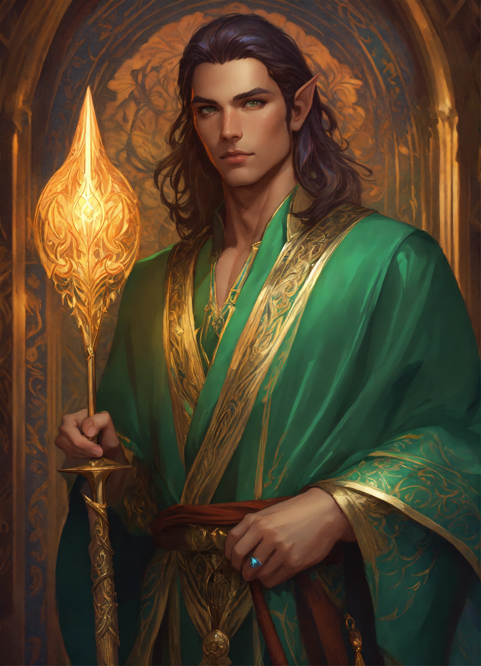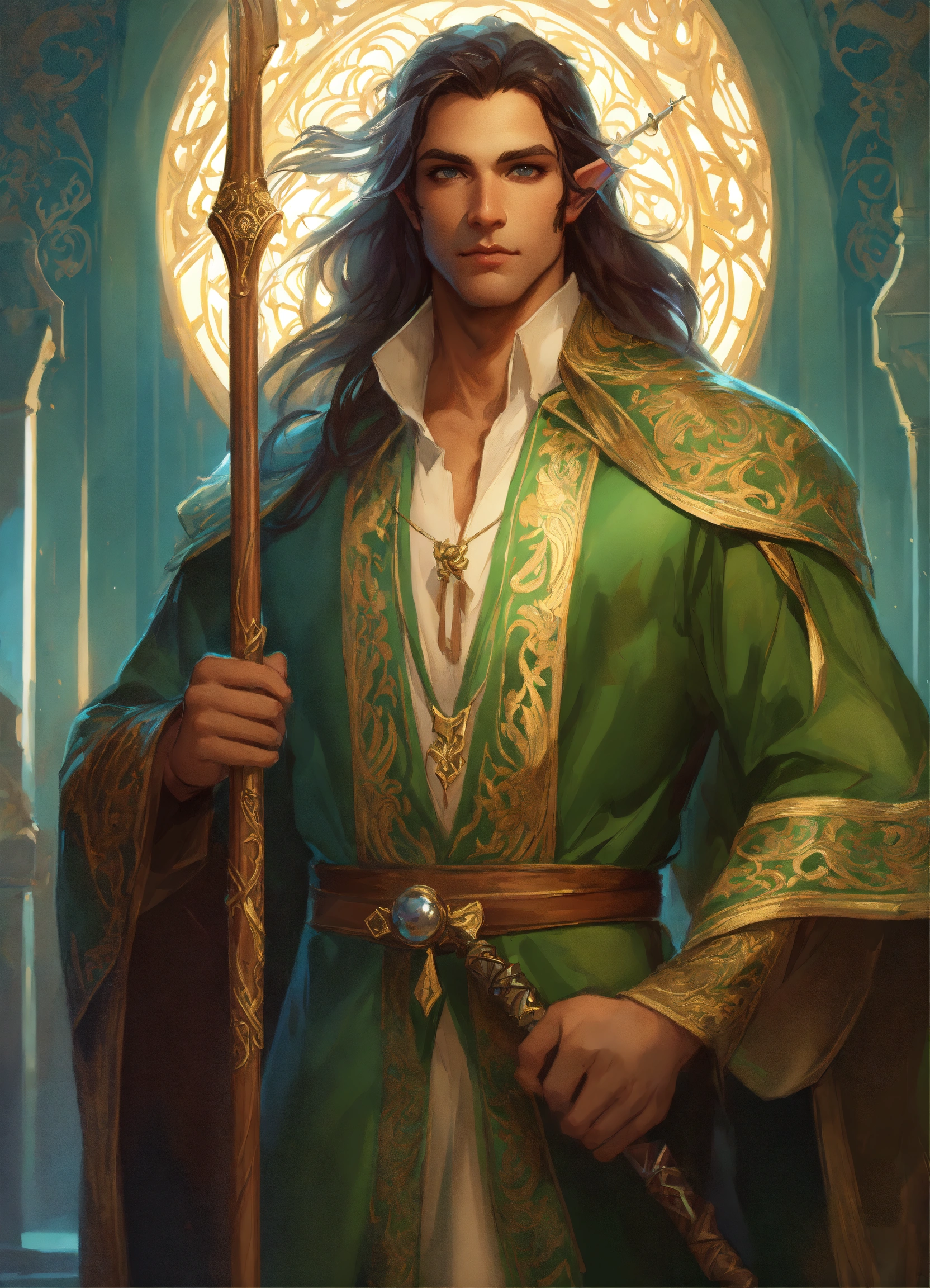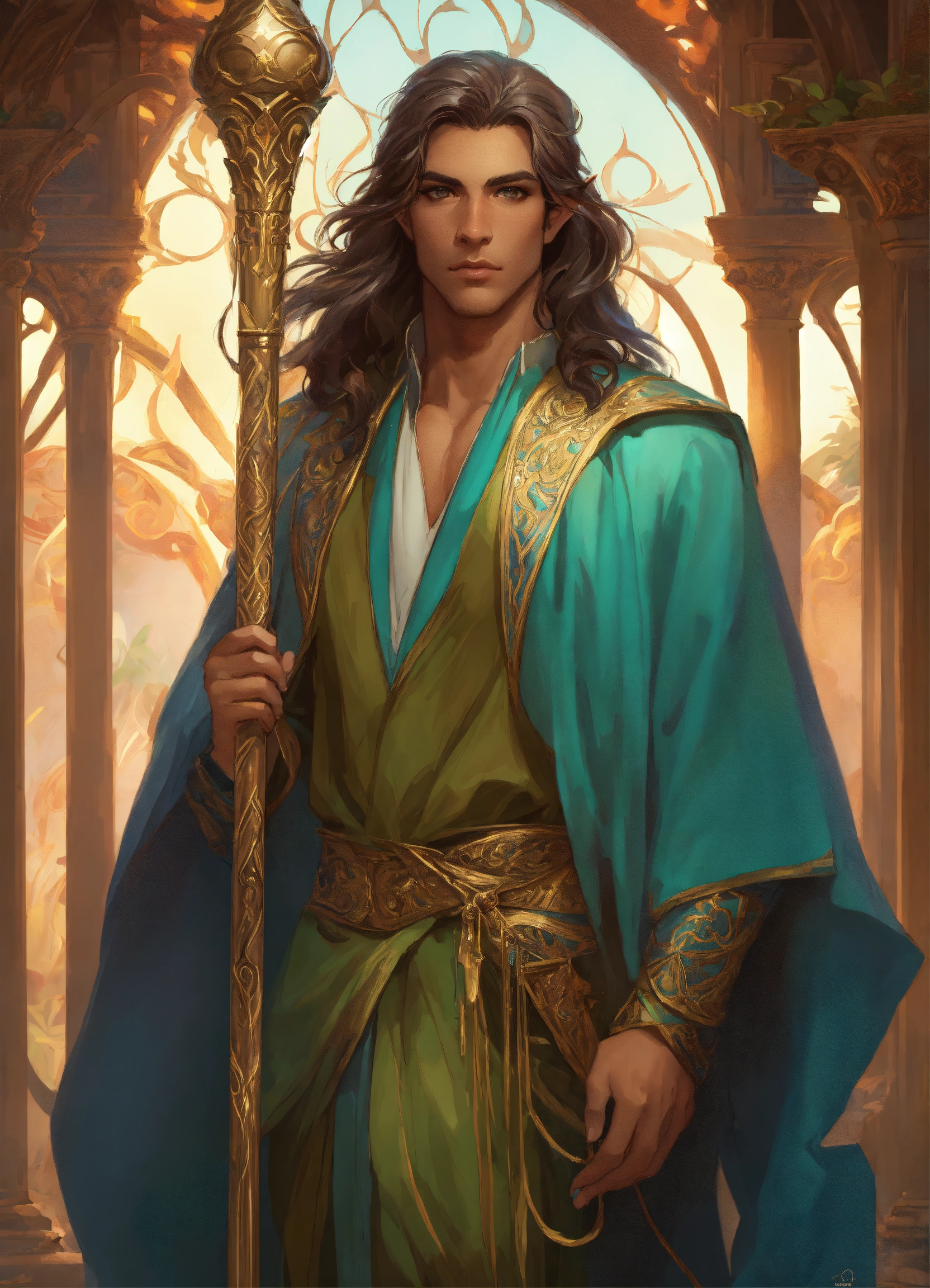 Handsome persian male elf wizard with magical staff, high cheekbones, full body, long hair, hazel green eyes, highly detailed, digital painting, artstation, concept art, smooth, sharp focus, illustration, art by artgerm and greg rutkowski and alphonse mucha, erte, 8 k