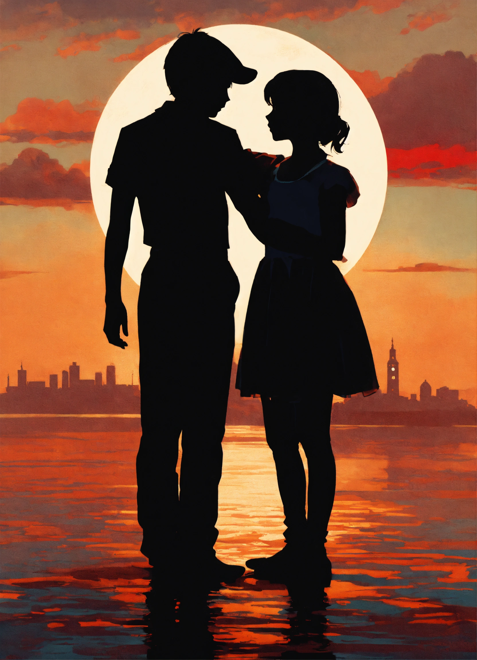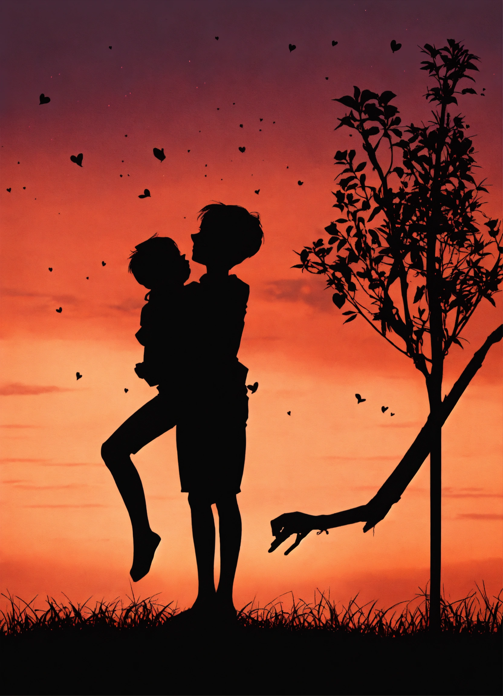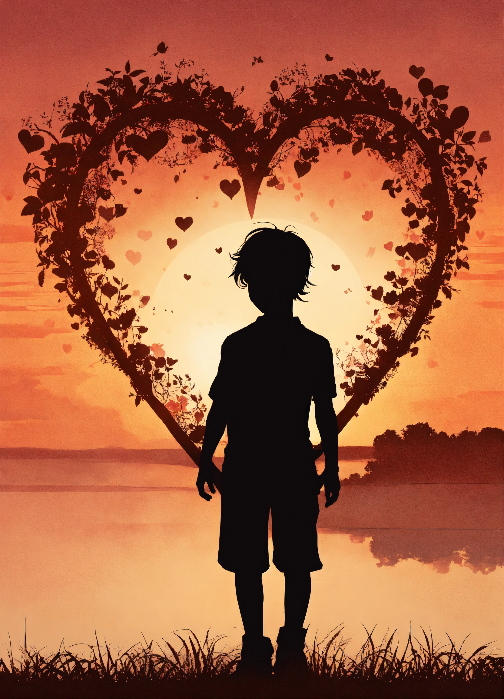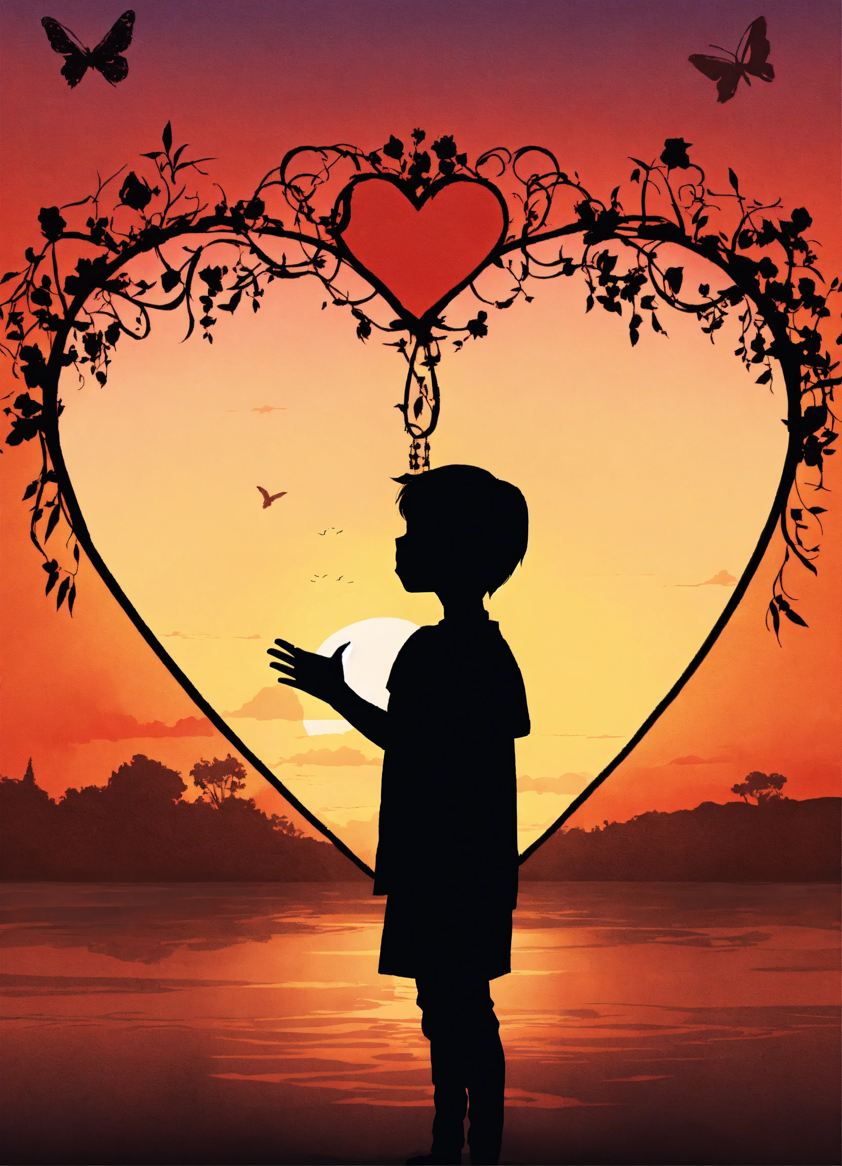 Silhouette boy standing with an open arrangement in her right hand above and left hand on the heart