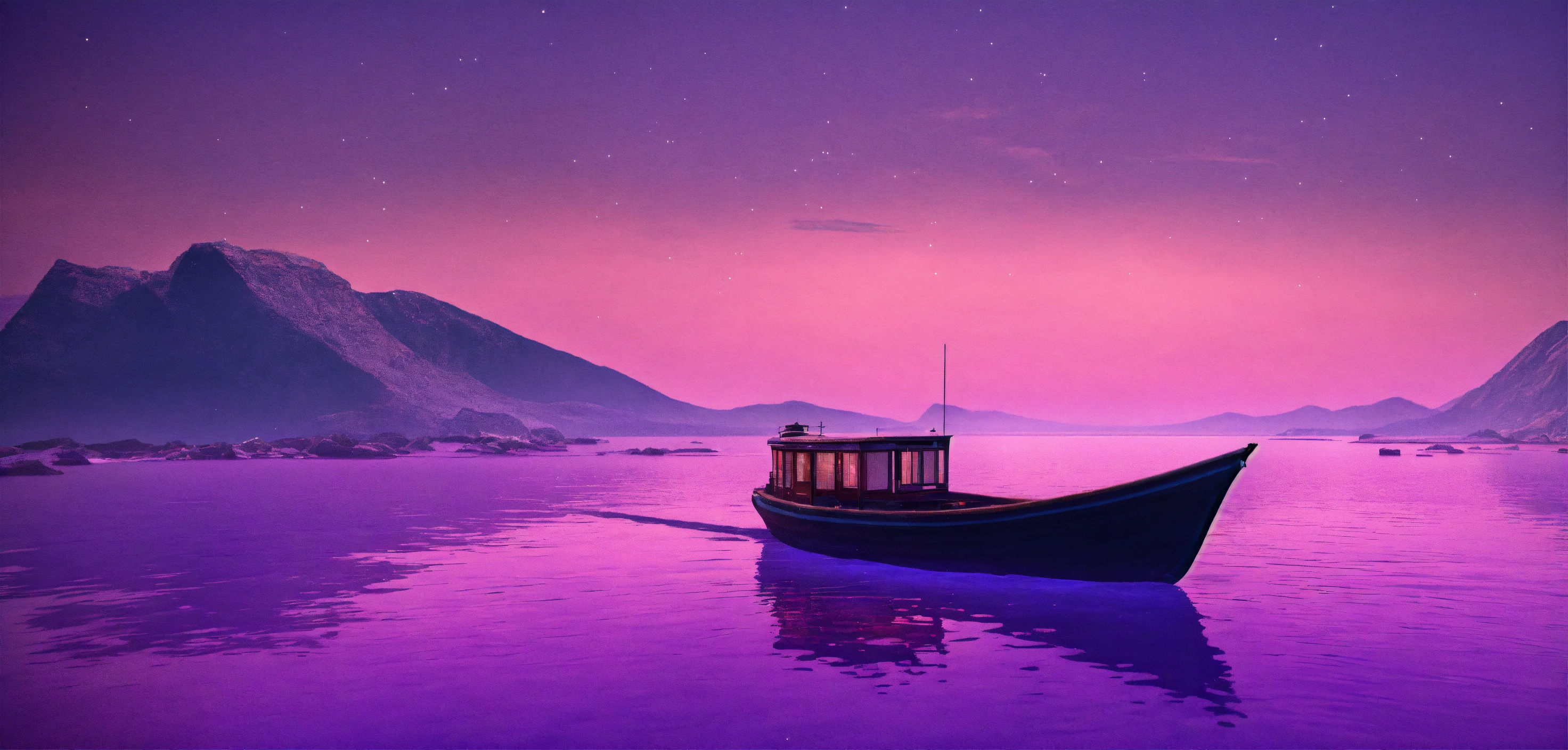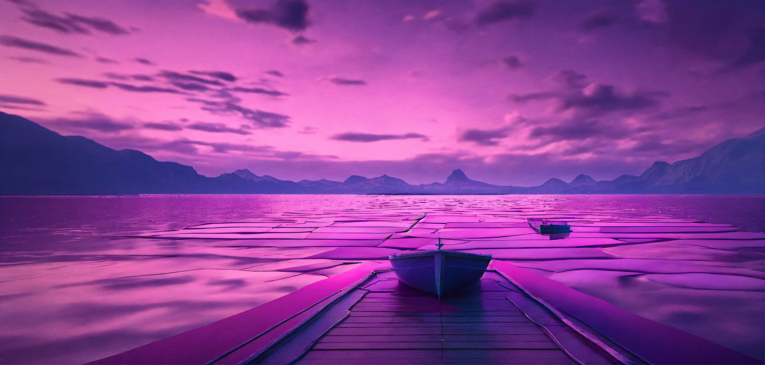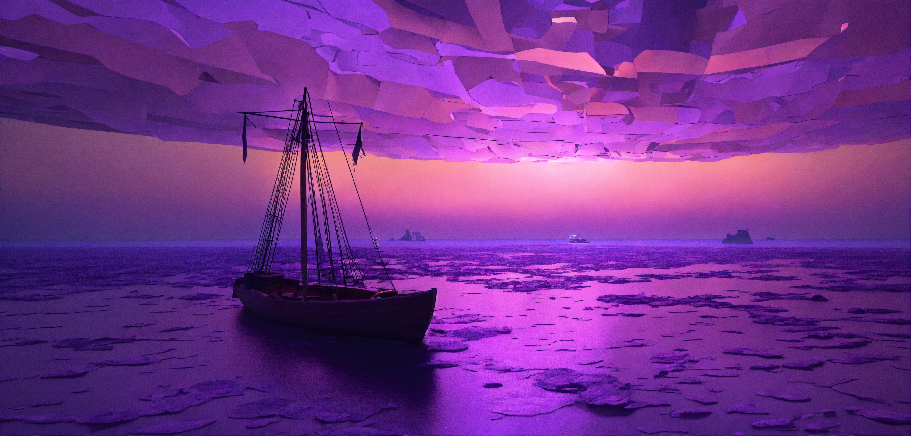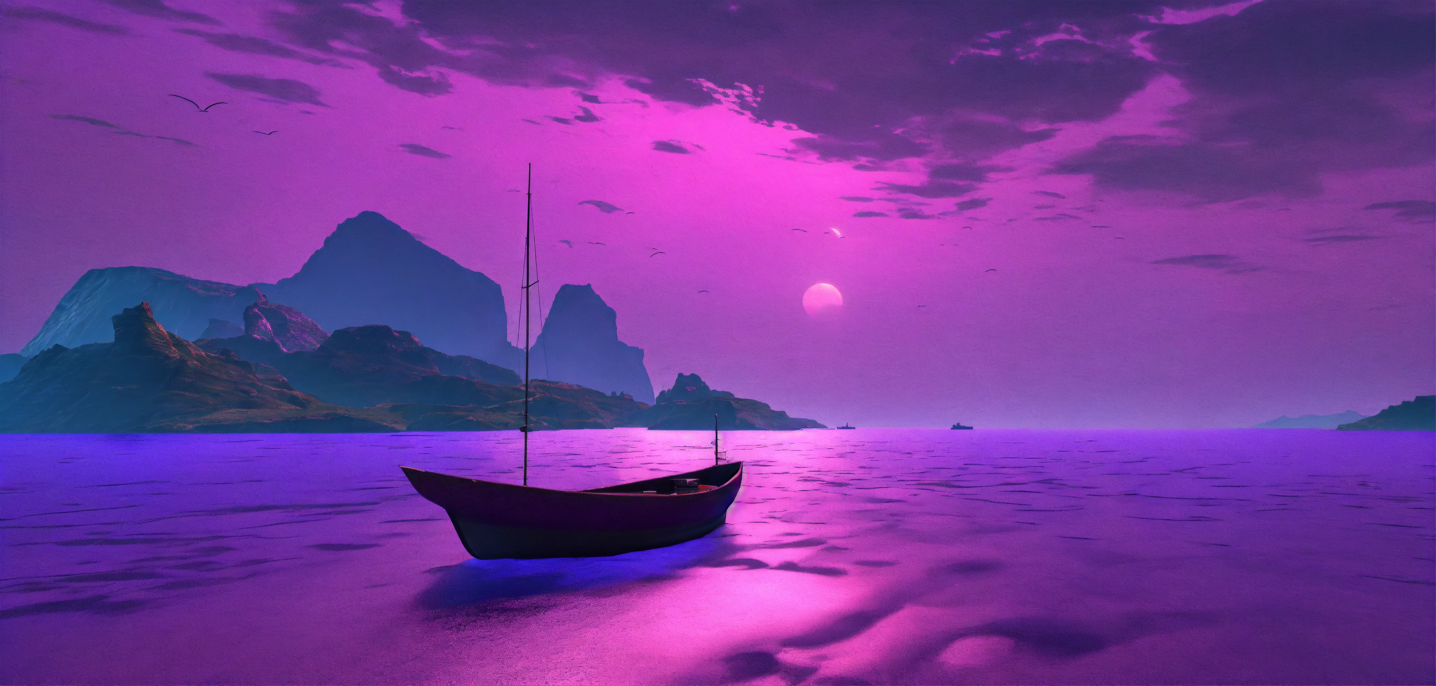 A boat alone in the middle of the ocean, calm purple sea, distant island, incomplete road map, purple theme, 8k, 3d art