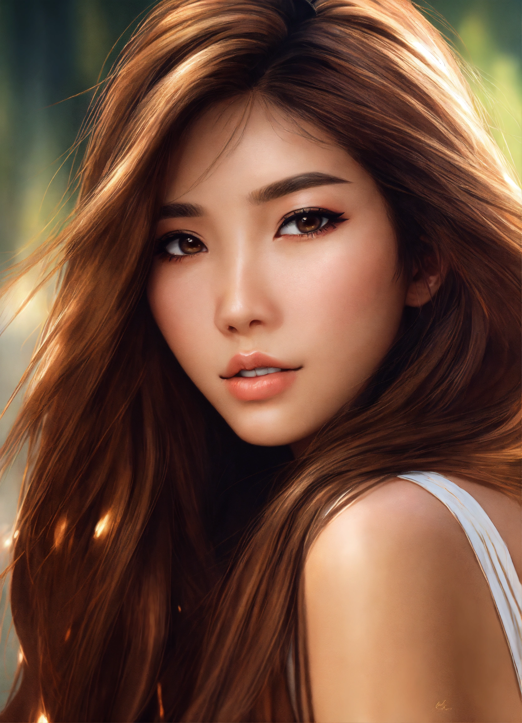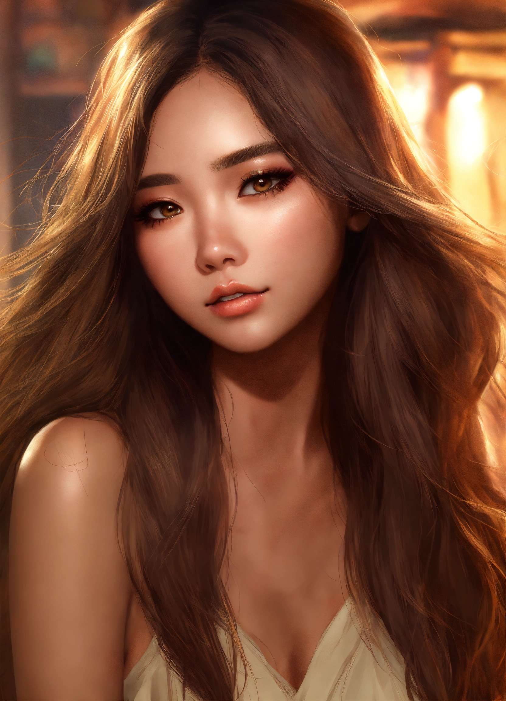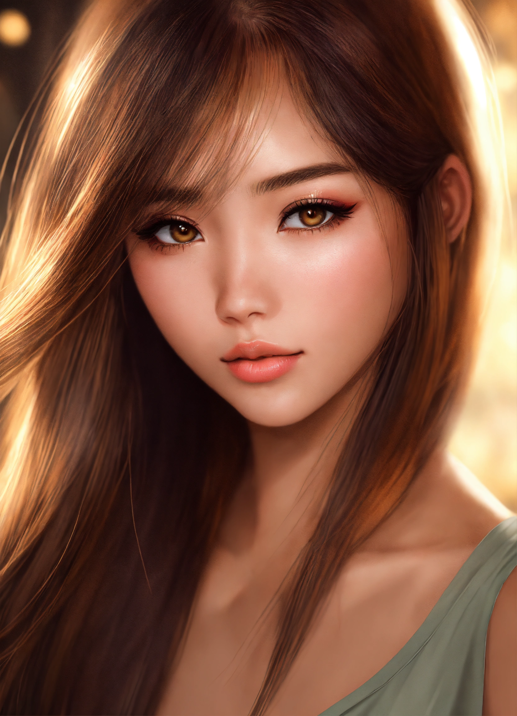 Cute tan asian female, long light brown/tan straight fluffy hair, heavy eyeliner, makeup, no imperfections, digital art, hd, high quality