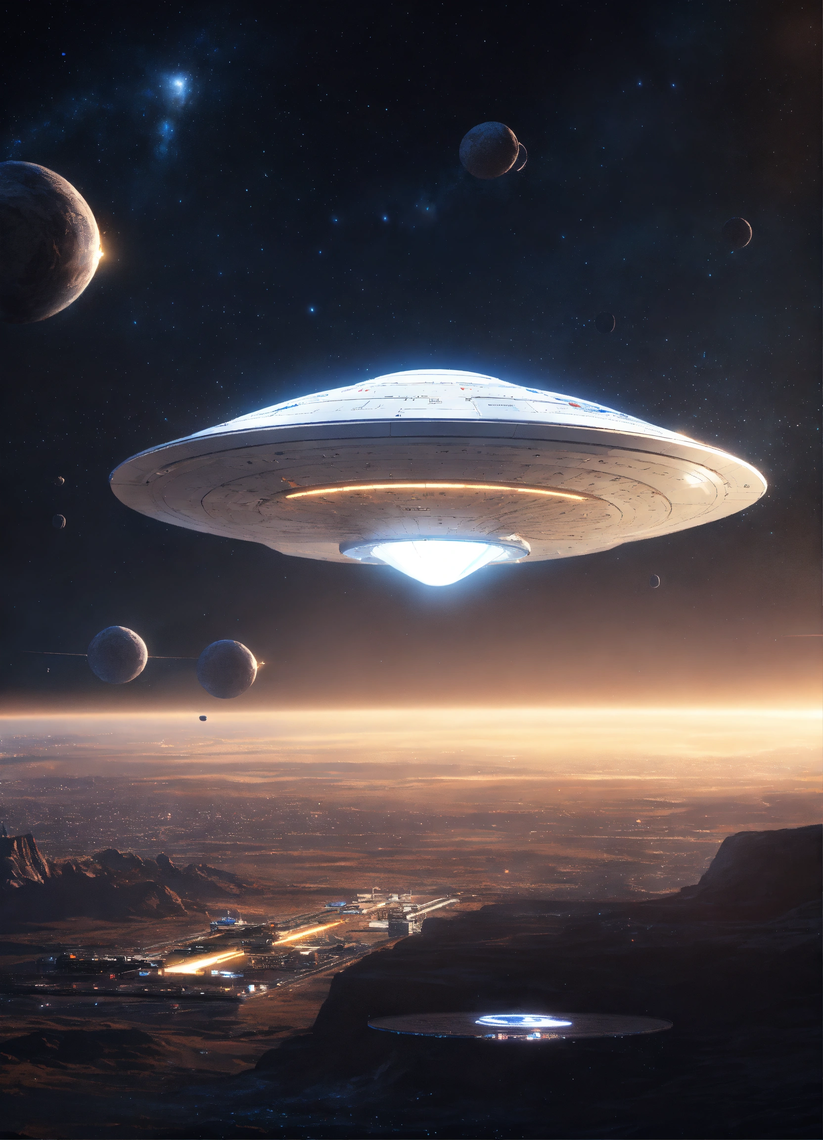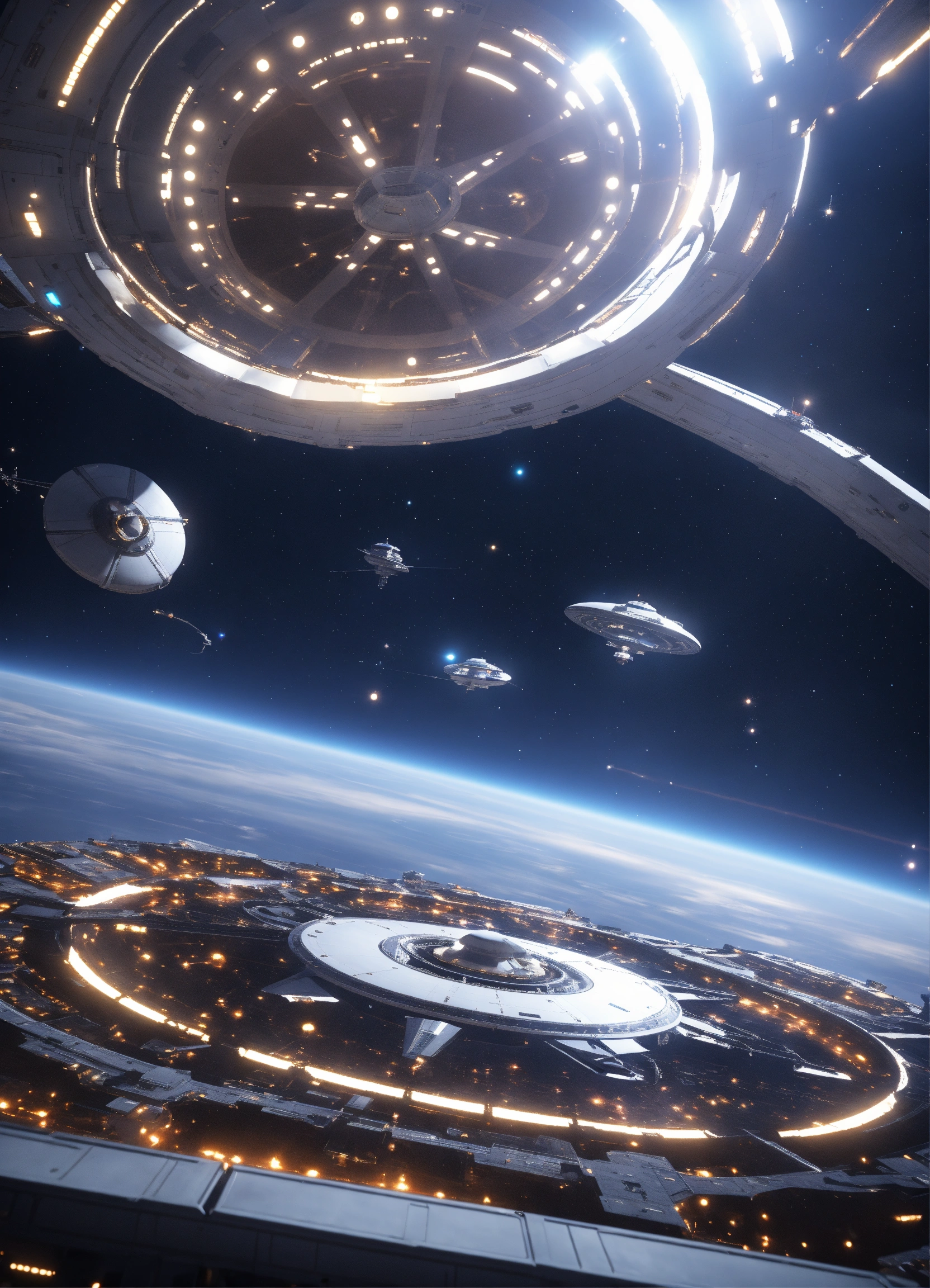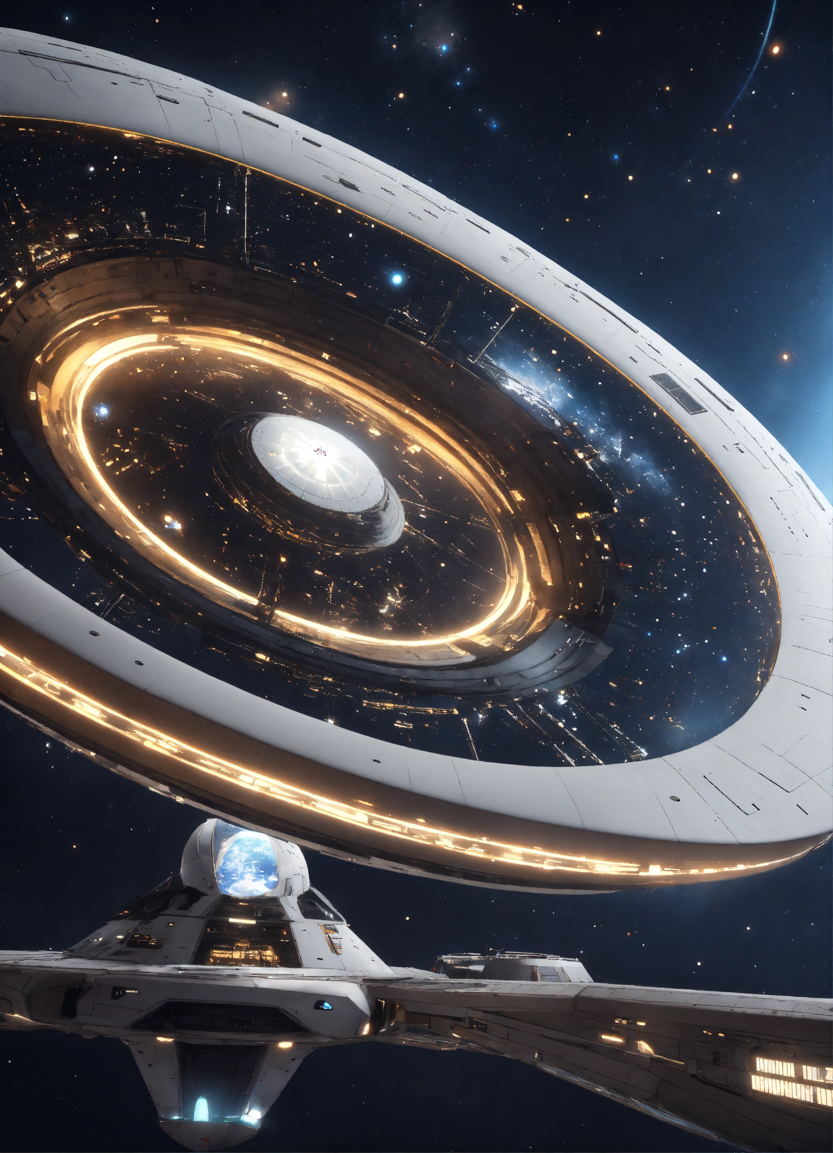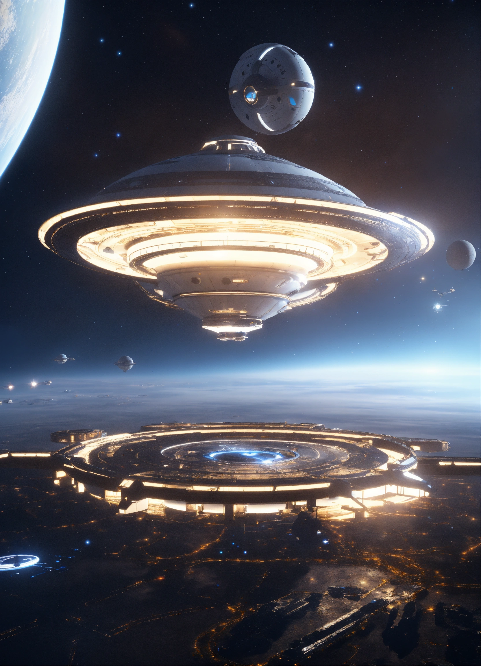 Beautiful white disc shaped spaceport hub flying floating in deep space, artificial star, futuristic, sci-fi, 8k, unreal engine, pixar