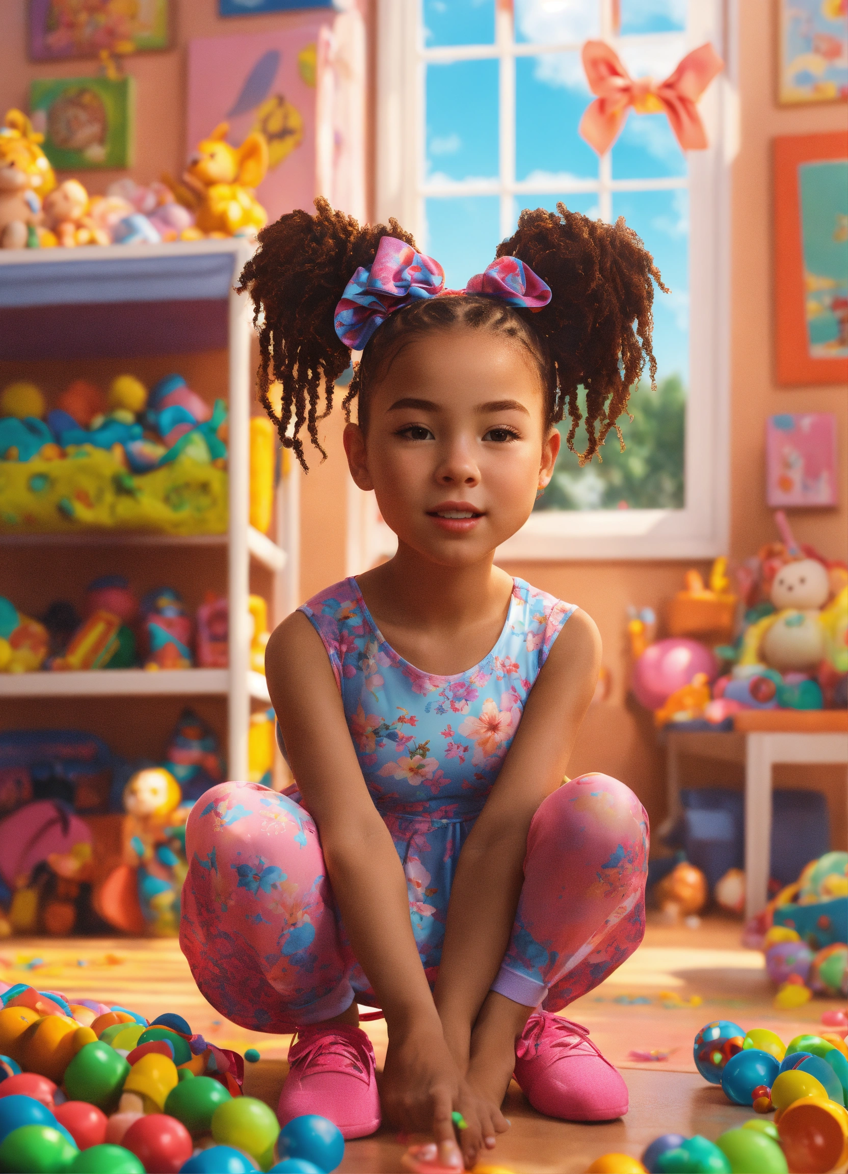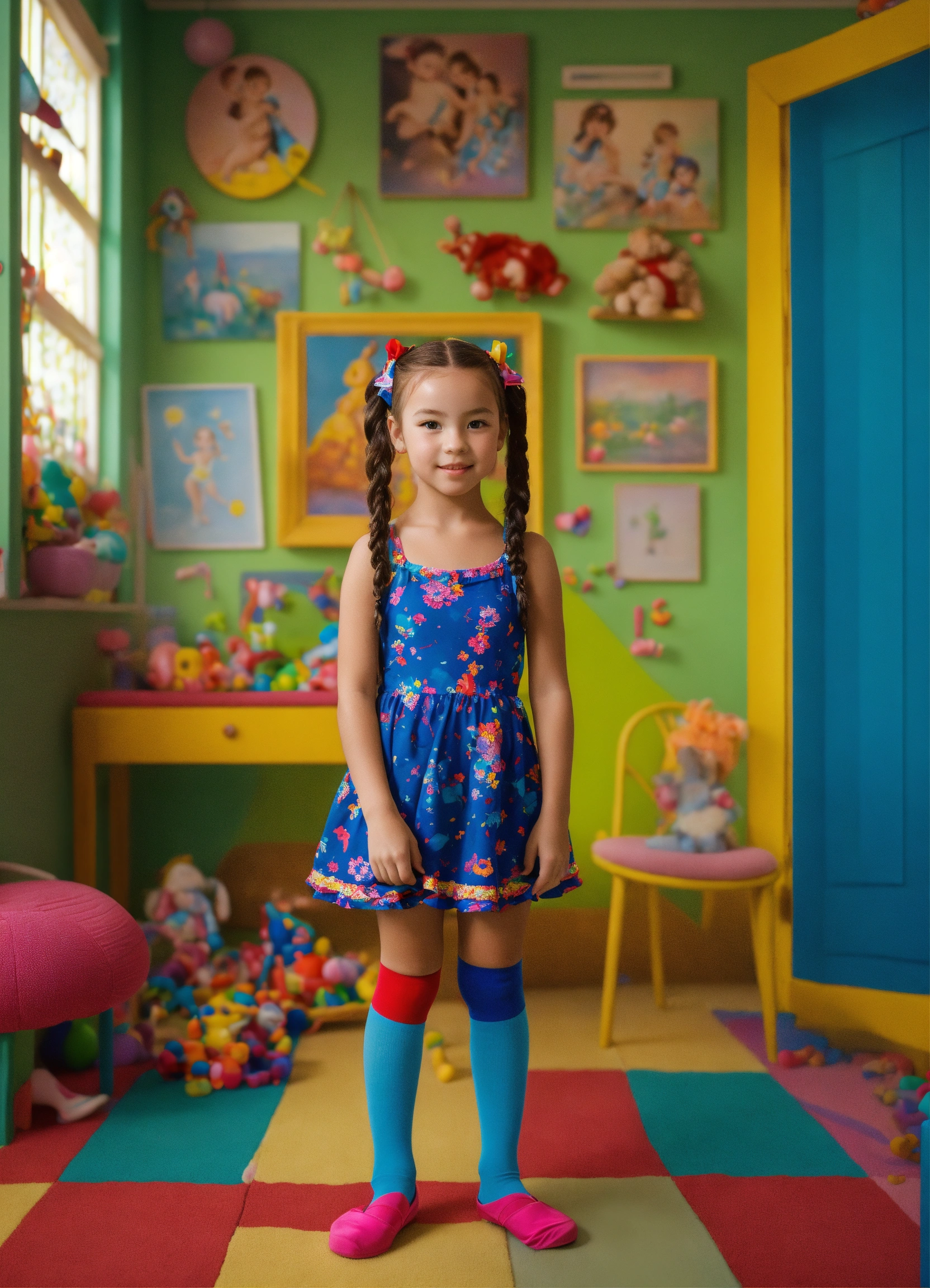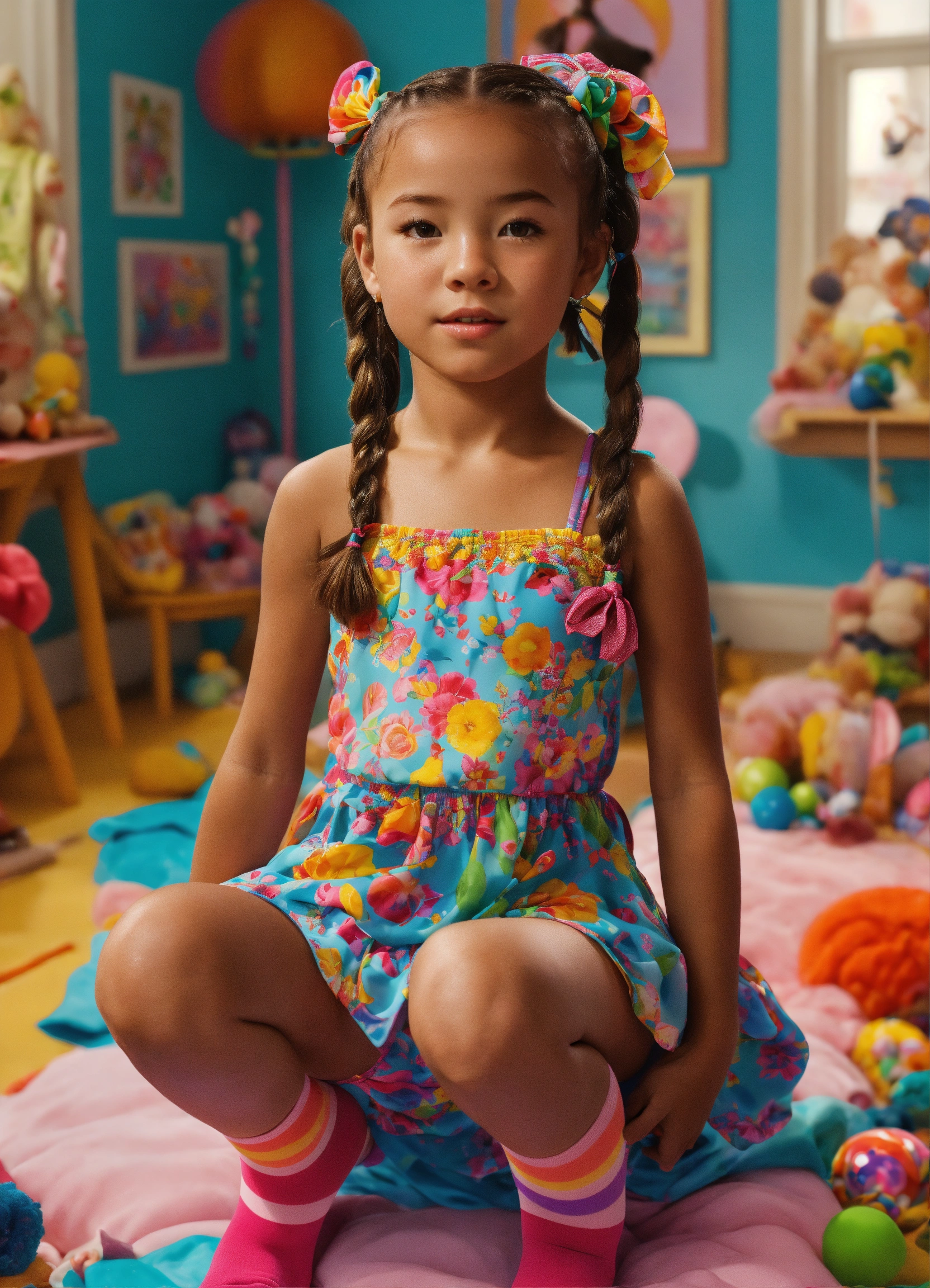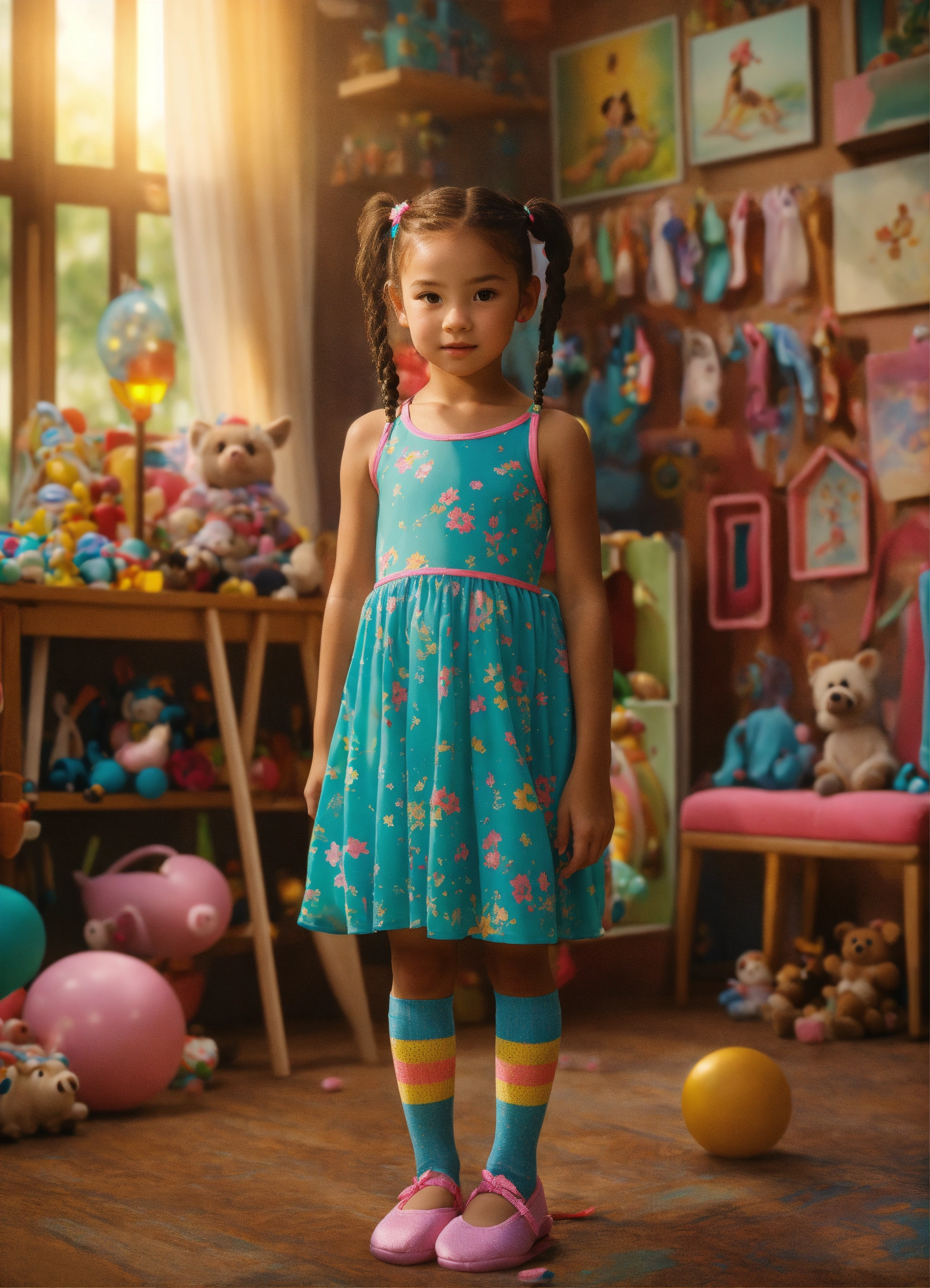 The image features a young girl in the foreground. her hair is braided into pigtails that stick out to the side. she is wearing a colorful dress with bows in her hair. the girl is also wearing ballet shoes and vibrant knee-high socks. she is facing the camera with a playful and open posture. the background depicts a children's room filled with toys. the image should be in 8k resolution and rendered in a 3d style. the desired artistic style for the image is swimsuit, realism, realistic. please generate an avatar that captures the essence of this description.