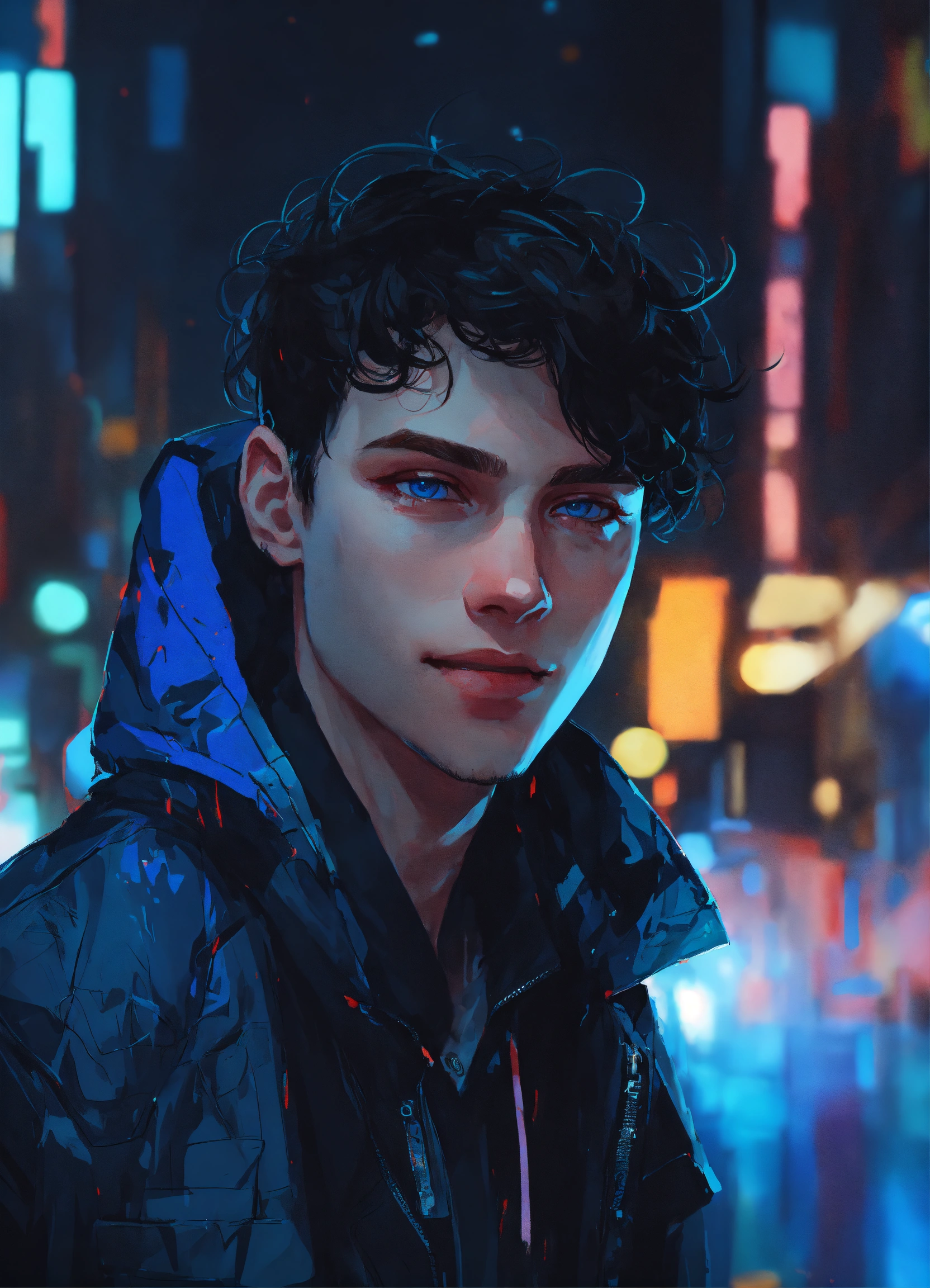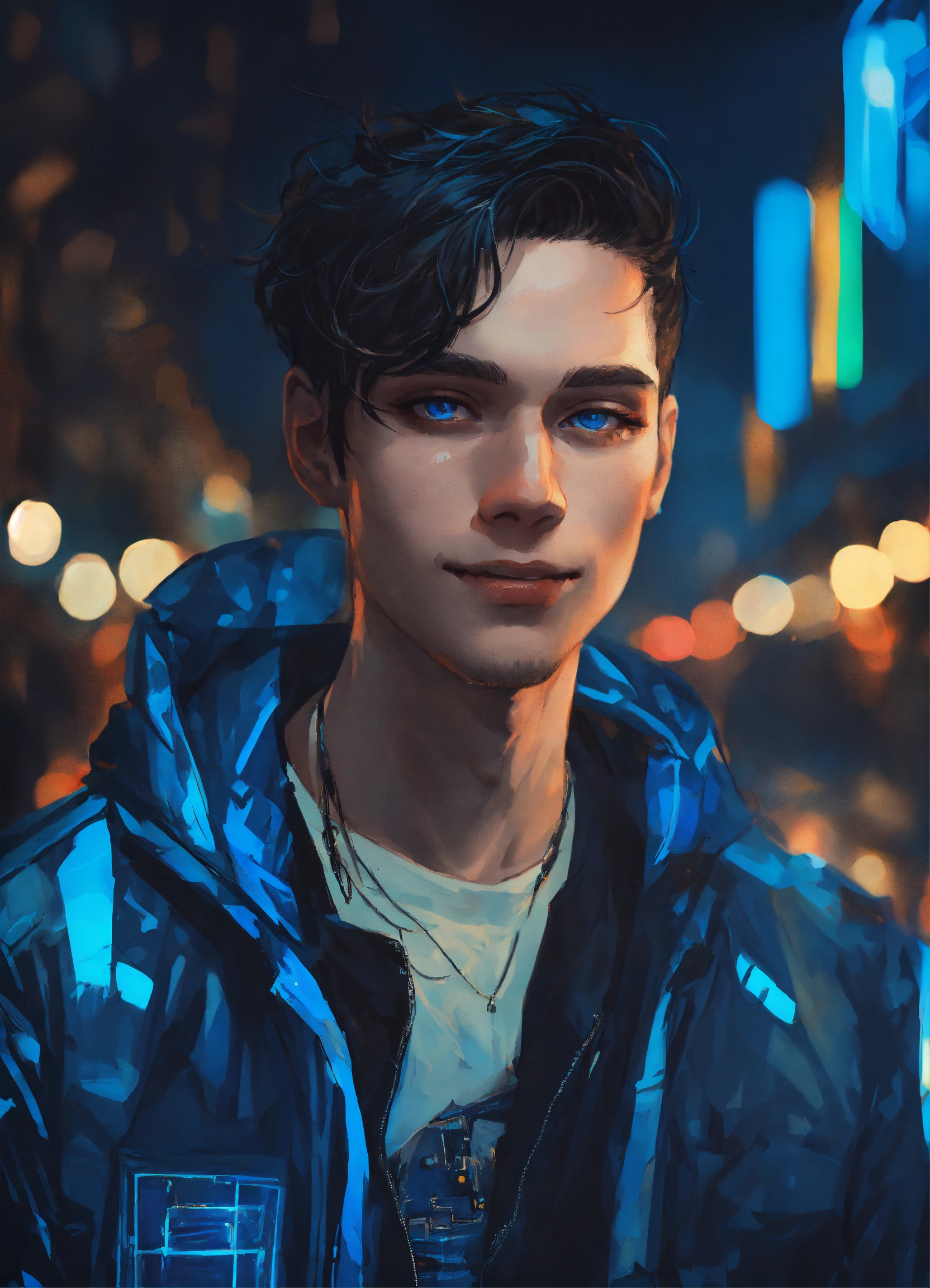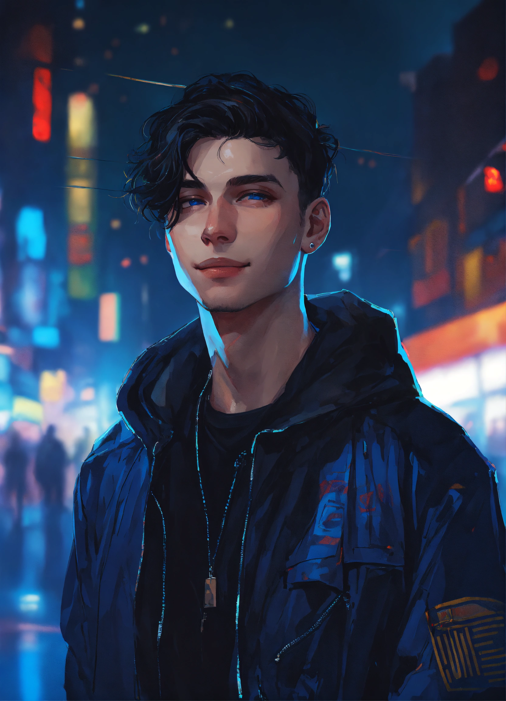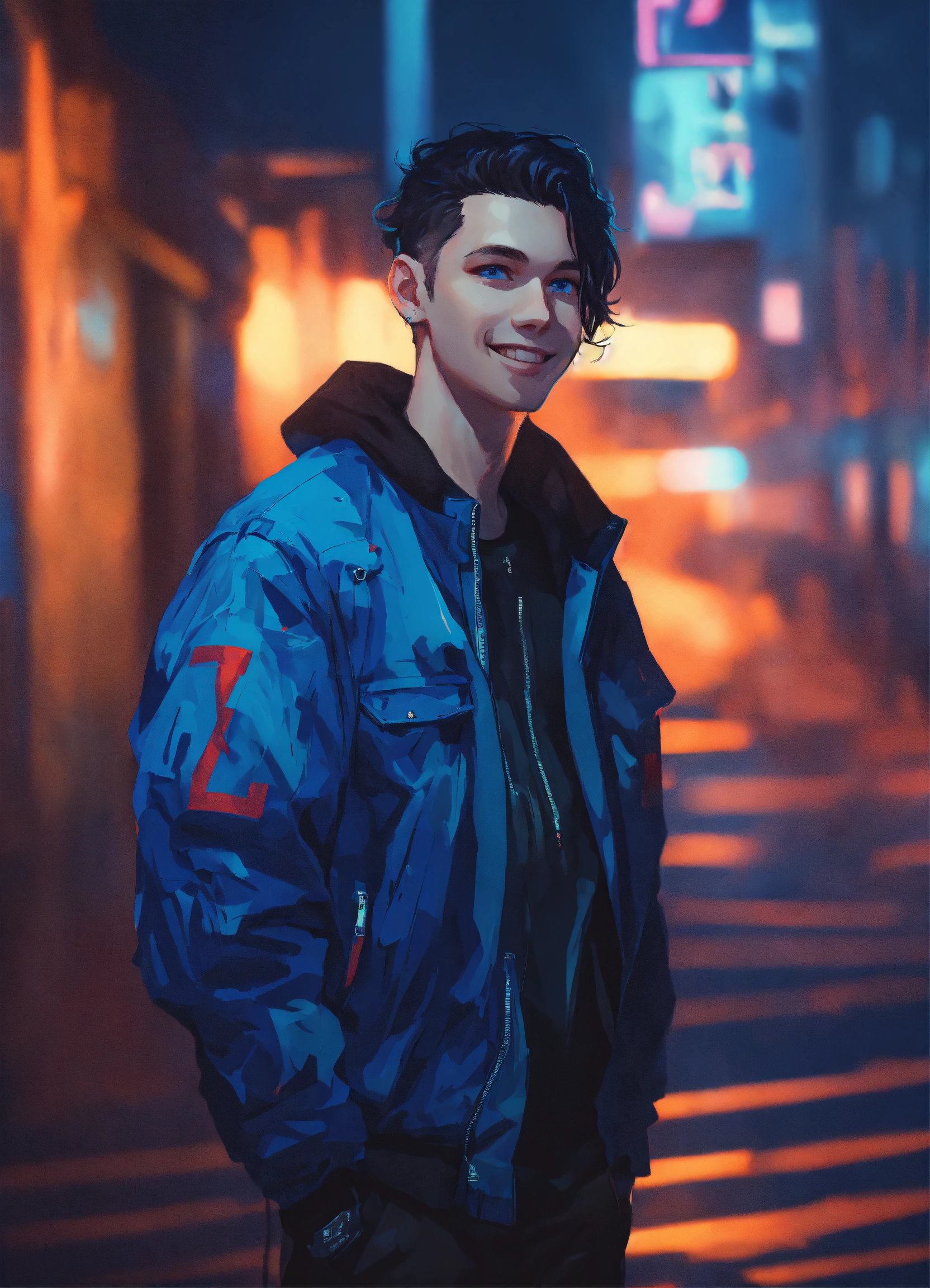 Night time portrait of pale russian young man 27 years old, smile, blue eyes, dimples, black hair, wearing blue and black streetstyle jacket, artwork style by atey ghailan, black, grunge aesthetic!!! cyberpunk background