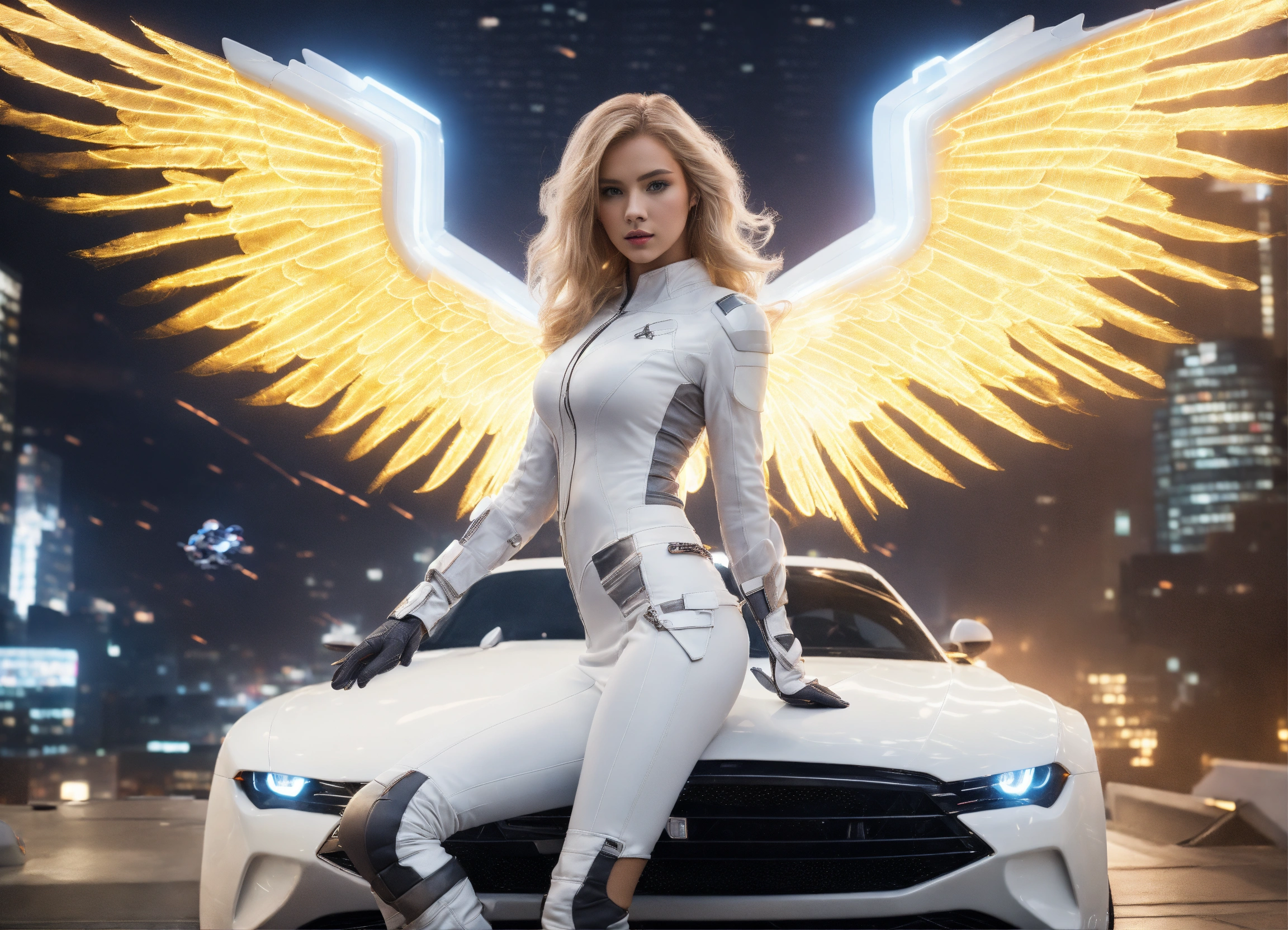 Front / top down view full body high resolution photo of a women ( random top model ) with large angelwing's, short skirt, x-men, rooftop cyber city, 8k, lightning strikes, white, blond, wearing hand gloves, futuristic hovering white vehicle in the background