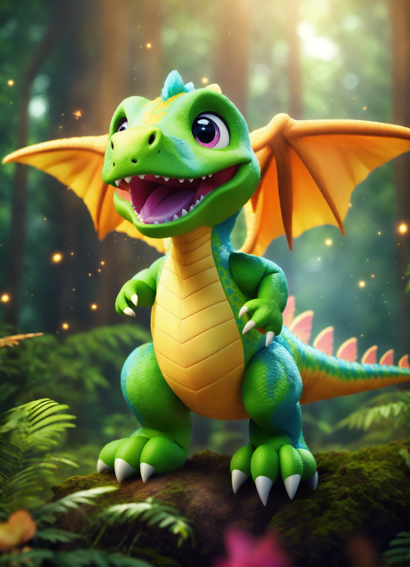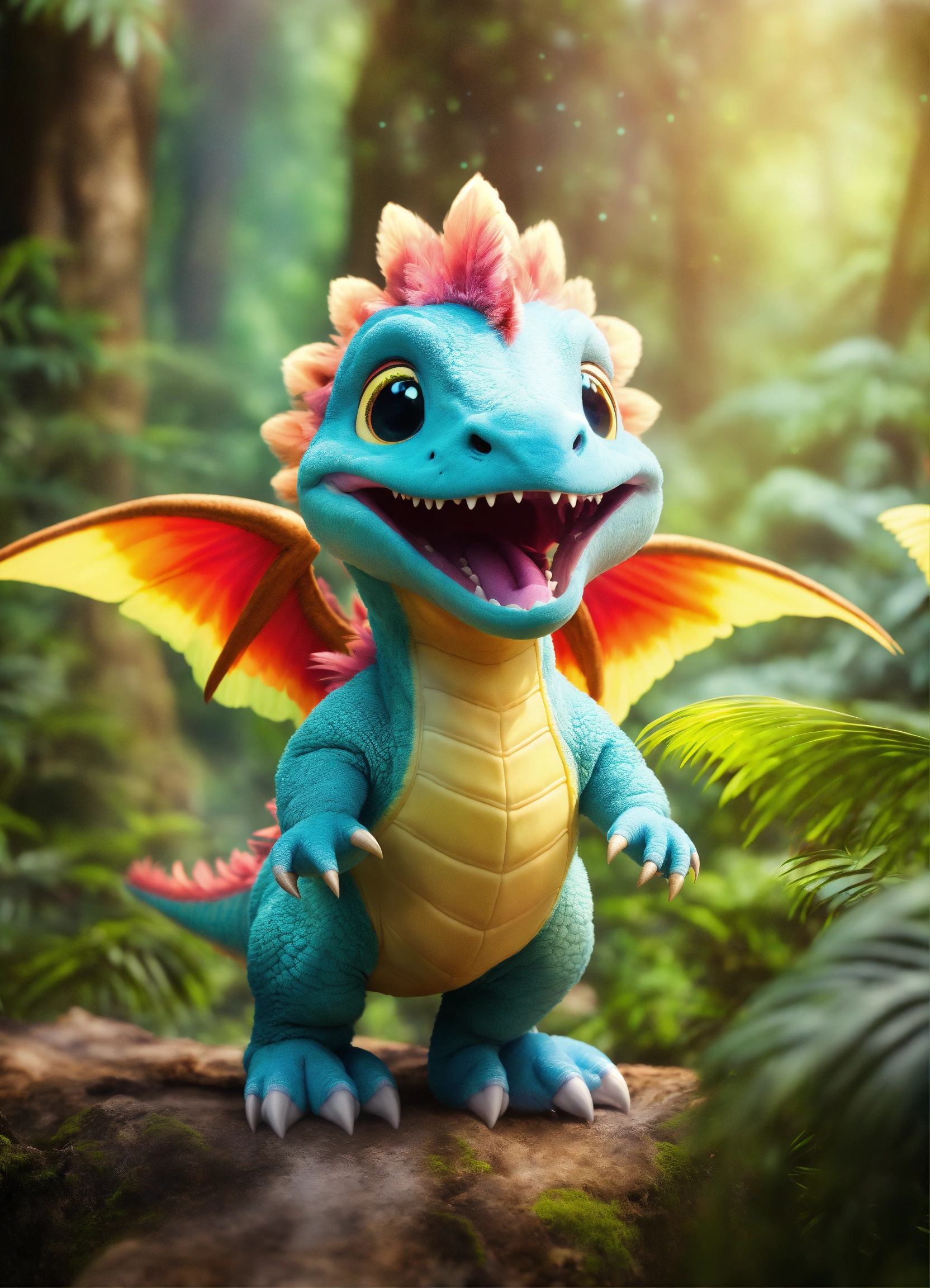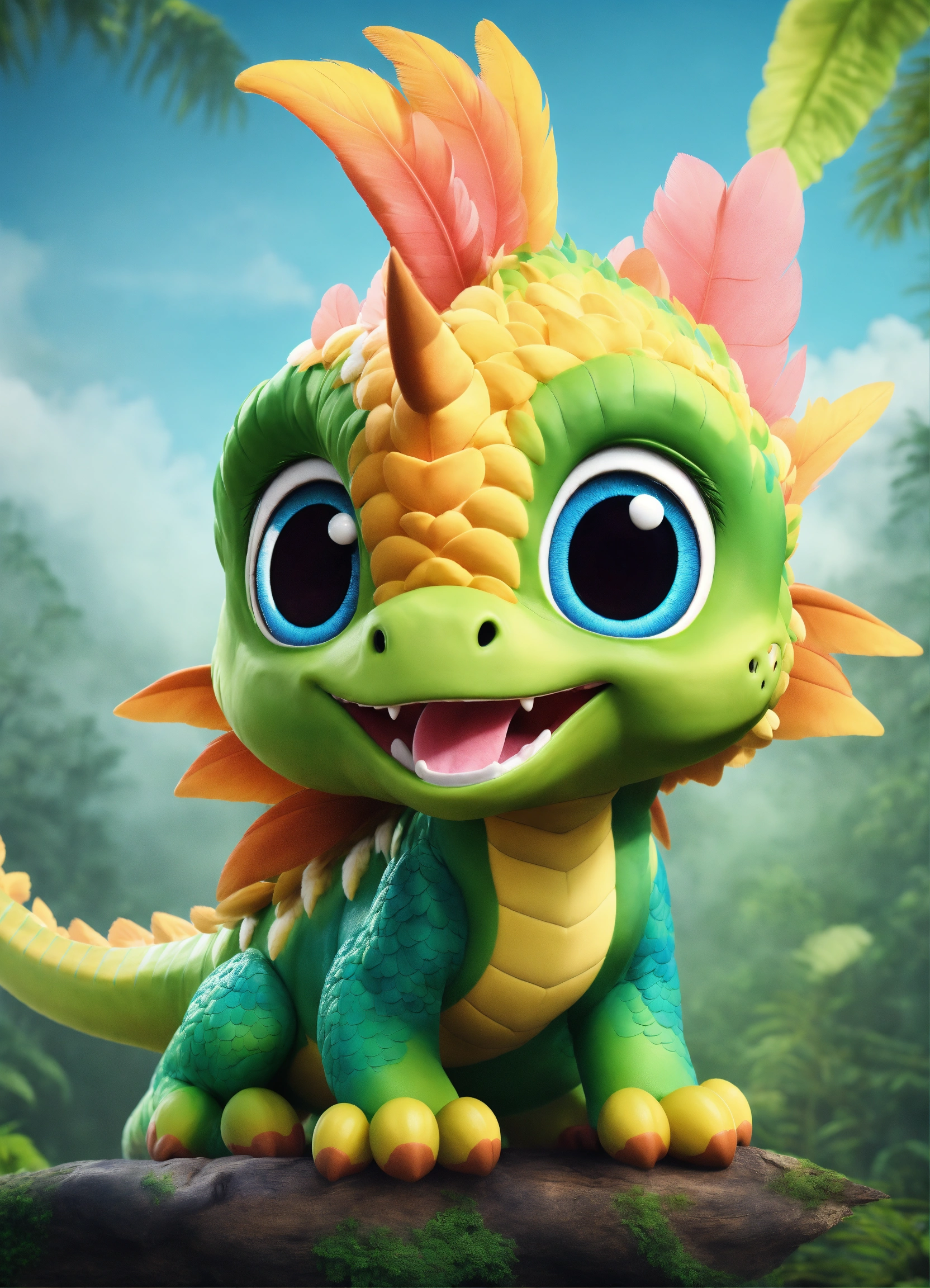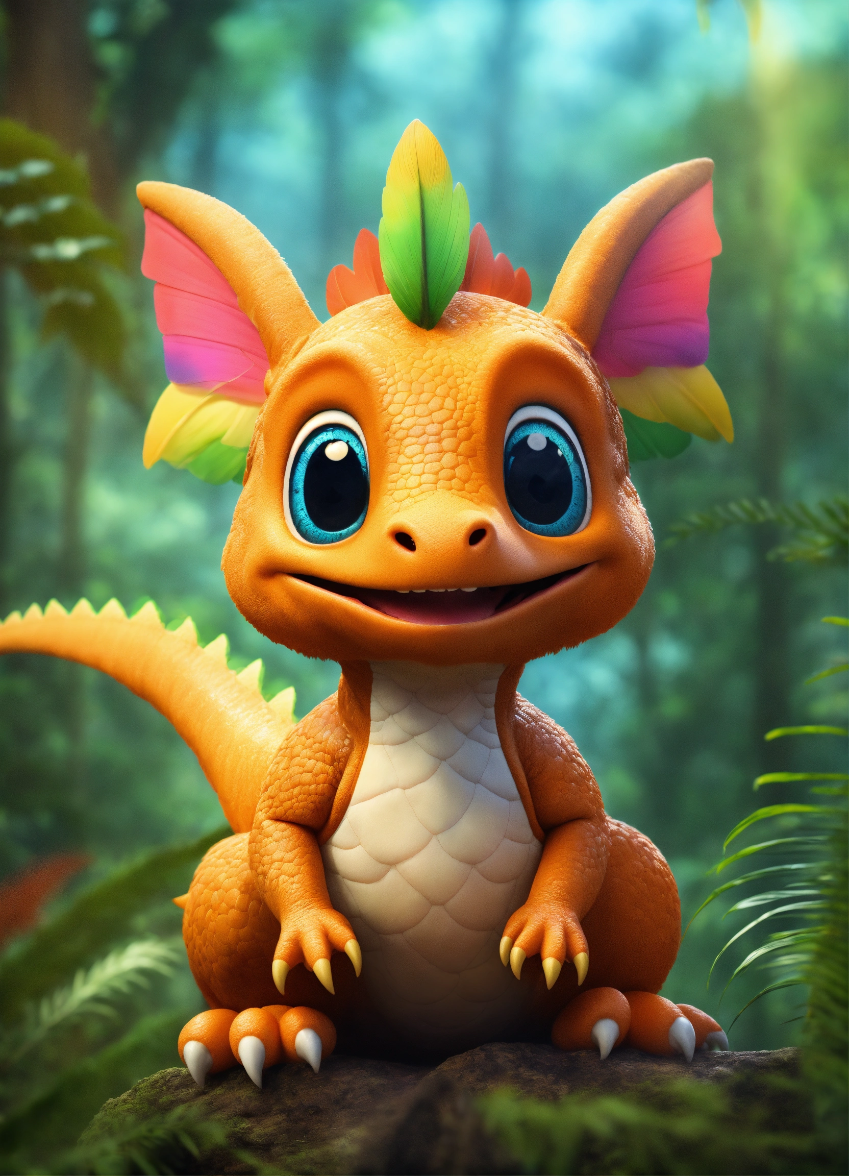 An adorable and fluffy baby fantasy dinosaur with big color eyes and big and huge ears, with soft feathers and wings flying above a forrest in the clouds, multicolor skin with stripes, tusks, smiling and happy, rainforest, with blur background, high quality, 8k