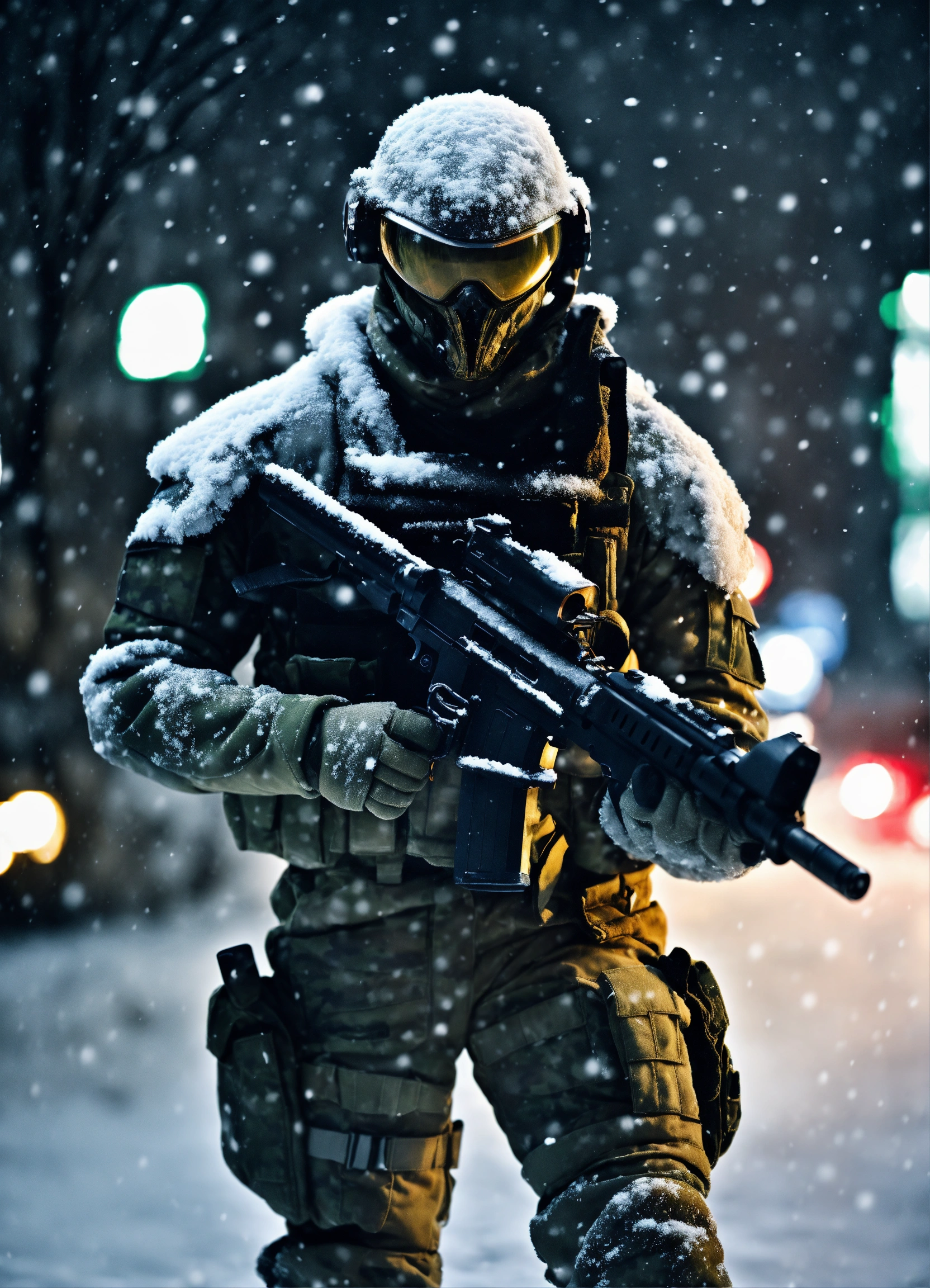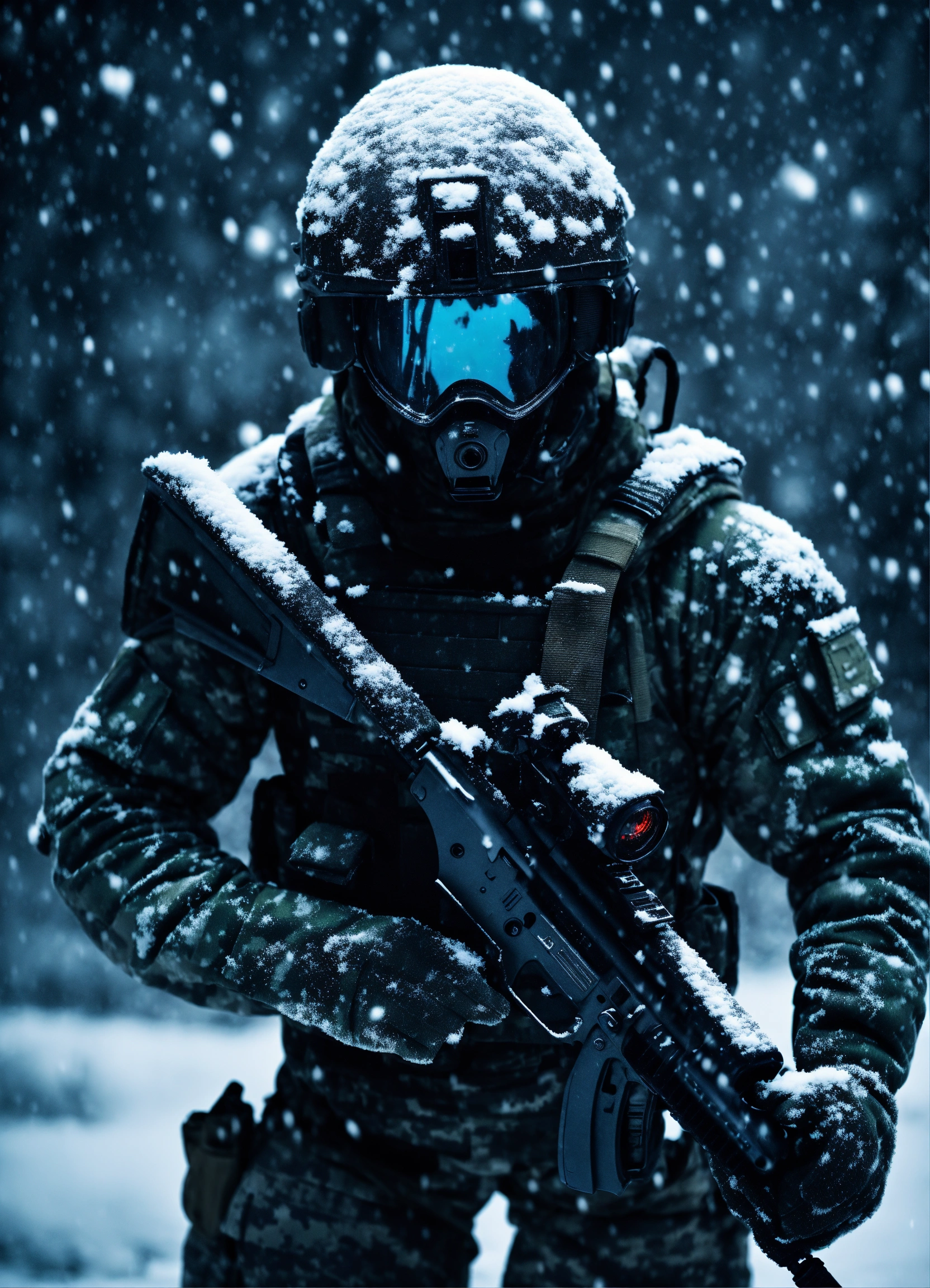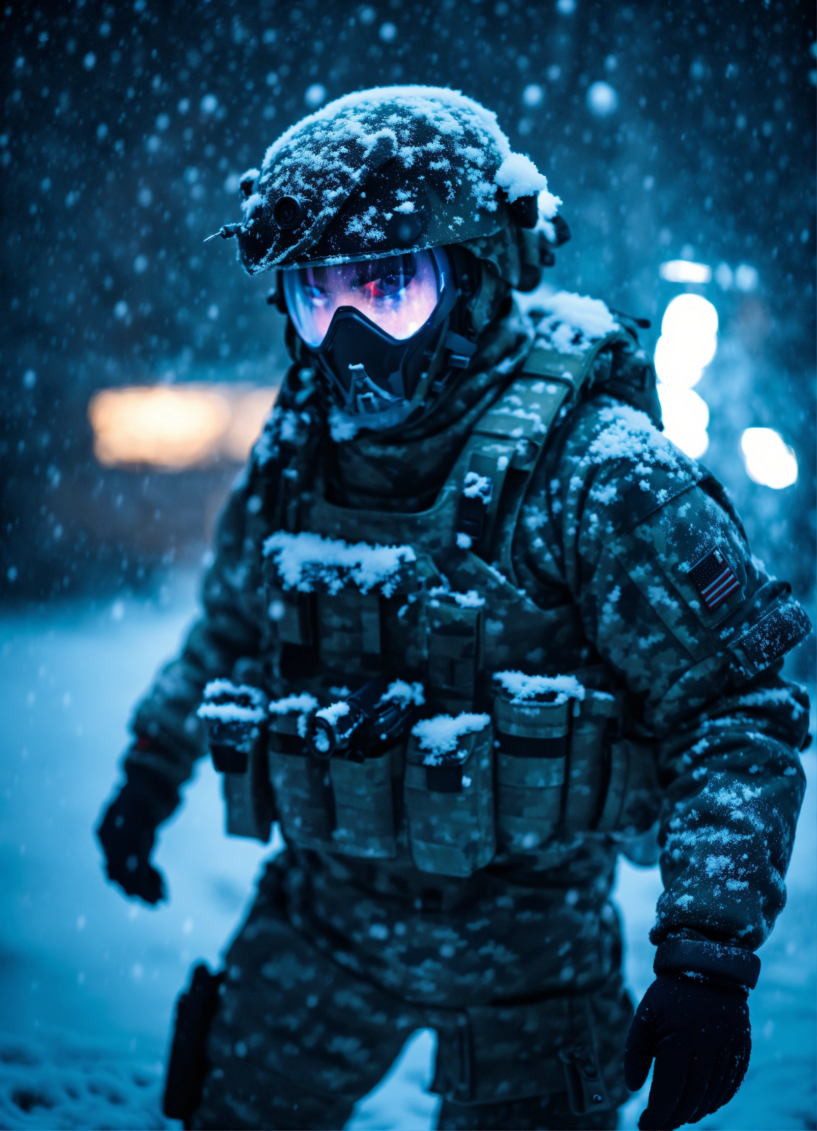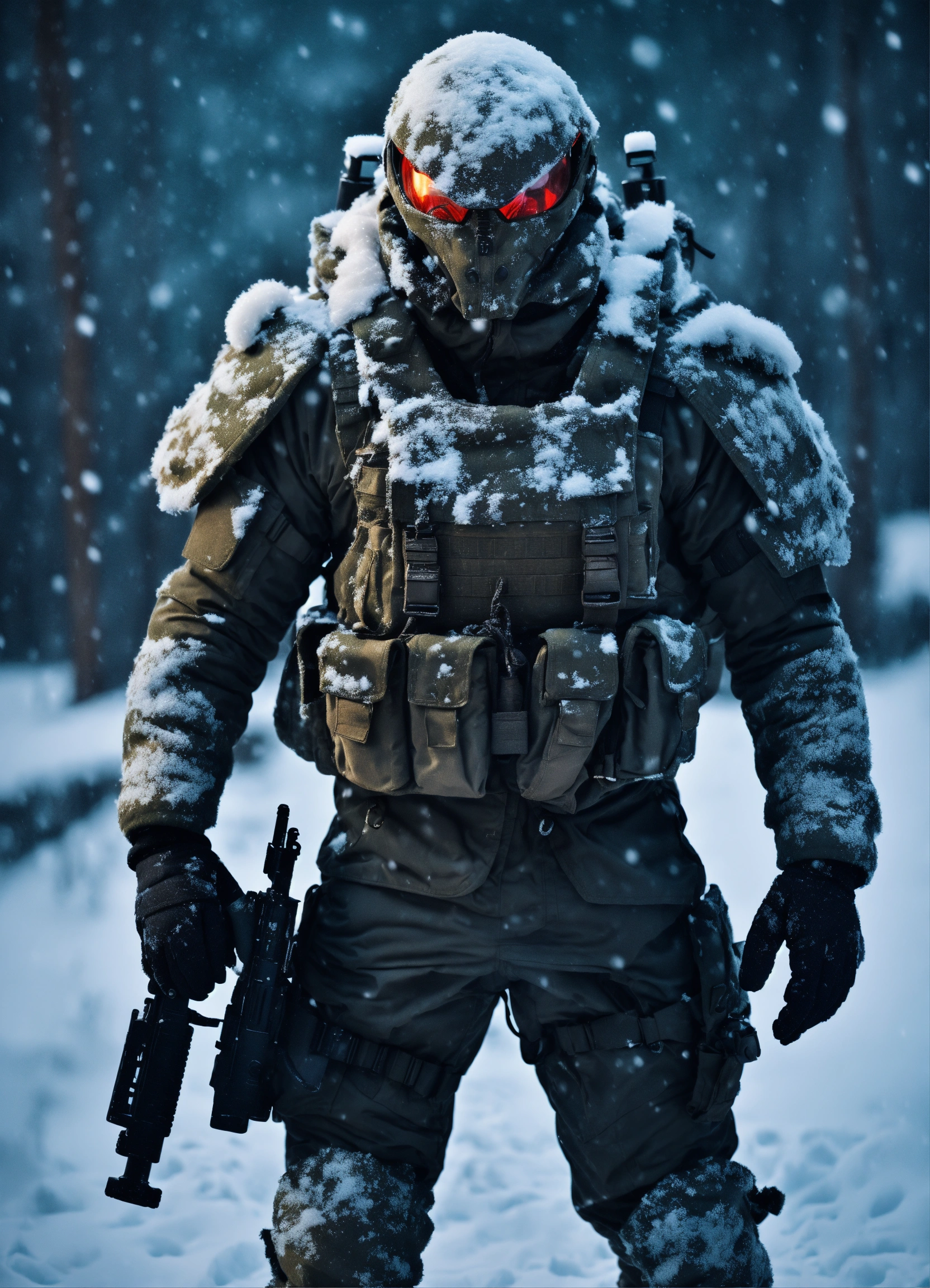 A alien soldier monster, wearing winter camo military gear, during a snow storm, dark lighting, full body portrait, intricate details, depth of field, in a cold snowstorm, outdoors, night