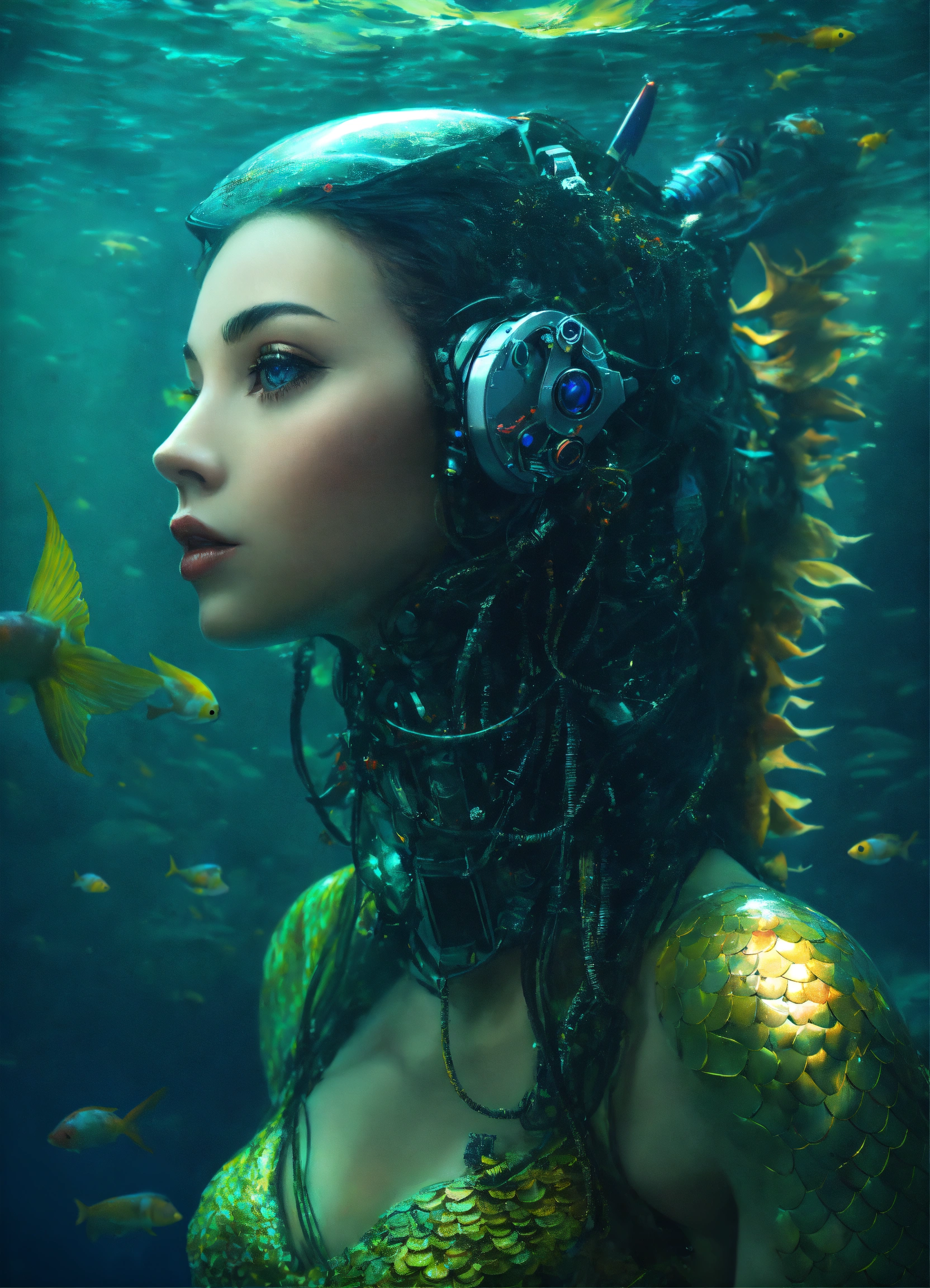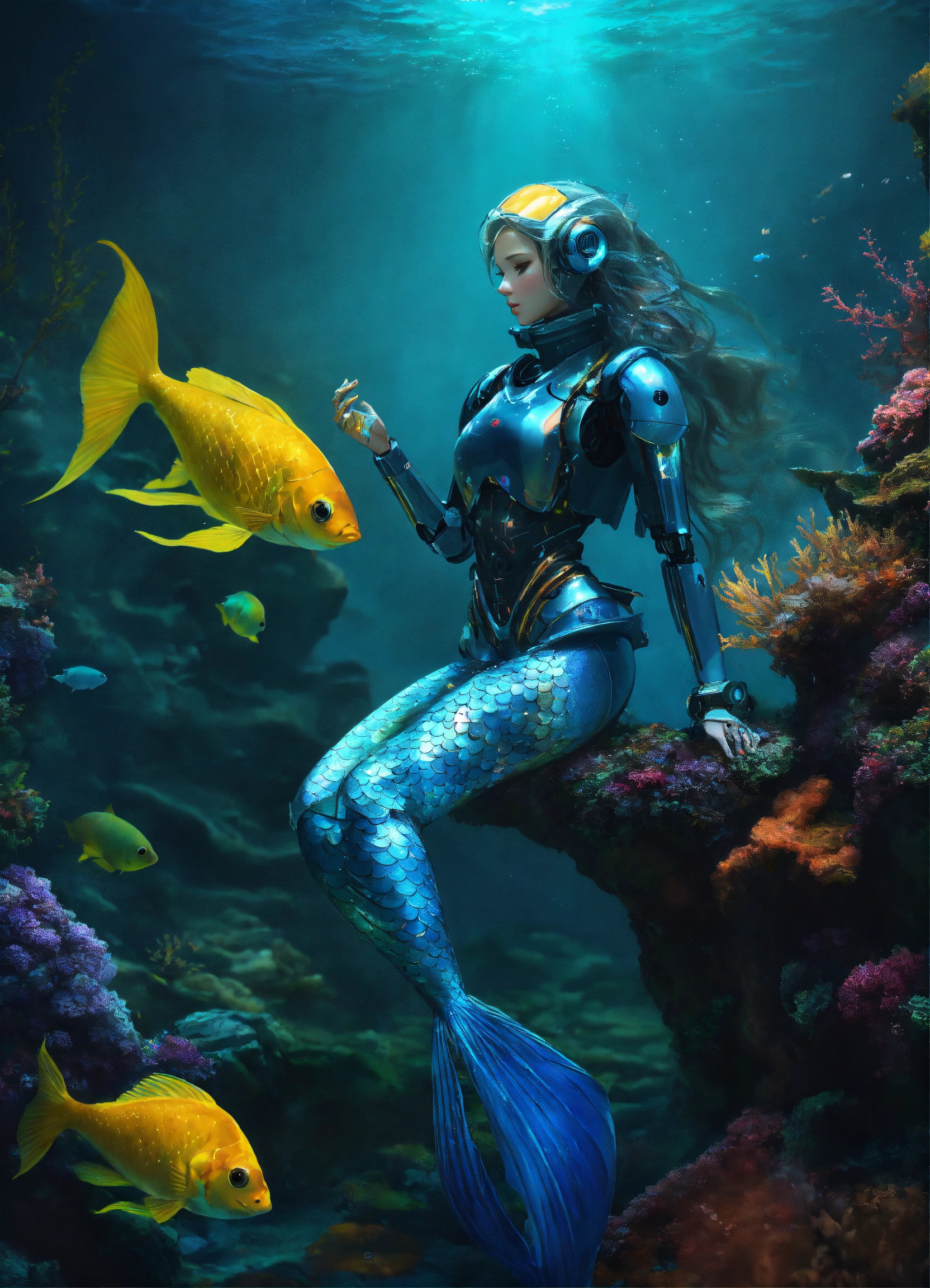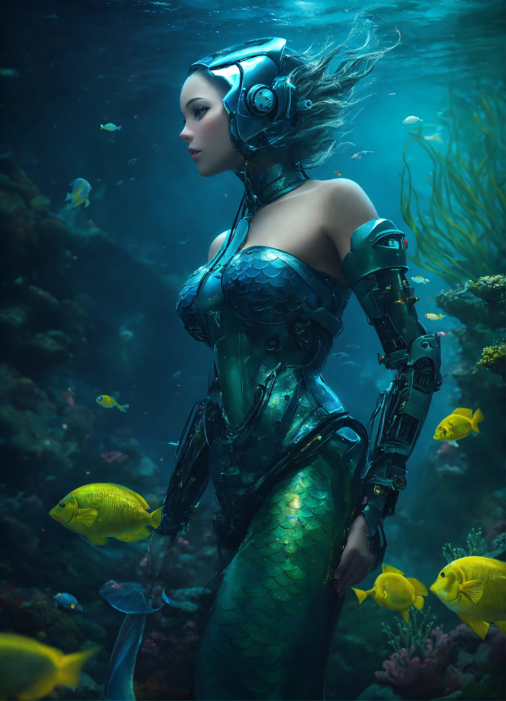 A robot mermaid, in the bottom of the sea, dark light, whit a robotic fishtail, trending in artstation, digital paint hyperrealist photo--s 750