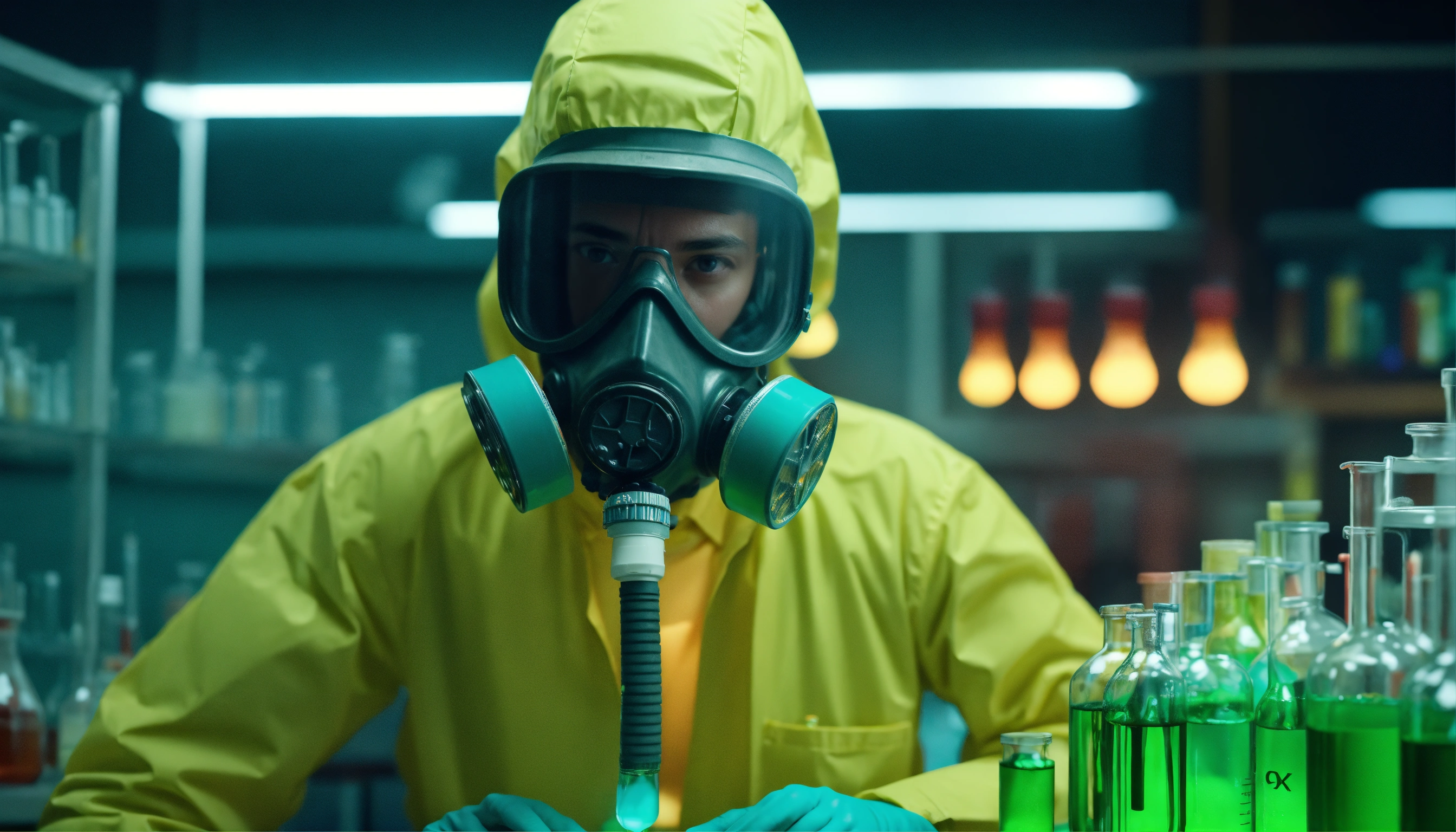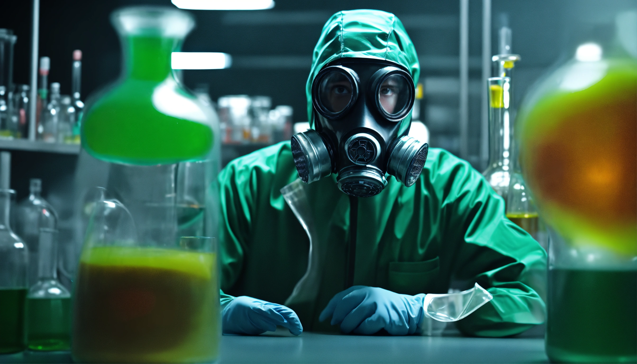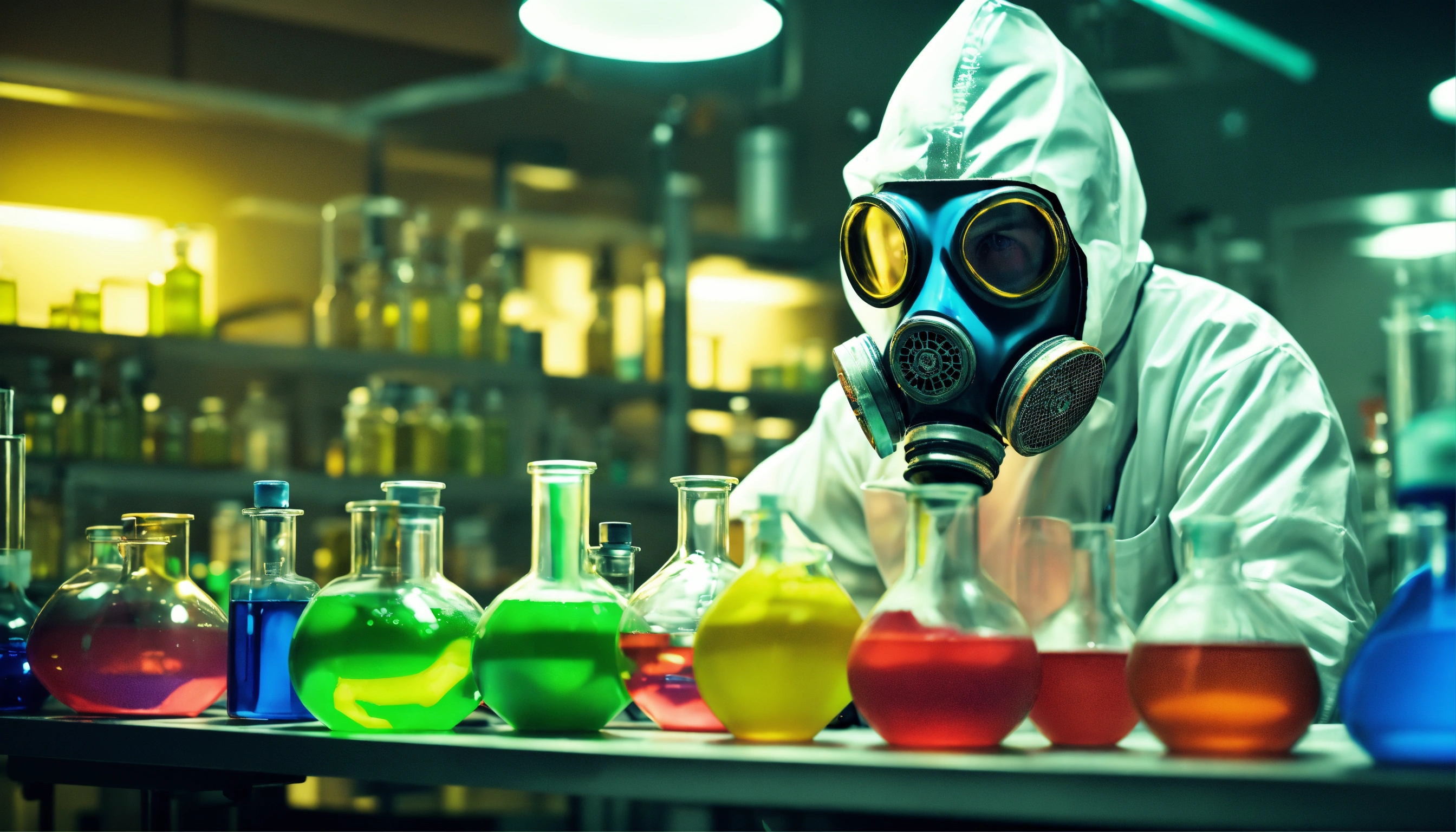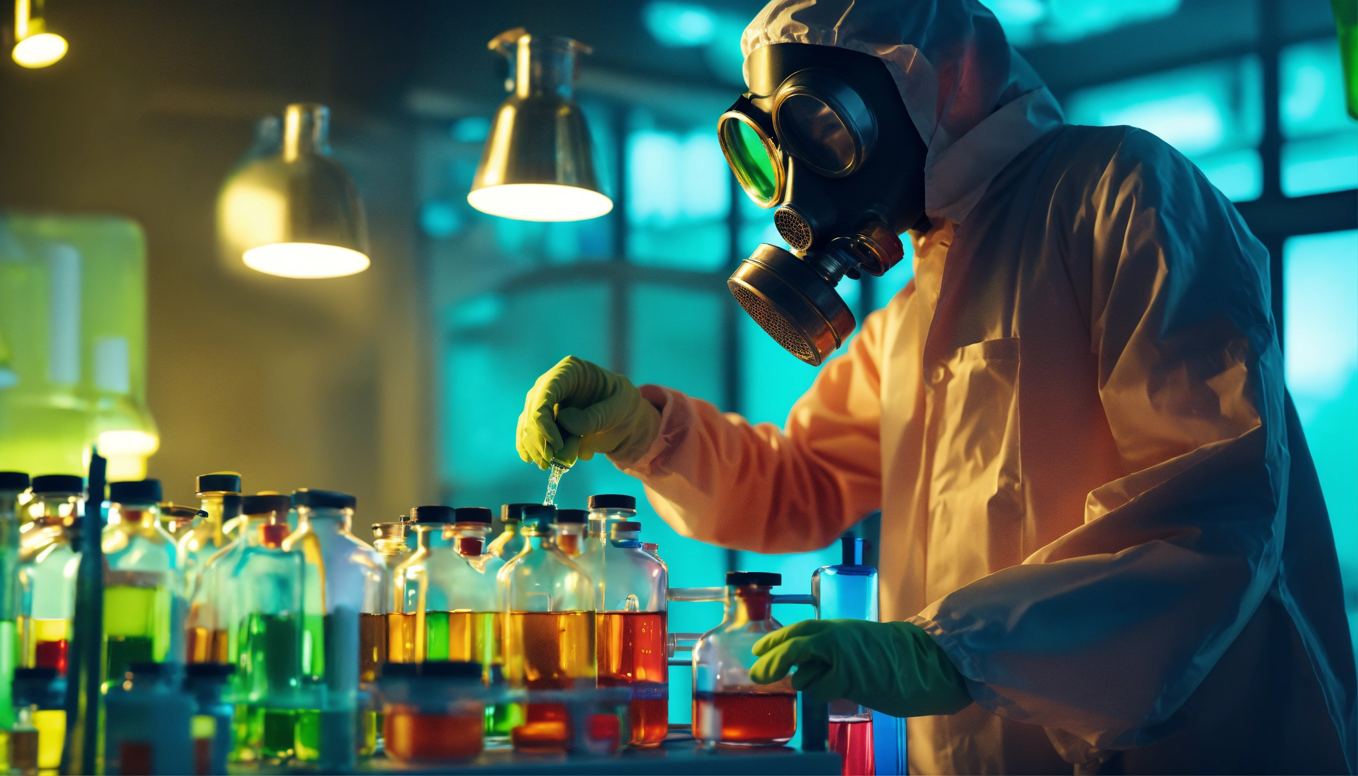 Toxic. crazy man chemist wearing gas mask. working in a modern laboratory with flasks and colored pouring liquids and reagents. production of synthetic designer drugs - pills. octane render, highly detailed, lighting, professional, realistic, sharp focus, 4k, 8k, high resolution, candid, personal, bright lighting, ultra-detailed, bright lighting, photo, photography