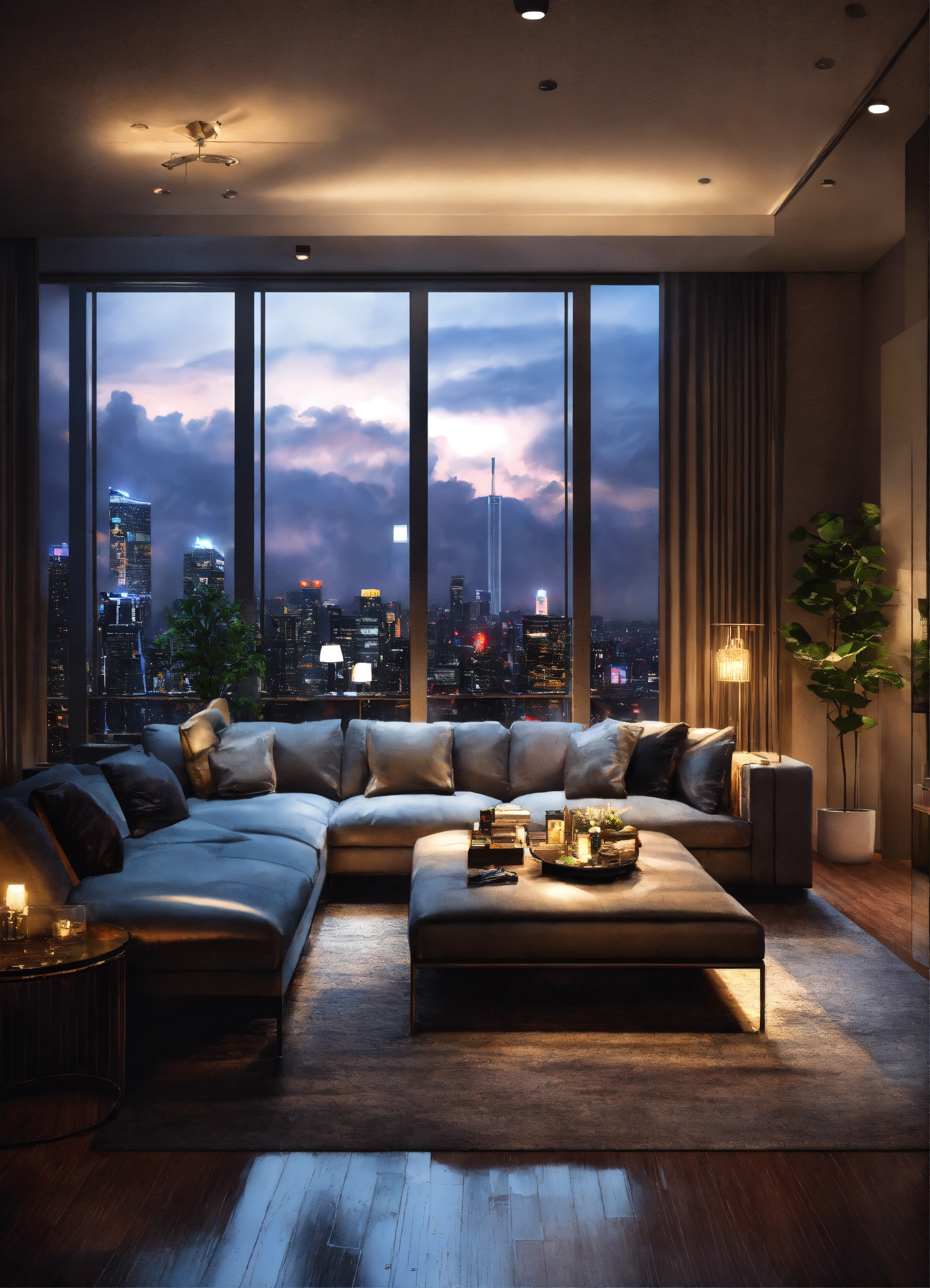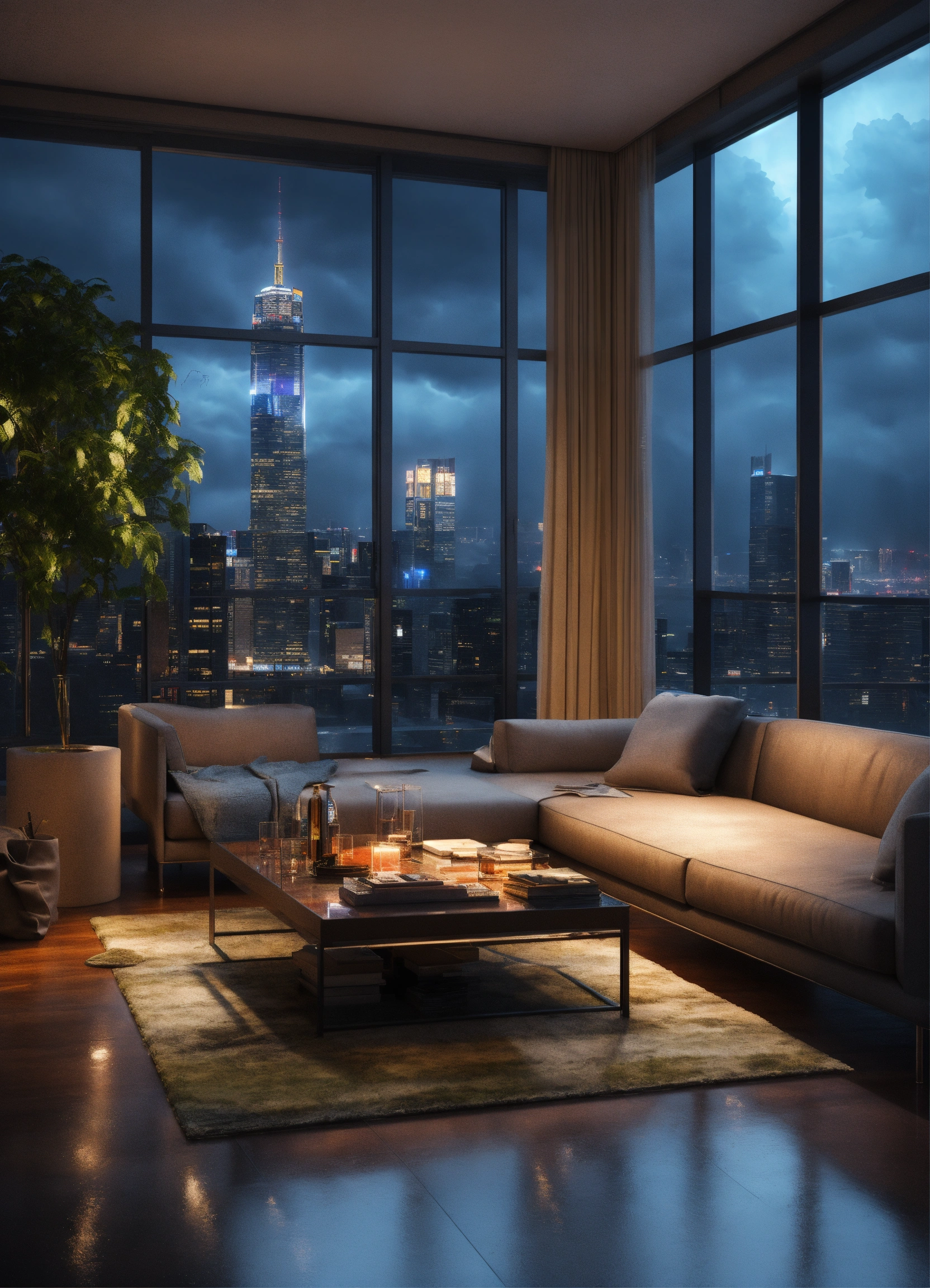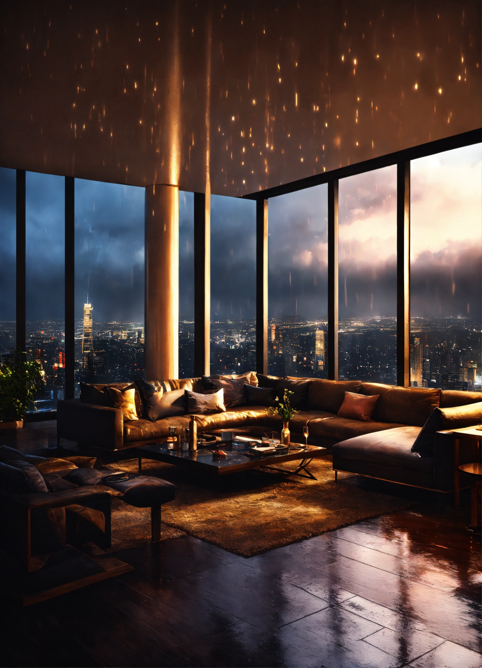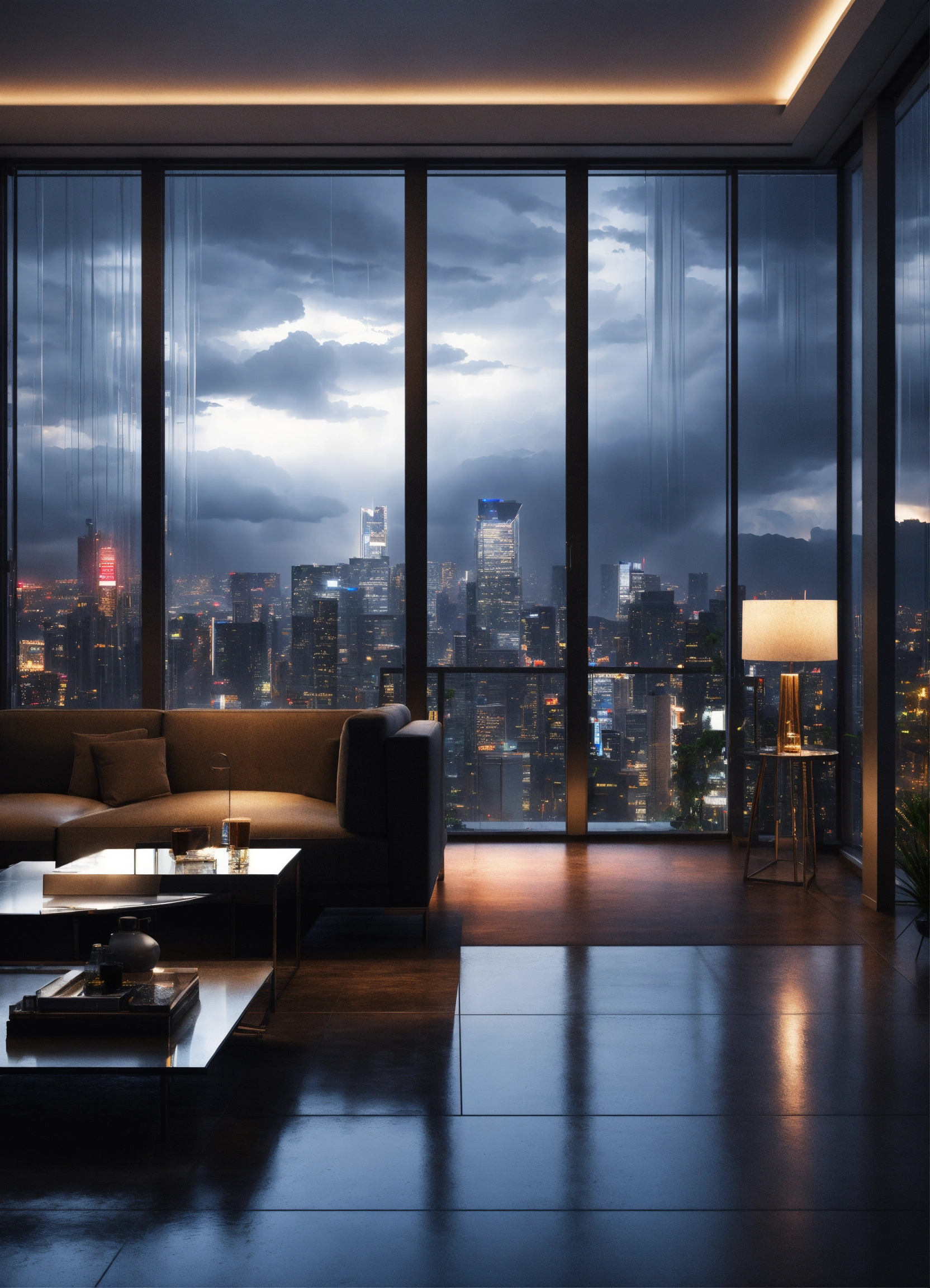 Interior architectural rendering 8k, beautiful interior living room with floor to ceiling glass windows overlooking the bright lights of night city skyscrapers, nightlife, thunderstorm outside with pouring rain, detailed, high resolution, photorealistic, dark, gloomy, moody