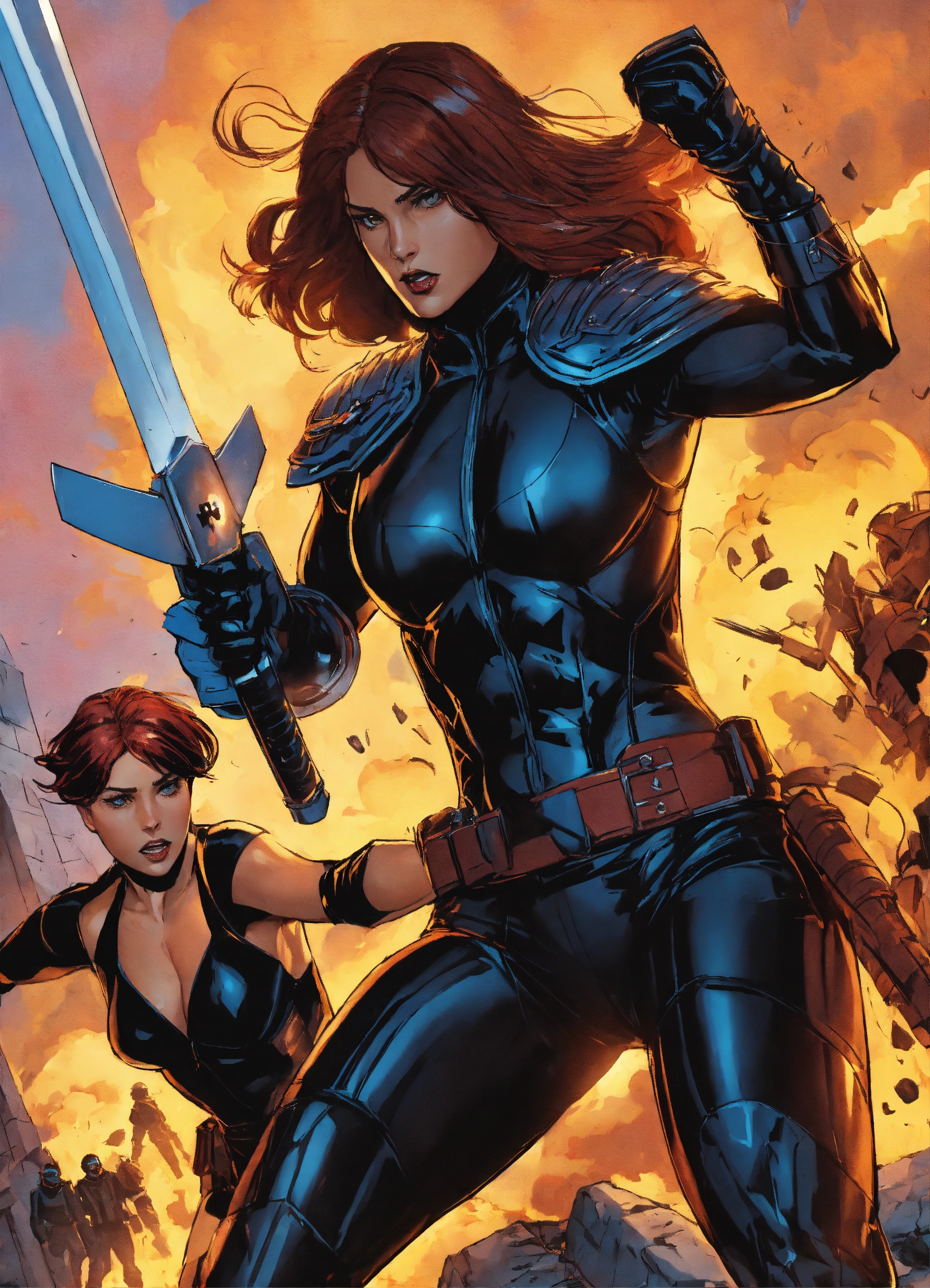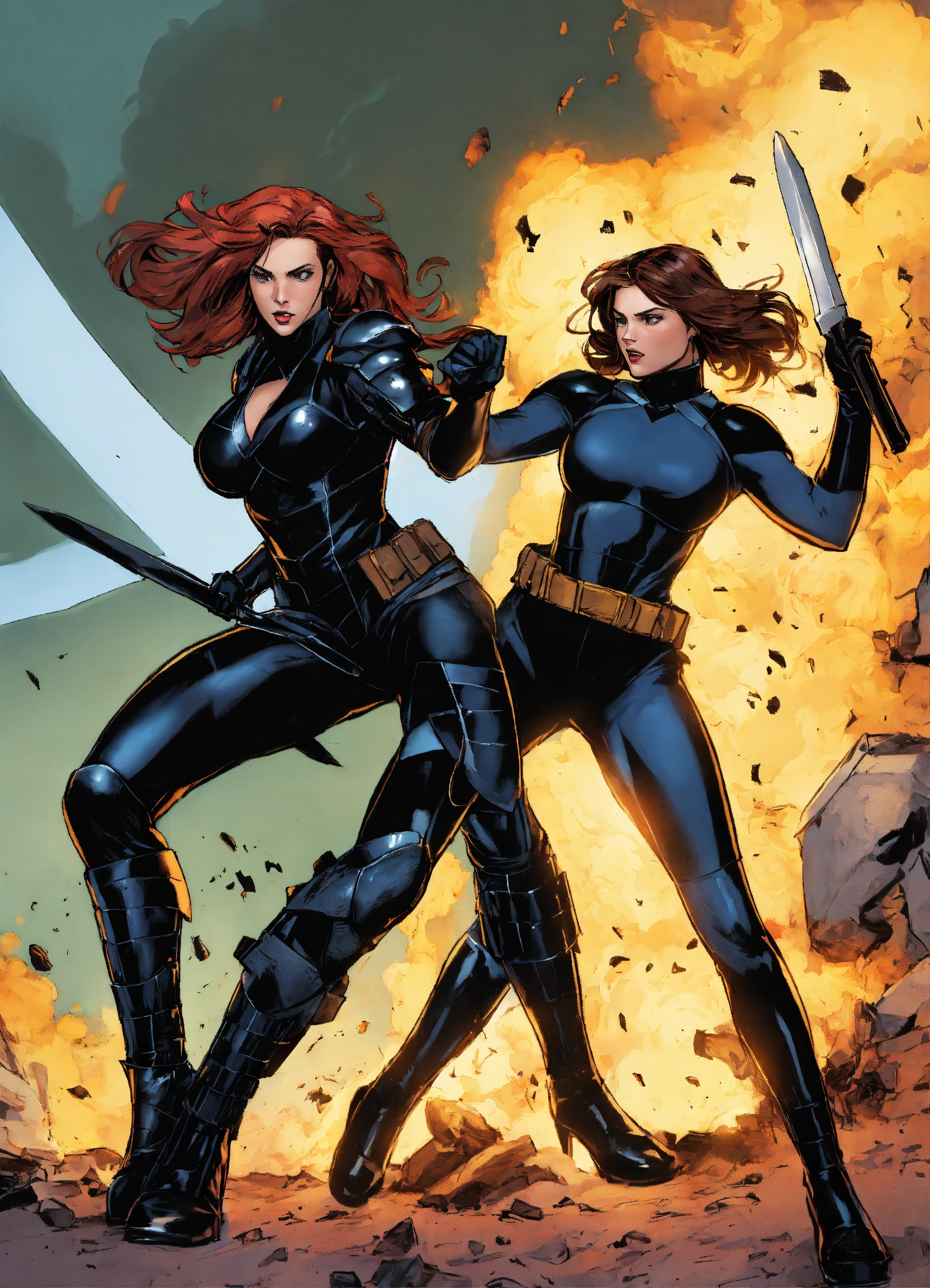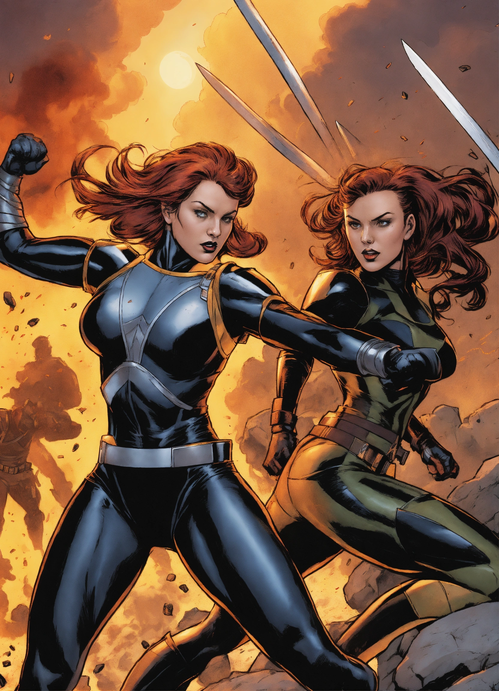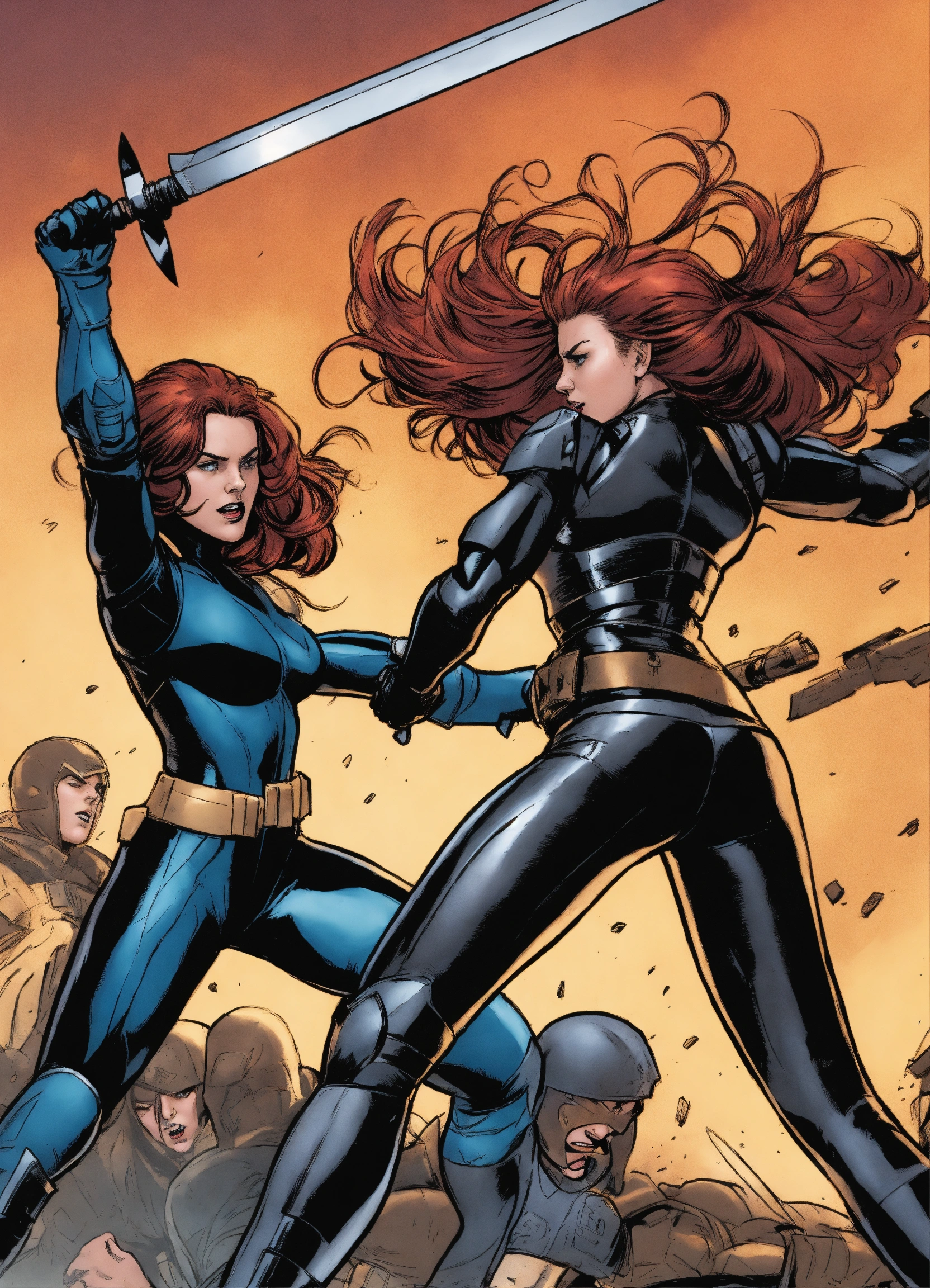 Female x-men shadowcat wearing black metal combat armor fighting with female g, i, joe scarlett wearing black metal combat armor