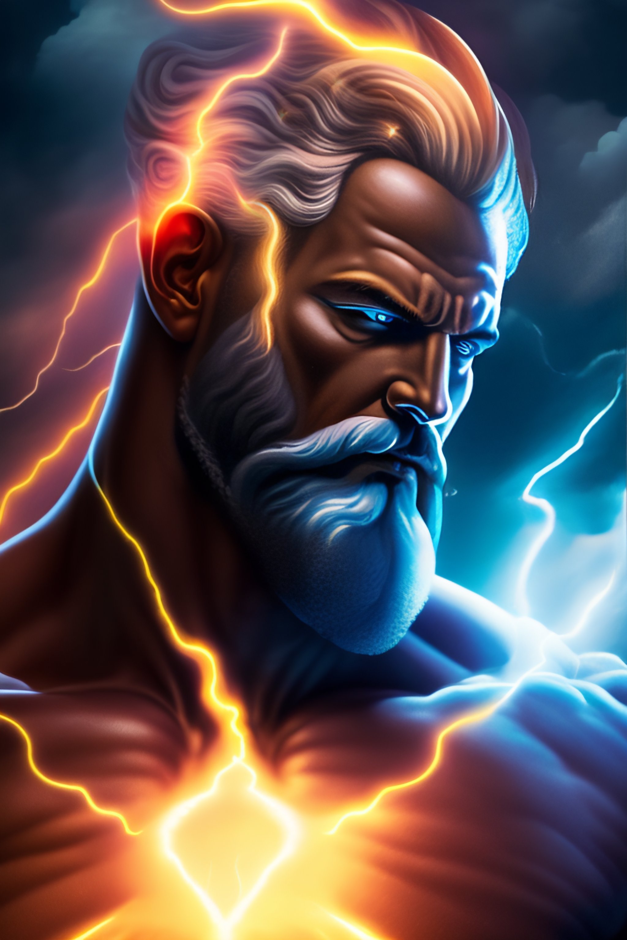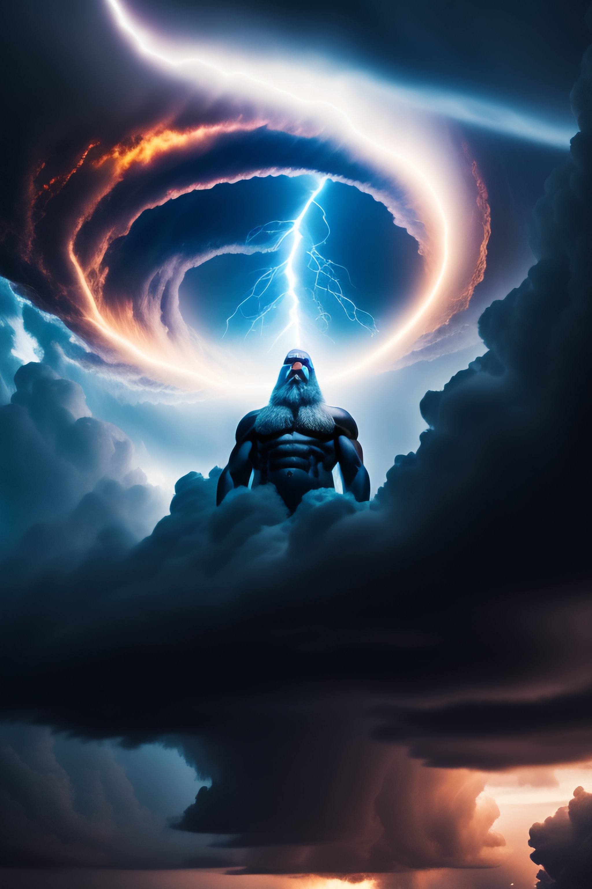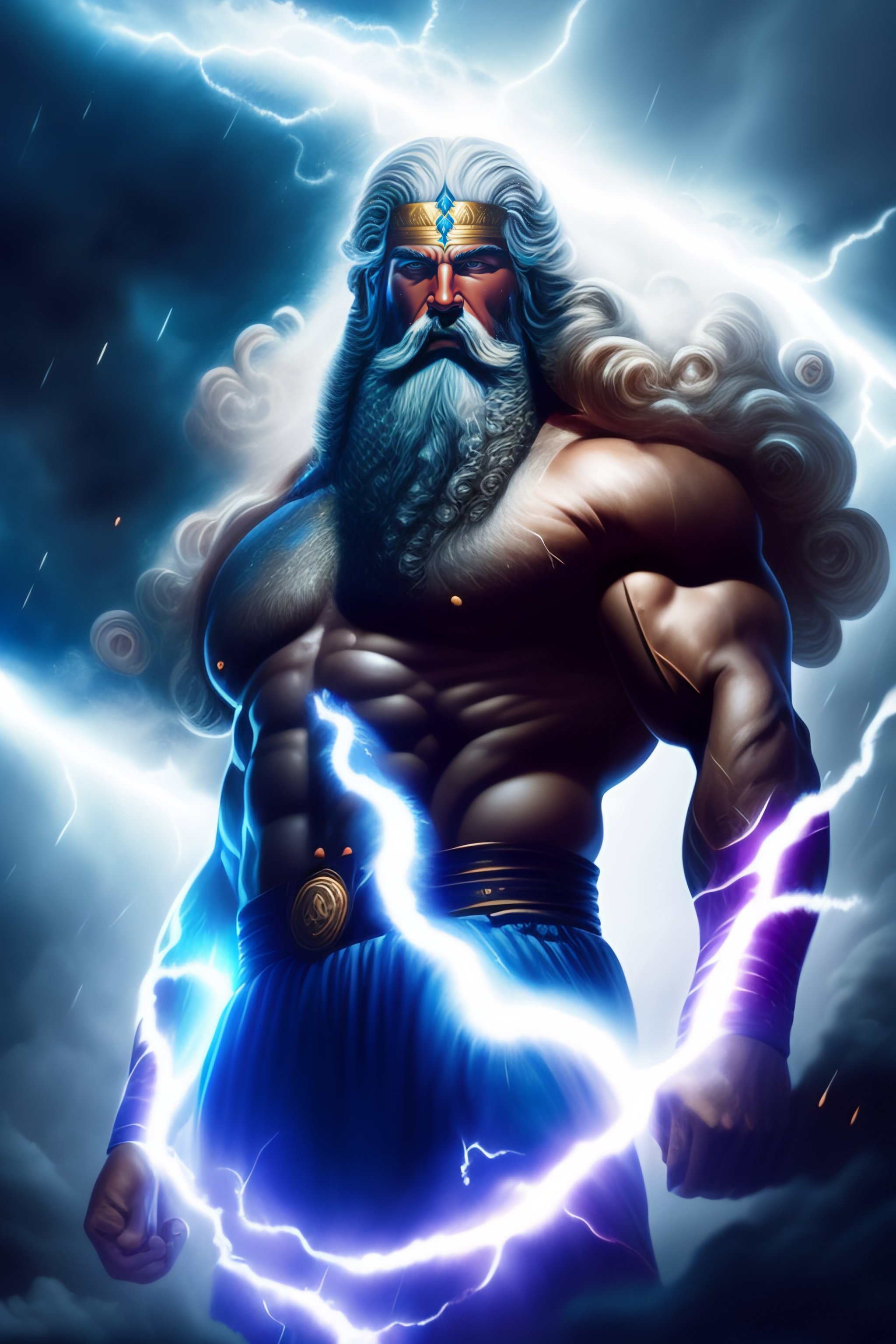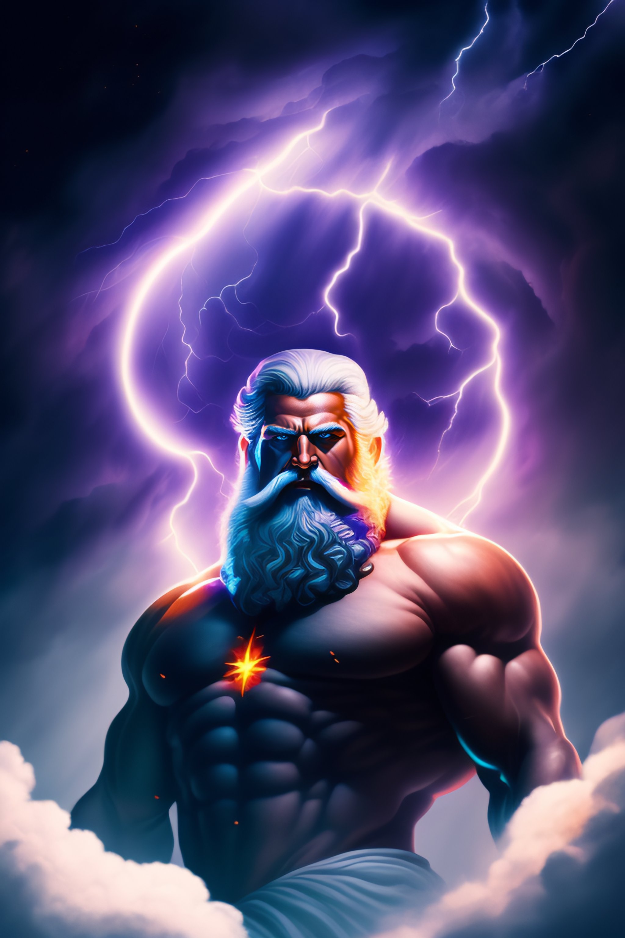 Old god zeus, in the sky, with athletic body, angry, throwing lightning bolts at the earth with his right hand, coming out of the clouds, looking down, eyes illuminated by lightning
