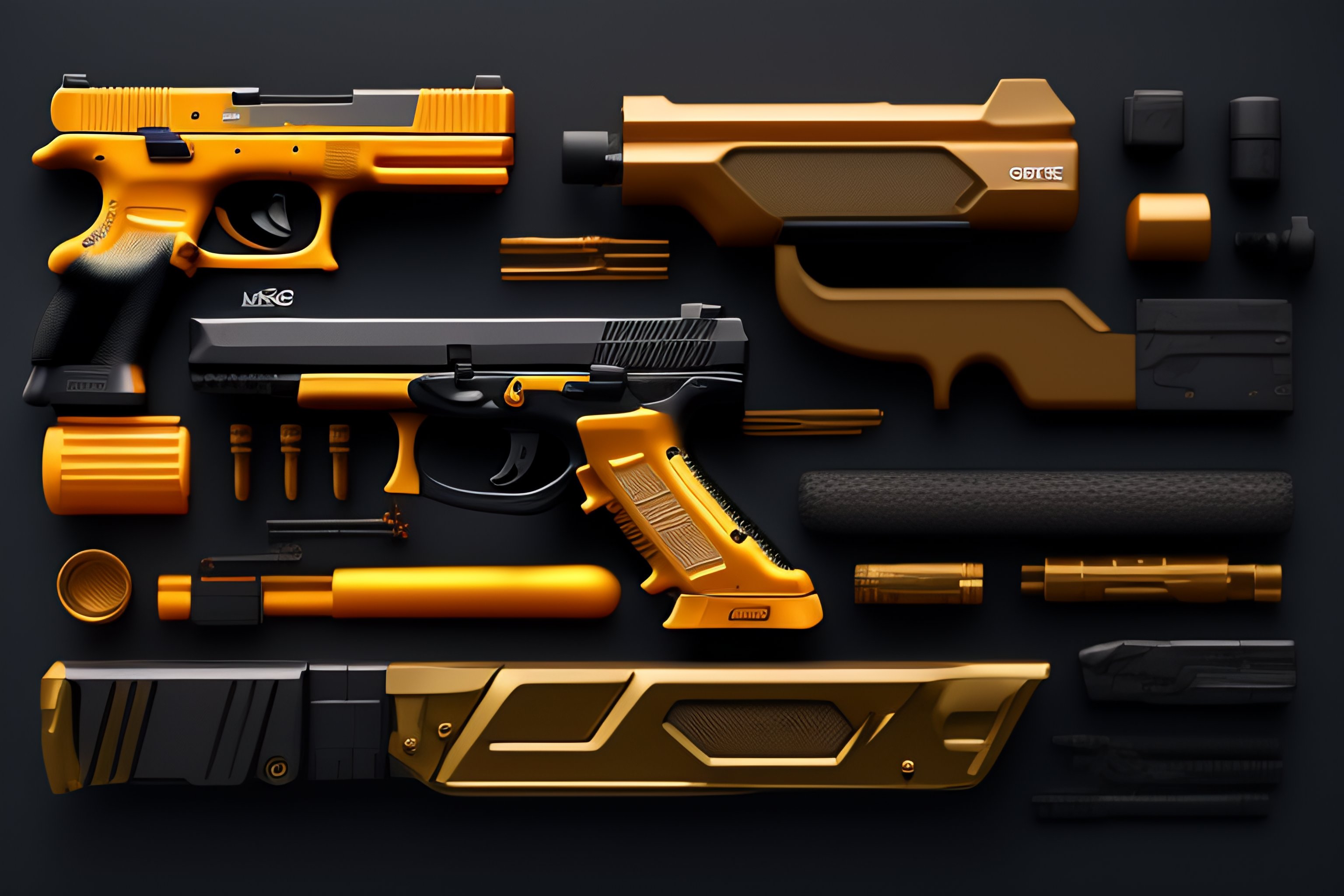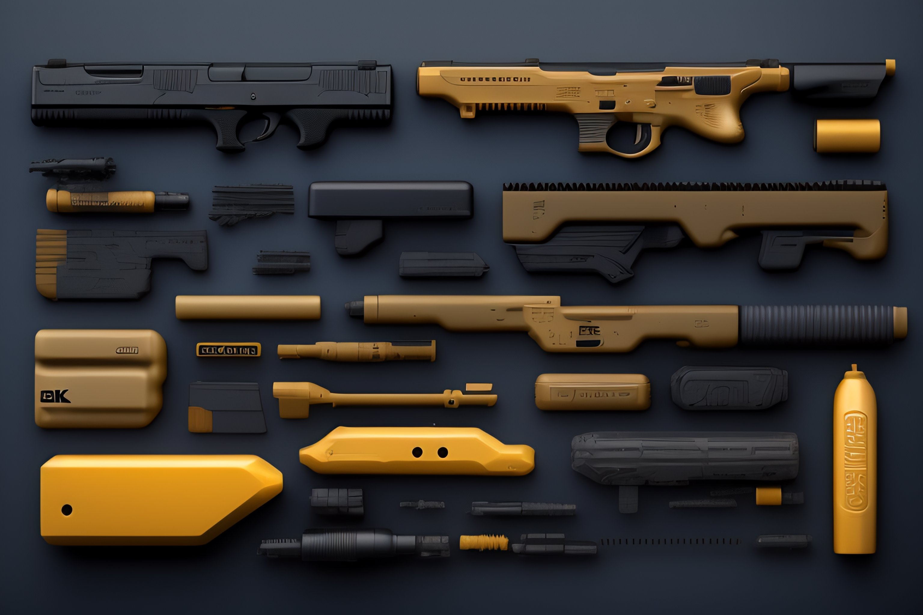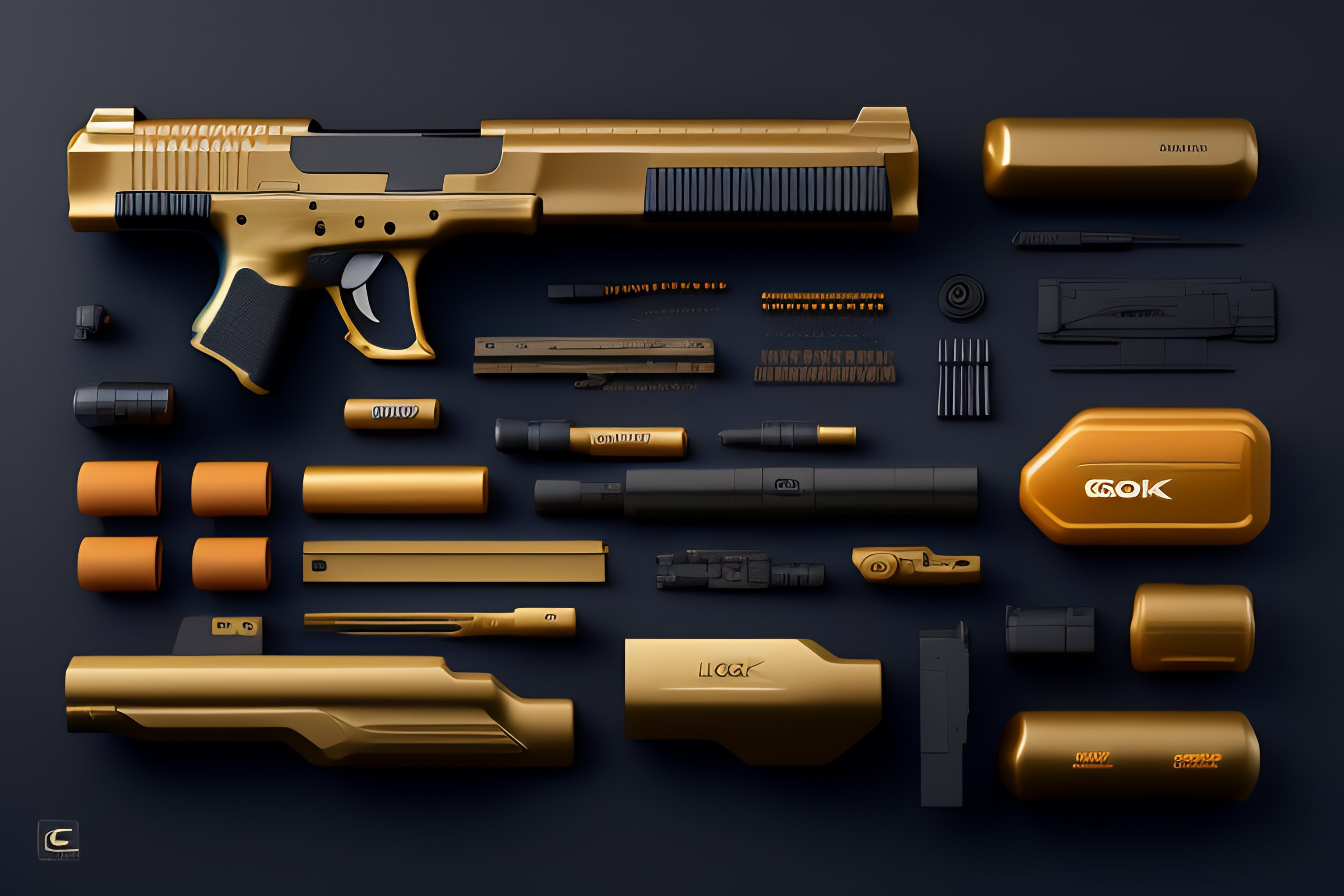 Glock firearm, costumes and props, knolling, knolling layout, deconstruction, highly detailed, depth, many parts, lumen render, 8k