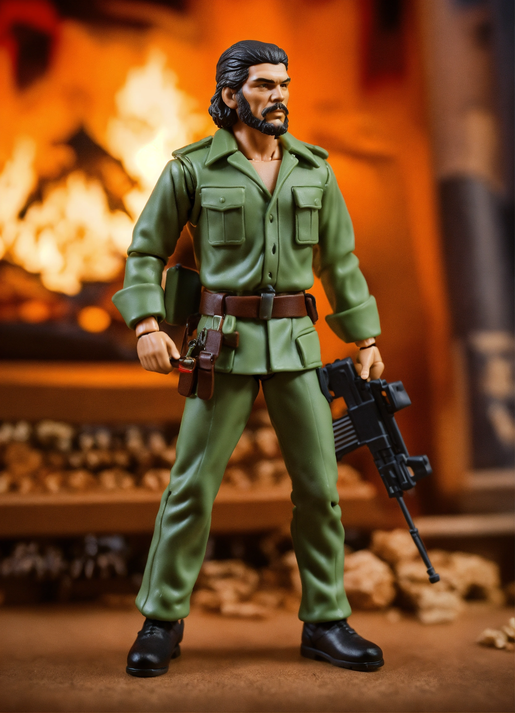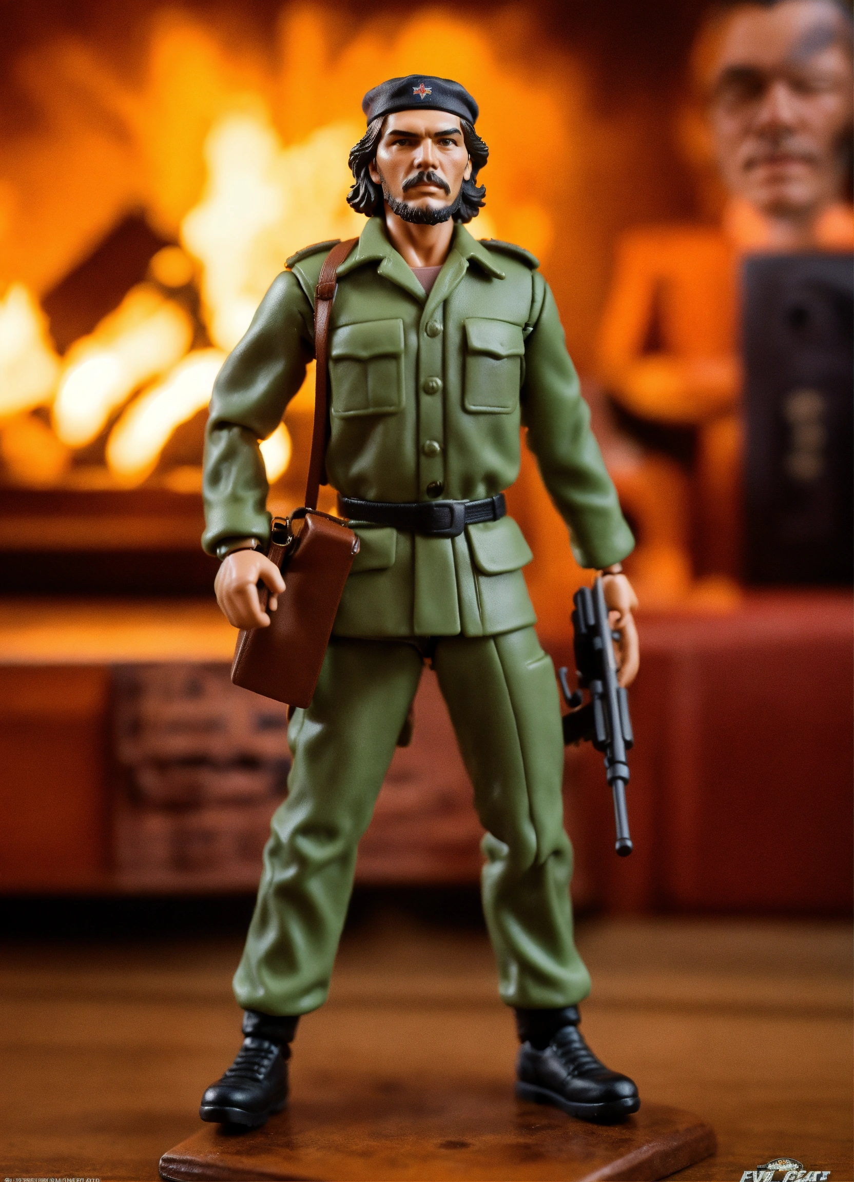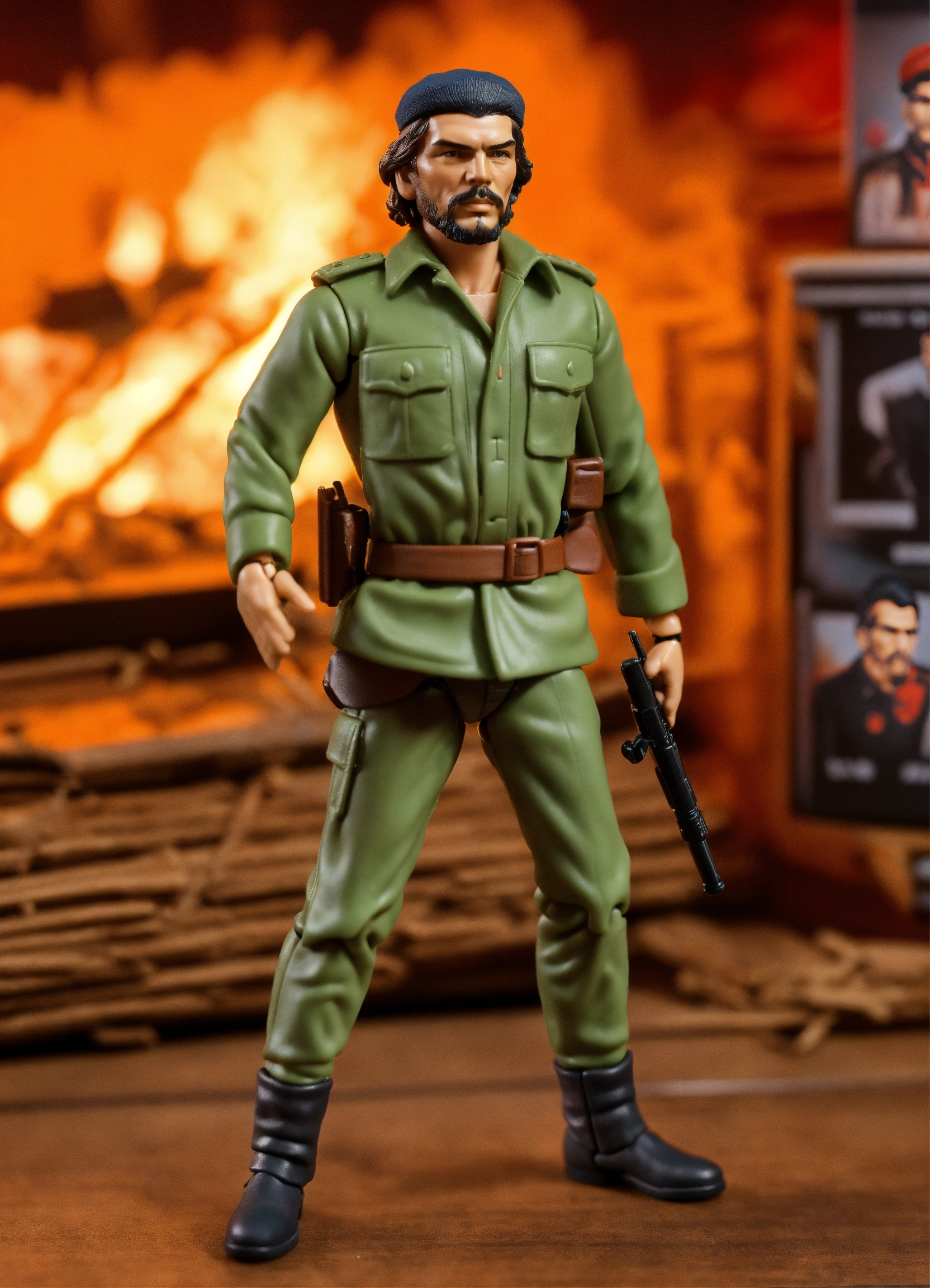 Design a kenner-style action figure of che guevara, capturing the '70s/'80s retro aesthetic. incorporate fine details, including his iconic beret, beard, and determined gaze, while staying true to kenner's quality craftsmanship. create classic kenner-style packaging for the figure. the goal is to create a historically accurate, visually striking collector's item that pays tribute to che guevara's legacy and evokes nostalgia for classic action figures.