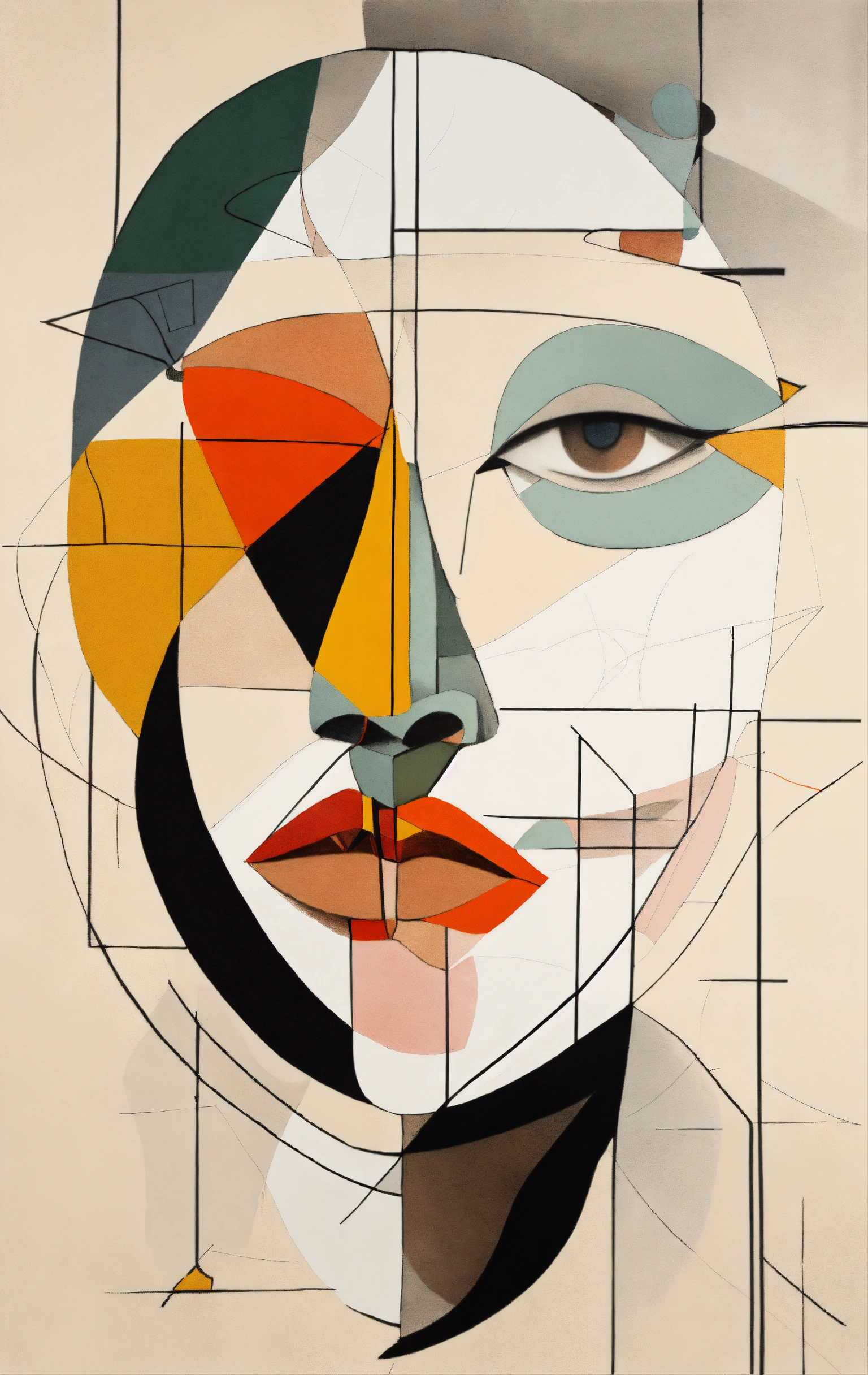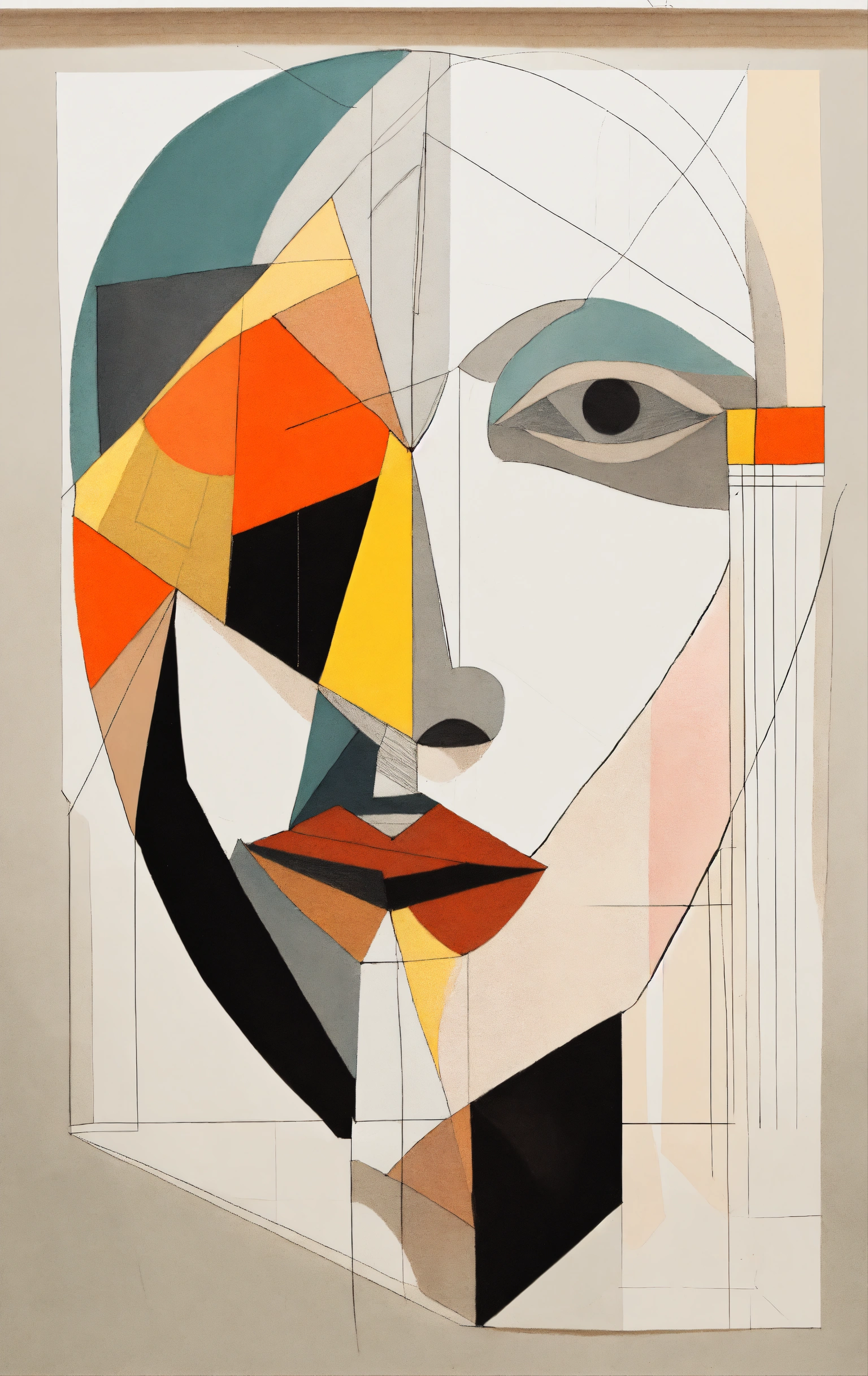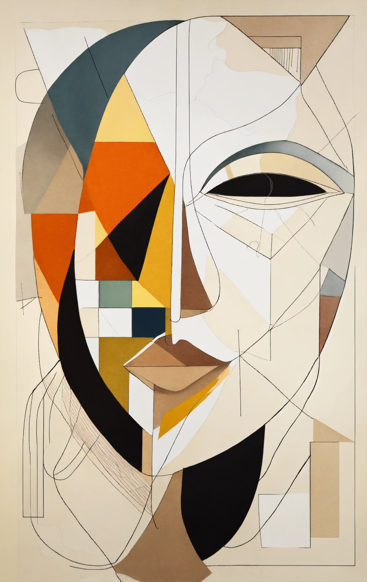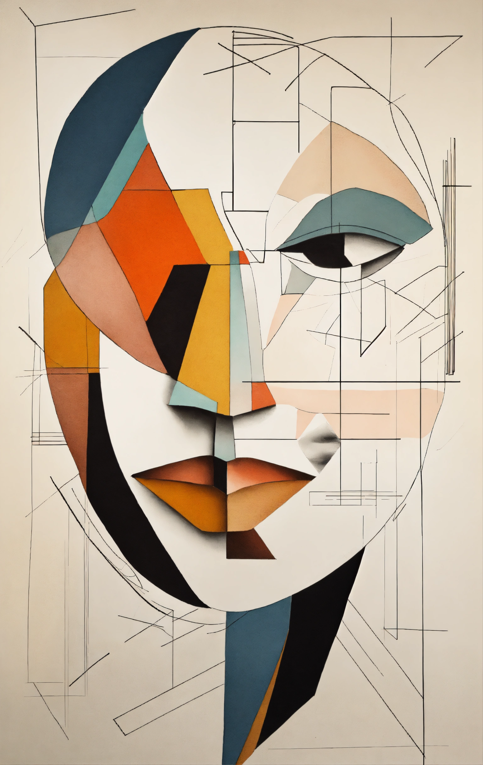 Minimalist and abstract pencil drawing of human face with various tones and geometric shapes