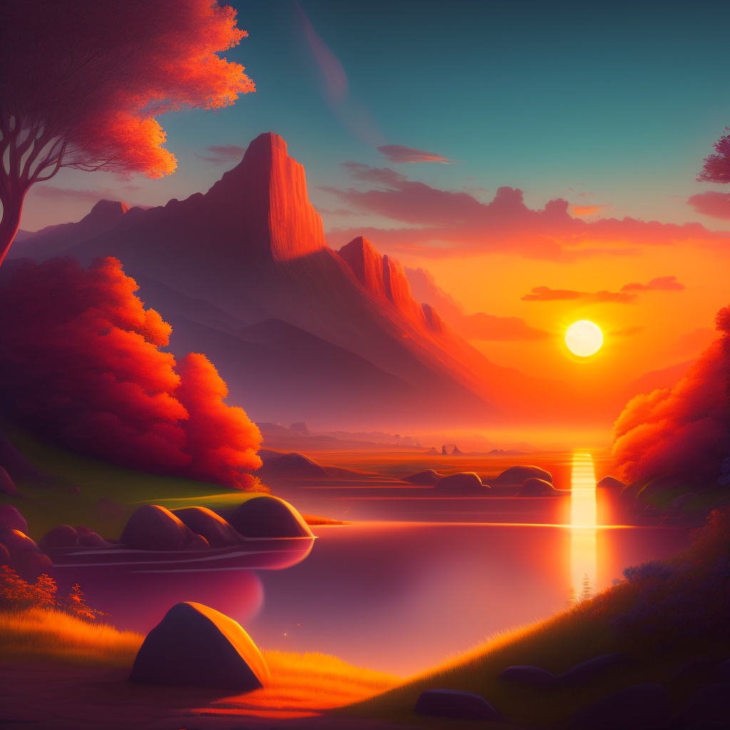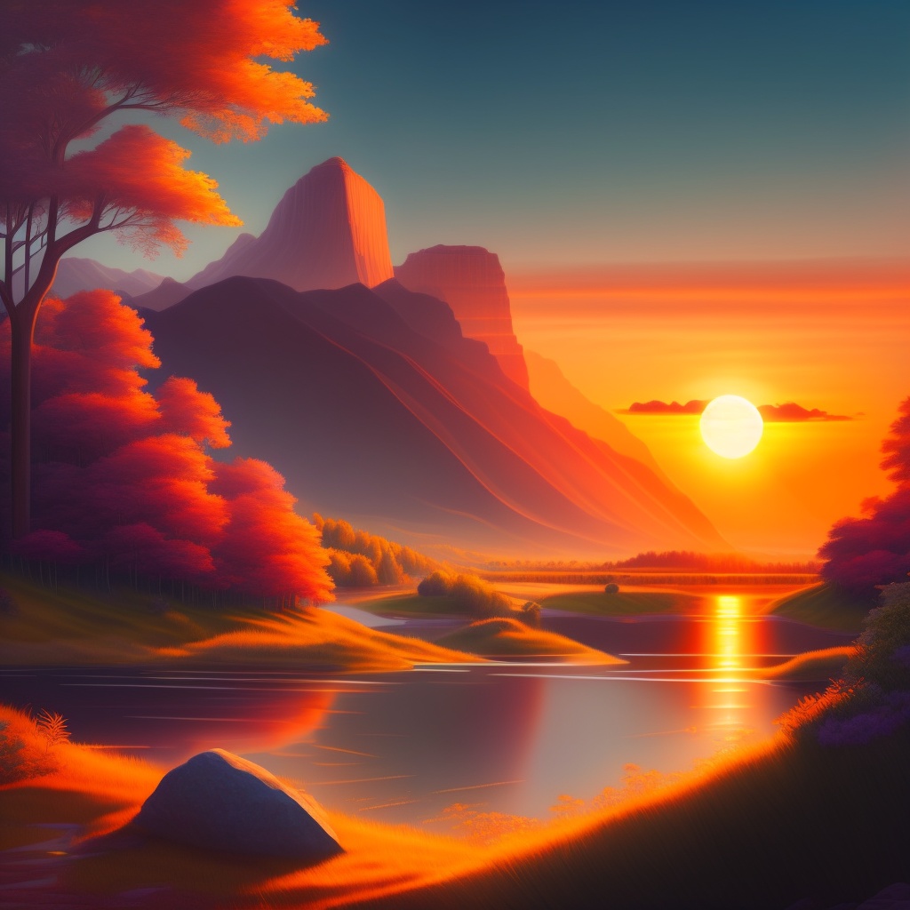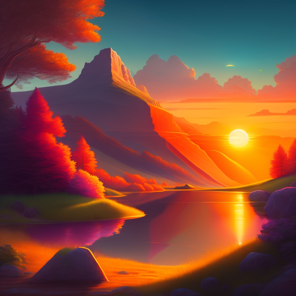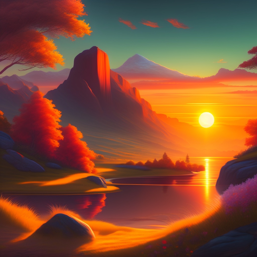 The illustration shows a vibrant sunrise, with the sun peeking over the horizon, casting warm rays of light on the landscape