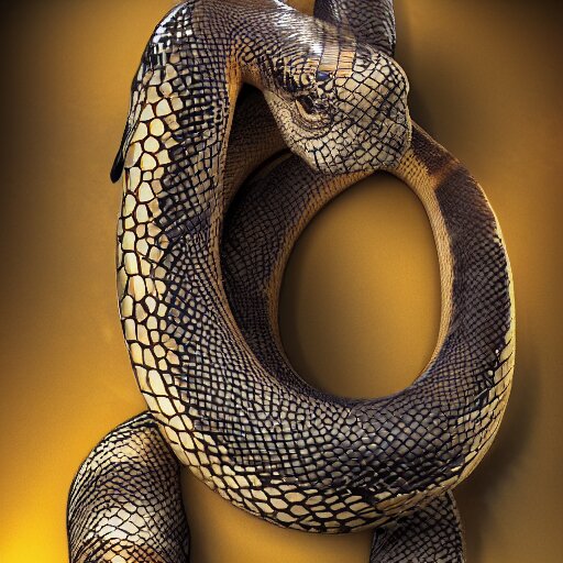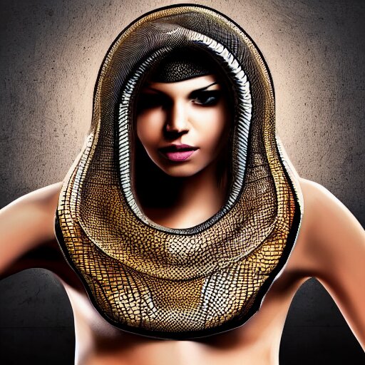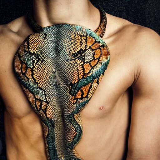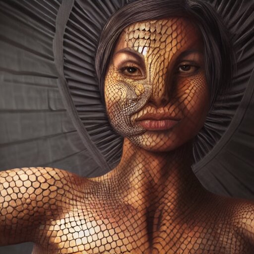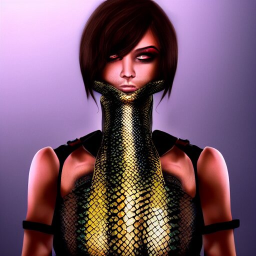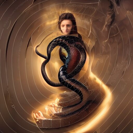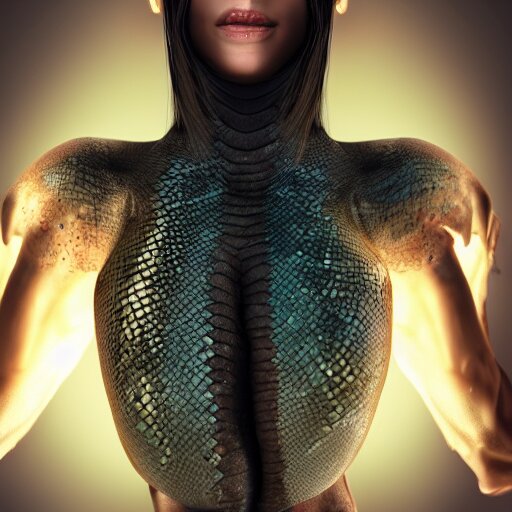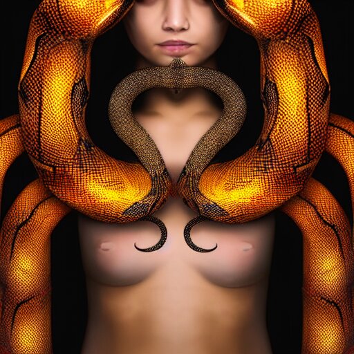 Snake human hybrid, chest up human lower half snake, no legs, black scales, bright amber eyes, chest covered in scales, scales on her chest, formless brests, flat chest, smileing nright, cinematographic shot