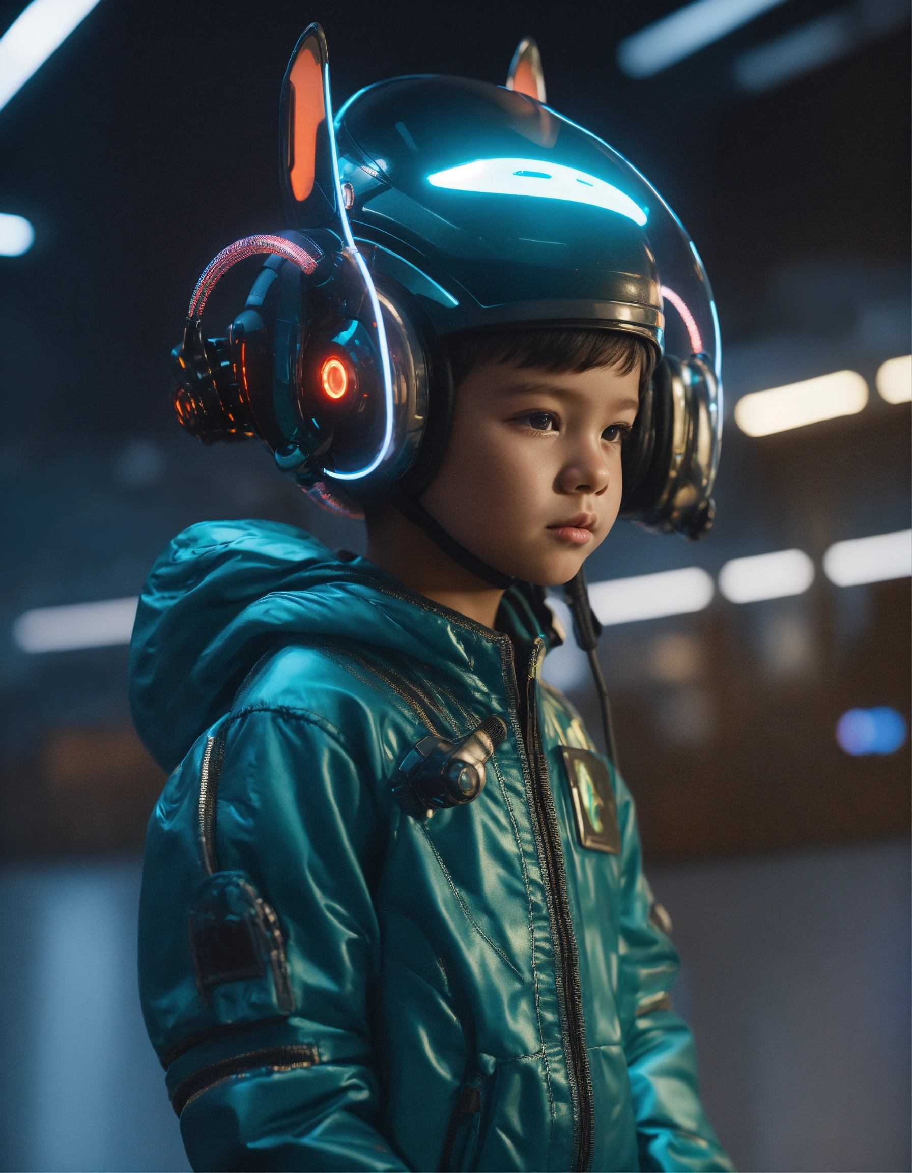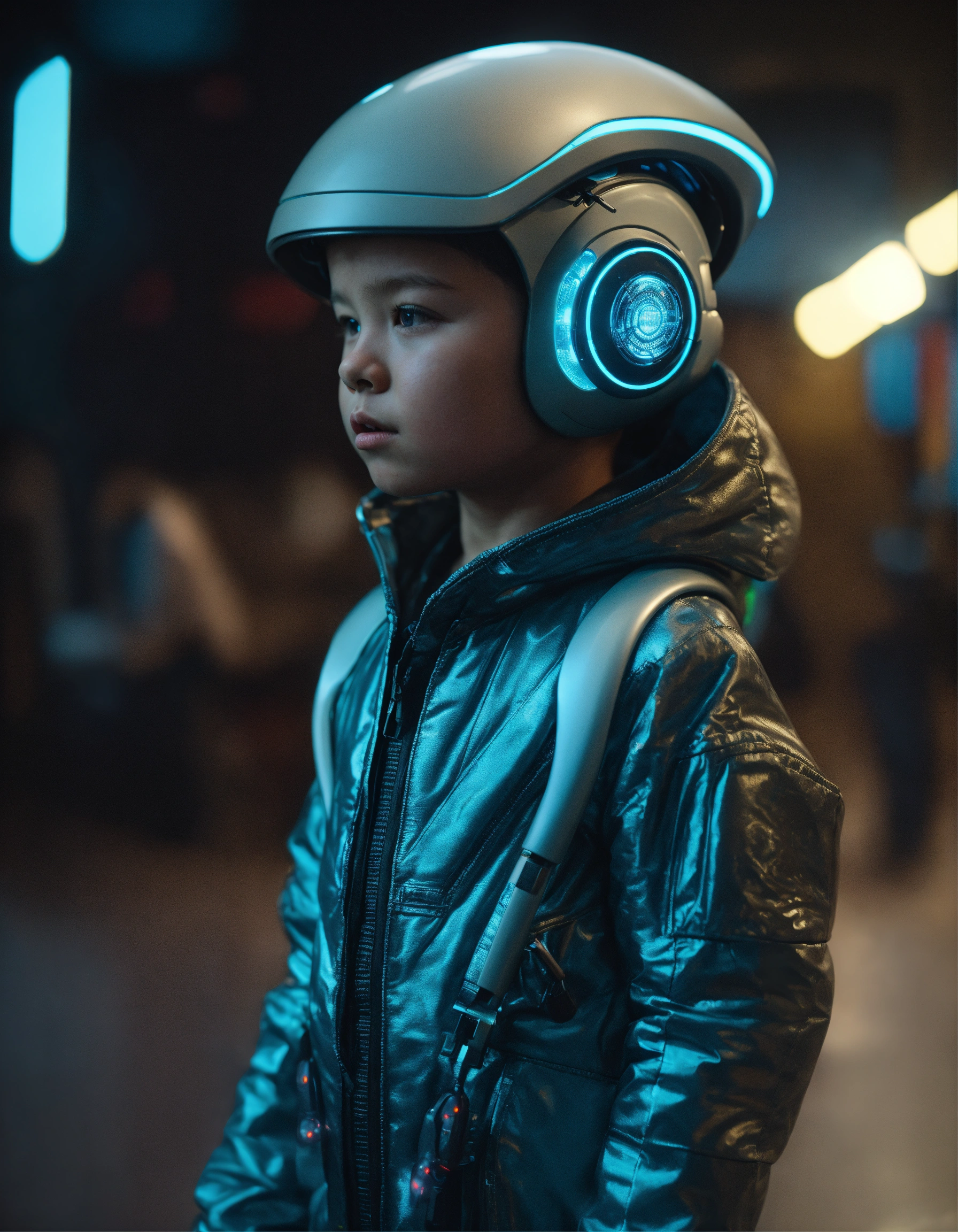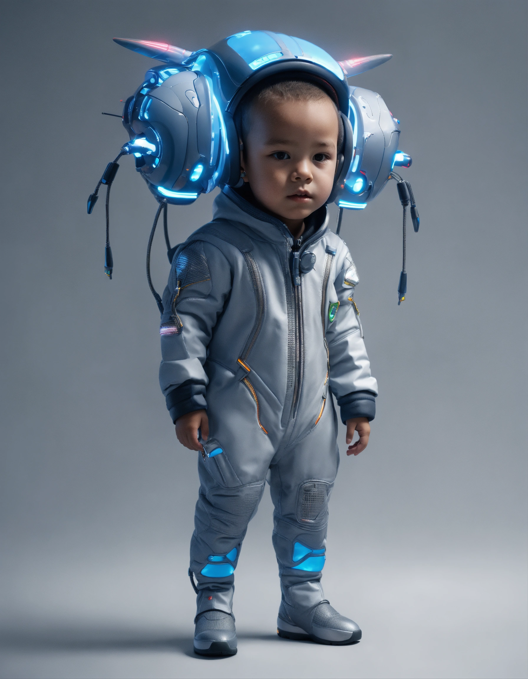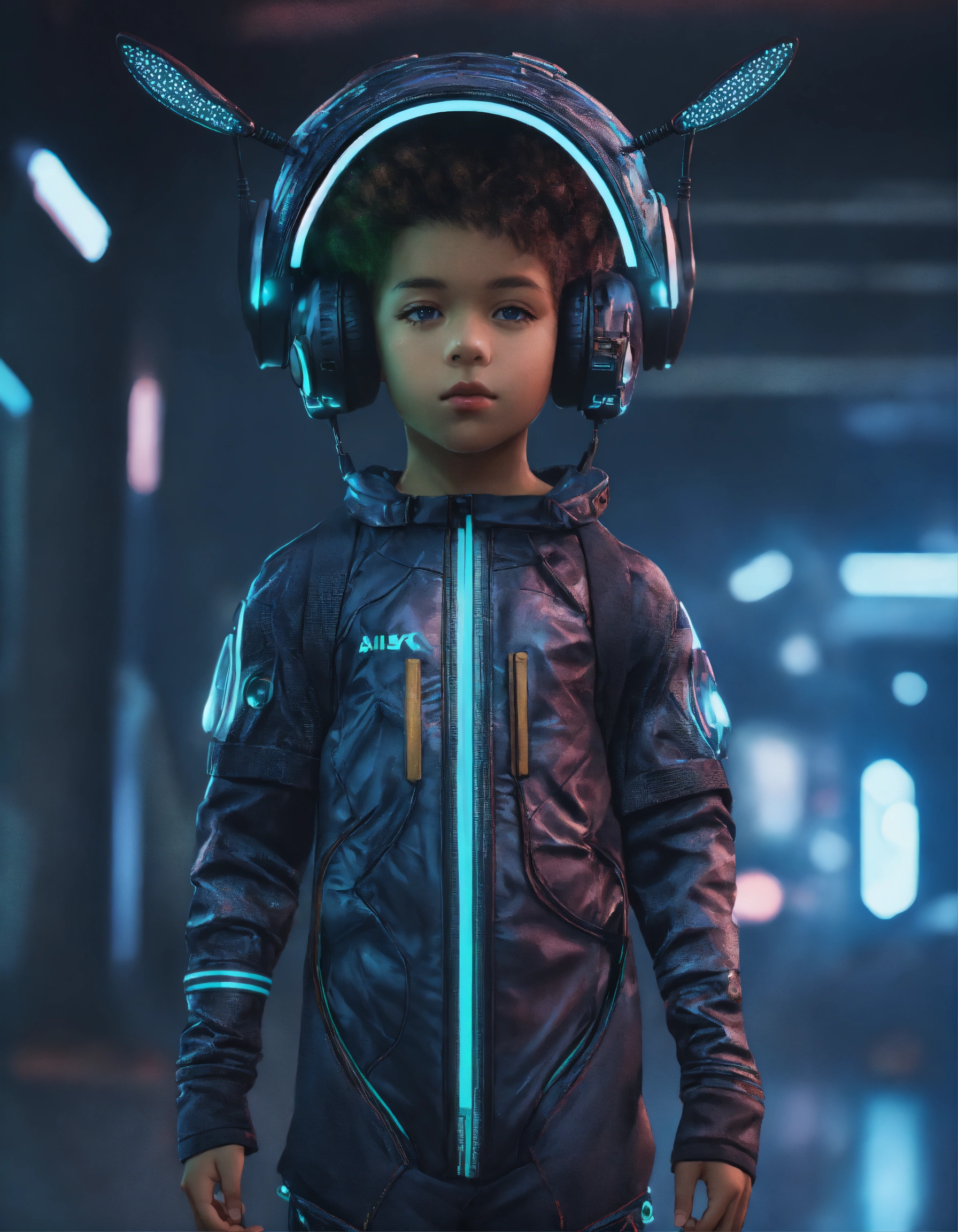 Full body of a kid wearing detailed alien ear antennas with futuristic clothing, futuristic, sci-fi, realistic, 8k