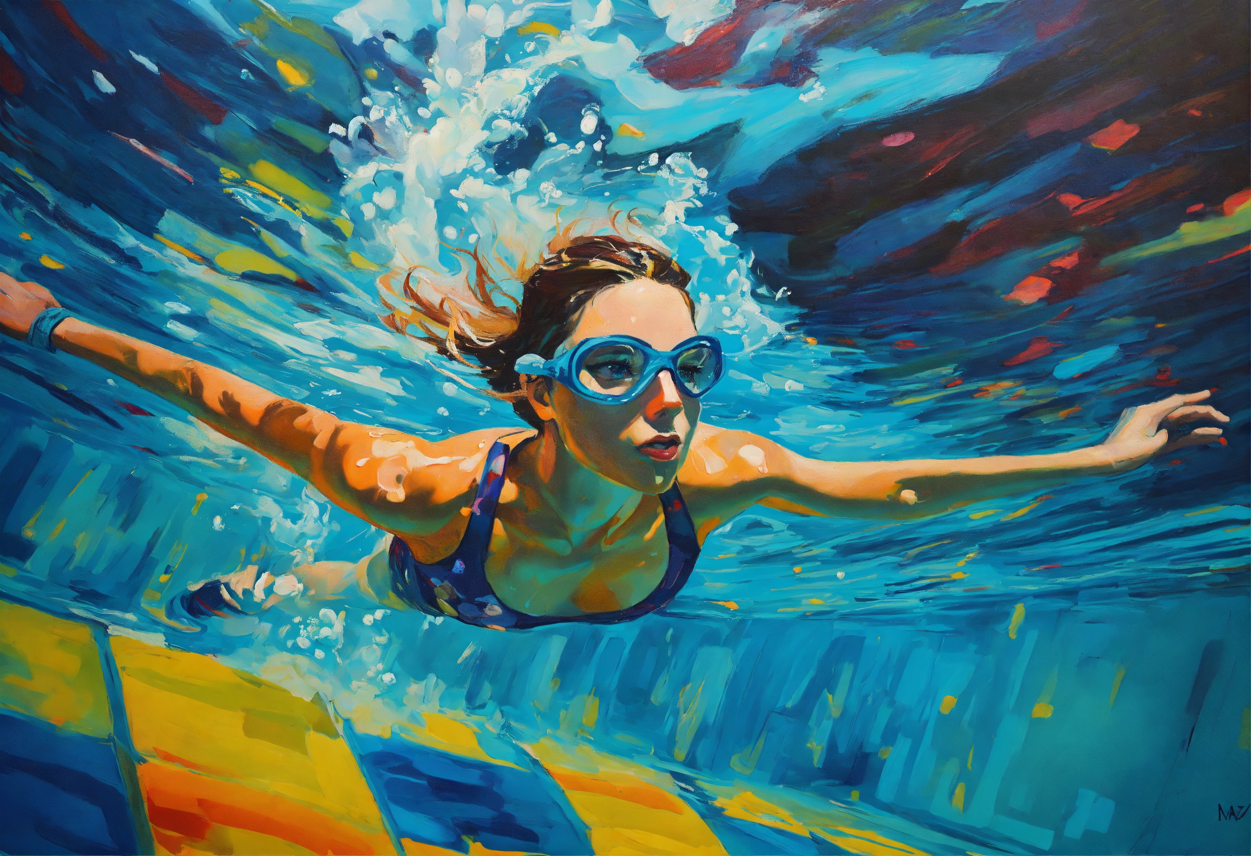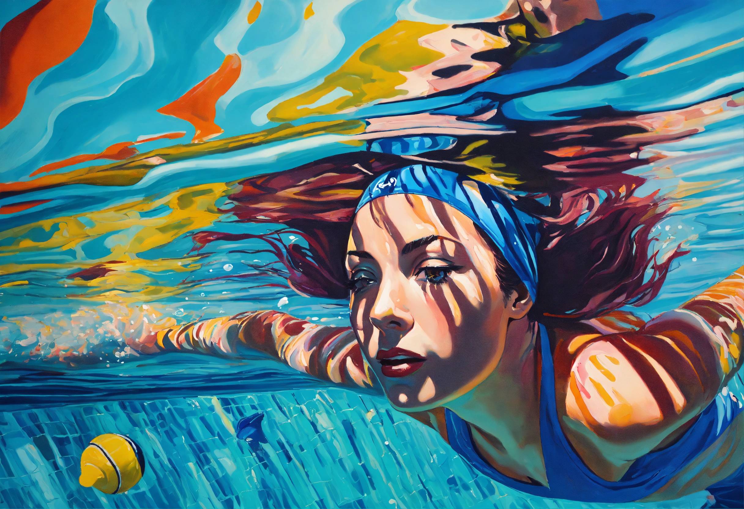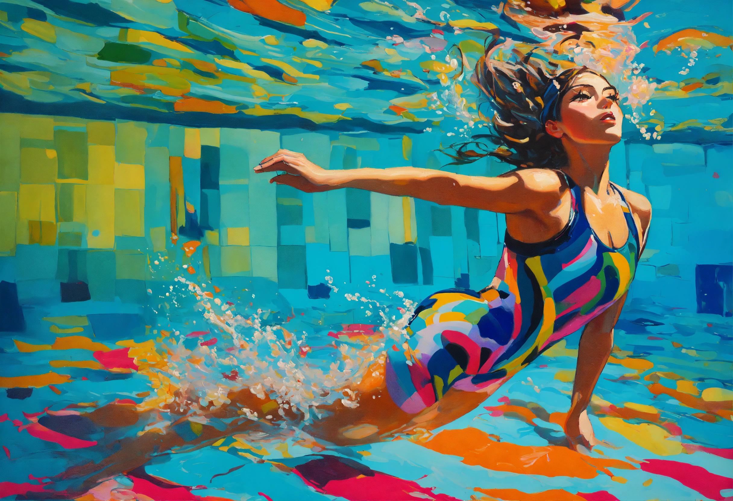Artistic creation of pop art style painter maud ovize, oil painting of a swimmer swimming underwater in the swimming pool, vibrant colors.
