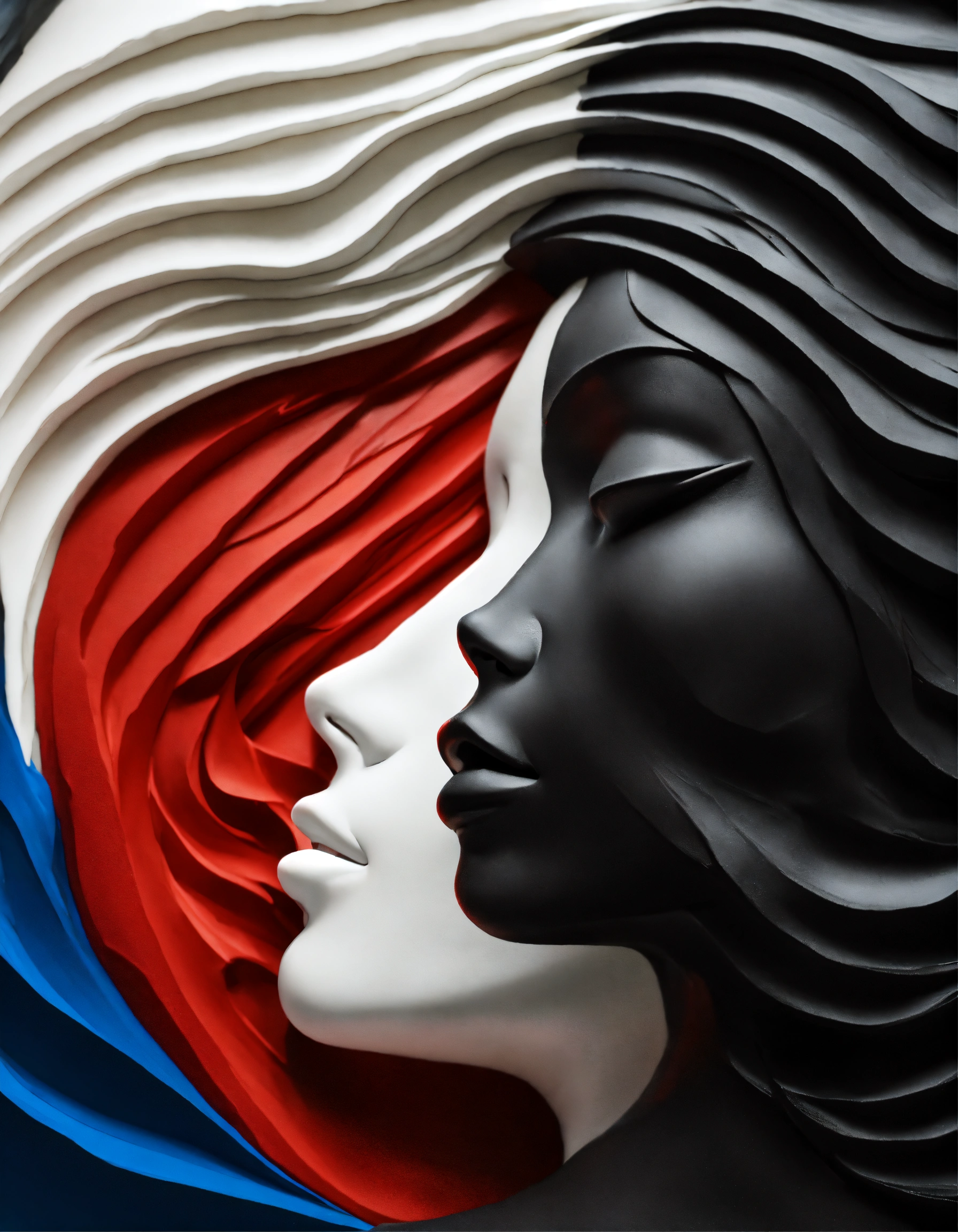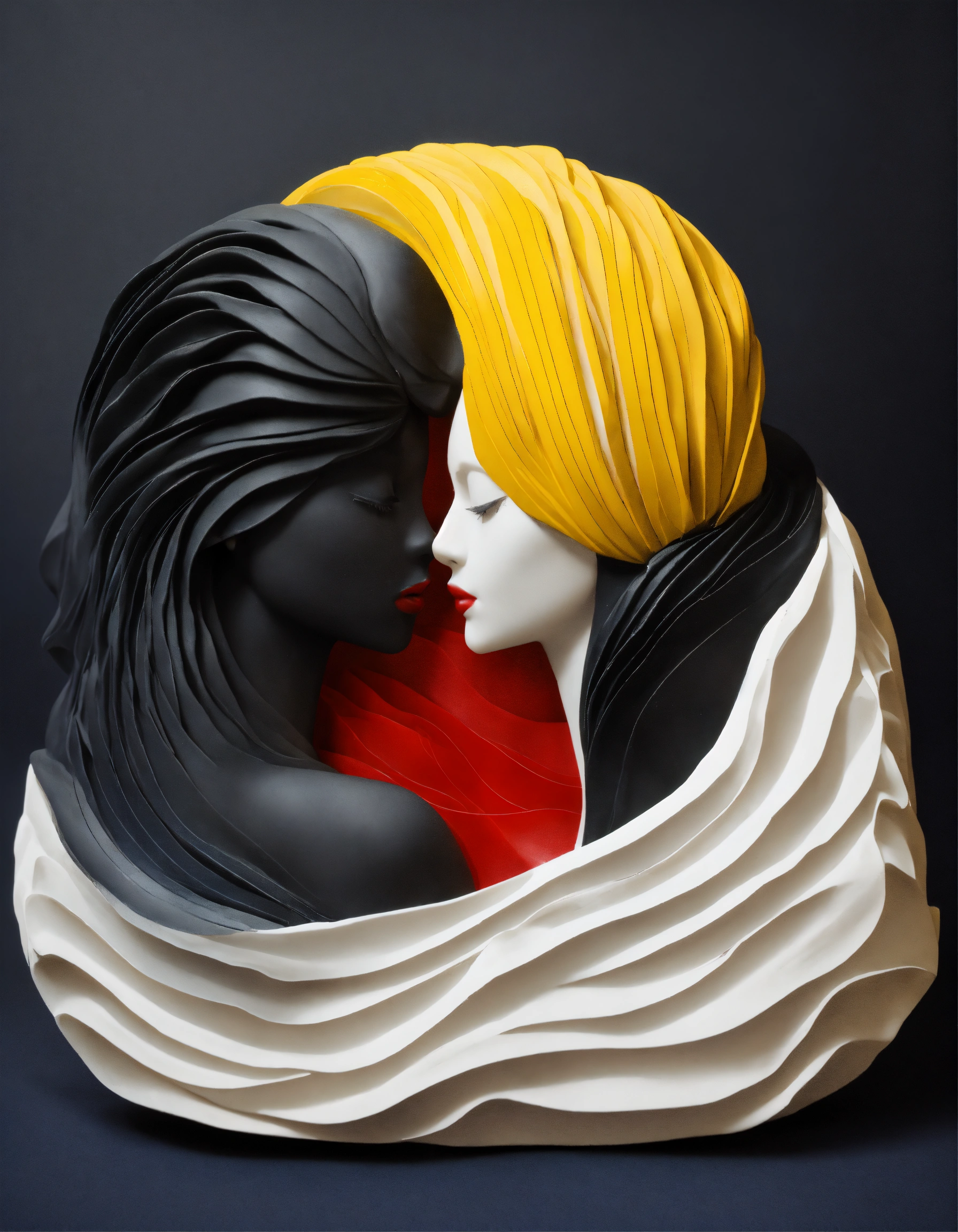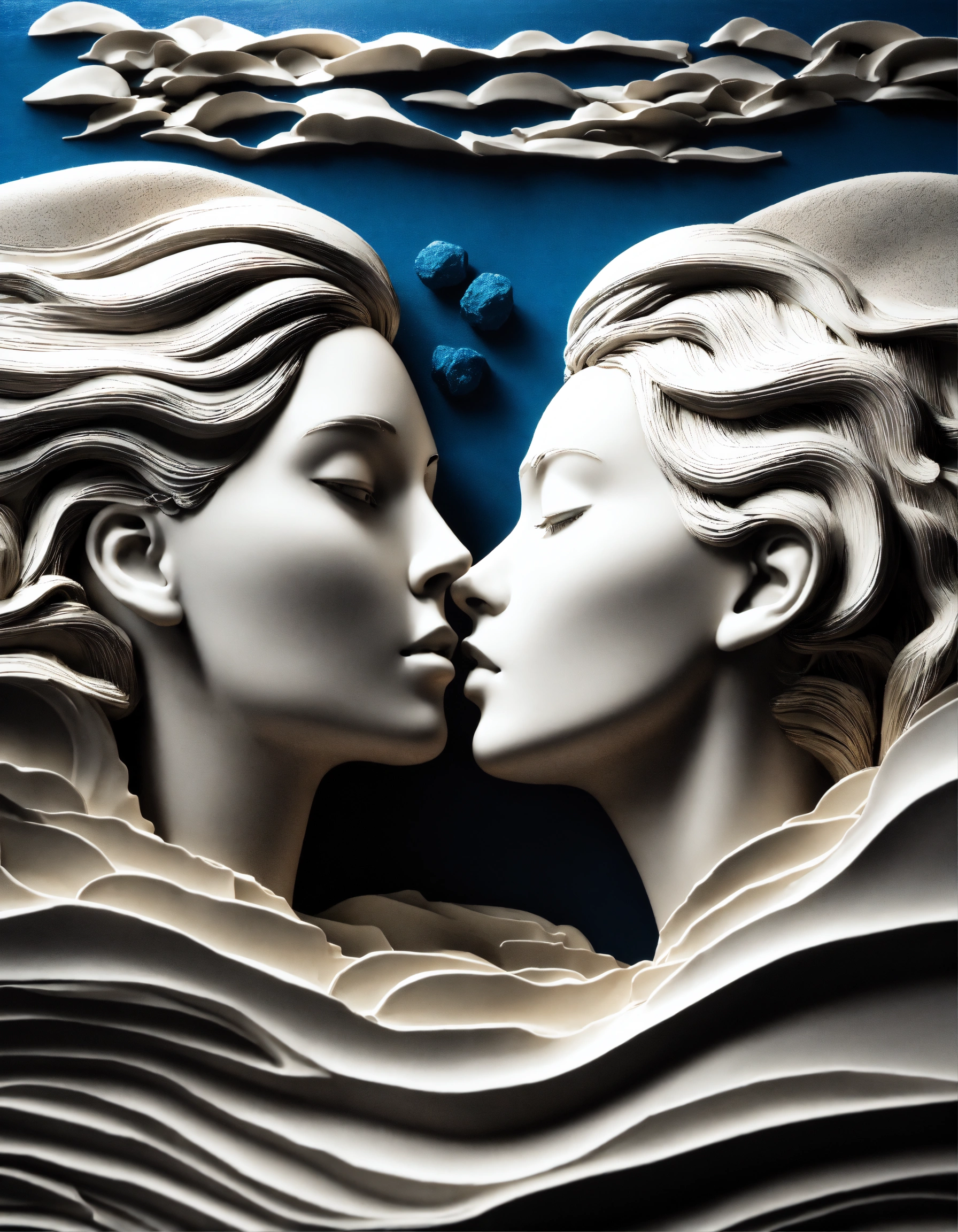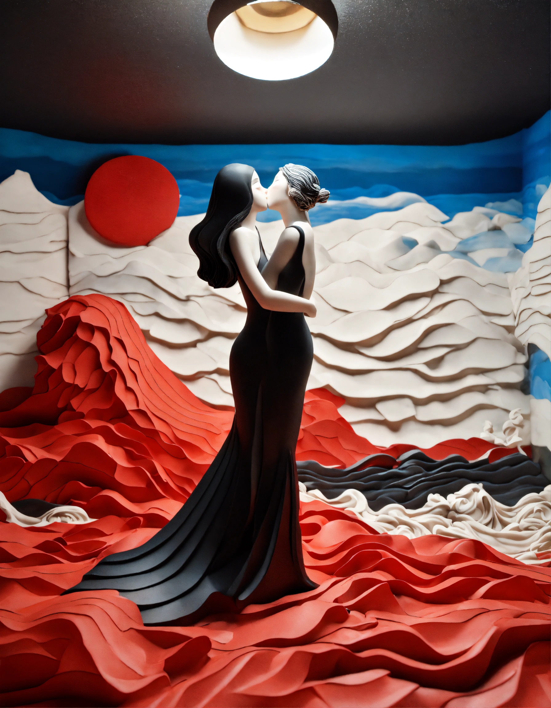 Black and white and primary colors, 3d modeling clay abstract seascape, women kissing, immersive inspired art- deco seascape, ocean waves, rené magritte inspiration.