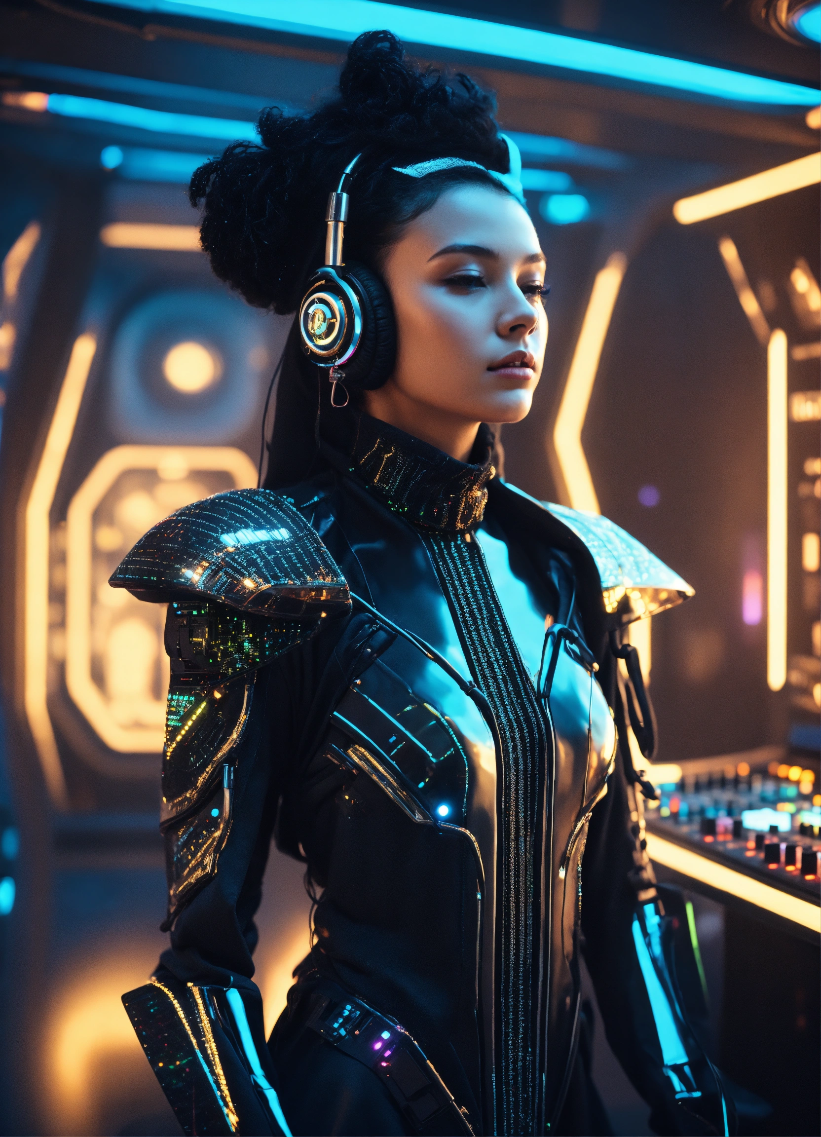 Girl with black hair in futuristic robe with hi tech earphones and alien jewelry on a luxurious space yacht, making music on modular analog synthesizers, electronic drums, realistic, futuristic, sci-fi, 8k, tron, unreal engine